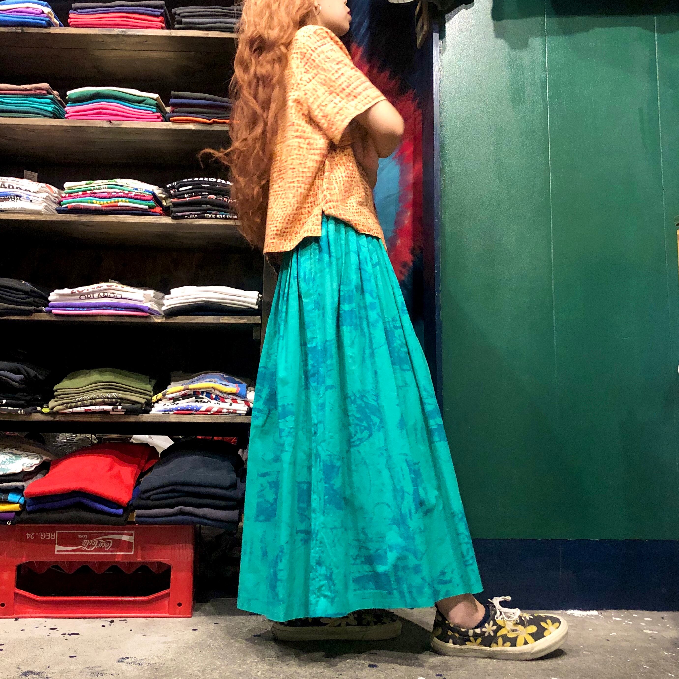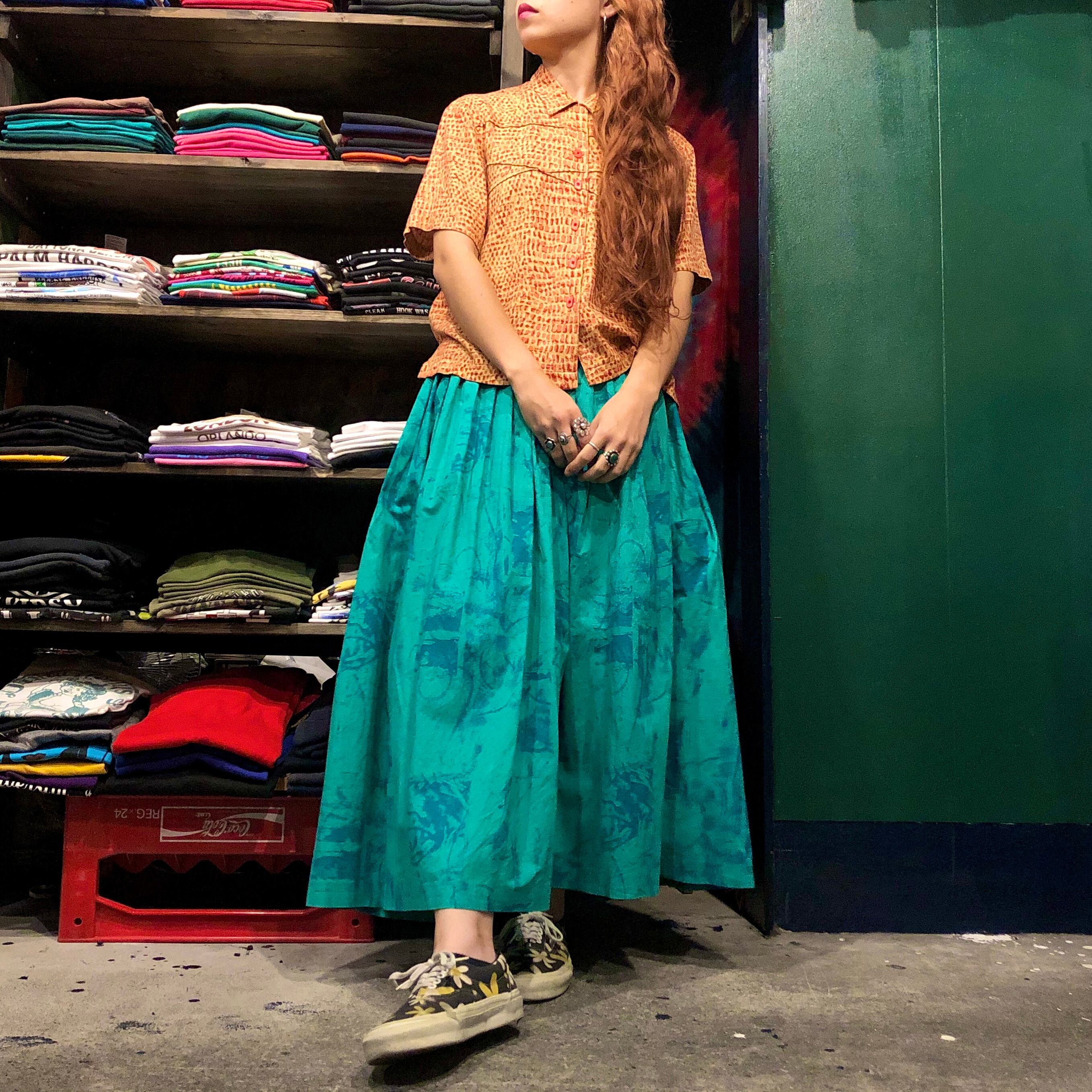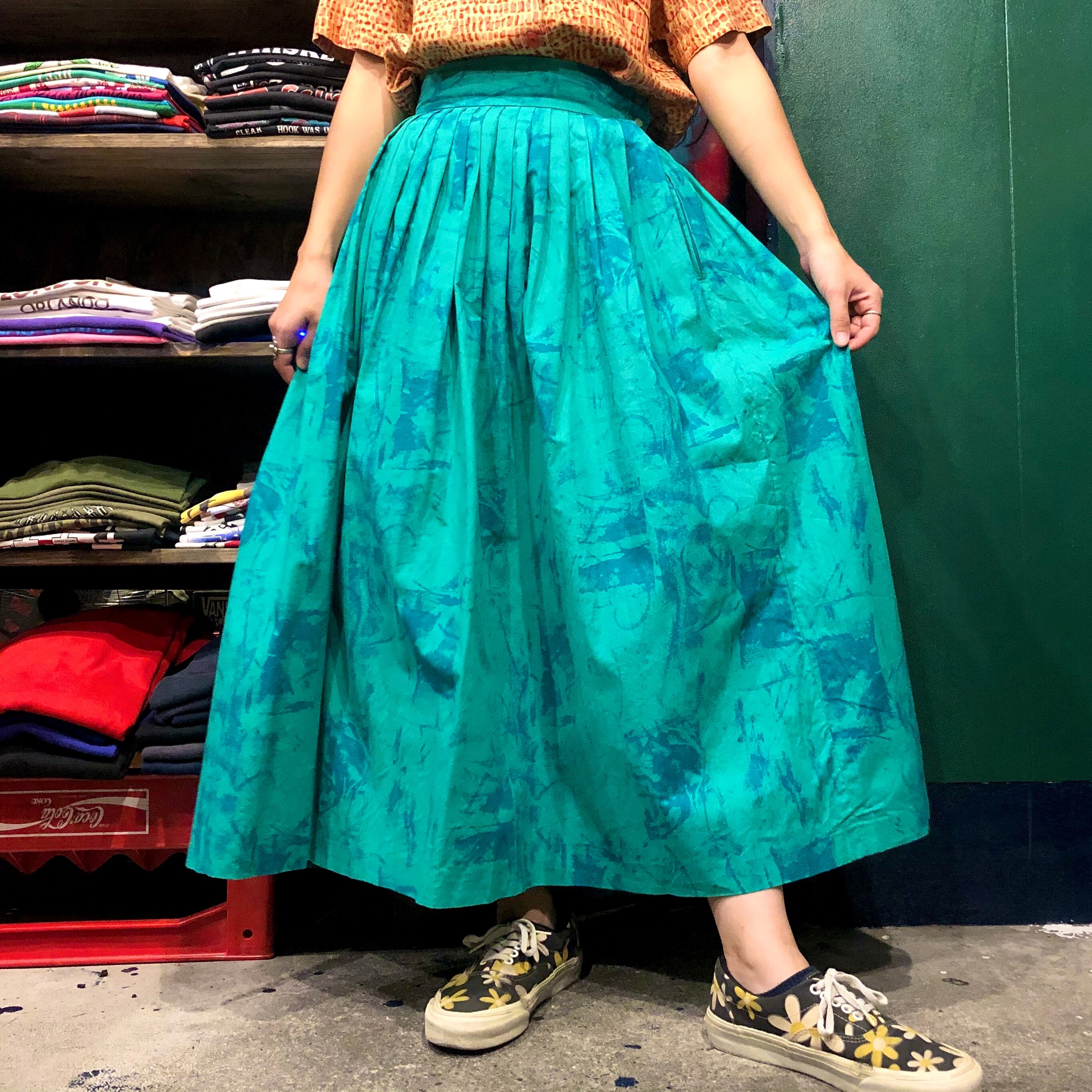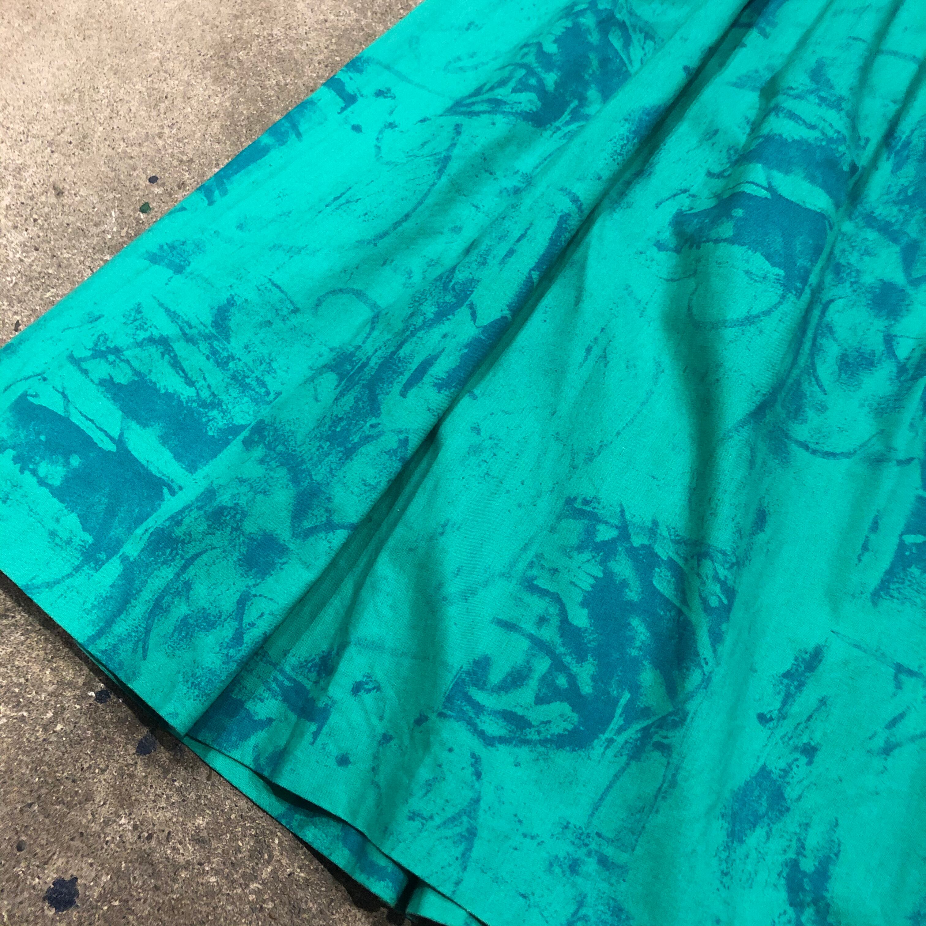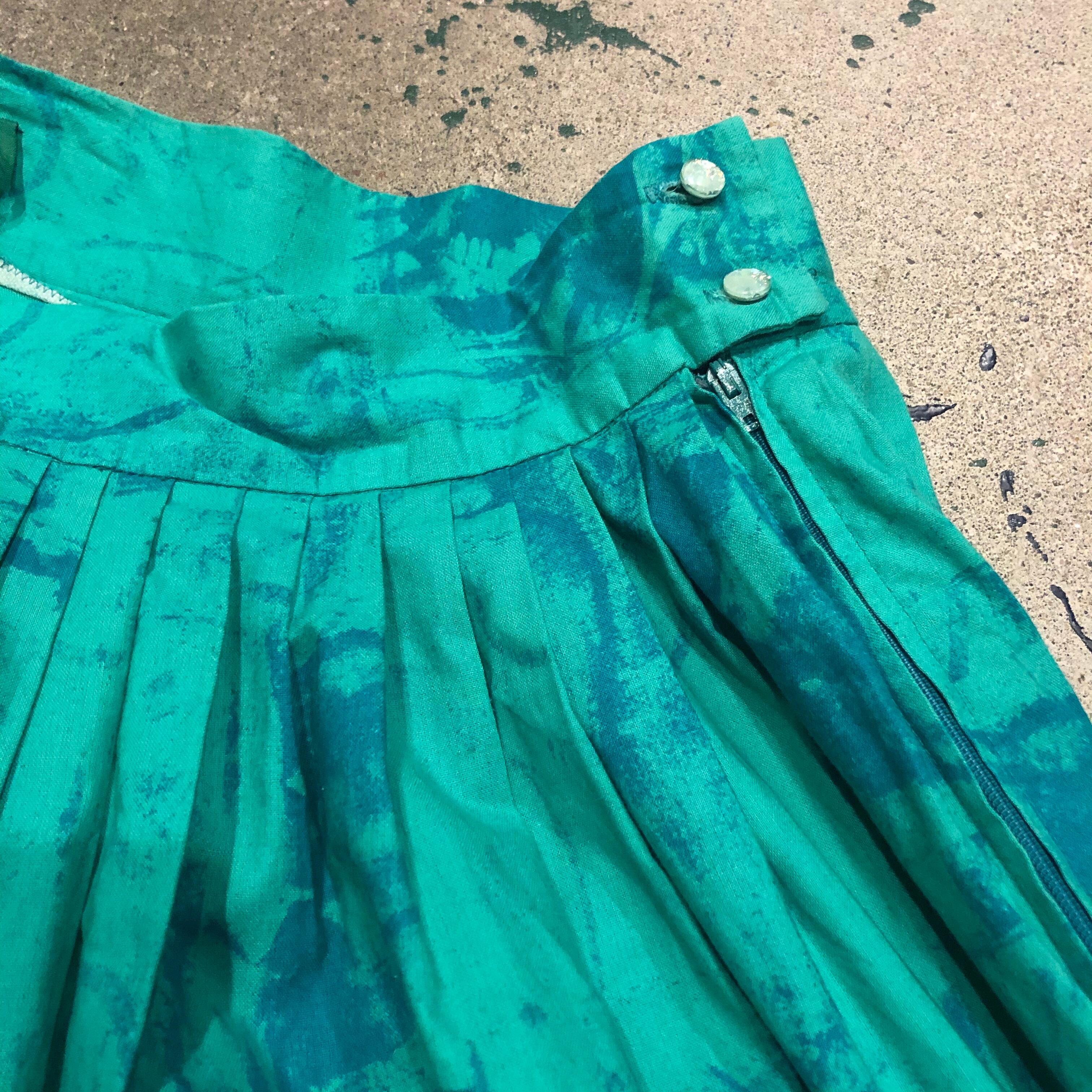 タイダイというか絵の具で汚したような模様がかわいいプリーツスカートです。おそらくハンドメイドのもので、ボリューム感やベルト部分の太さ、ボタンのラメラメな感じなどこだわりが感じられる一着です。