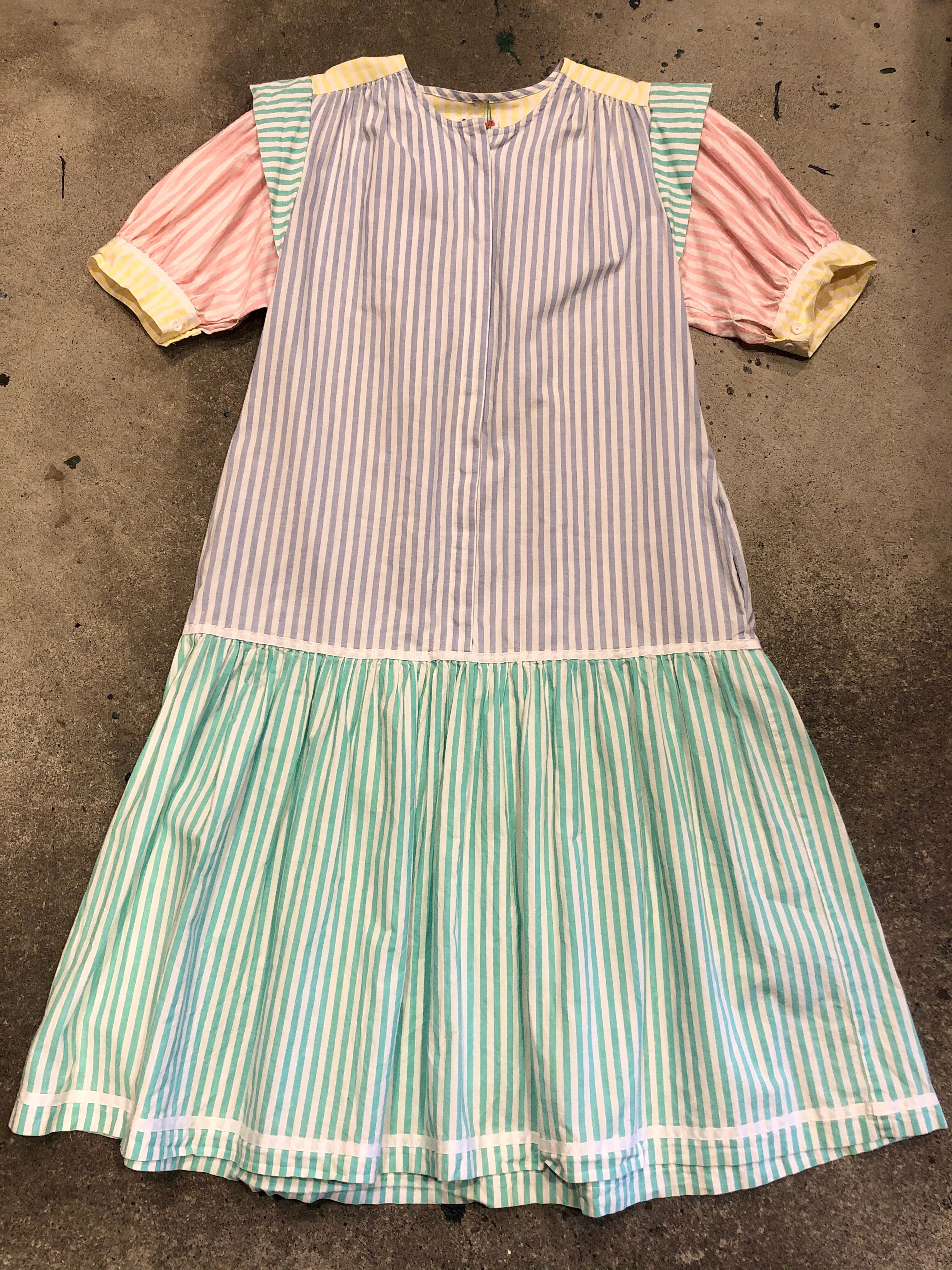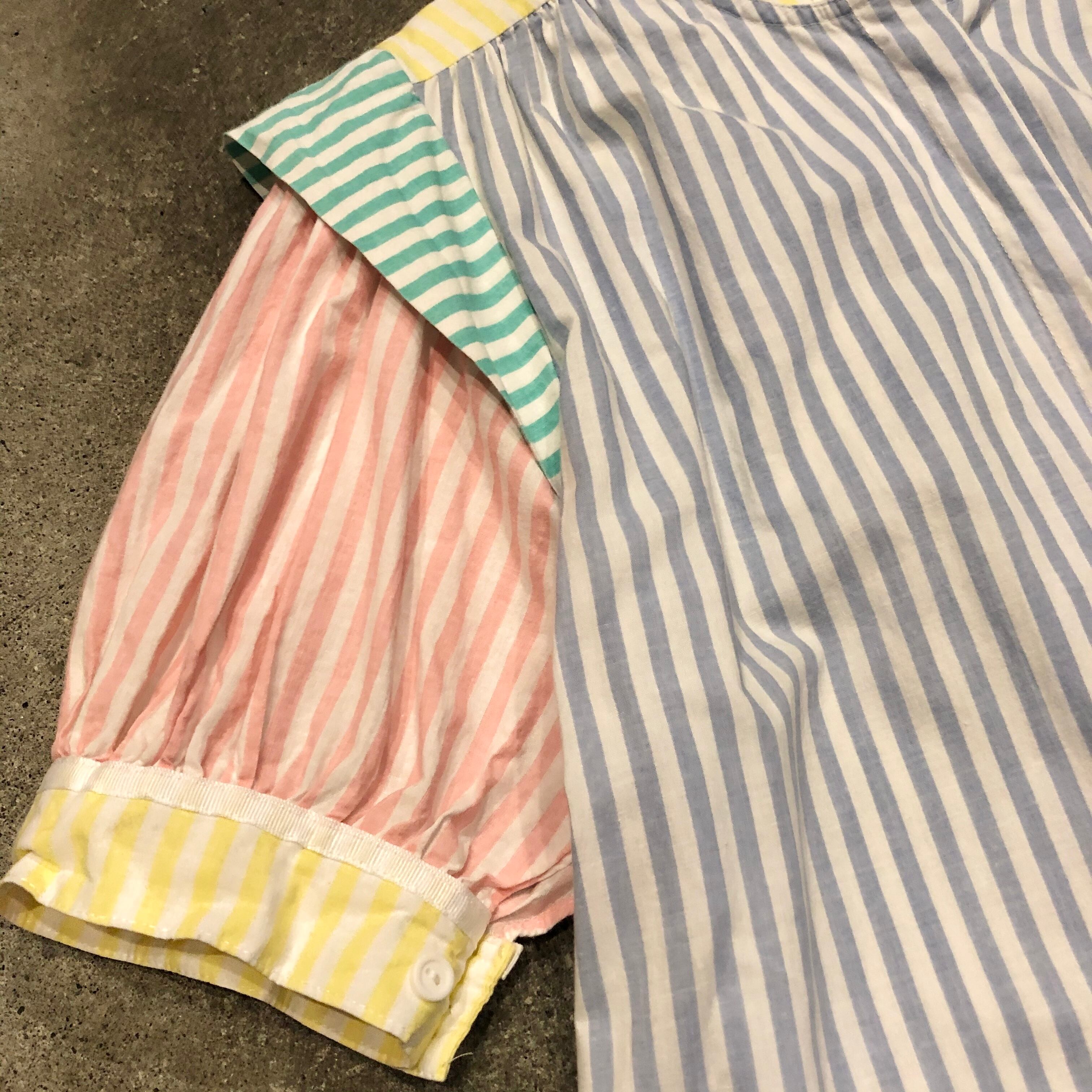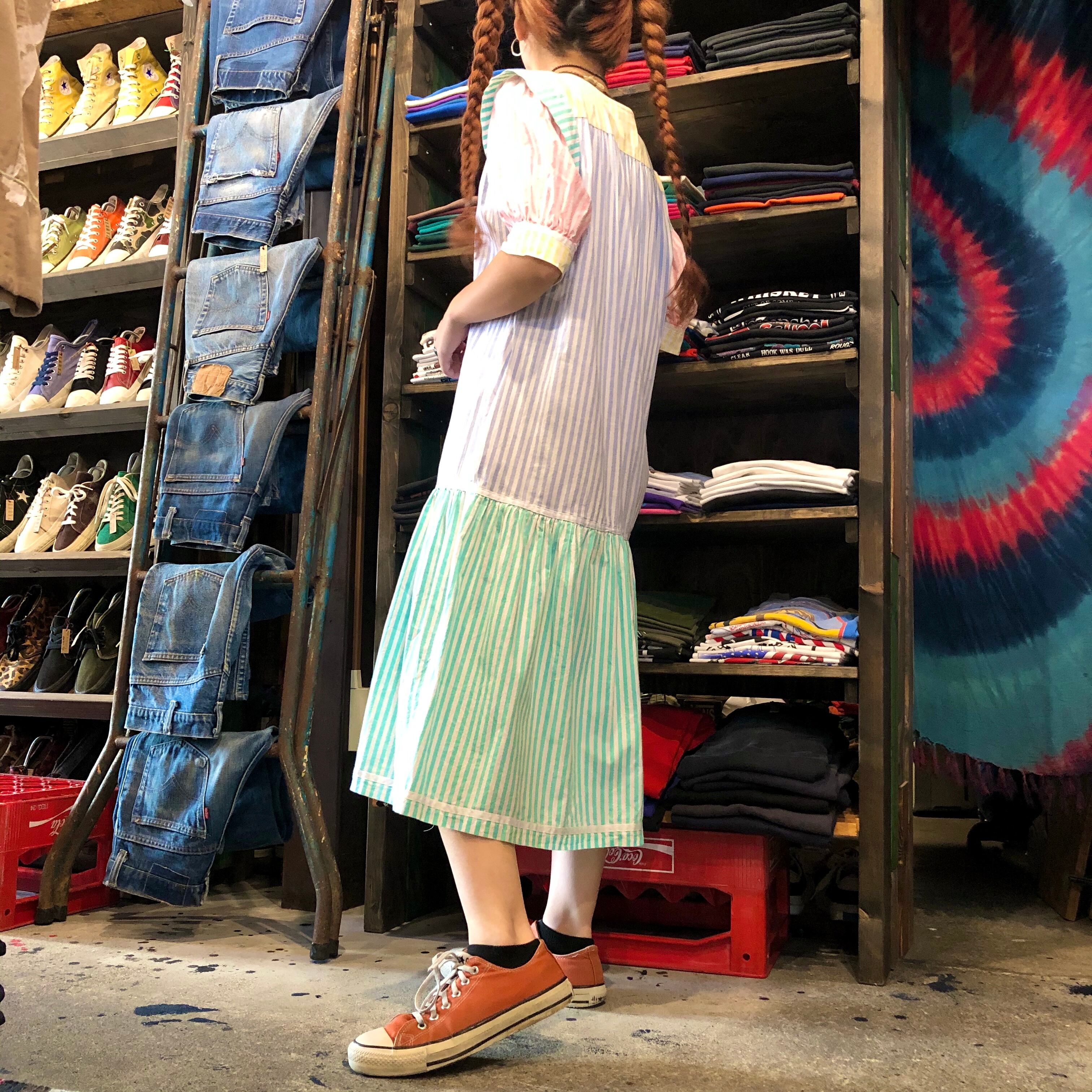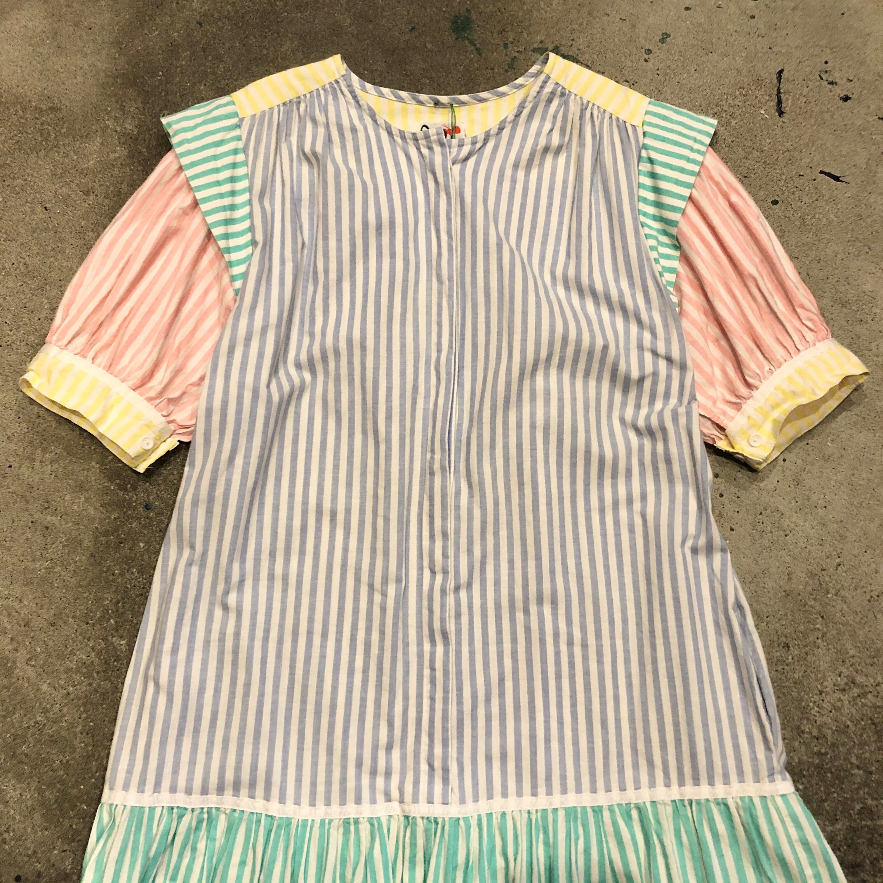 いろんなパステルカラーのストライプが切り替えられている個性的なワンピースです。