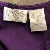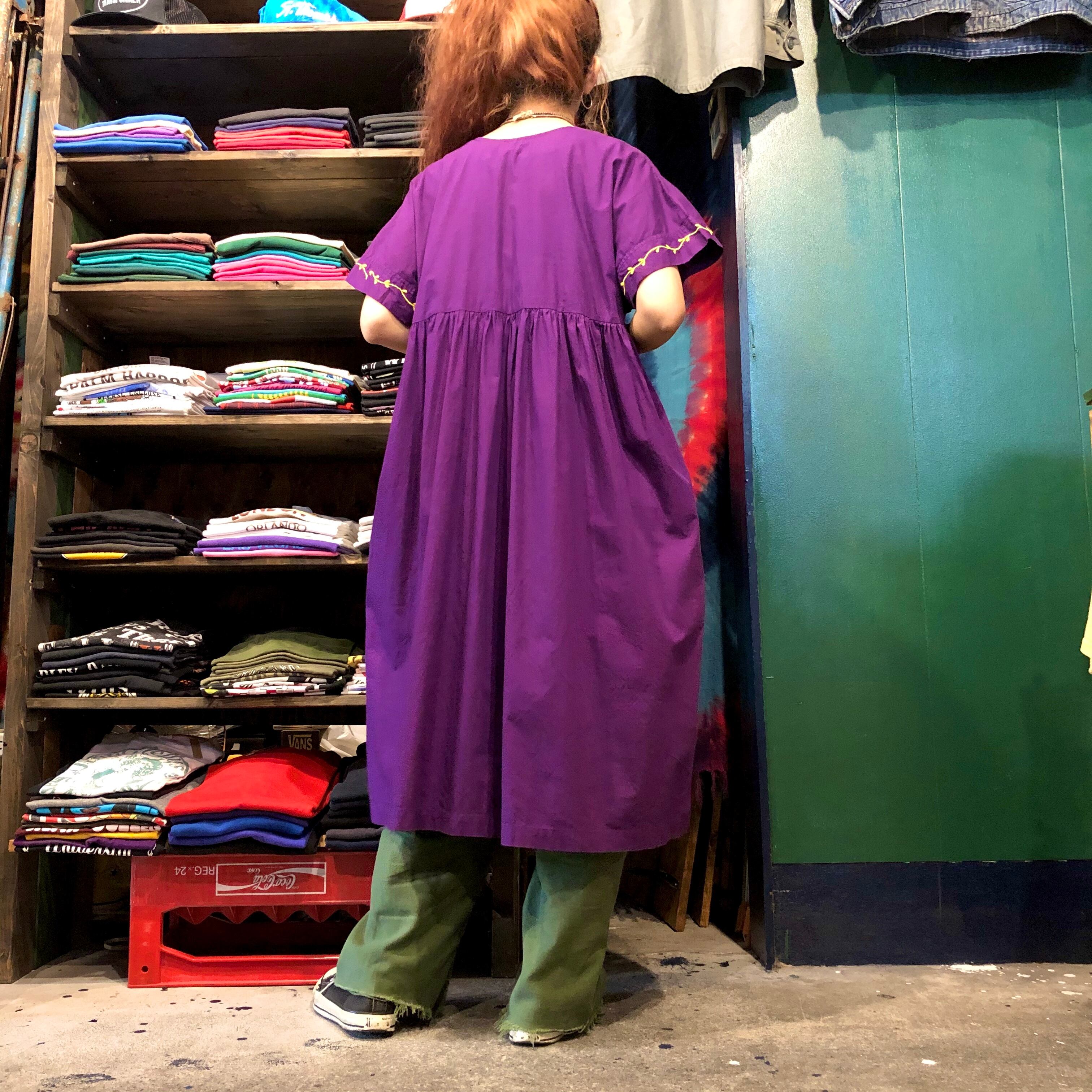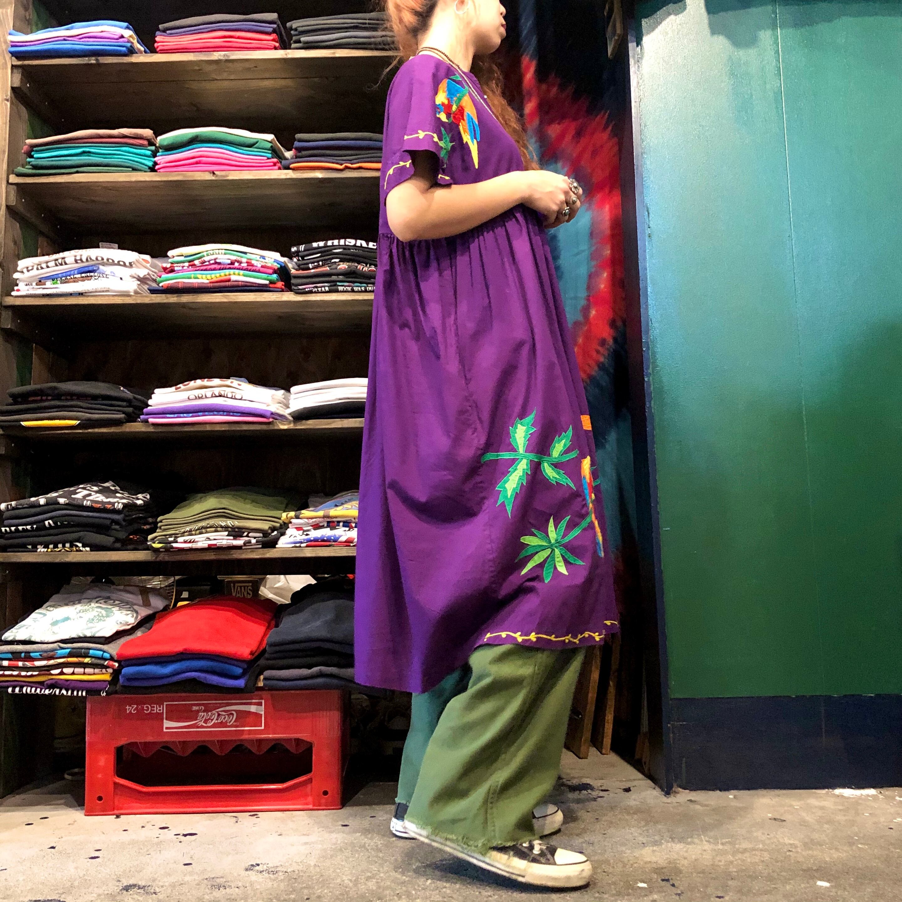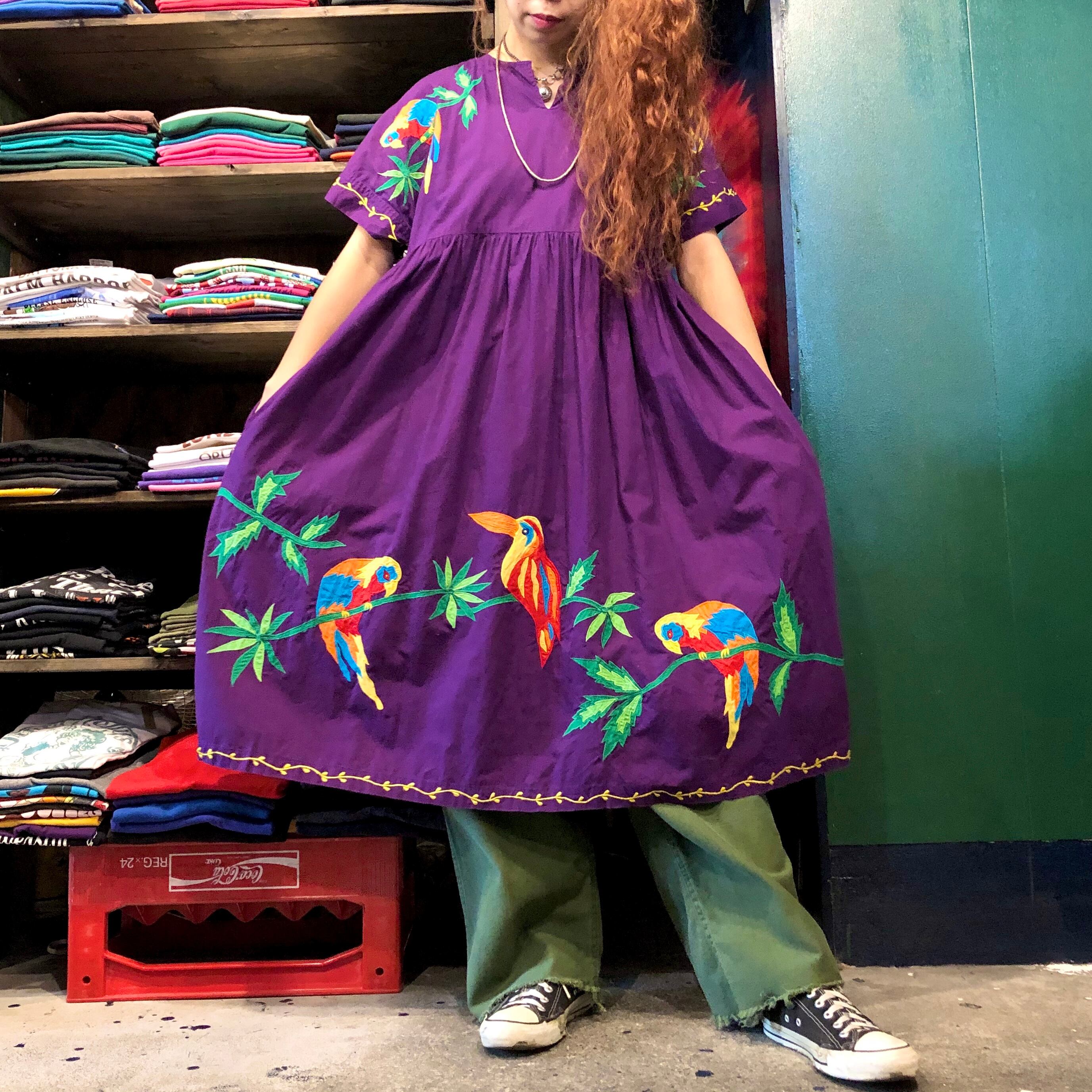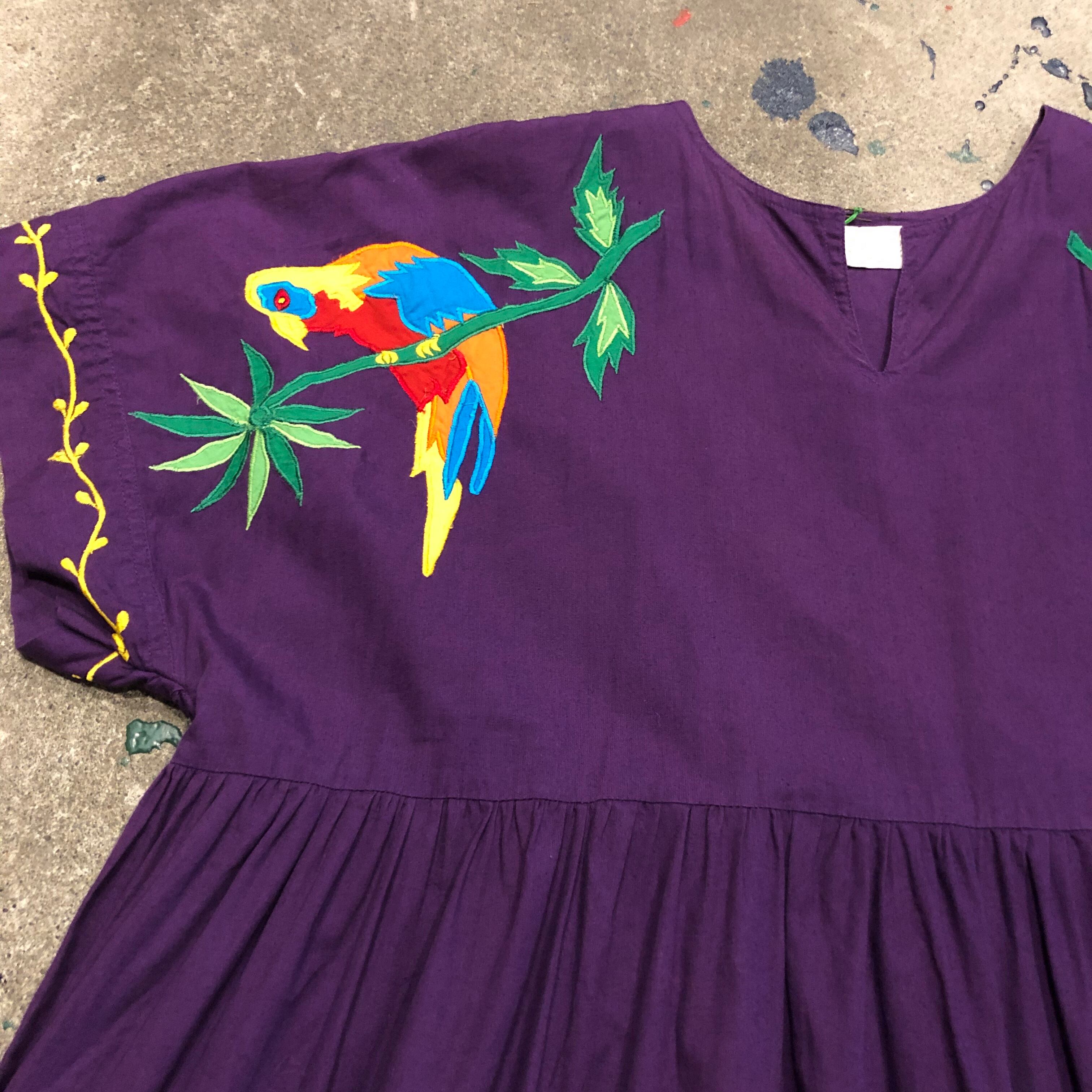 濃いパープルにカラフルな南国の鳥がアップリケされたワンピースです。