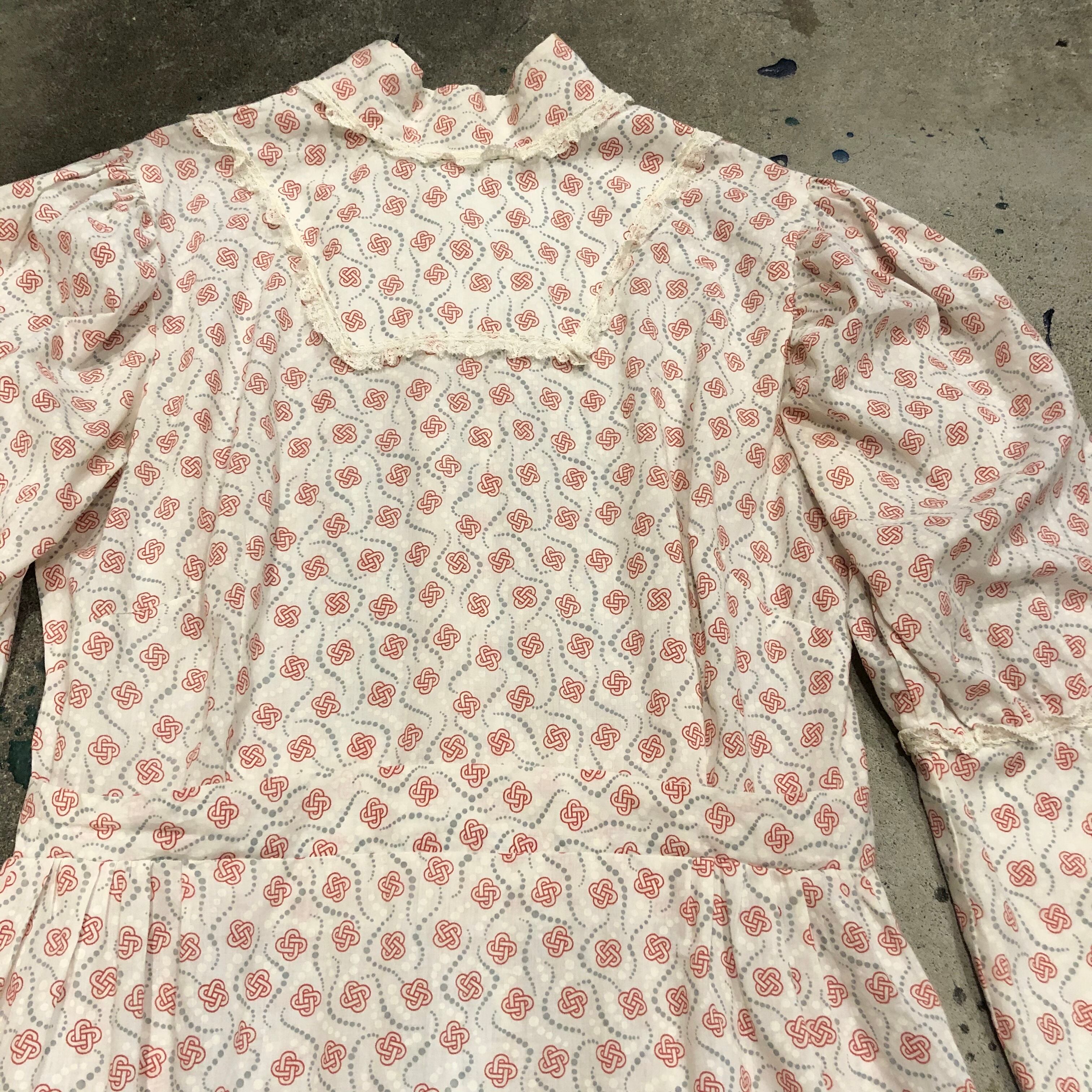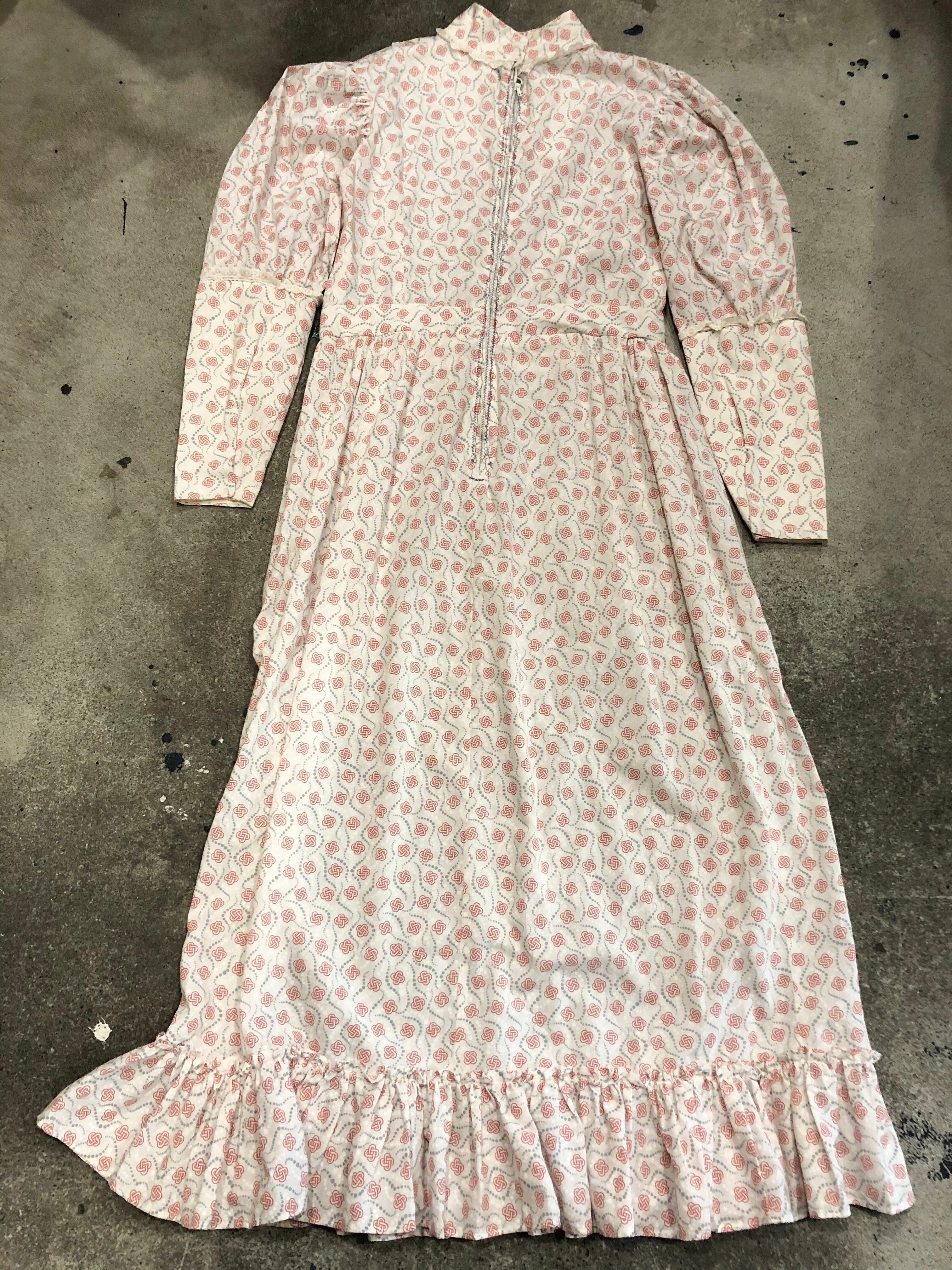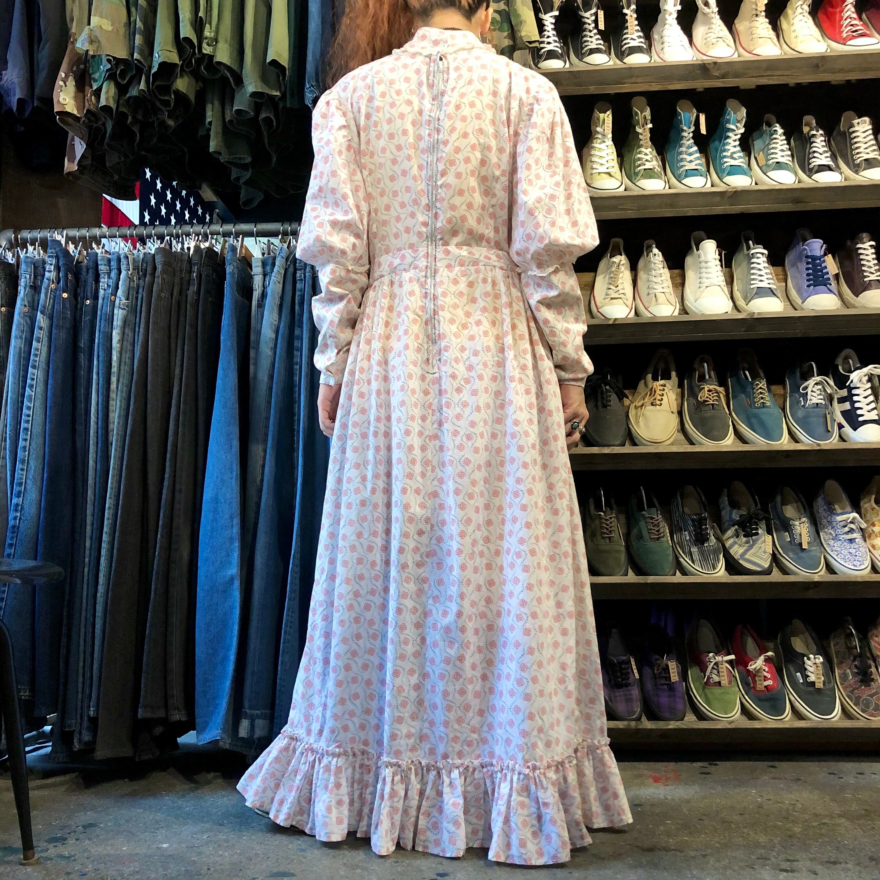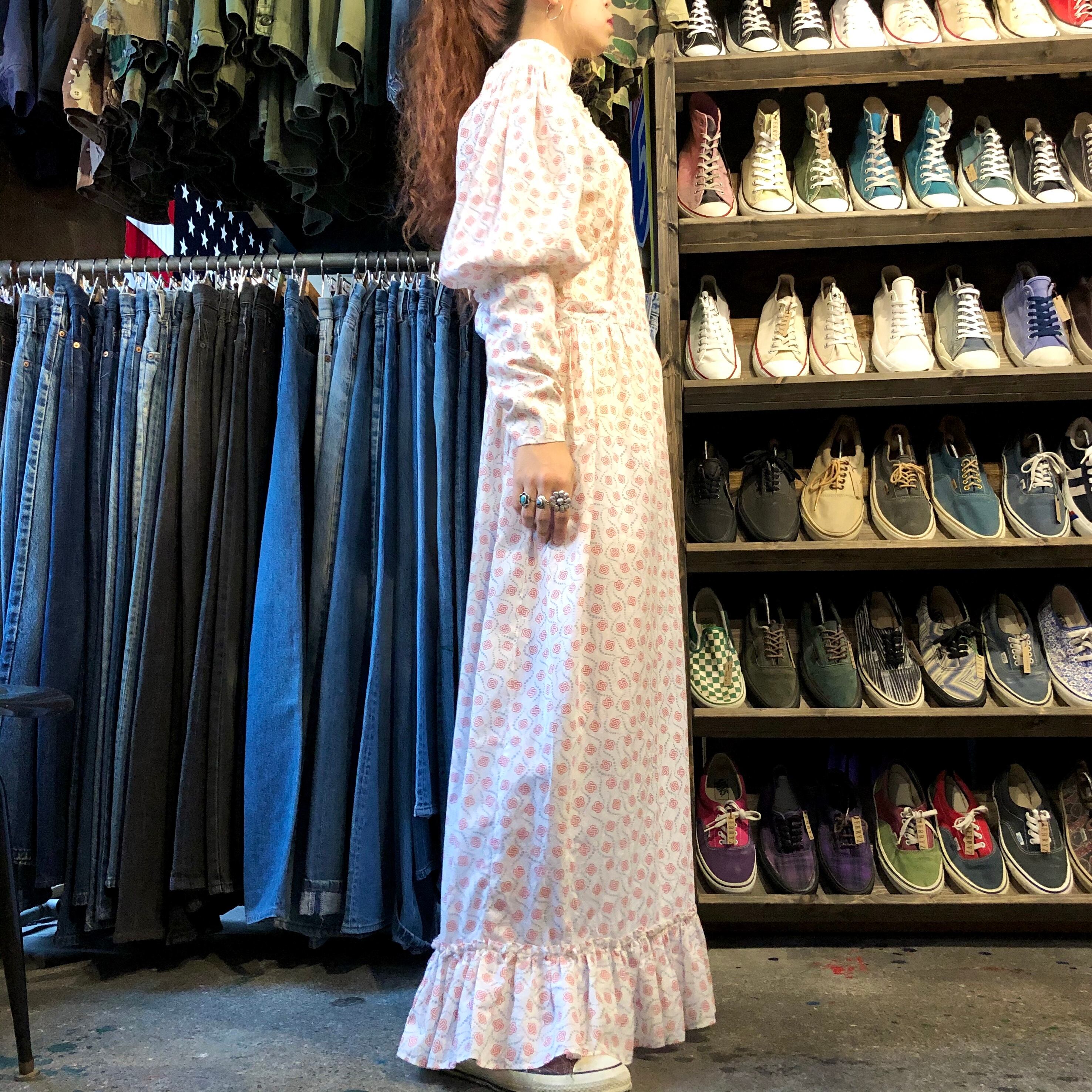 不思議な柄と大きなパフスリーブがかわいいワンピースです。おそらくハンドメイドでディテールにこだわりが感じられます。全体的にラブリーな印象ですが、マキシ丈なので大人っぽく着ていただけると思います。冬はニットを重ねてもかわいいと思います!