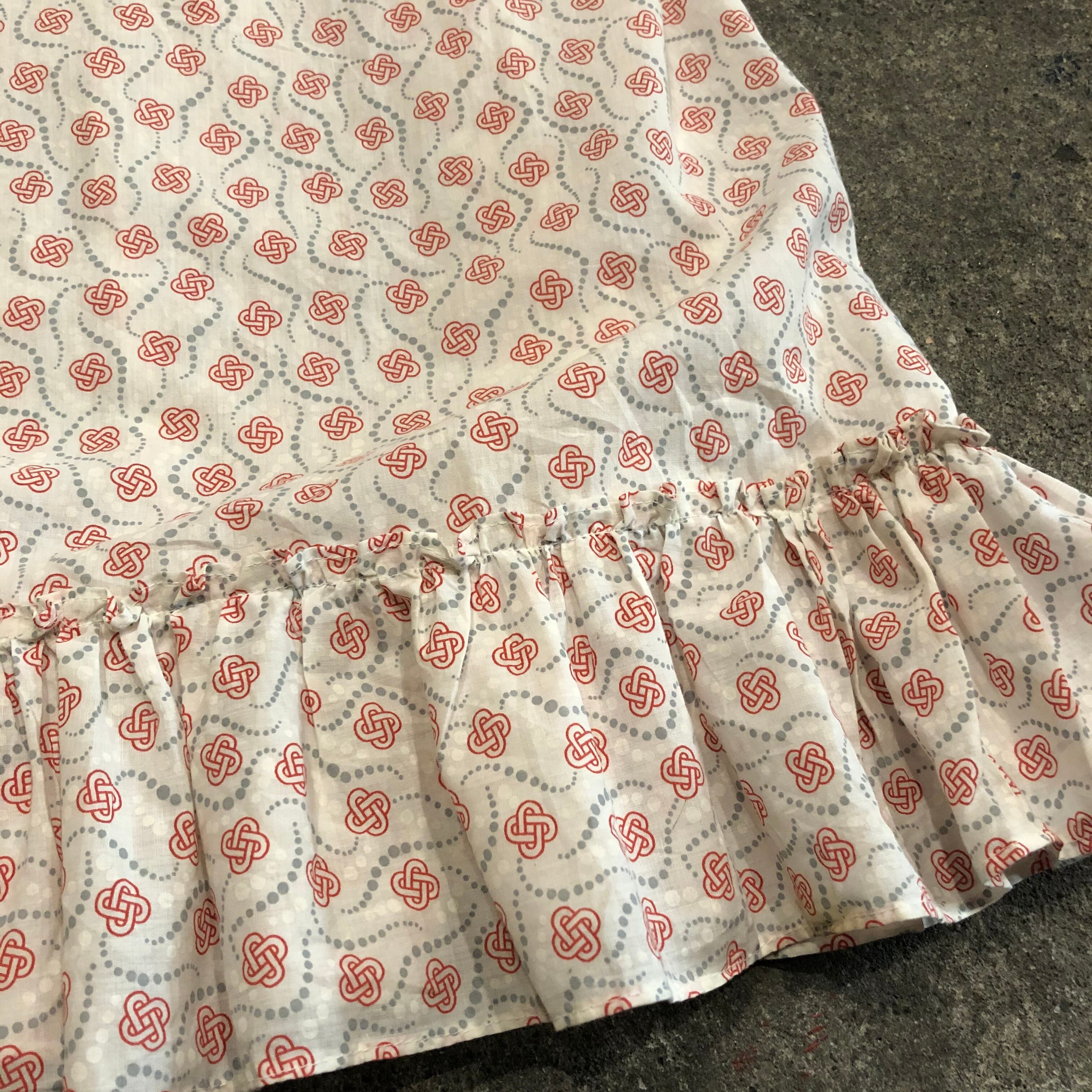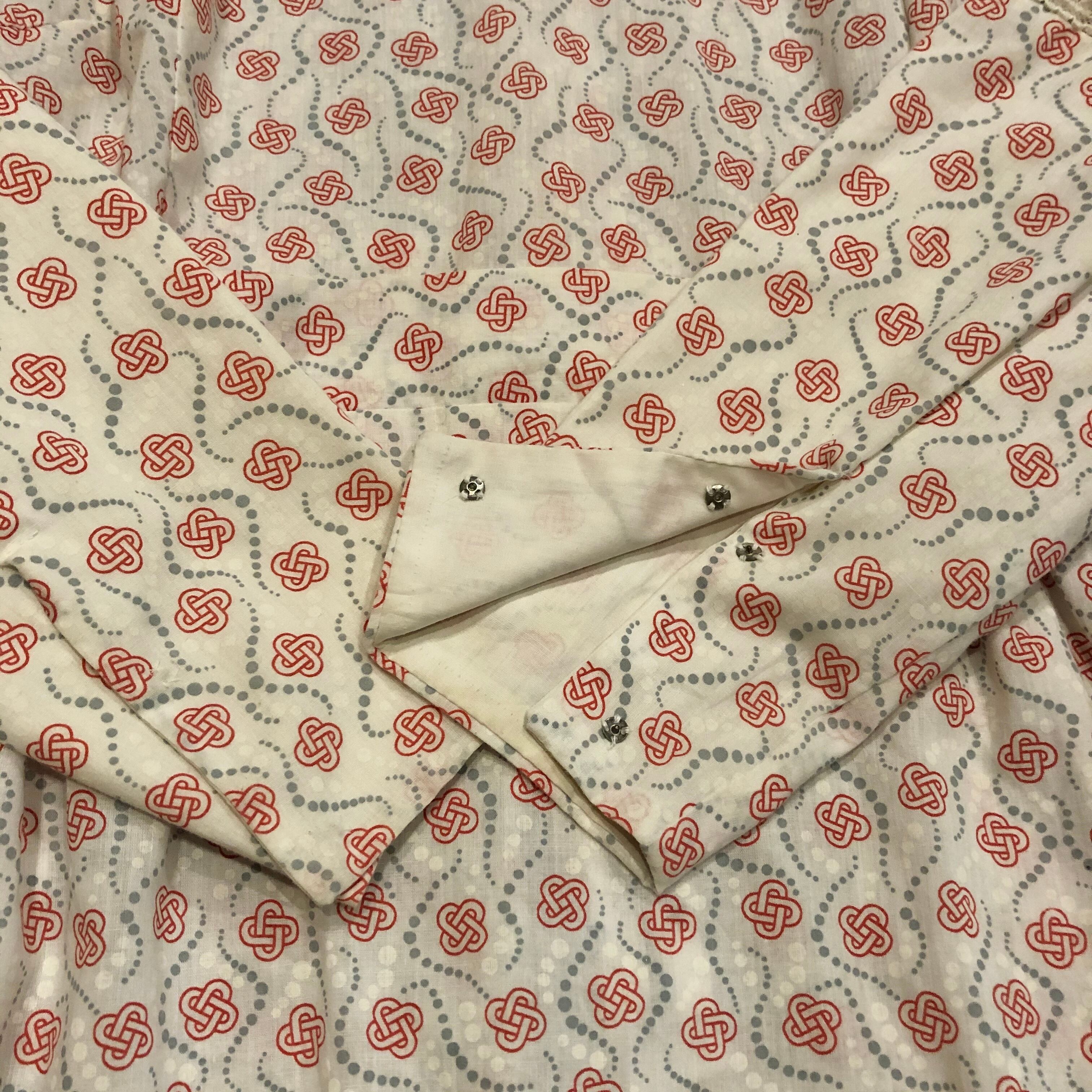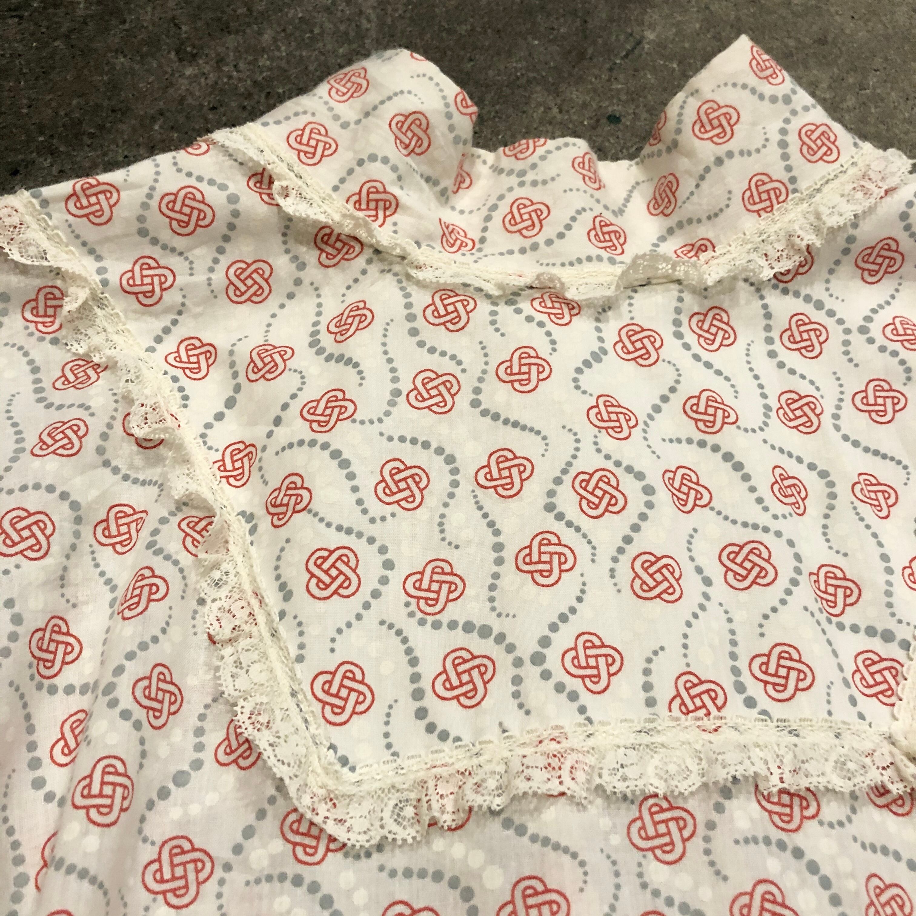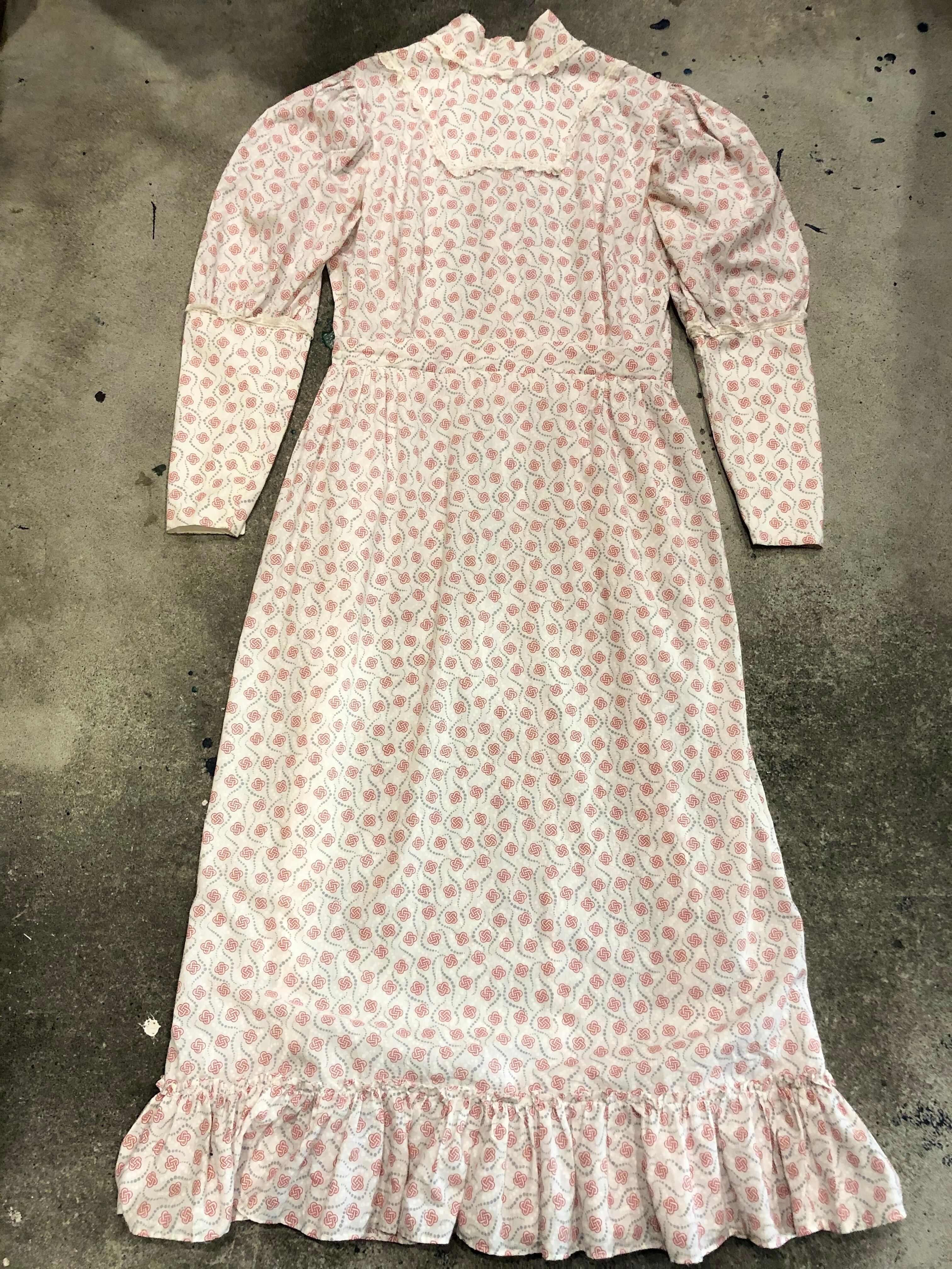 不思議な柄と大きなパフスリーブがかわいいワンピースです。おそらくハンドメイドでディテールにこだわりが感じられます。全体的にラブリーな印象ですが、マキシ丈なので大人っぽく着ていただけると思います。冬はニットを重ねてもかわいいと思います!