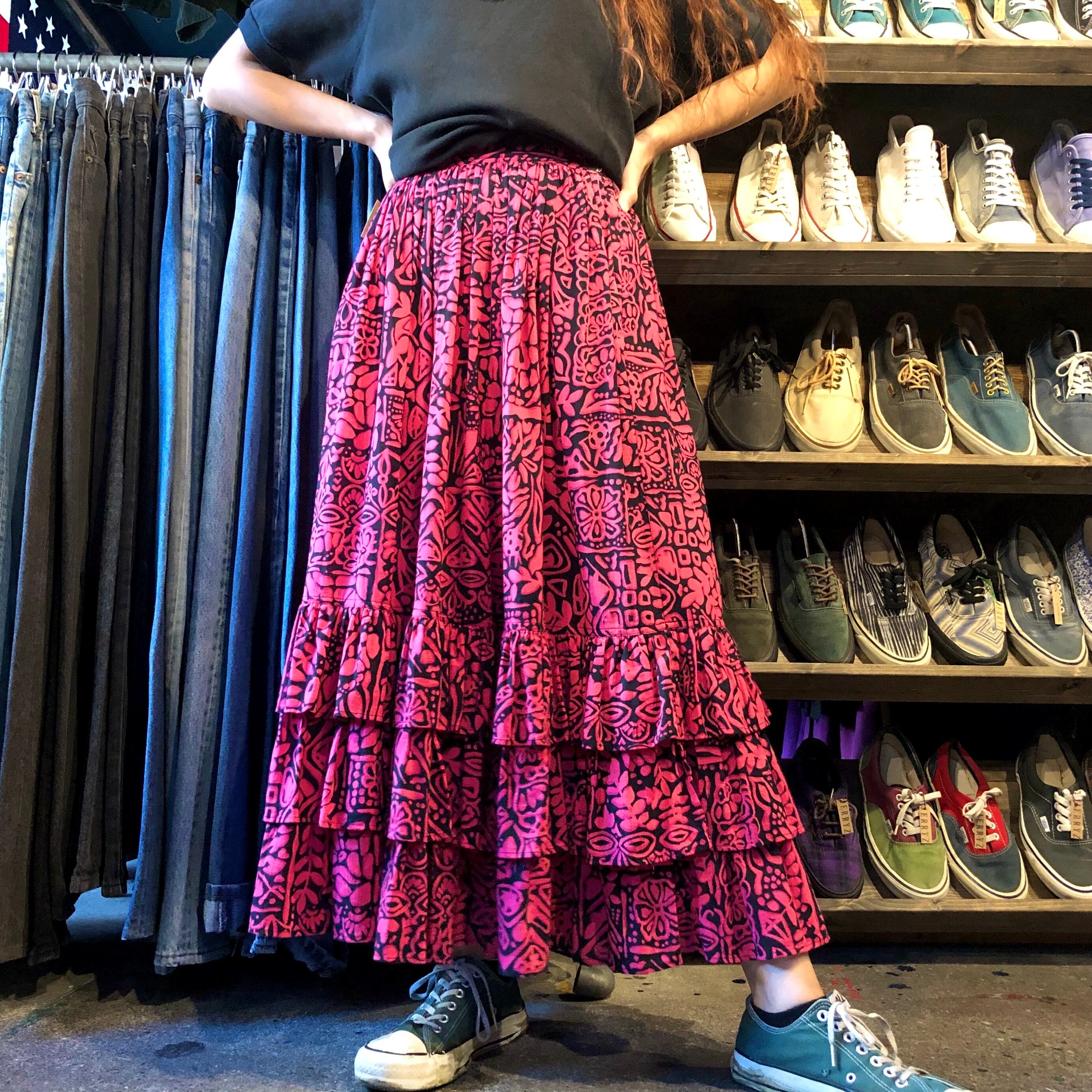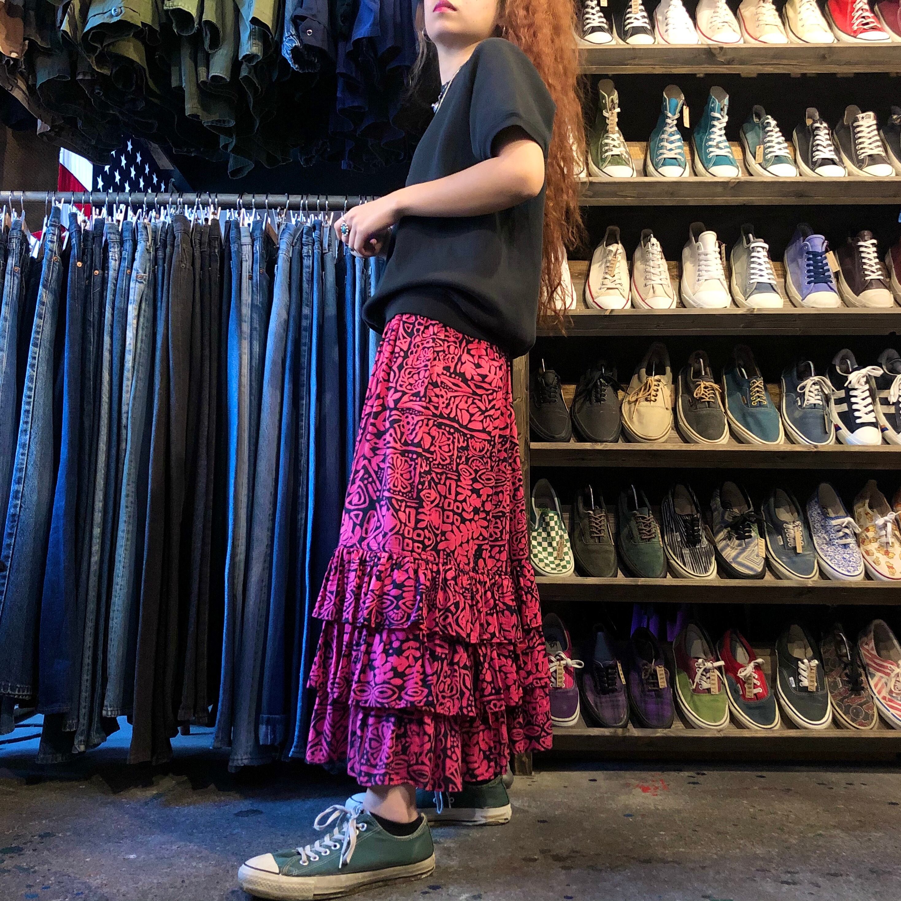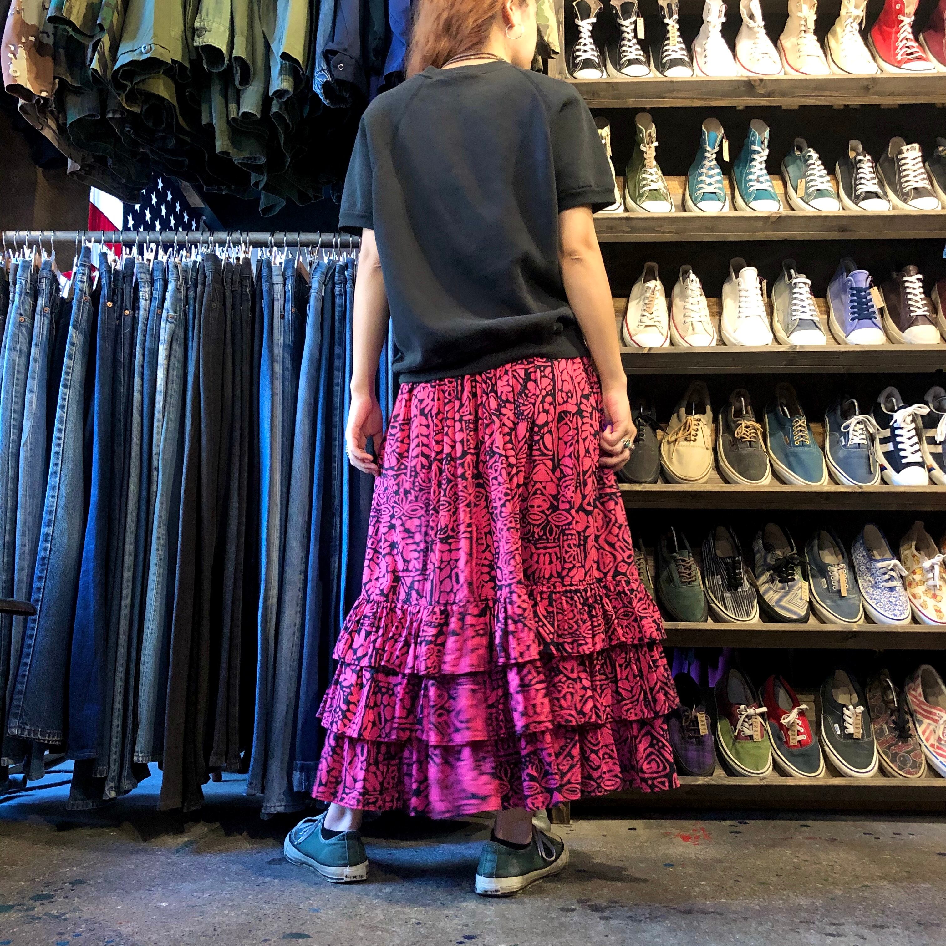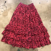 薄手のコットンをふんだんに使ってあるスカートです。柄や色合いがとてもかわいくて、裾に3段のフリルがあるシルエットも素敵です。