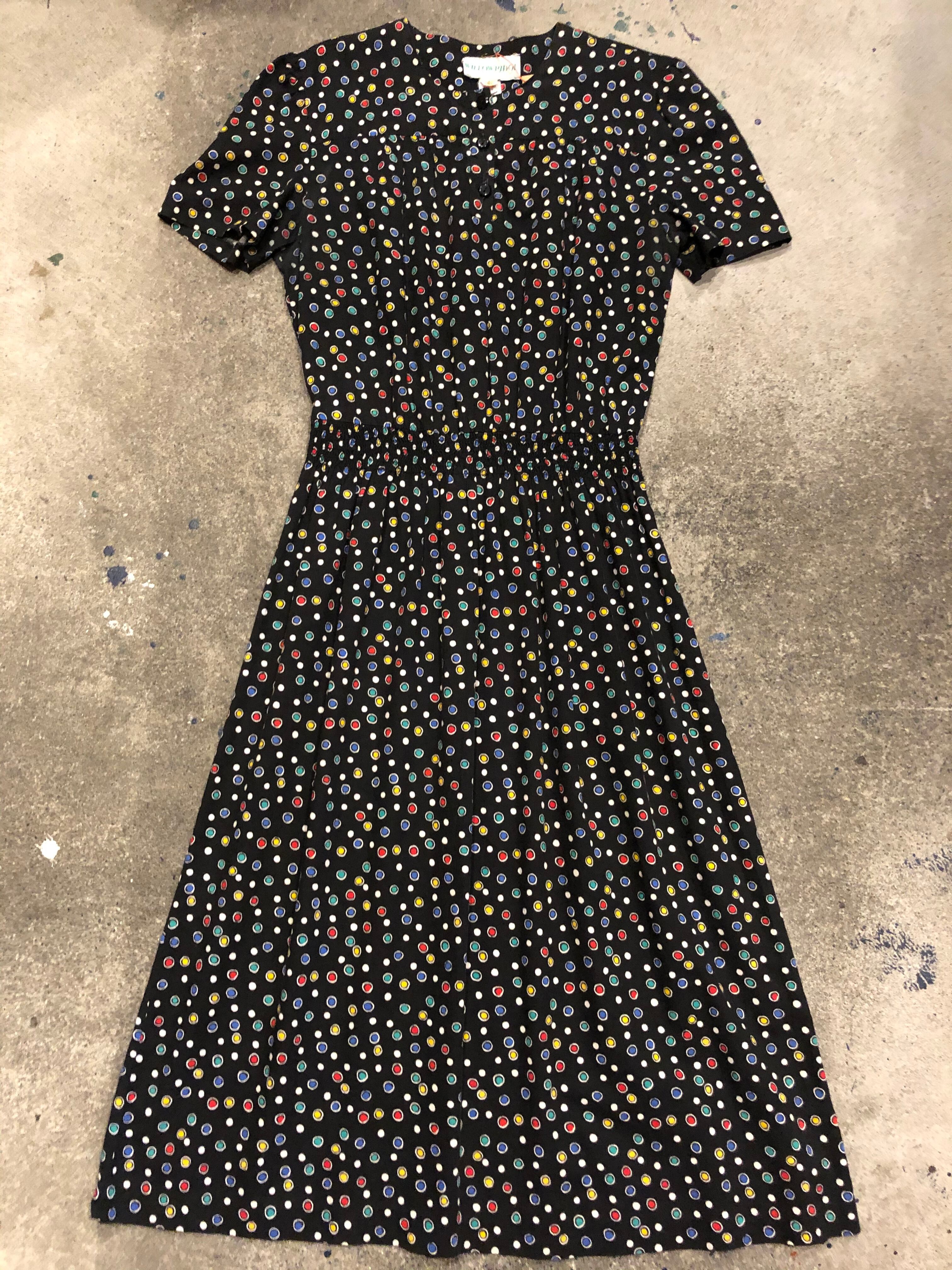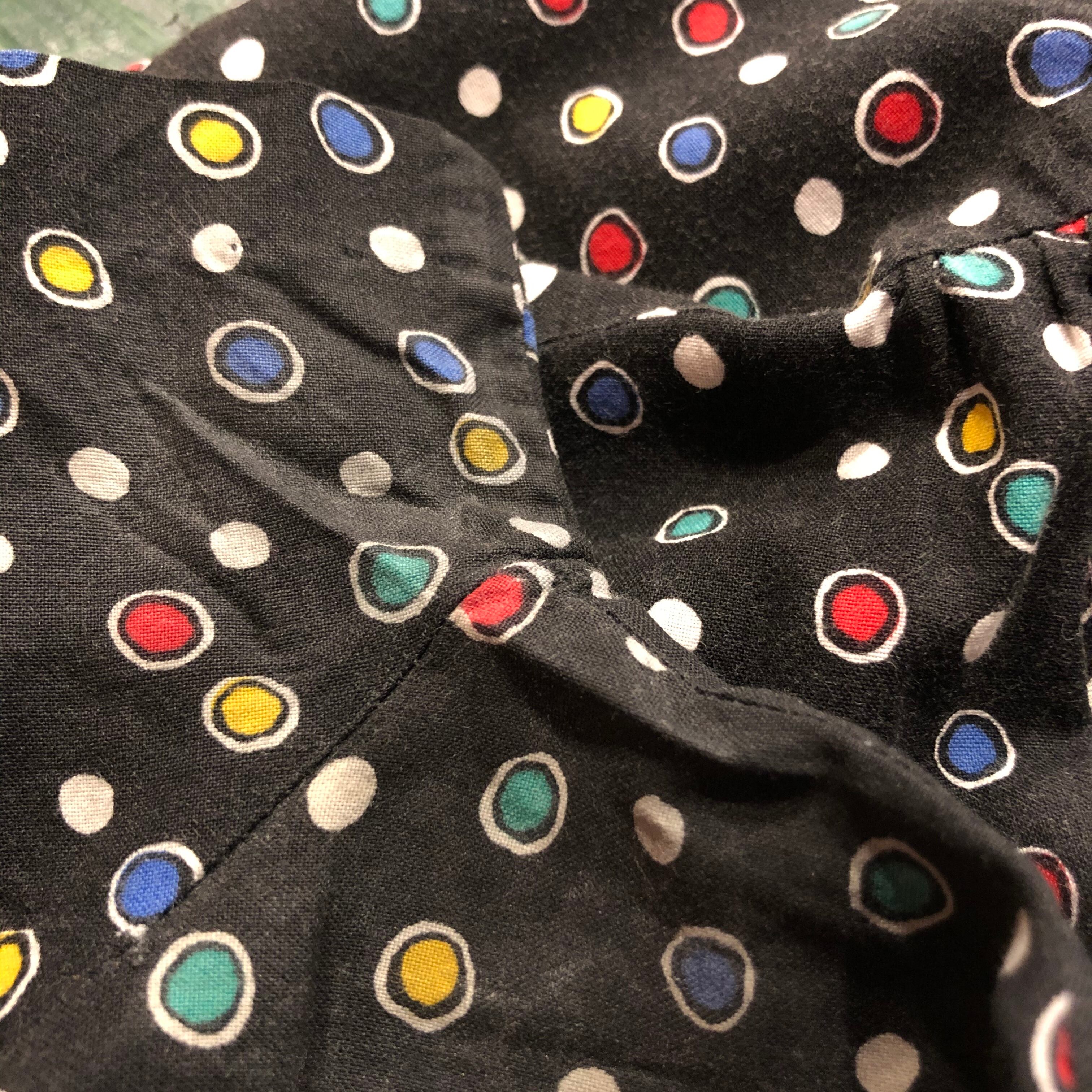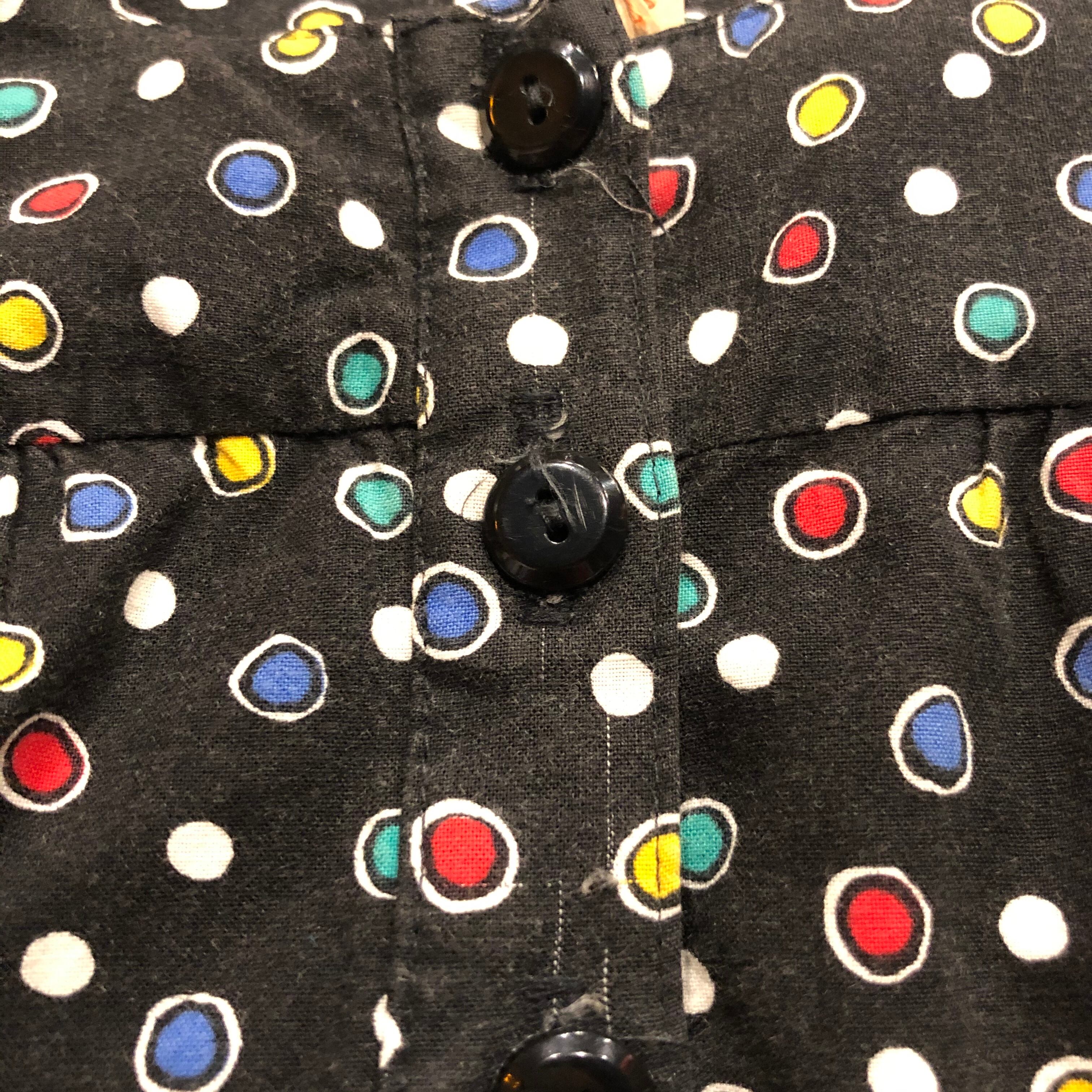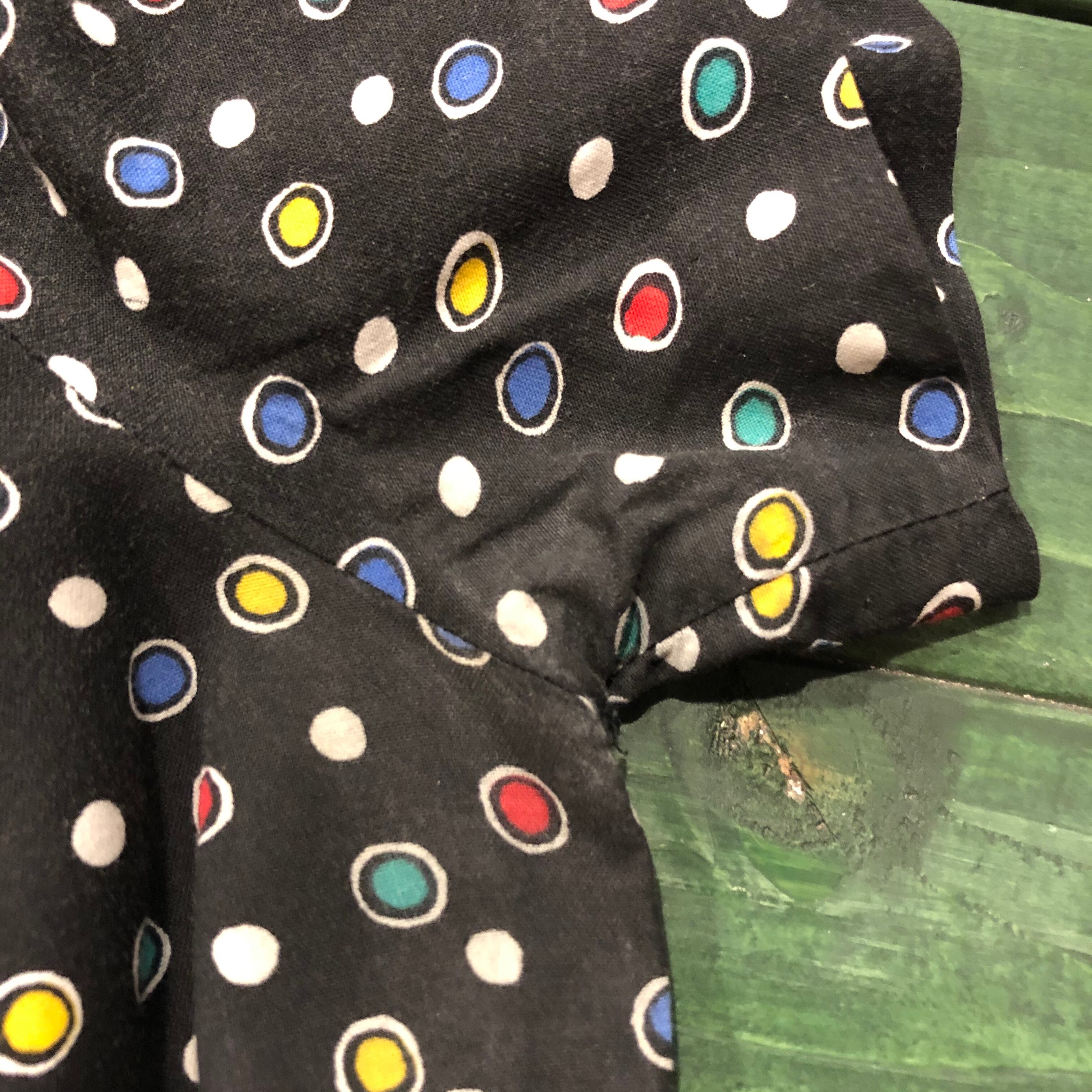黒地にカラフルなドット模様がかわいいワンピースです。ウエストがシャーリングになっており、メリハリのあるシンプルなシルエットが子供っぽくなく良い感じです。頭にスカーフ巻いたり真っ赤なスニーカーを合わしたりしてもかわいいと思います!