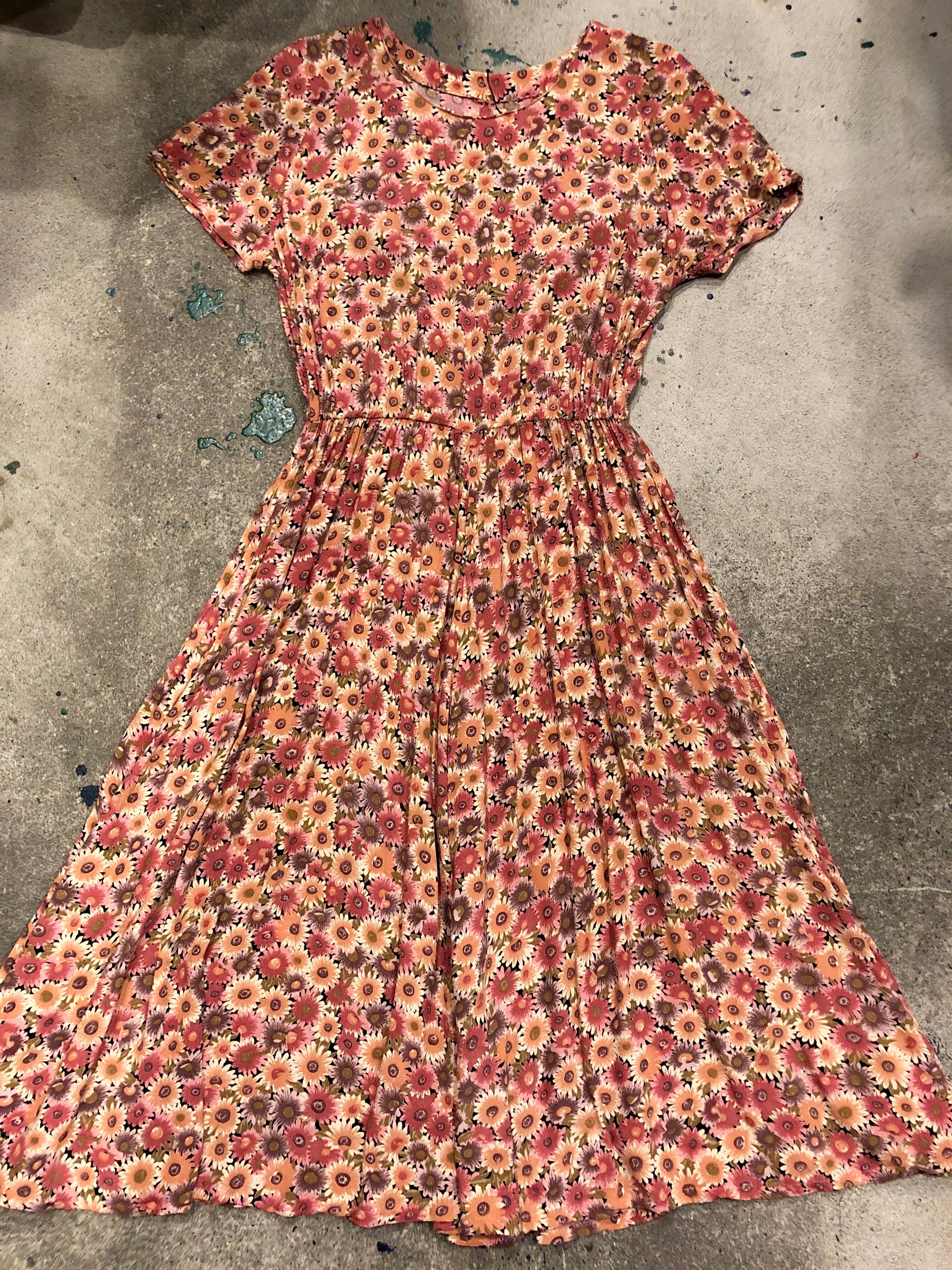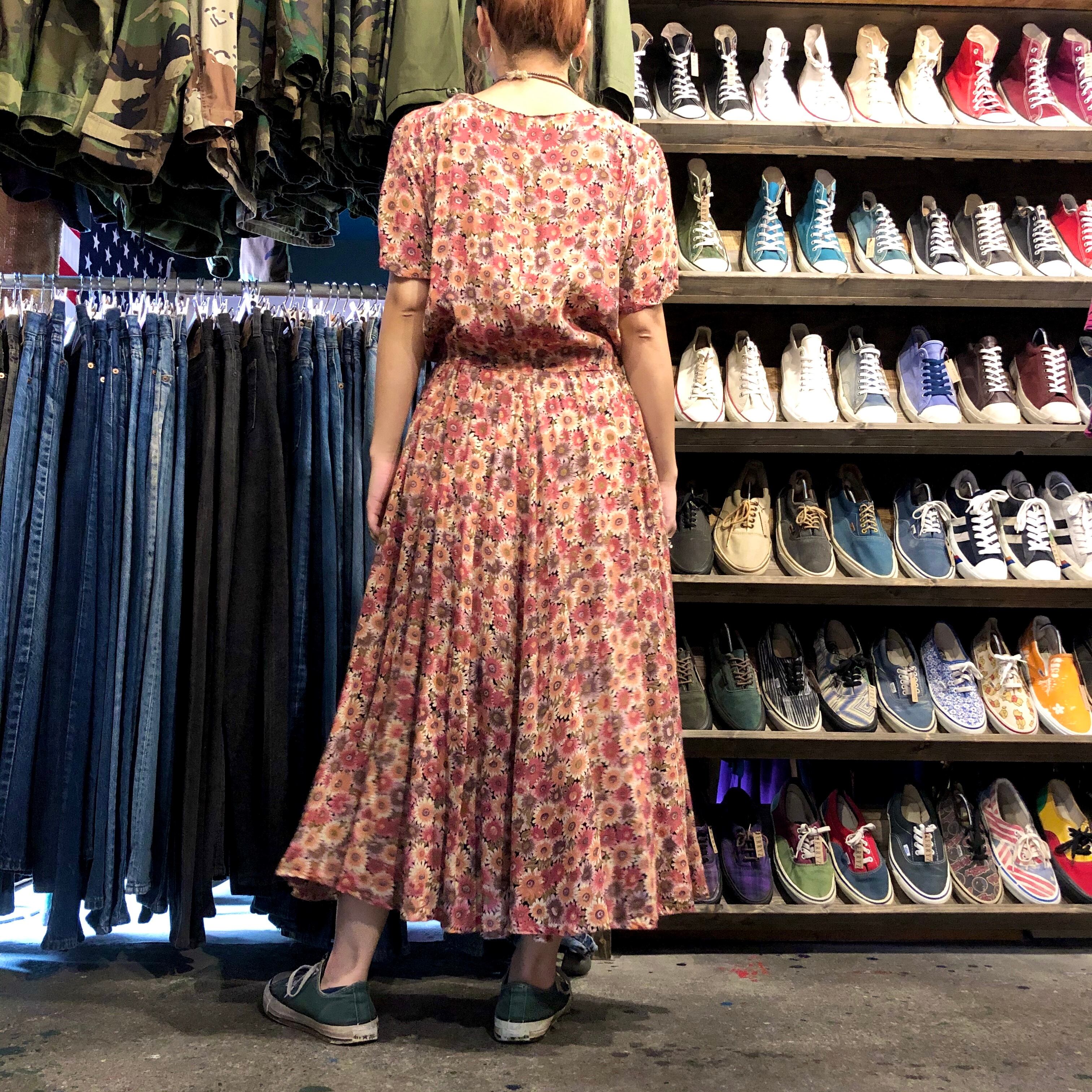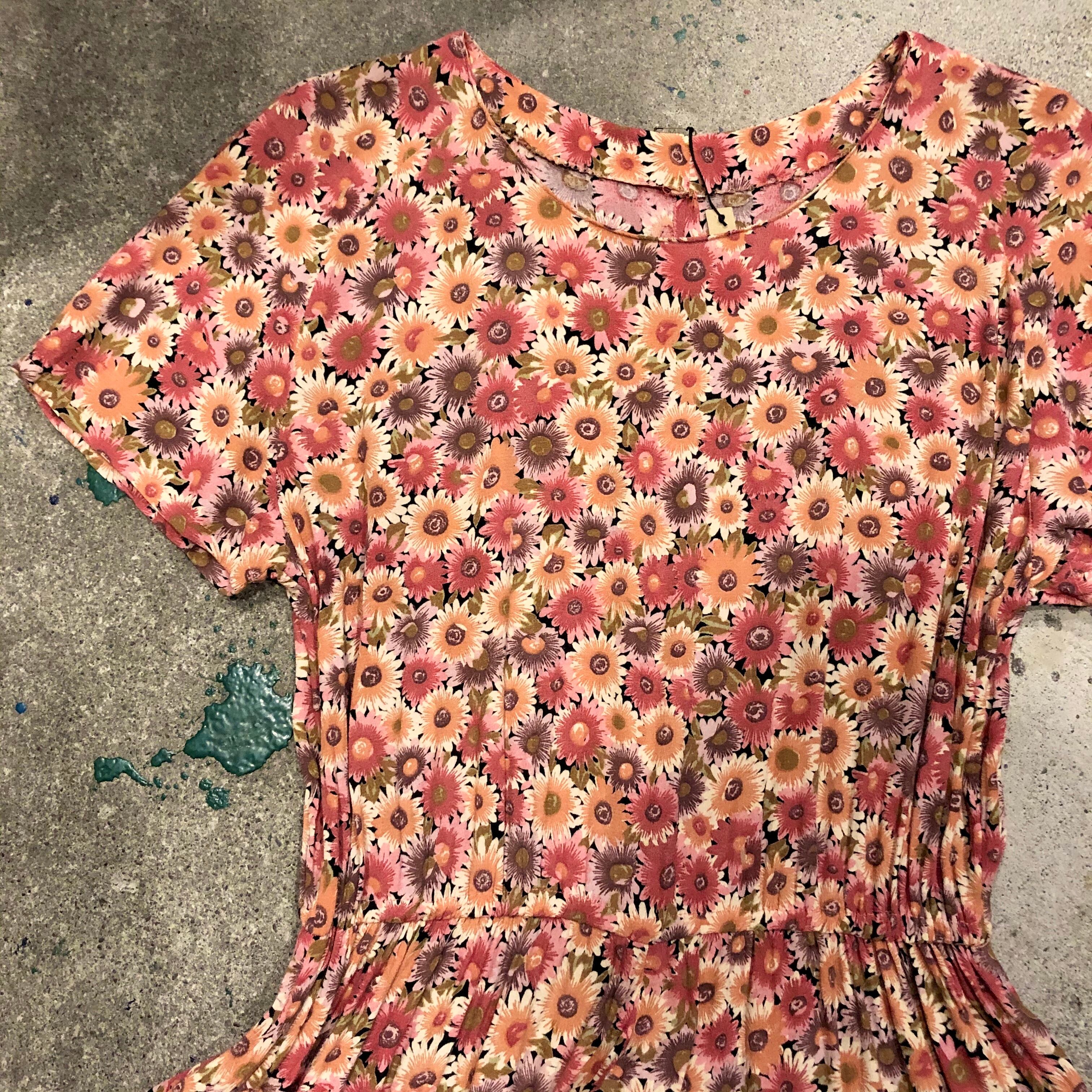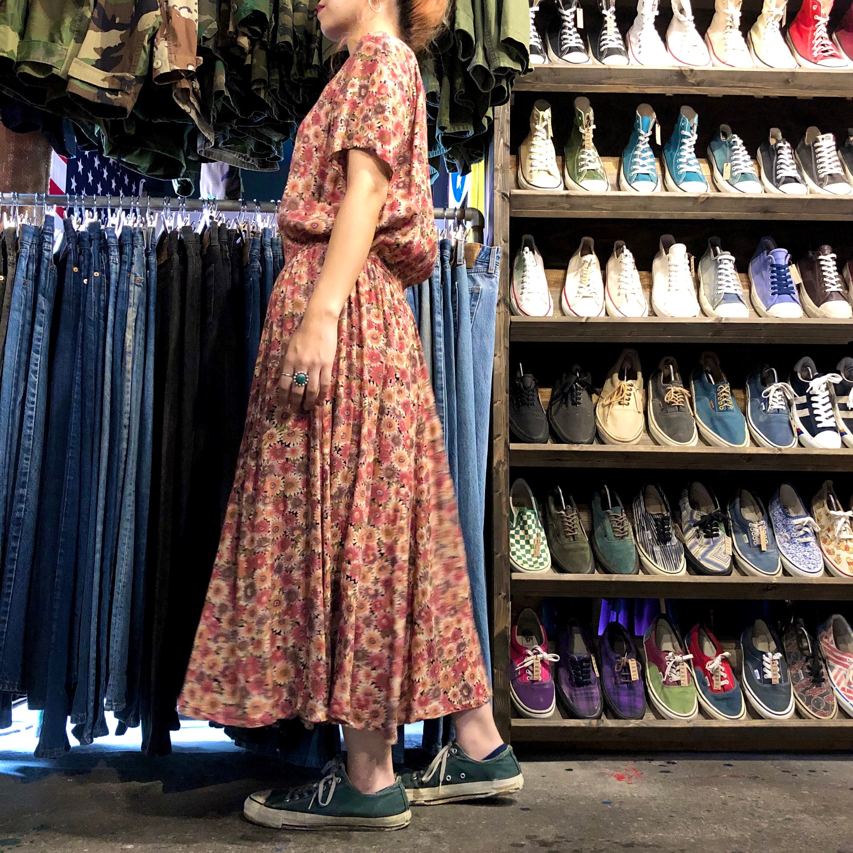 落ち着いた秋っぽい色合いの花柄ワンピースです。とてもシンプルな作りで、縫代の処理などからハンドメイドによるものだと思われます。シンプルではありますが、形が綺麗でスカートのボリュームも程よく良い感じです。
