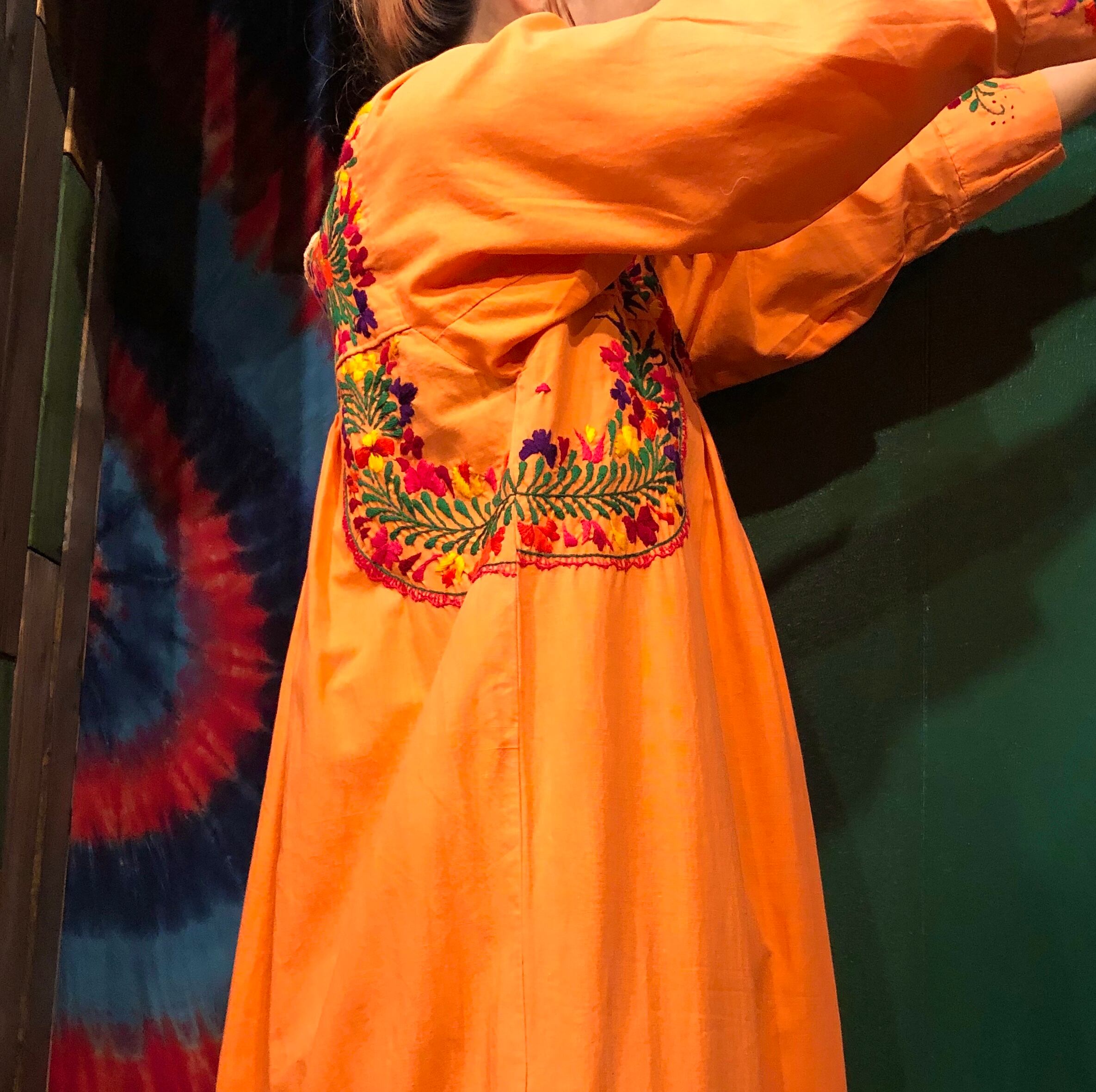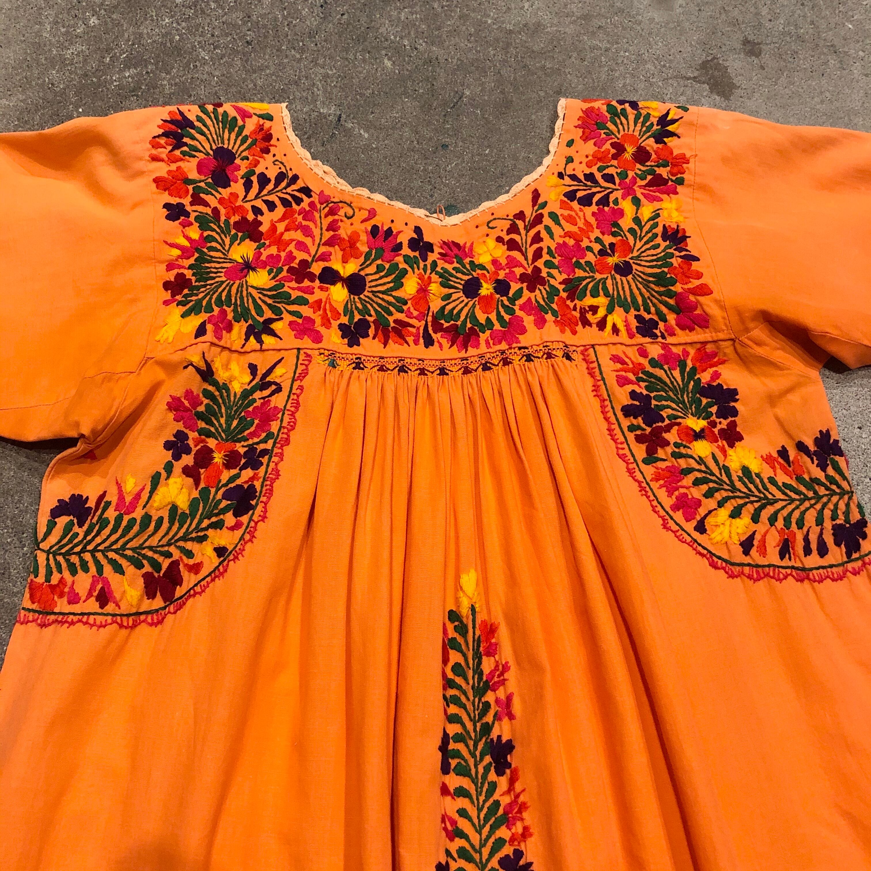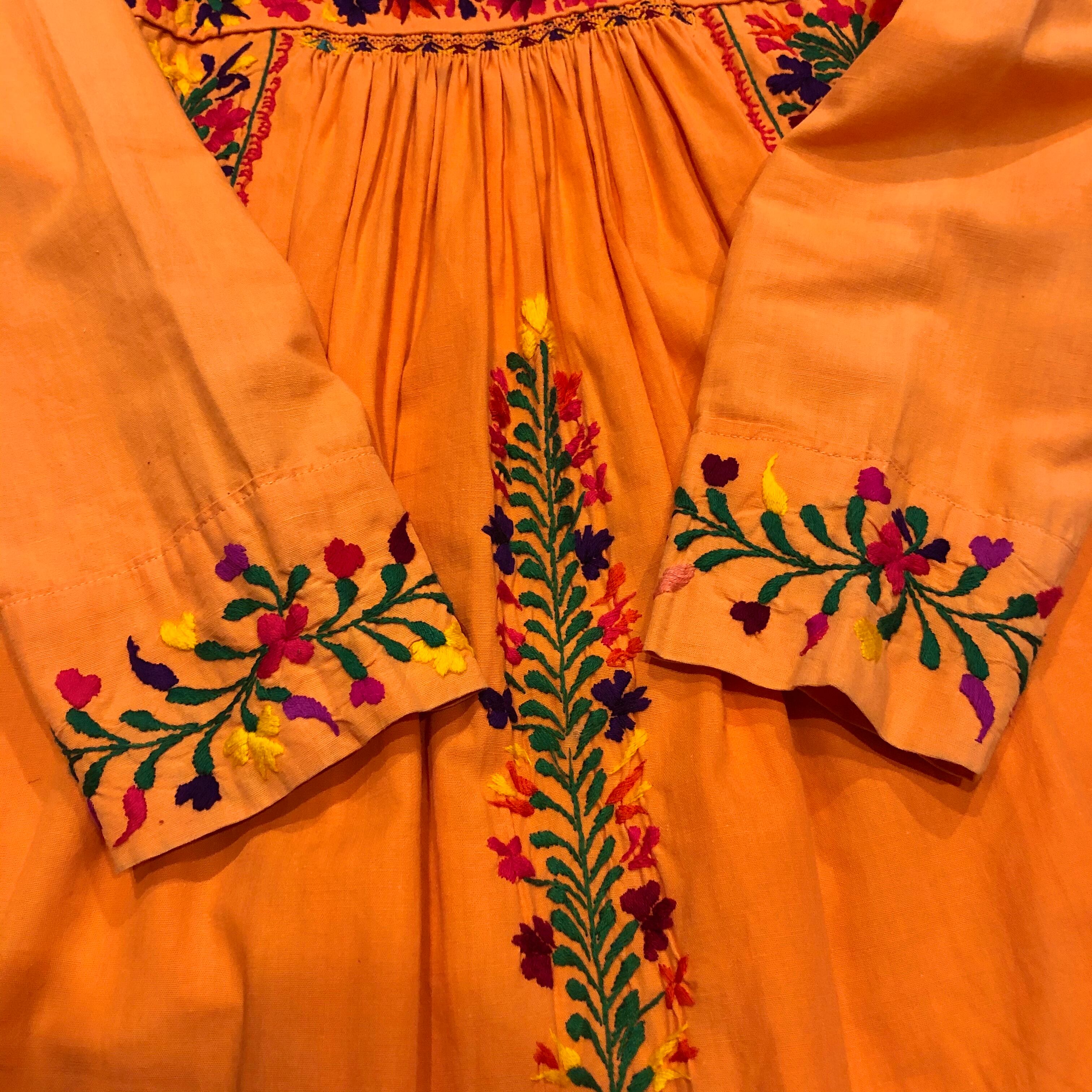 メキシコ、サンアントニーノの刺繍ワンピースです。優しいオレンジにピンクを少し混ぜたような絶妙なかわいい色にパンジーなど素敵な手刺繍が施されており、見惚れてしまう美しさです。長袖は半袖に比べると数が少ないので貴重な一着です。
