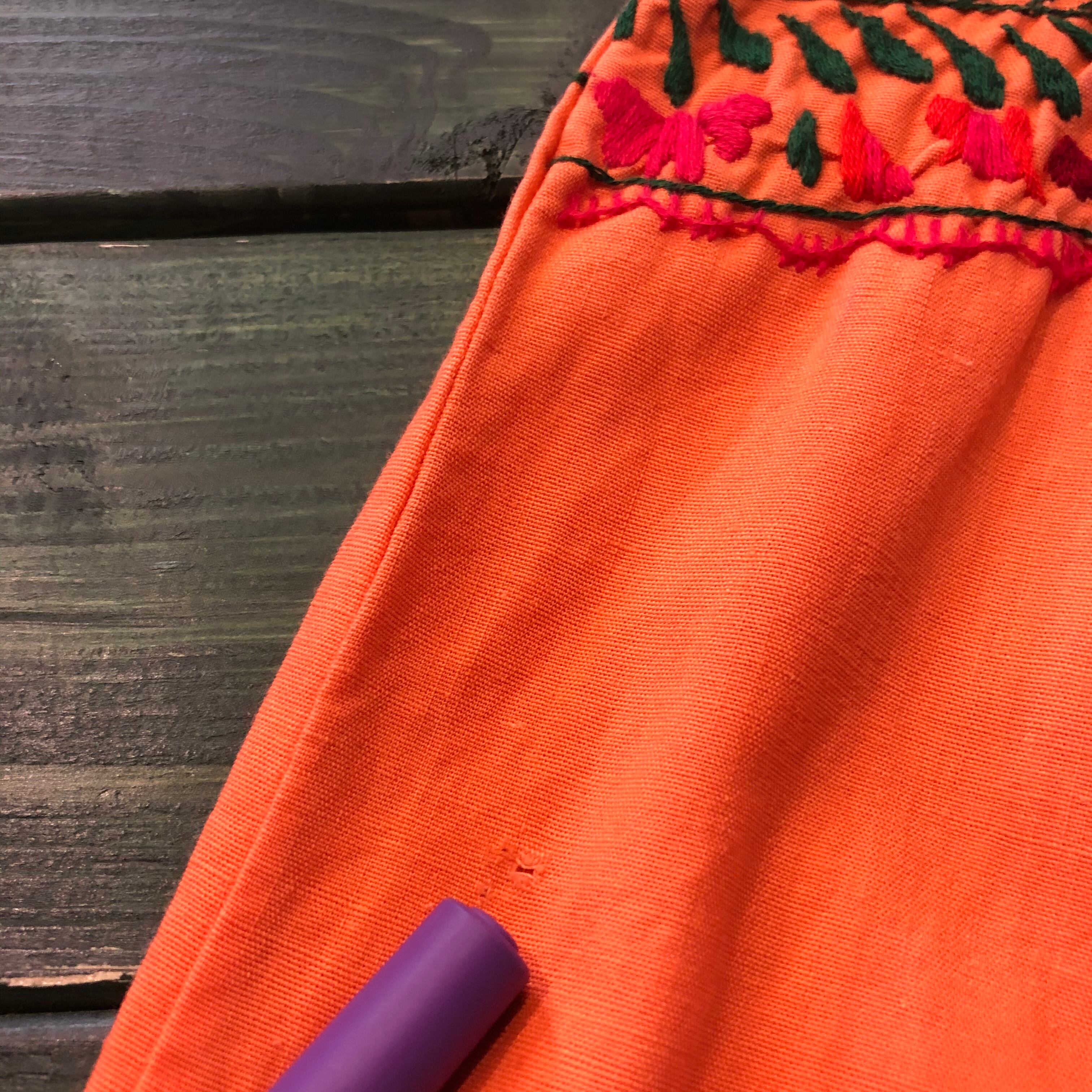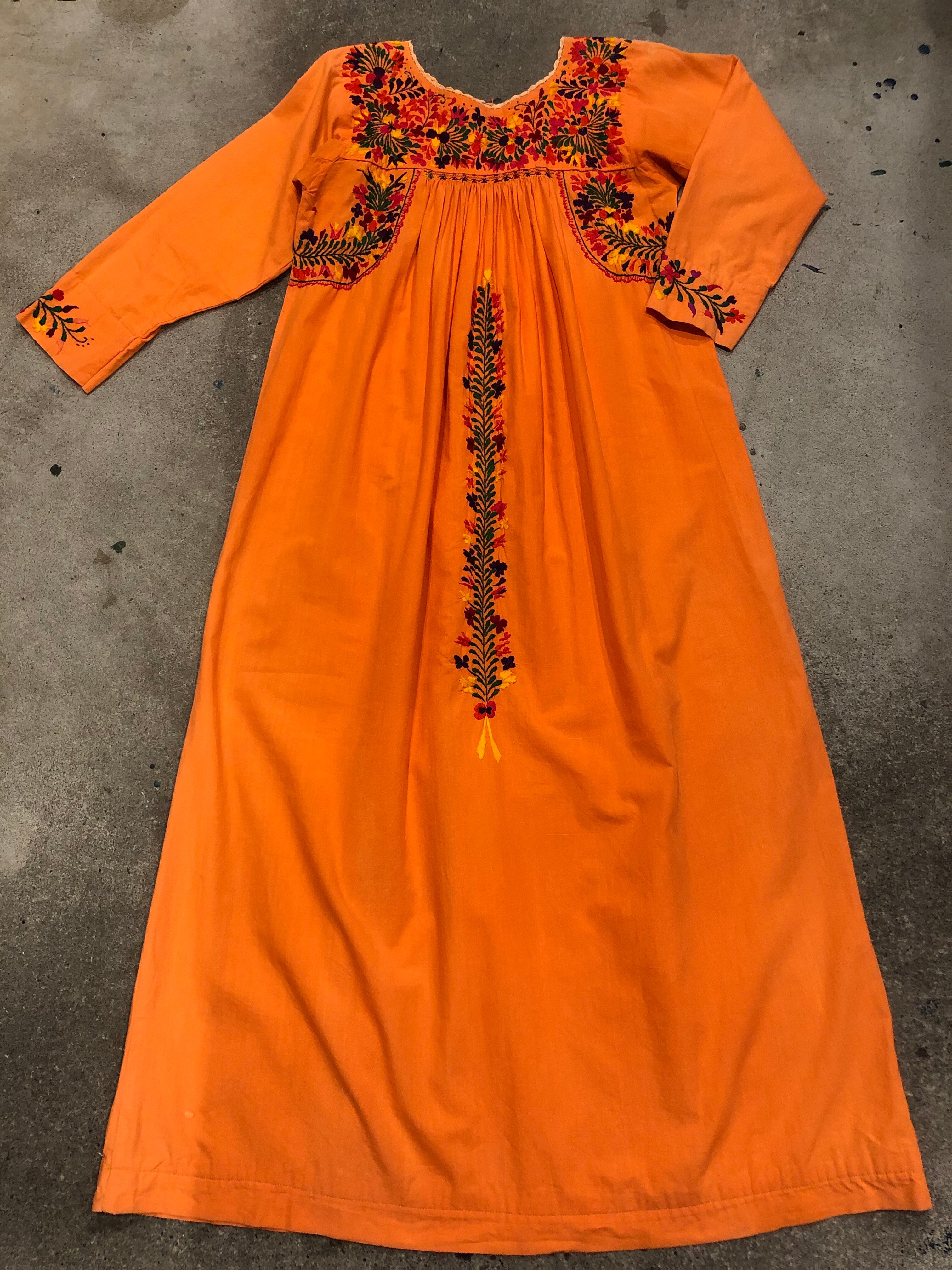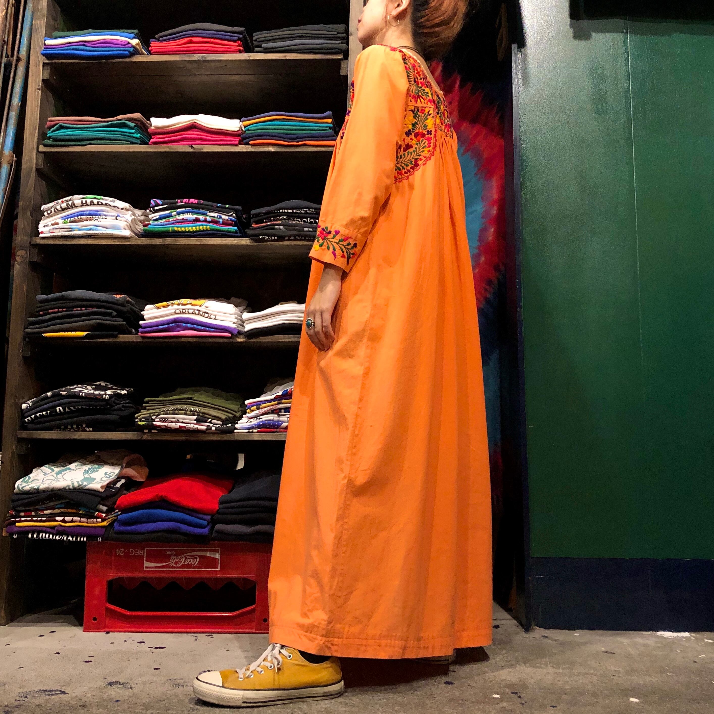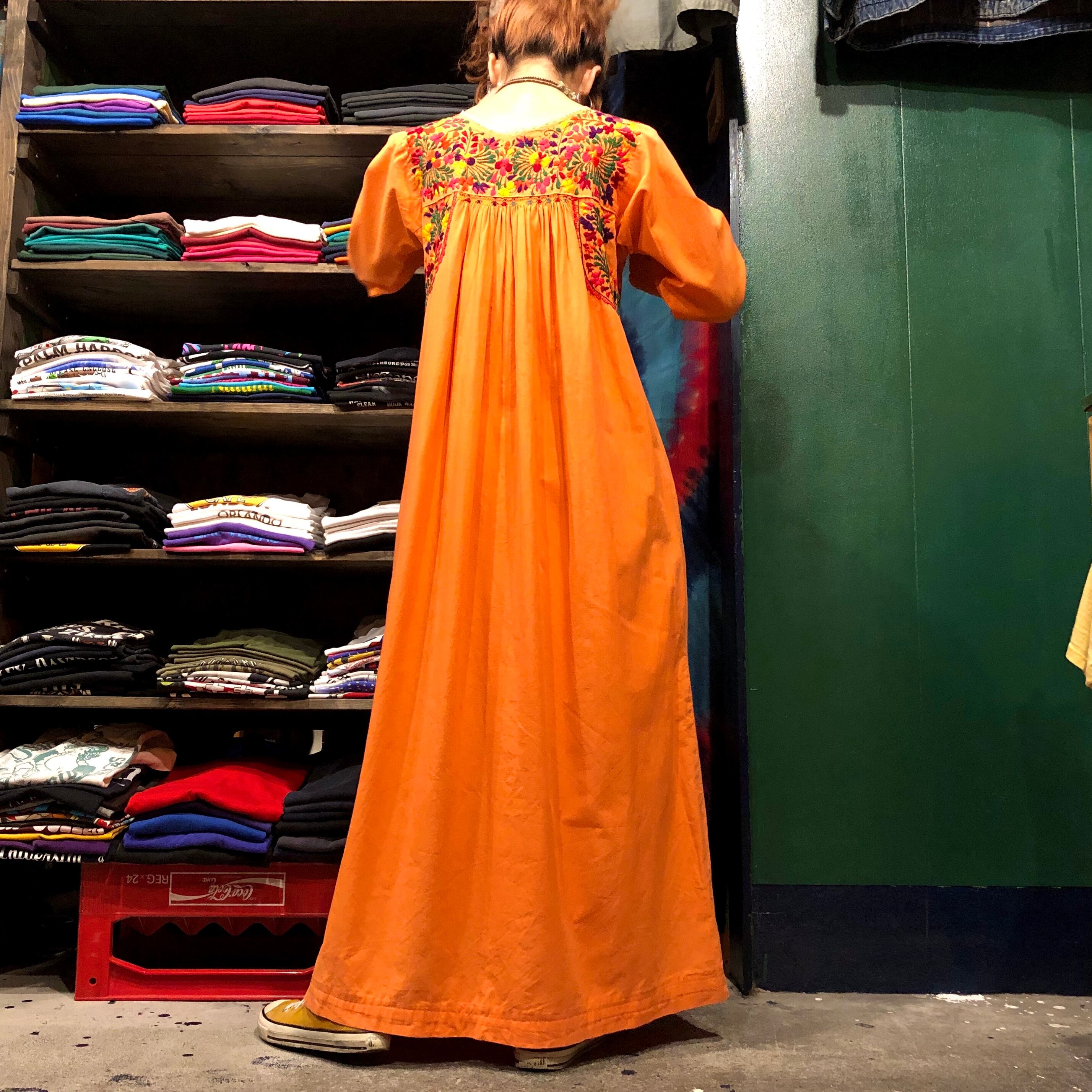 メキシコ、サンアントニーノの刺繍ワンピースです。優しいオレンジにピンクを少し混ぜたような絶妙なかわいい色にパンジーなど素敵な手刺繍が施されており、見惚れてしまう美しさです。長袖は半袖に比べると数が少ないので貴重な一着です。