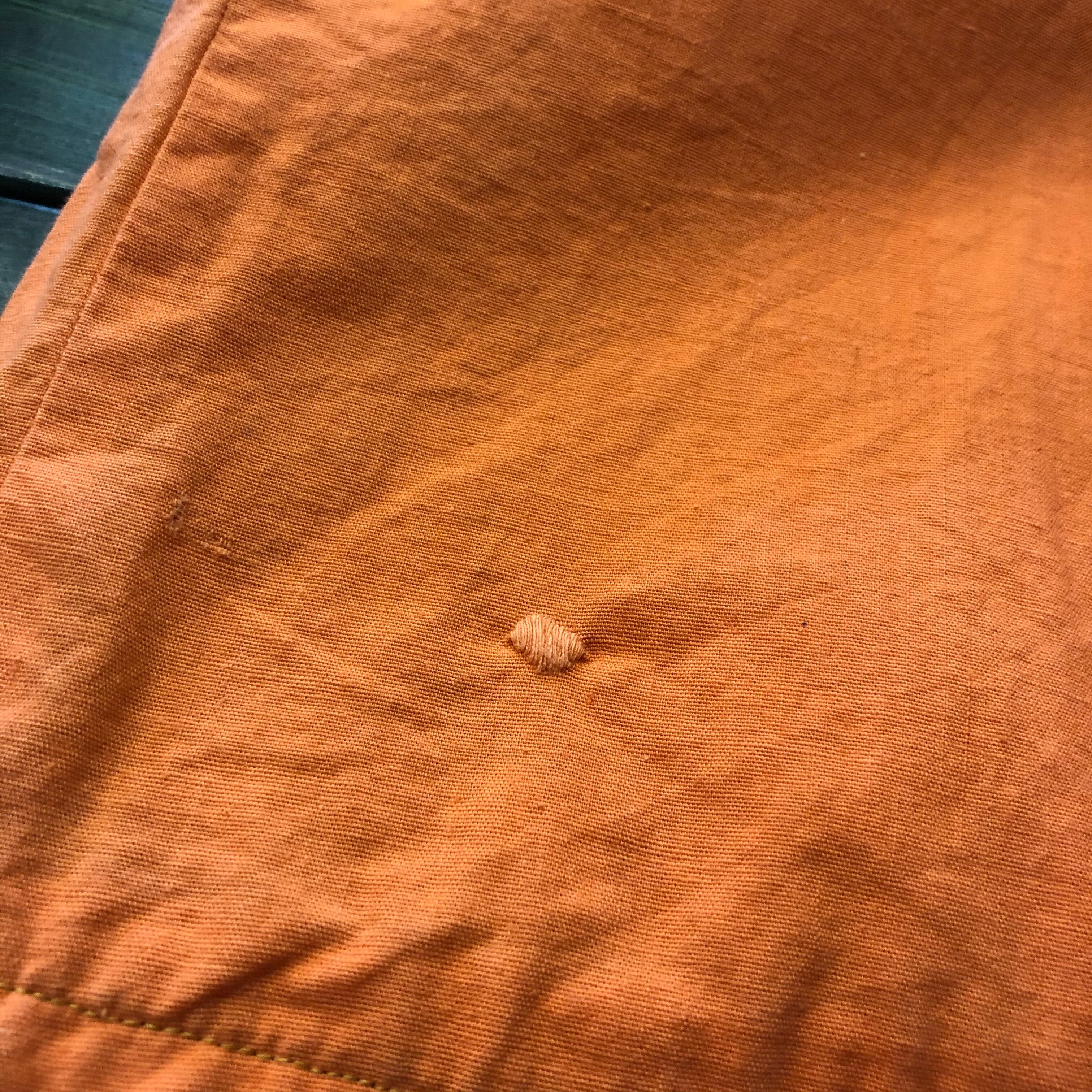 ピンホールやリペアが数カ所あります。ミシンでぐるっと縫った裾上げがされています。古着にご理解のある方のご購入をお願い致します。