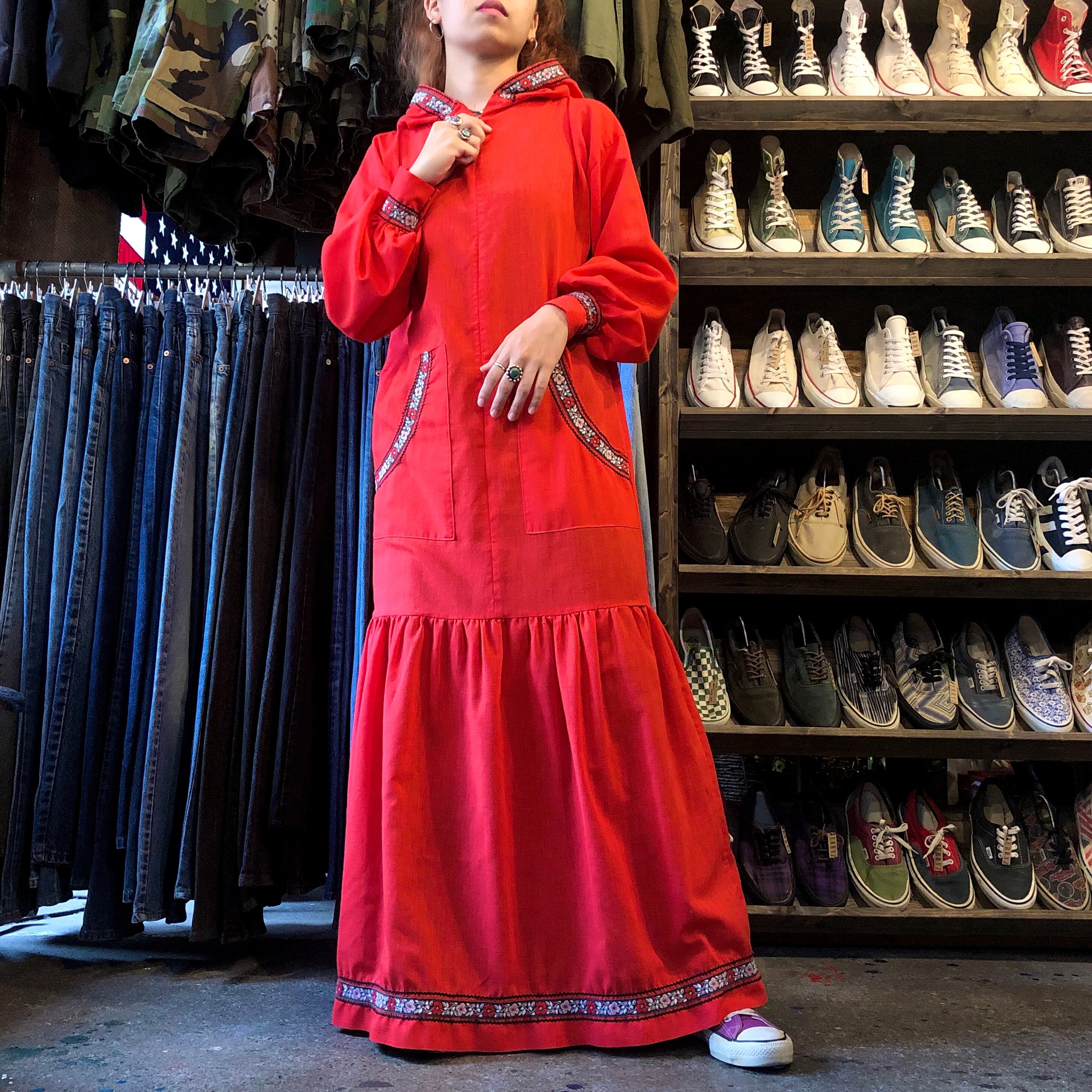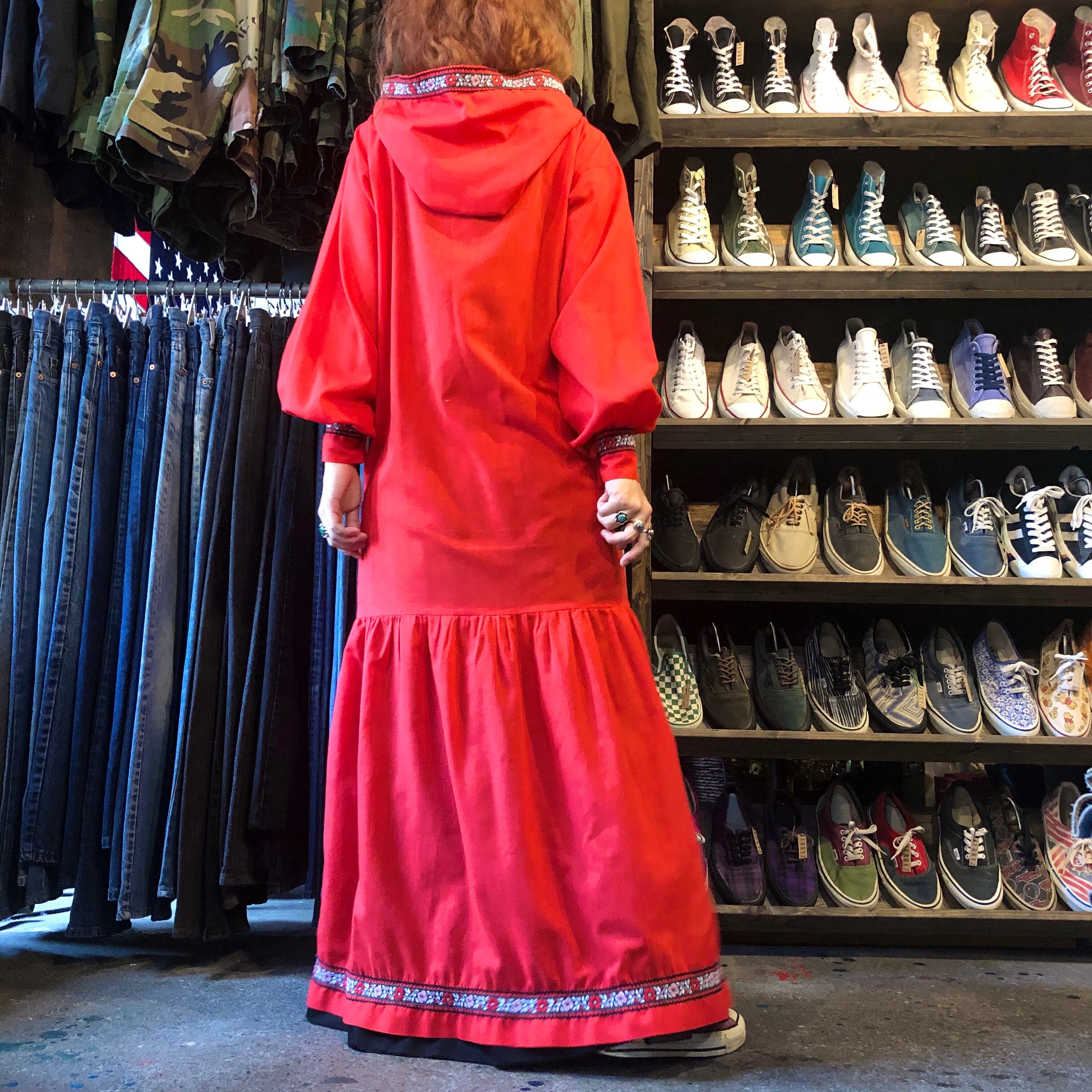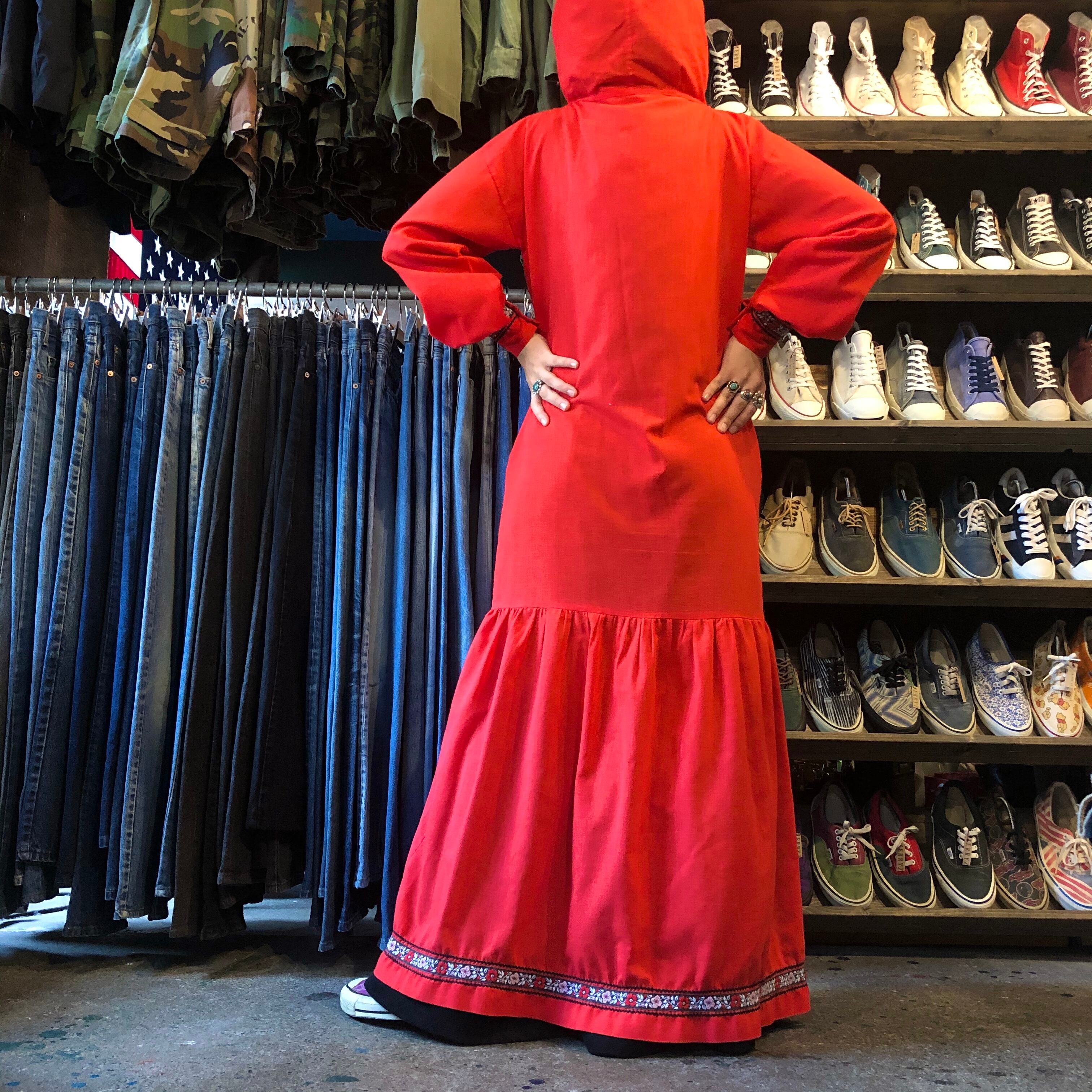 真っ赤なフード付きのワンピースです。袖口や裾にチロリアンテープと山道テープが付いており、かわいらしい雰囲気です。フロントジップでパッチポケットが付いていたりカジュアルなディテールも謎めいていてポイントです。薄手の素材で透けますのでご注意ください。