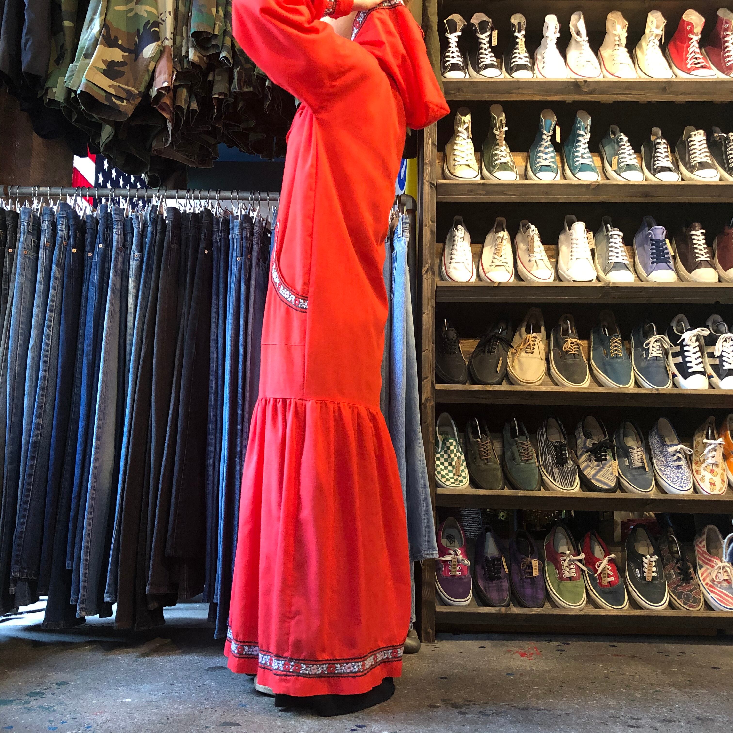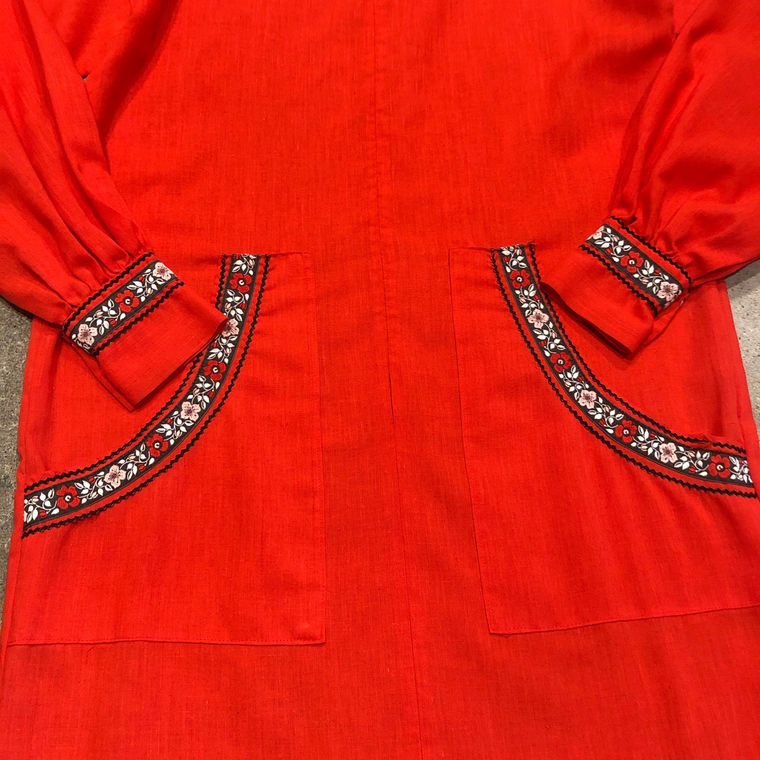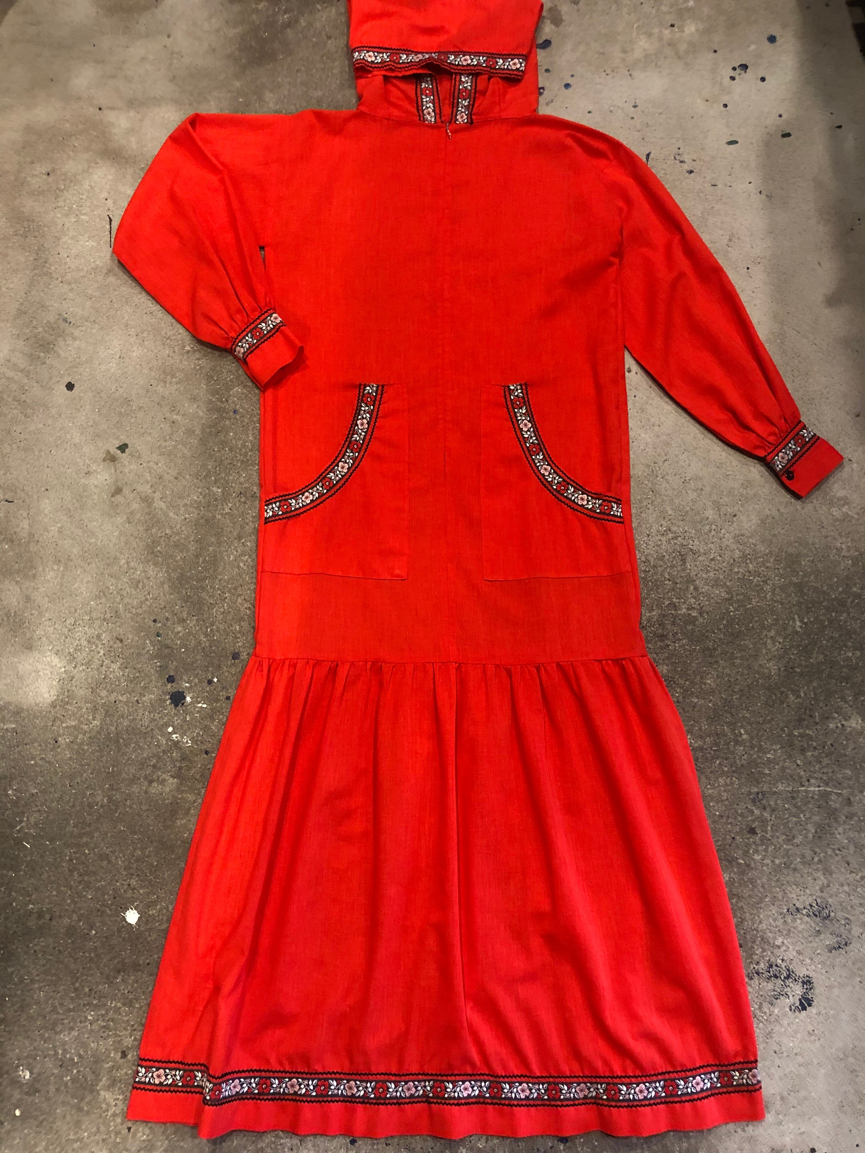 真っ赤なフード付きのワンピースです。袖口や裾にチロリアンテープと山道テープが付いており、かわいらしい雰囲気です。フロントジップでパッチポケットが付いていたりカジュアルなディテールも謎めいていてポイントです。薄手の素材で透けますのでご注意ください。