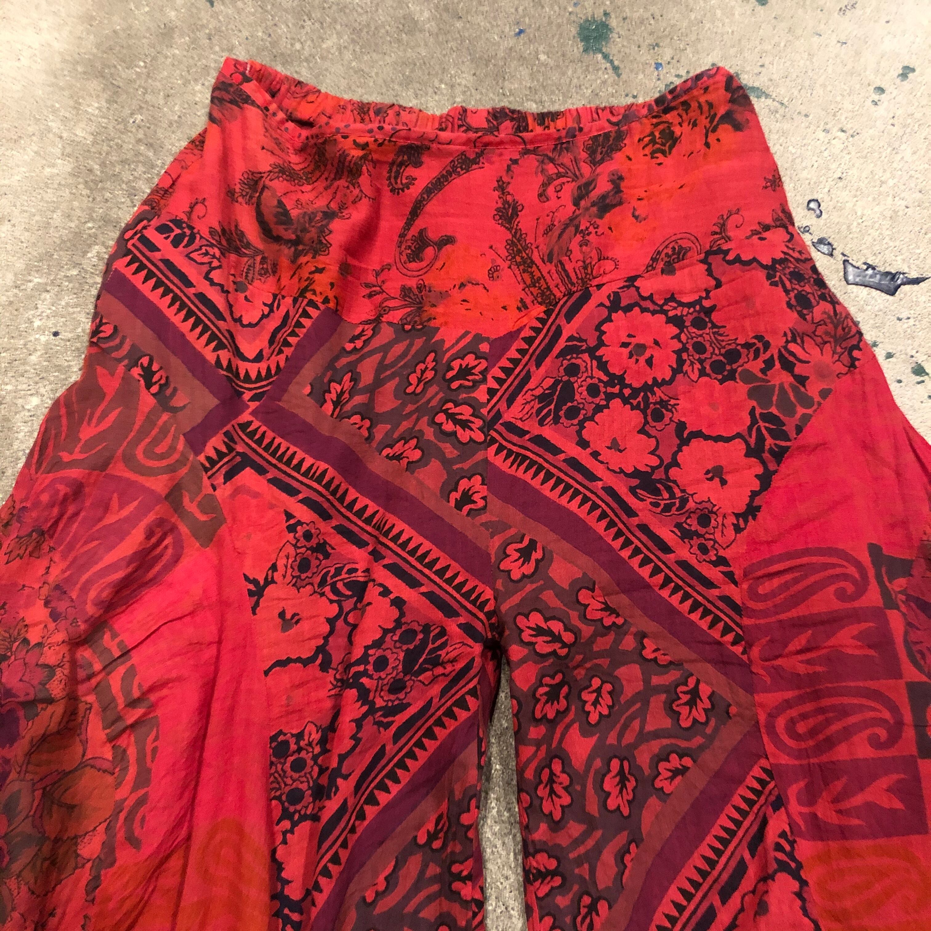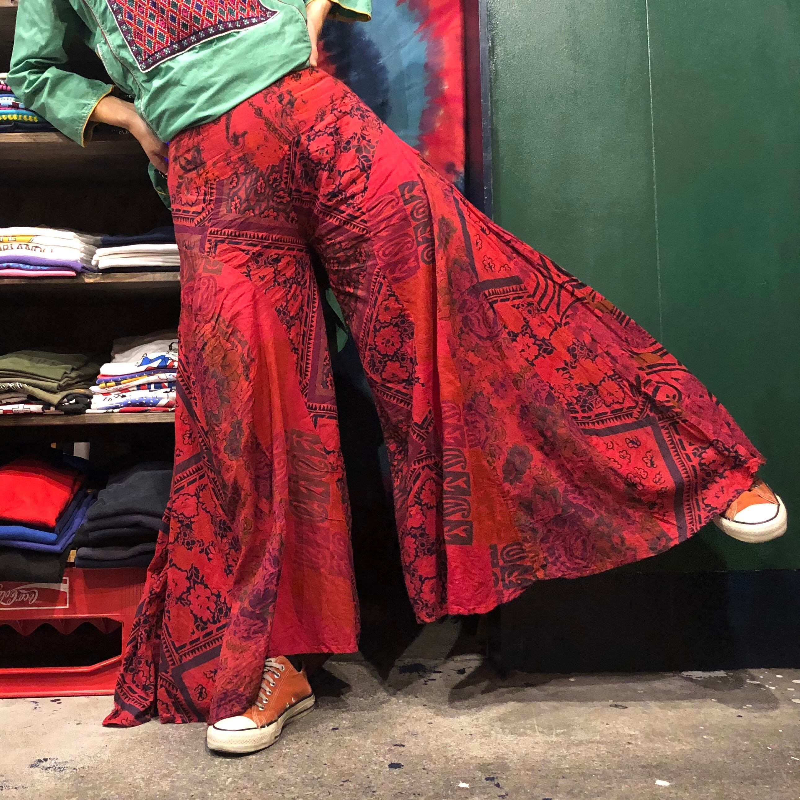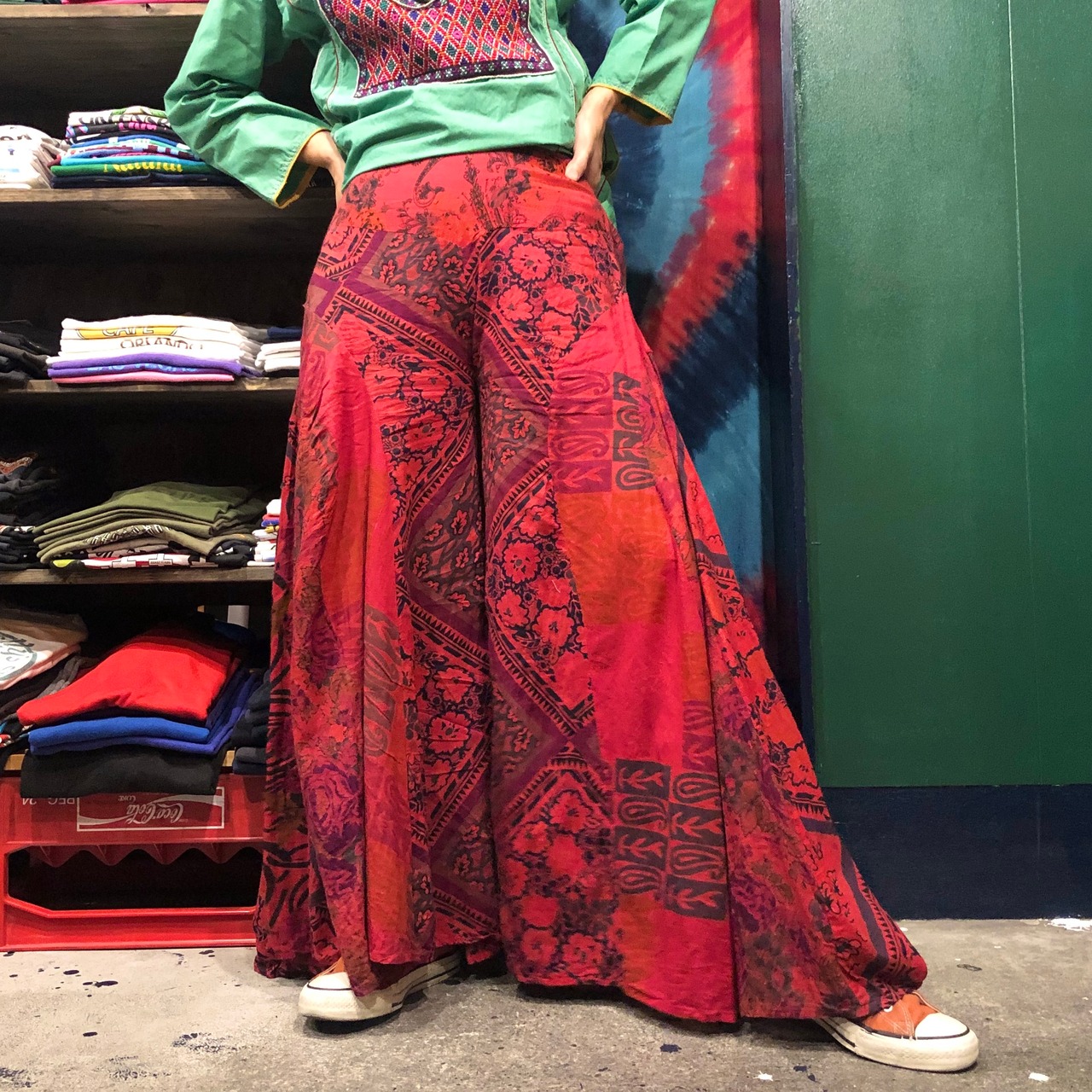 一見スカートに見えるかなりフレアなイージーパンツです。薄手のコットンで、短めの裏地も付いており、涼しく着られます。エスニックな雰囲気の柄の切り替えで良い感じのオーラがあります。Tシャツと合わせたり、ワンピースの下に合わせたりいろいろお使い頂けると思います。