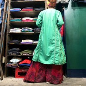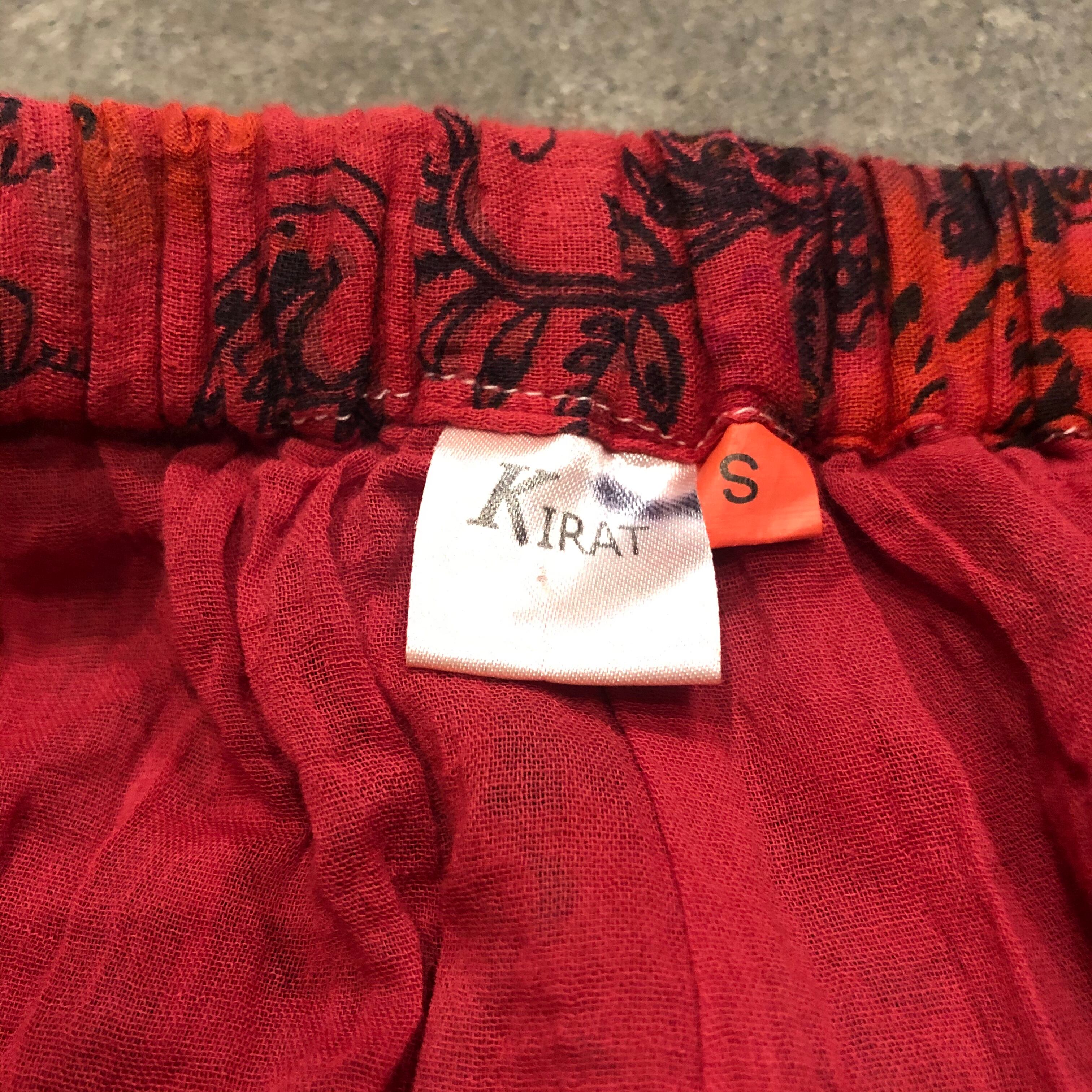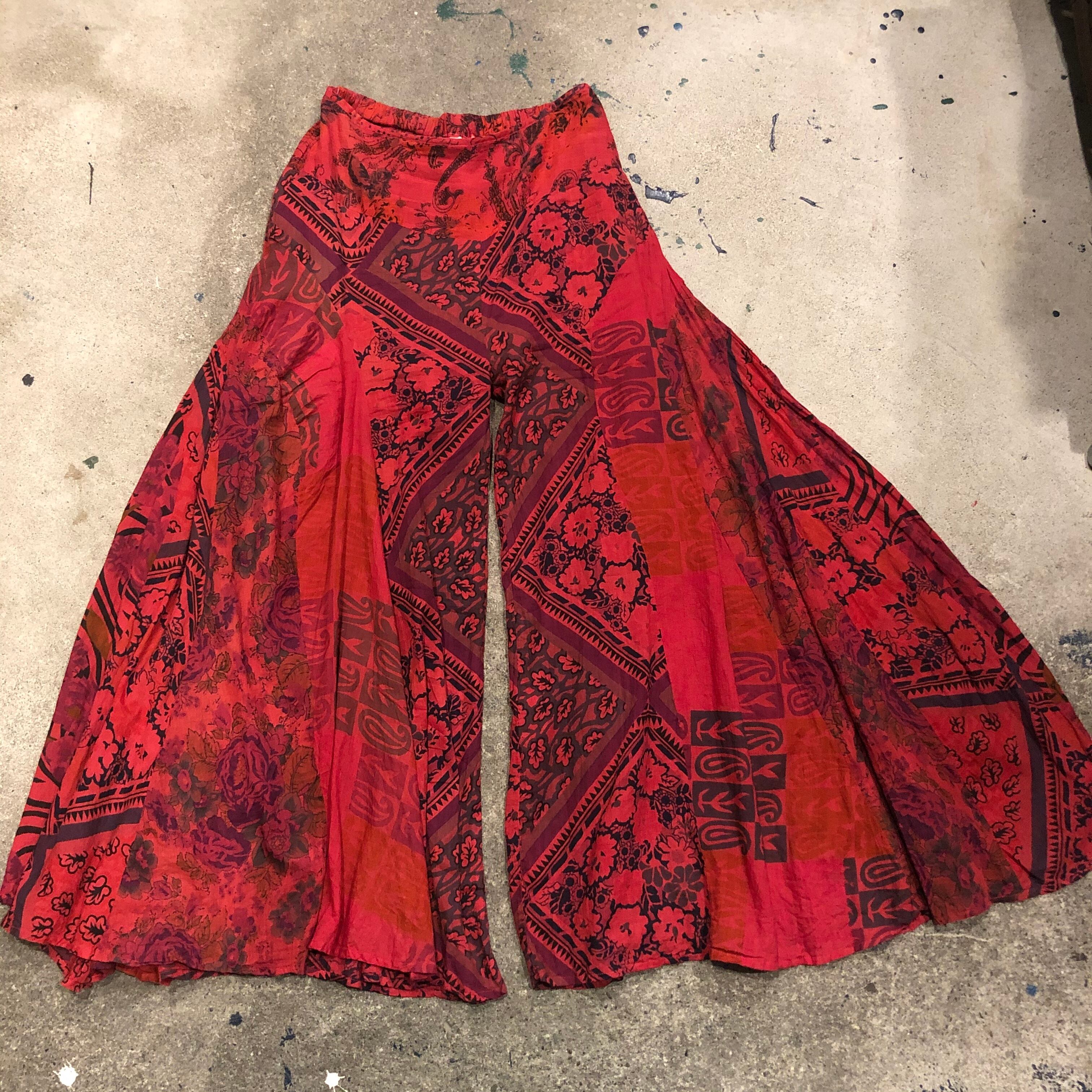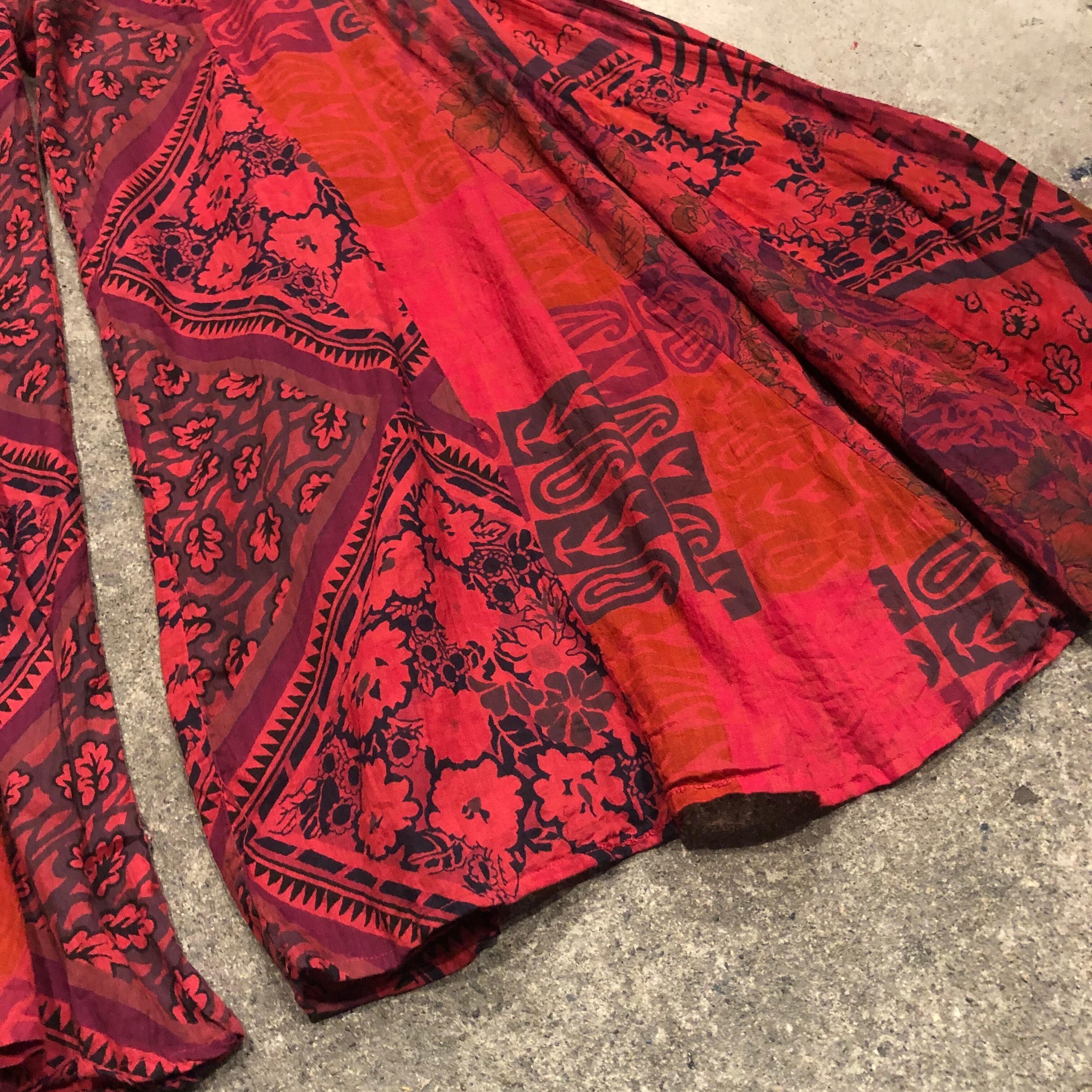 一見スカートに見えるかなりフレアなイージーパンツです。薄手のコットンで、短めの裏地も付いており、涼しく着られます。エスニックな雰囲気の柄の切り替えで良い感じのオーラがあります。Tシャツと合わせたり、ワンピースの下に合わせたりいろいろお使い頂けると思います。