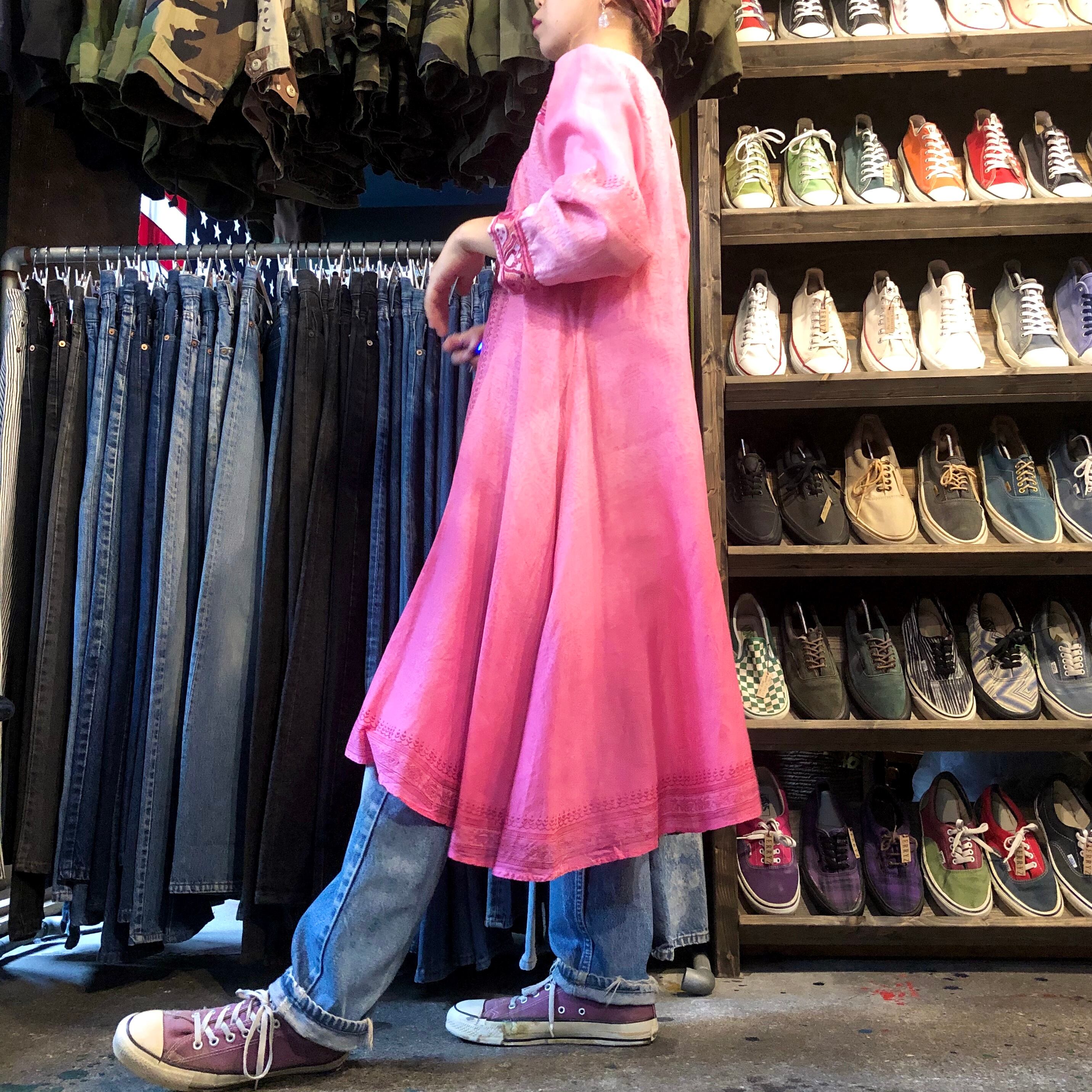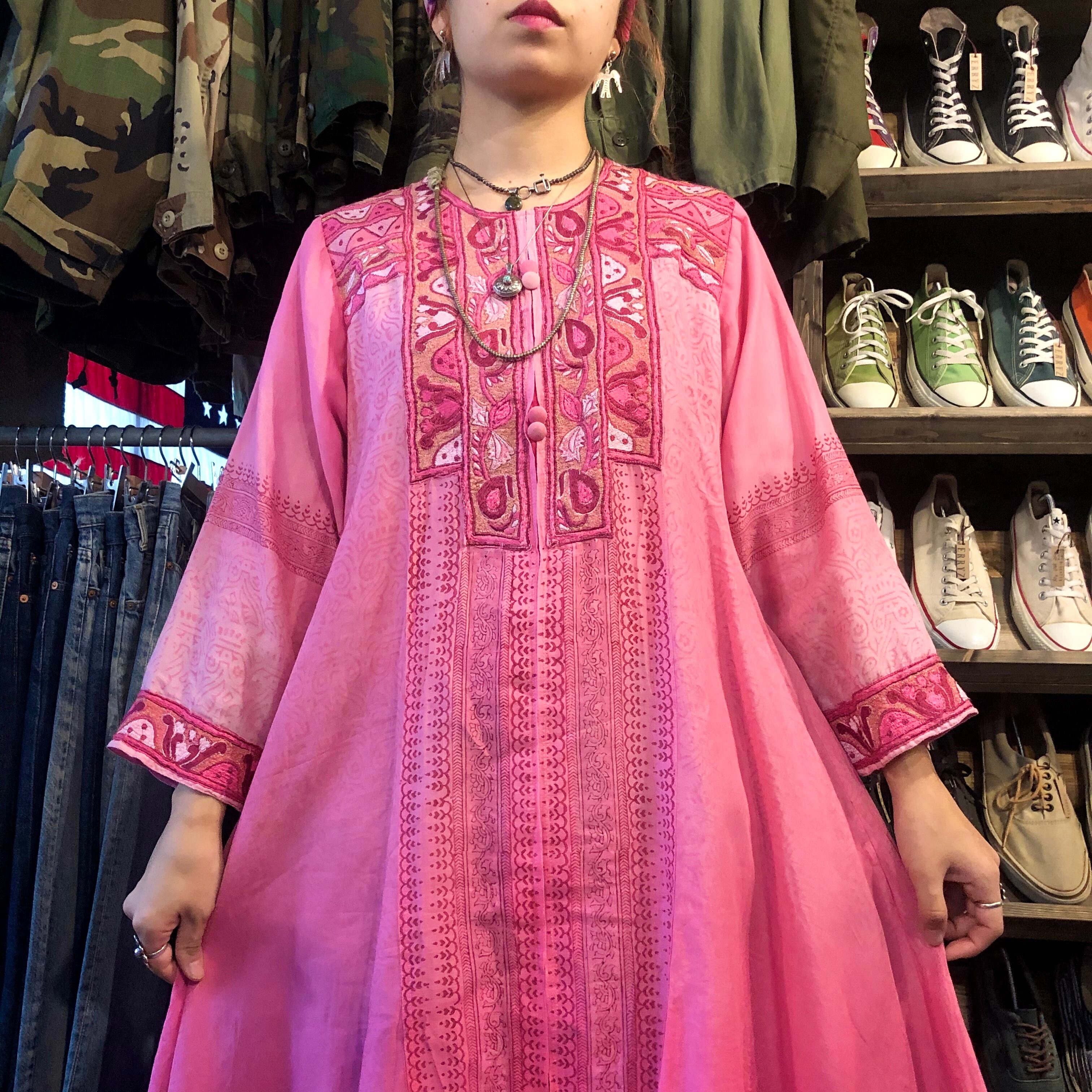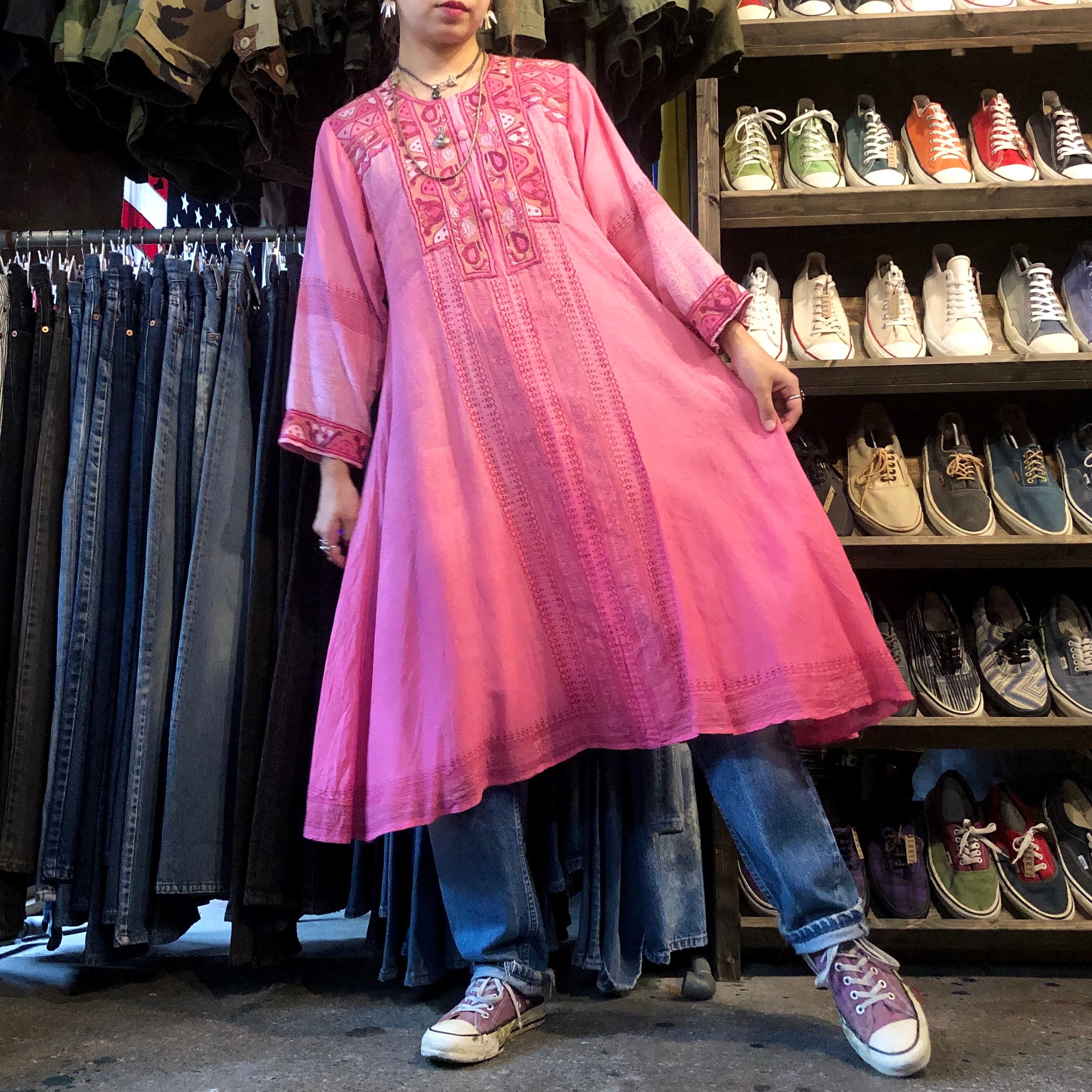 ピンクのグラデーションと刺繍がかわいいワンピースです。エスニックな雰囲気でこんなにピンクづくしなものは珍しいかと思われます。