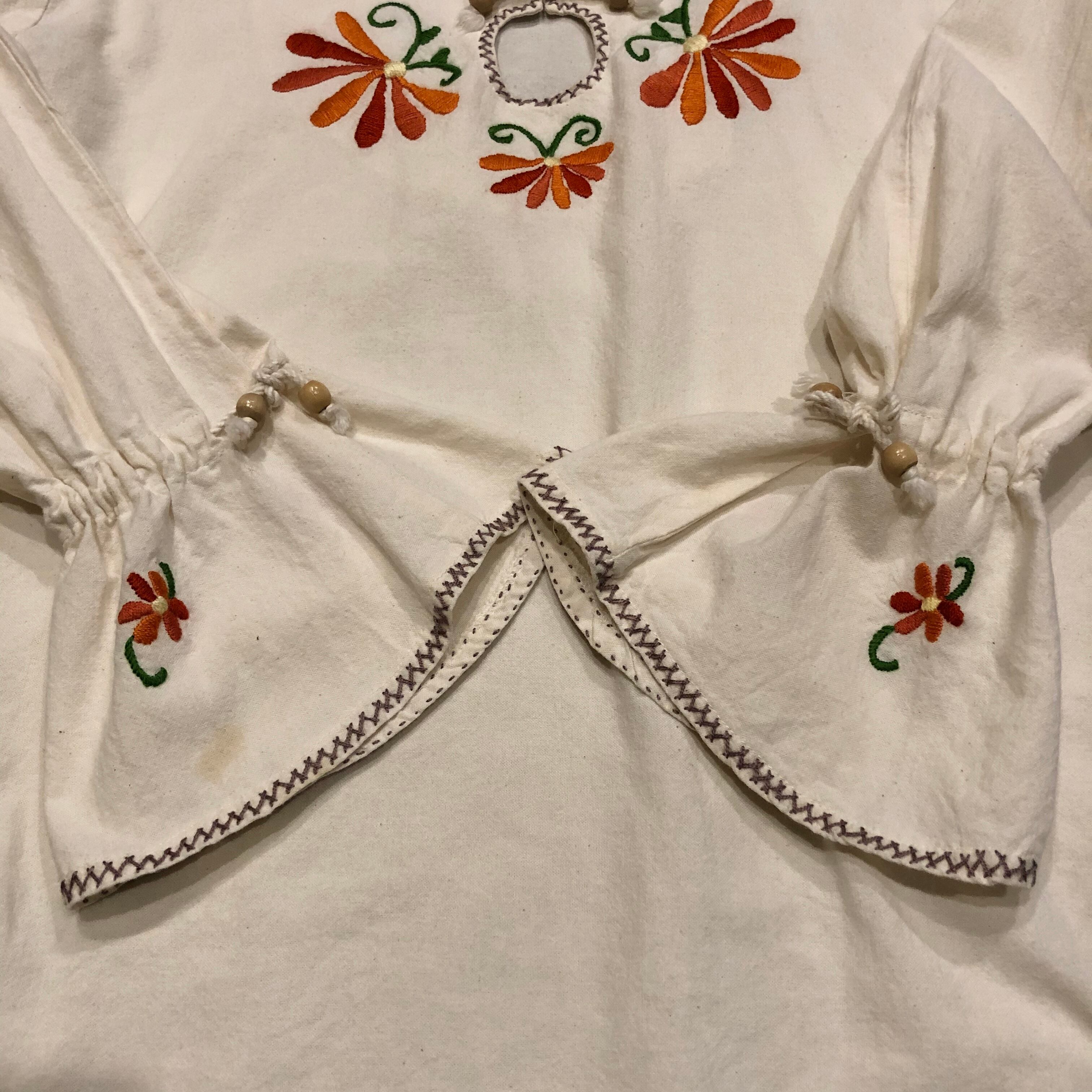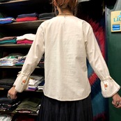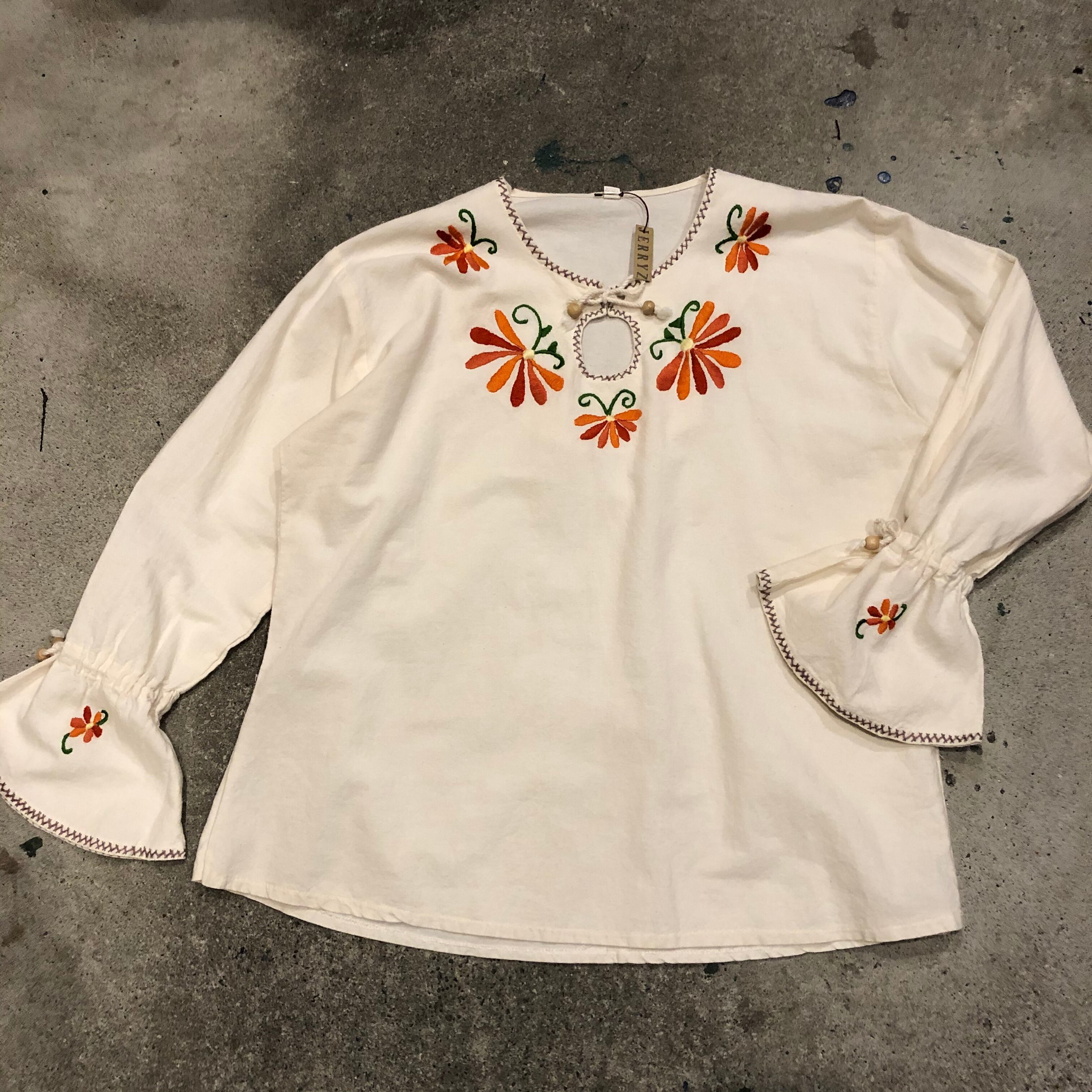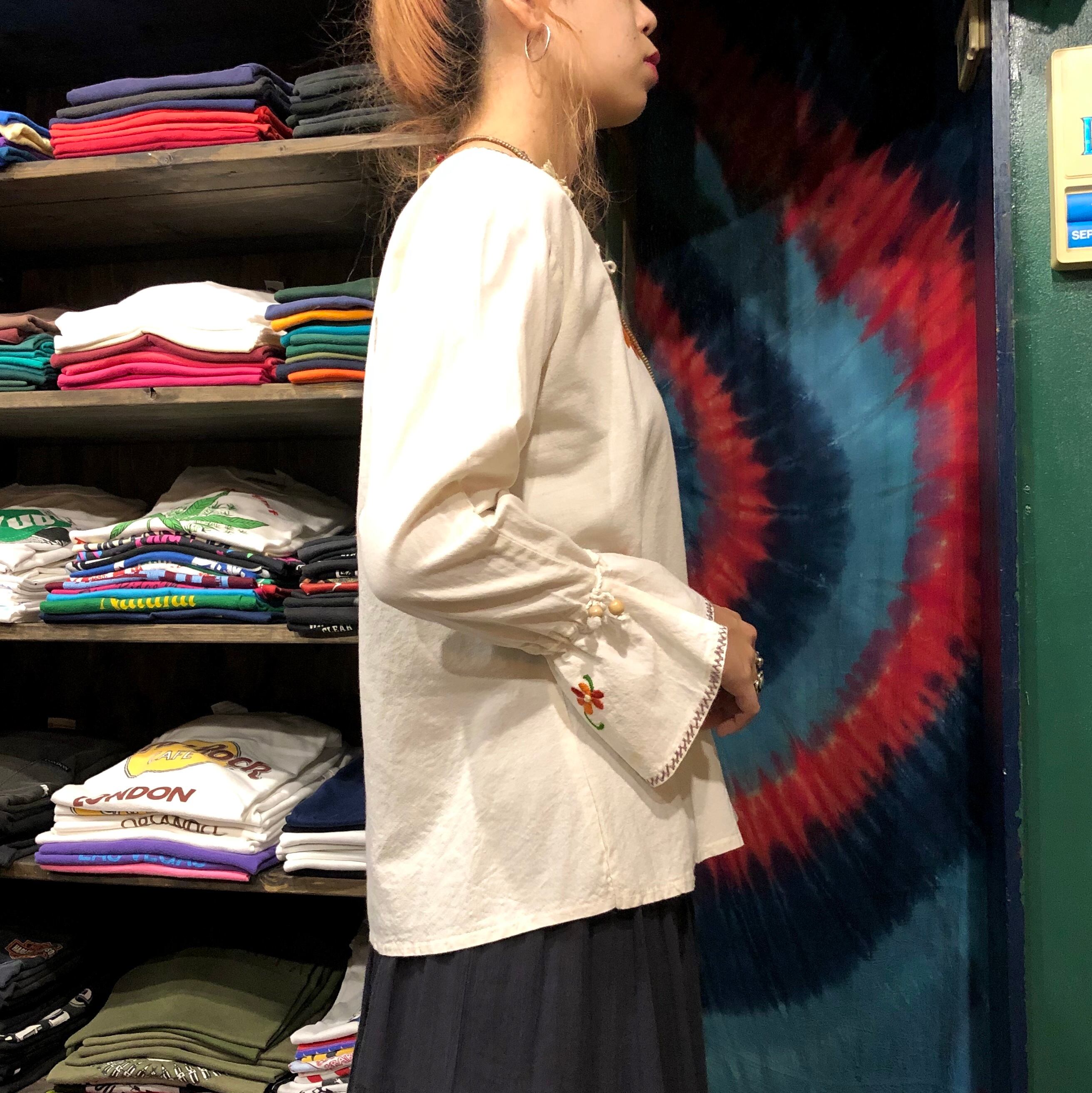 ボヘミアンな雰囲気がとてもかわいいトップスです。立体感のある手刺繍に温かみを感じます。襟ぐりと手首が紐で結べる仕様になっていてウッドビーズが良いアジ出しています。アクセサリーじゃらじゃら付けてベルボトムを合わせたりしてもかわいいですね!