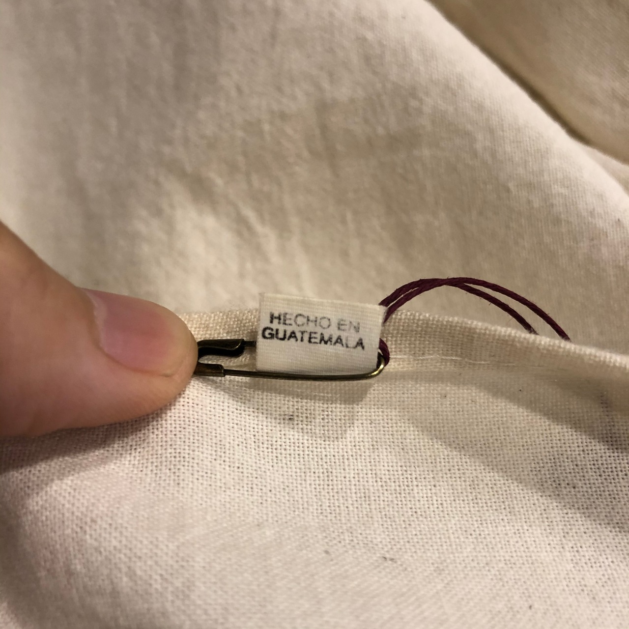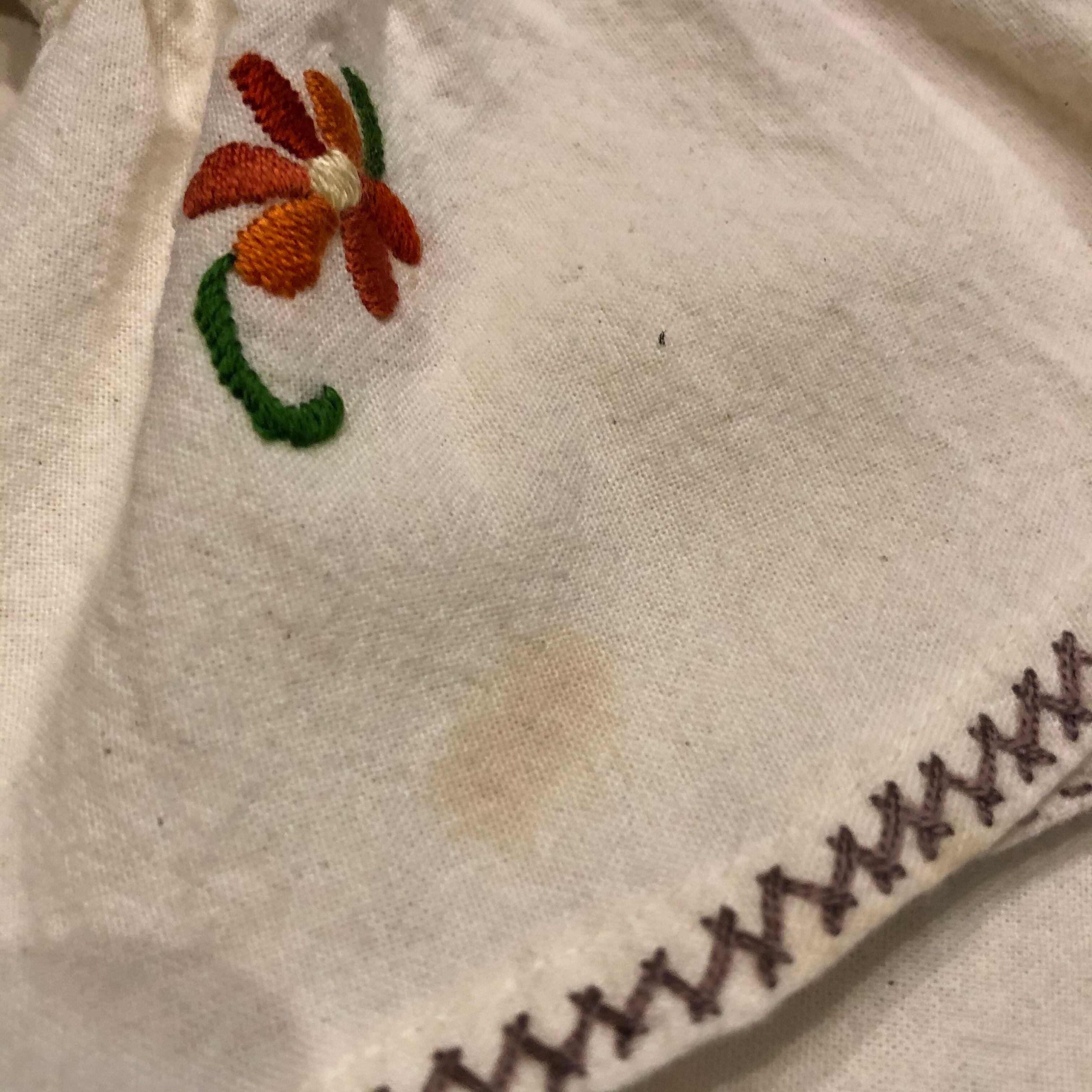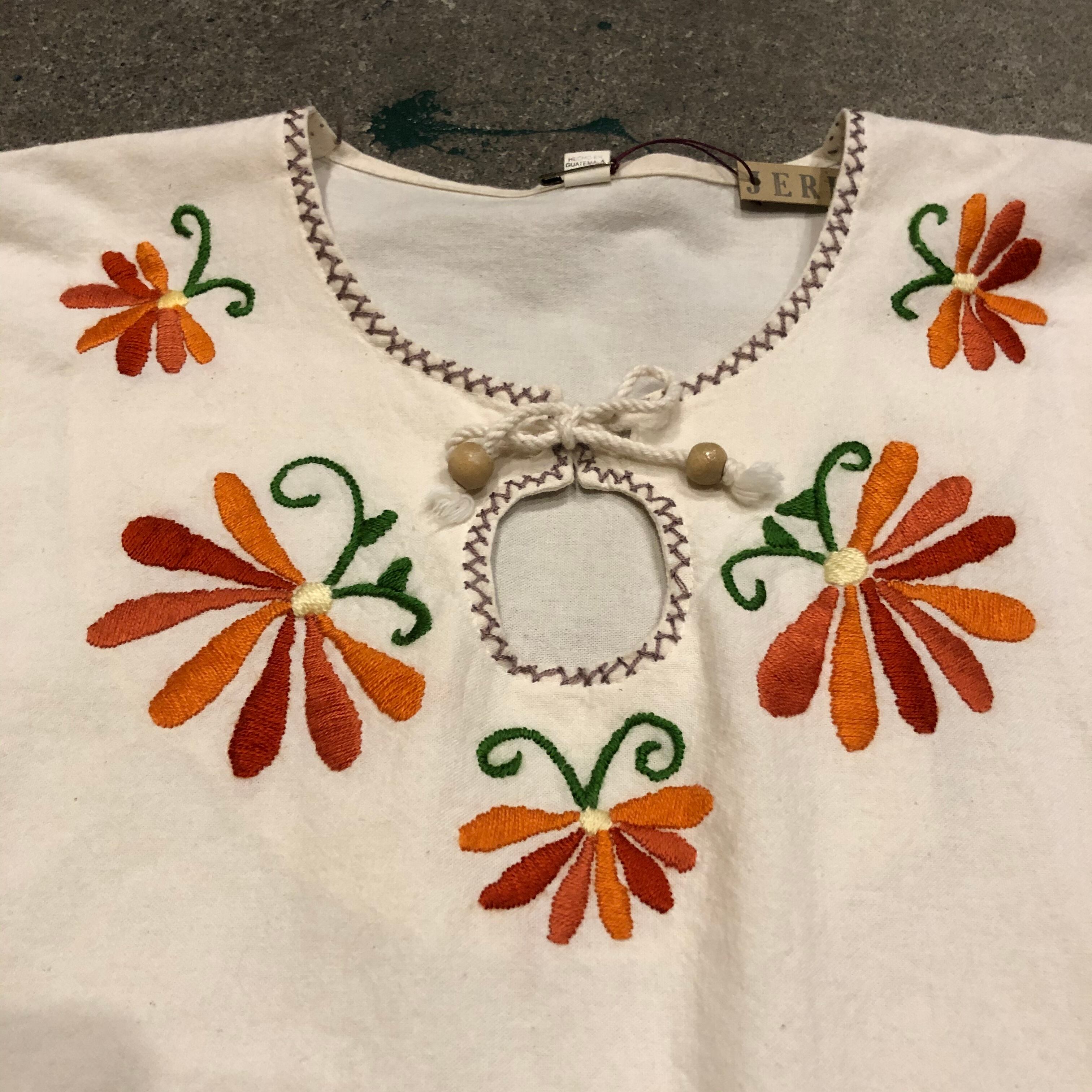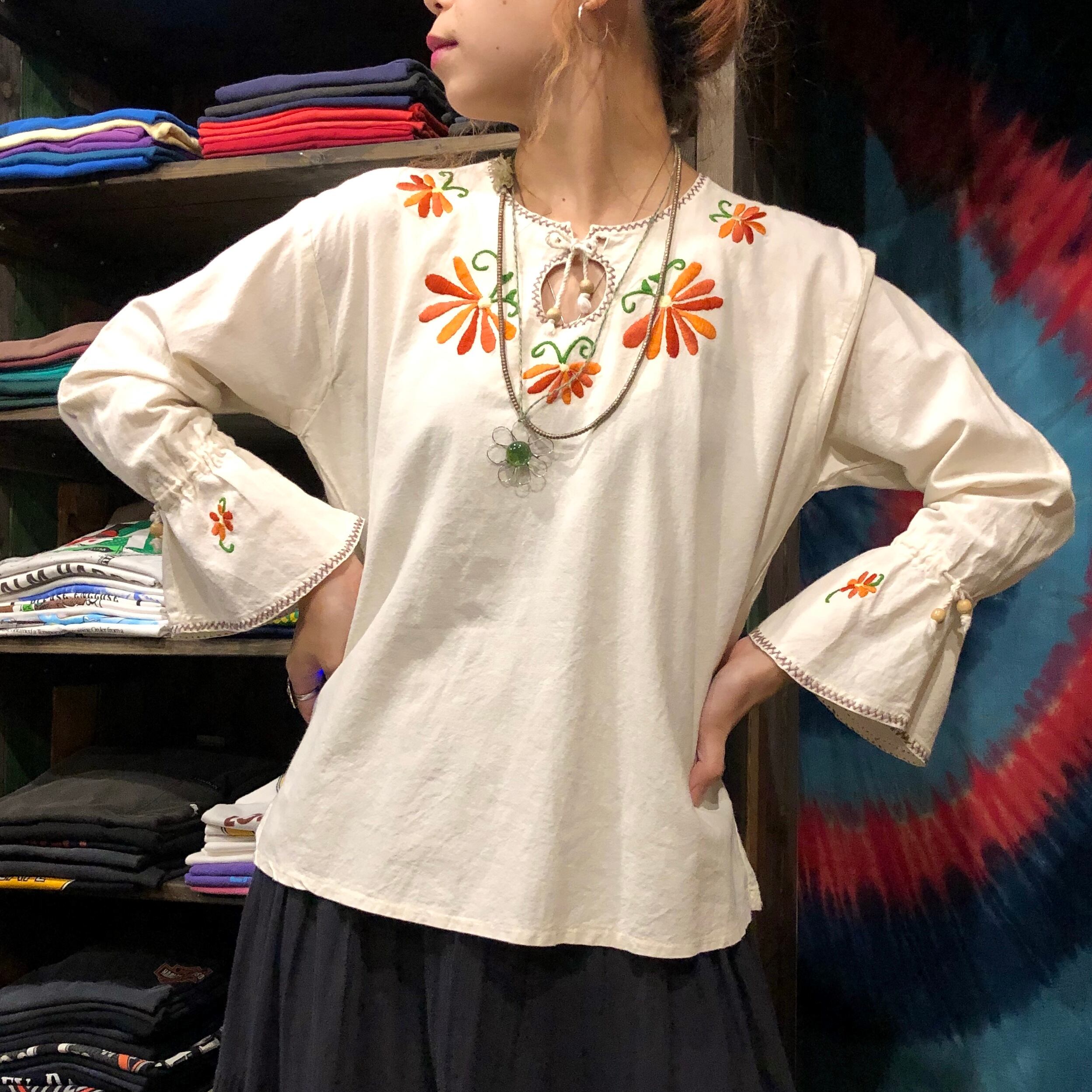 ボヘミアンな雰囲気がとてもかわいいトップスです。立体感のある手刺繍に温かみを感じます。襟ぐりと手首が紐で結べる仕様になっていてウッドビーズが良いアジ出しています。アクセサリーじゃらじゃら付けてベルボトムを合わせたりしてもかわいいですね!