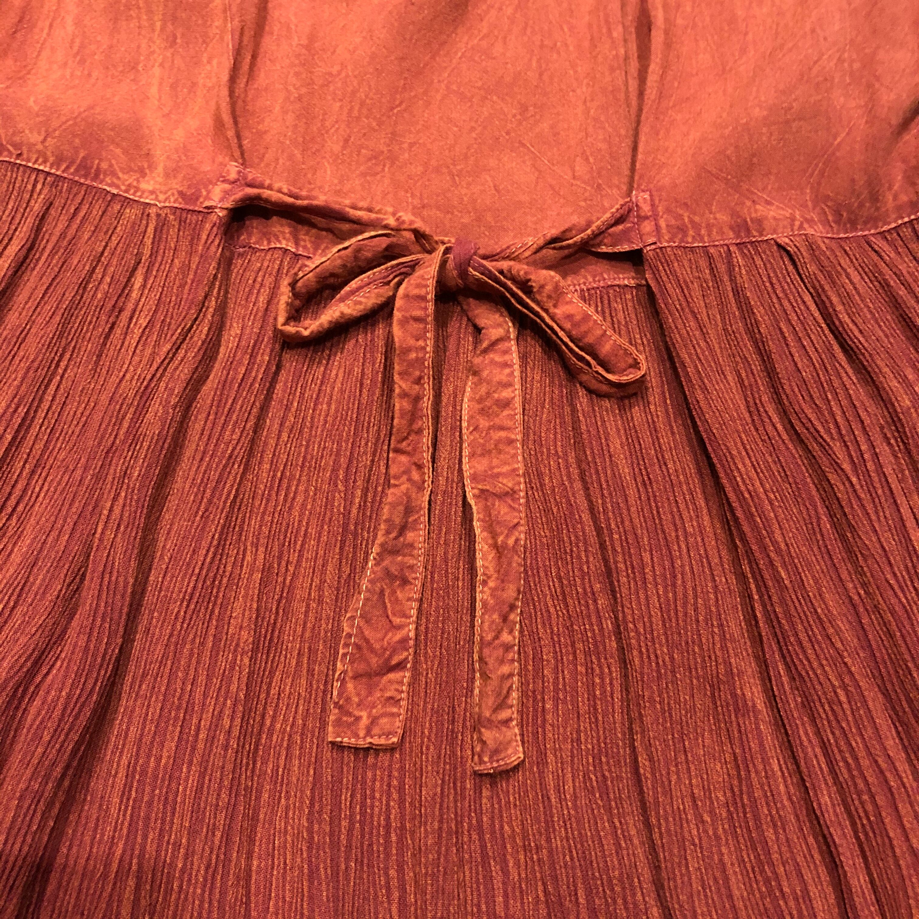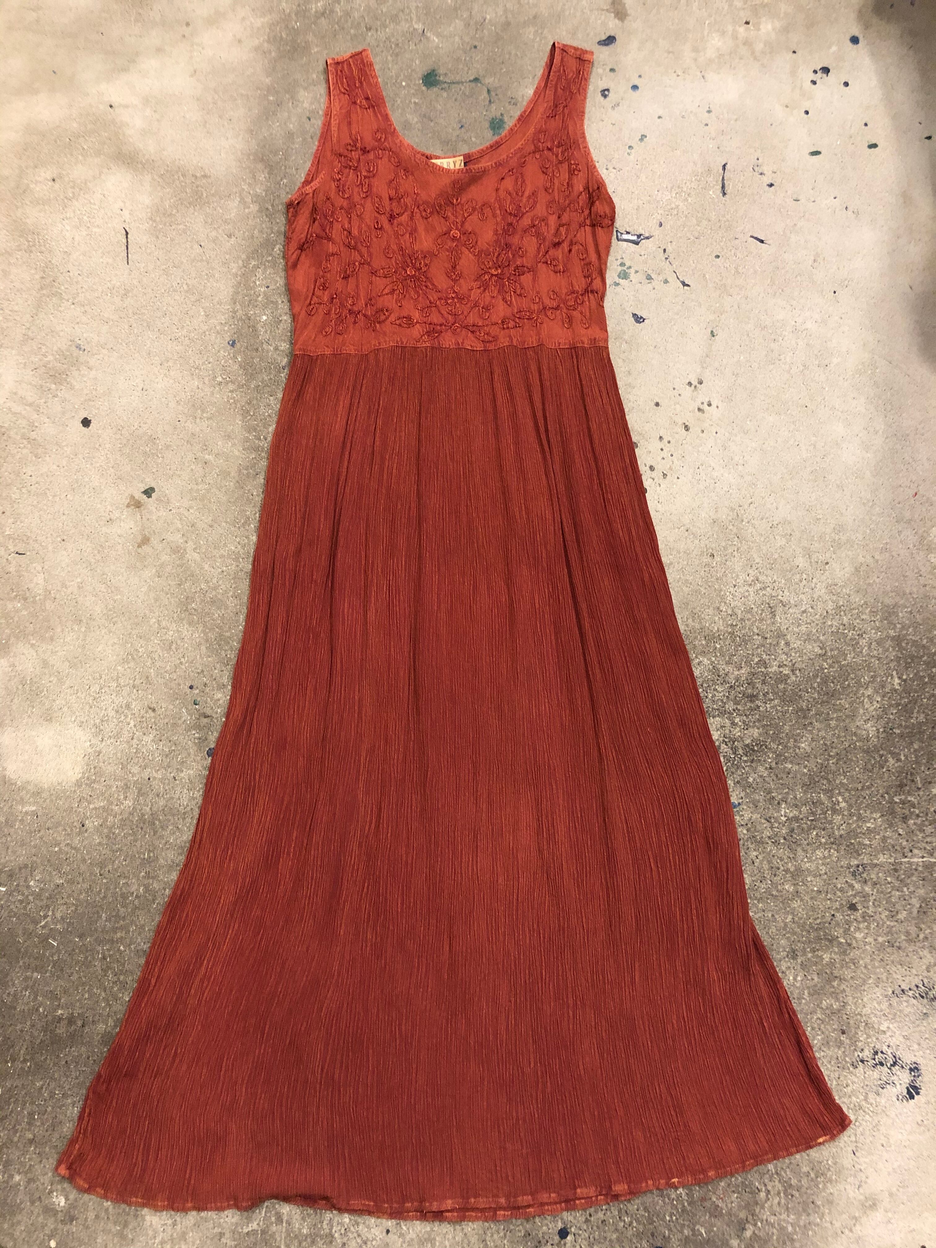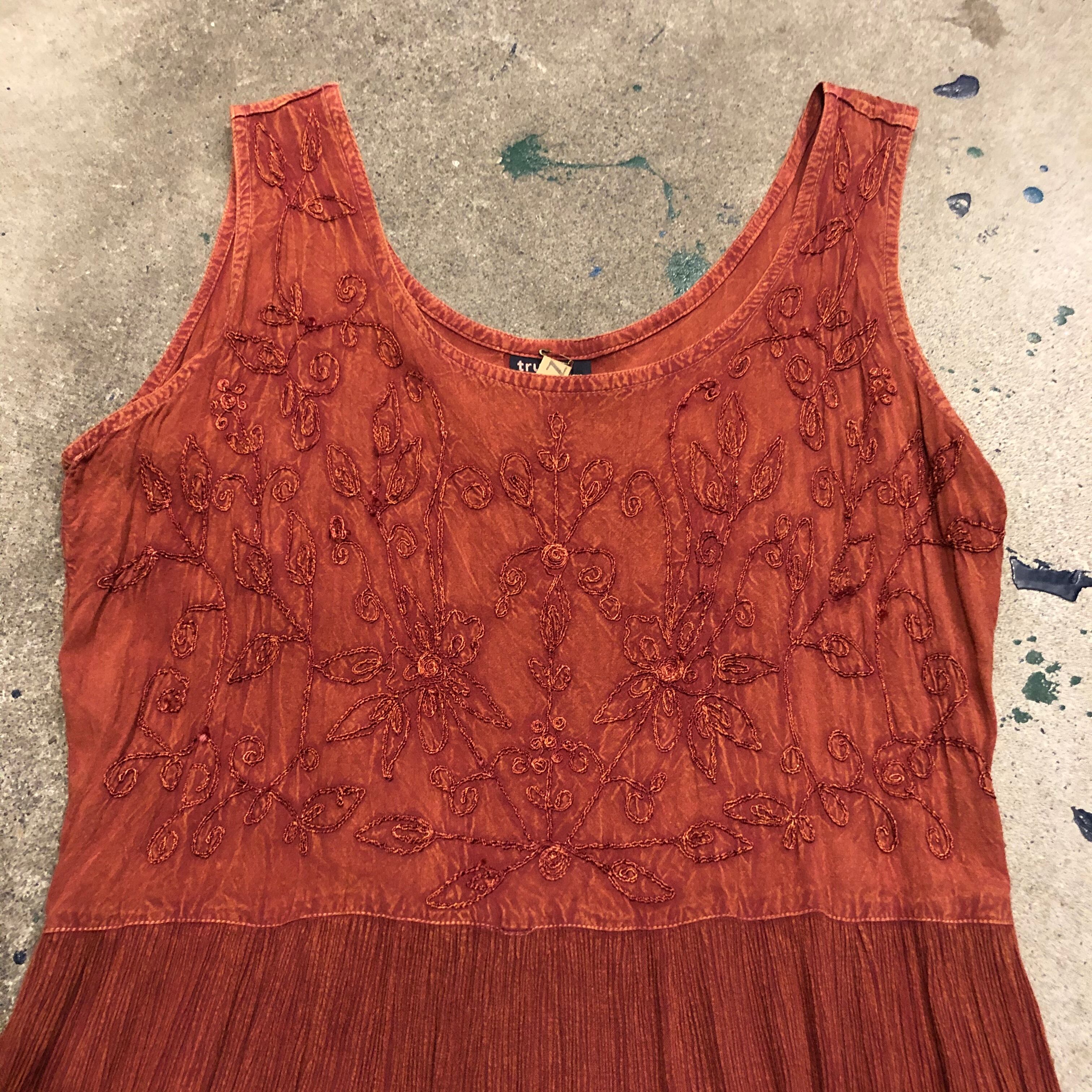 赤茶色の落ち着いたカラーが素敵なレーヨン素材のワンピースです。前身頃に刺繍が入っており大人な雰囲気のある一着です。