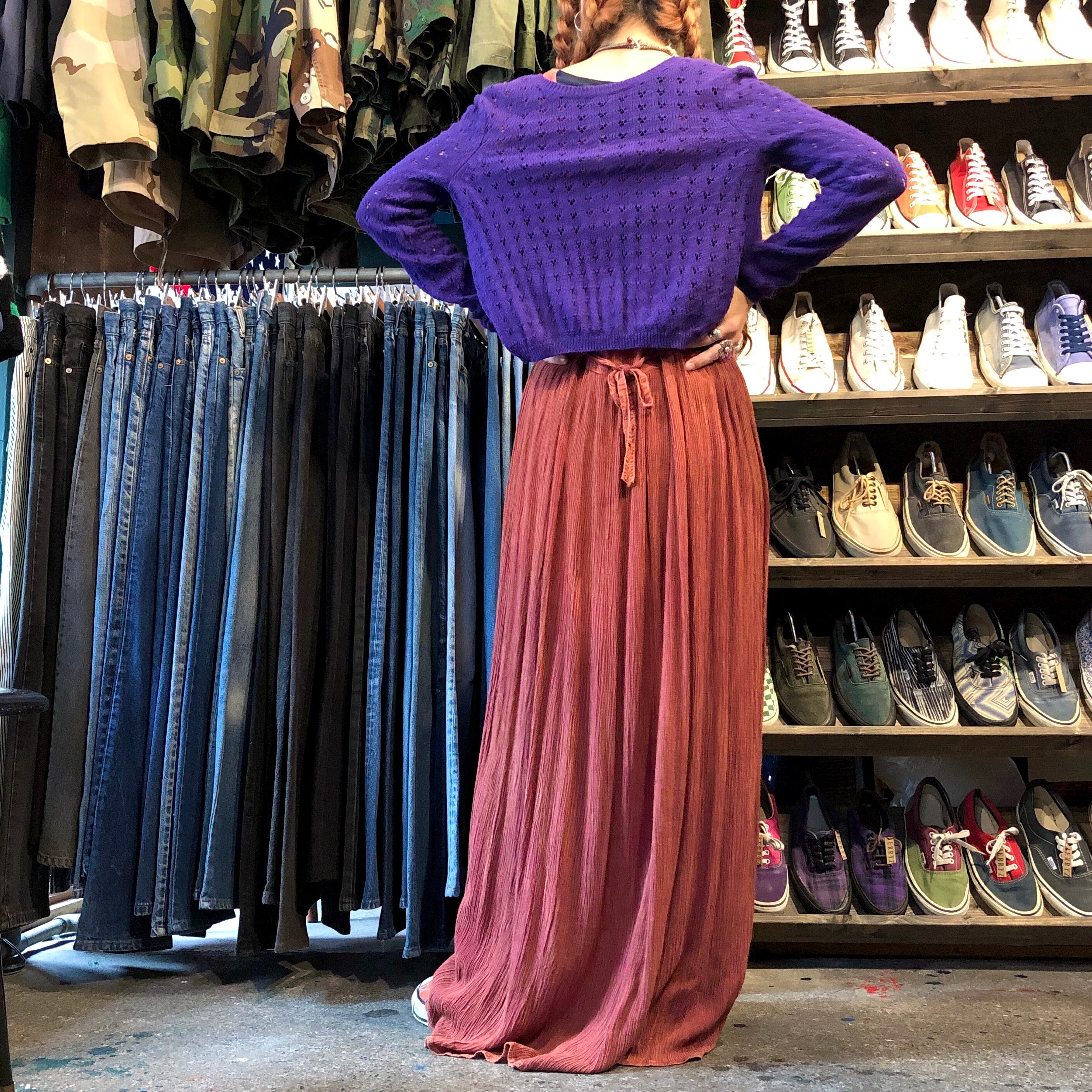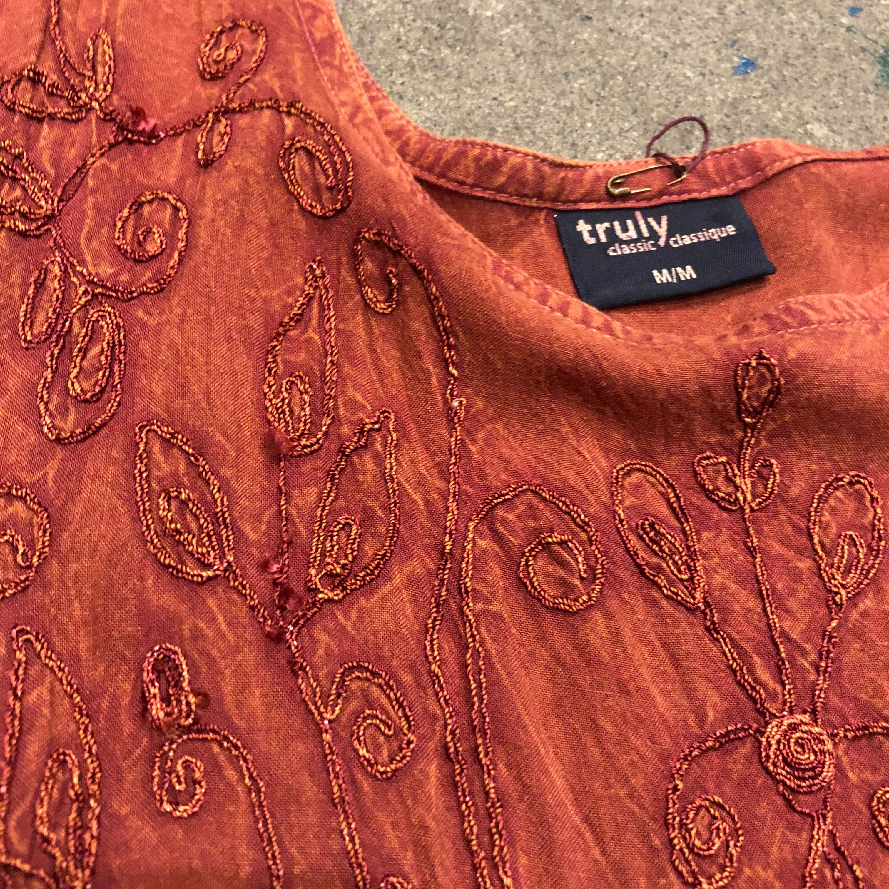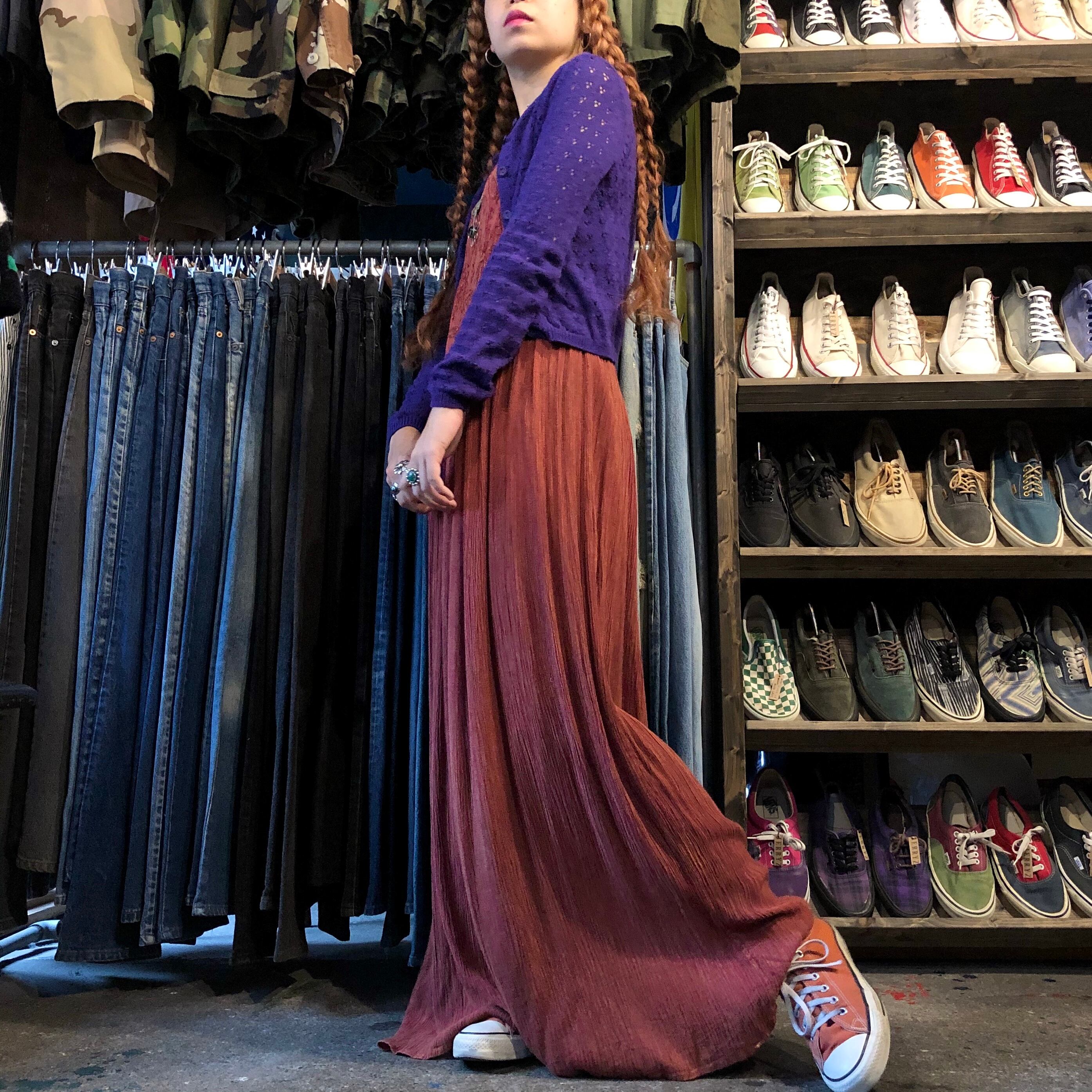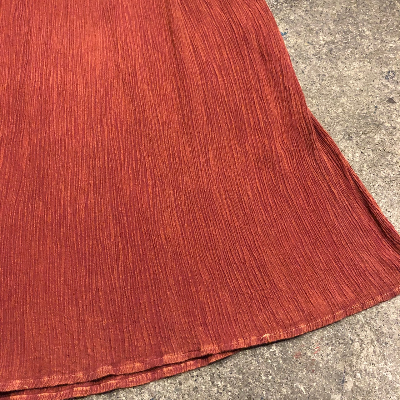 赤茶色の落ち着いたカラーが素敵なレーヨン素材のワンピースです。前身頃に刺繍が入っており大人な雰囲気のある一着です。