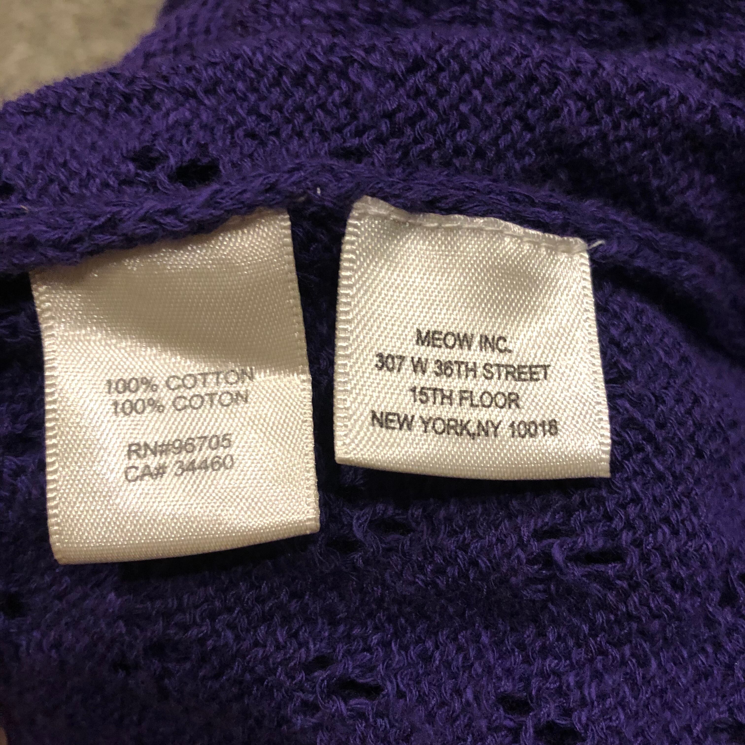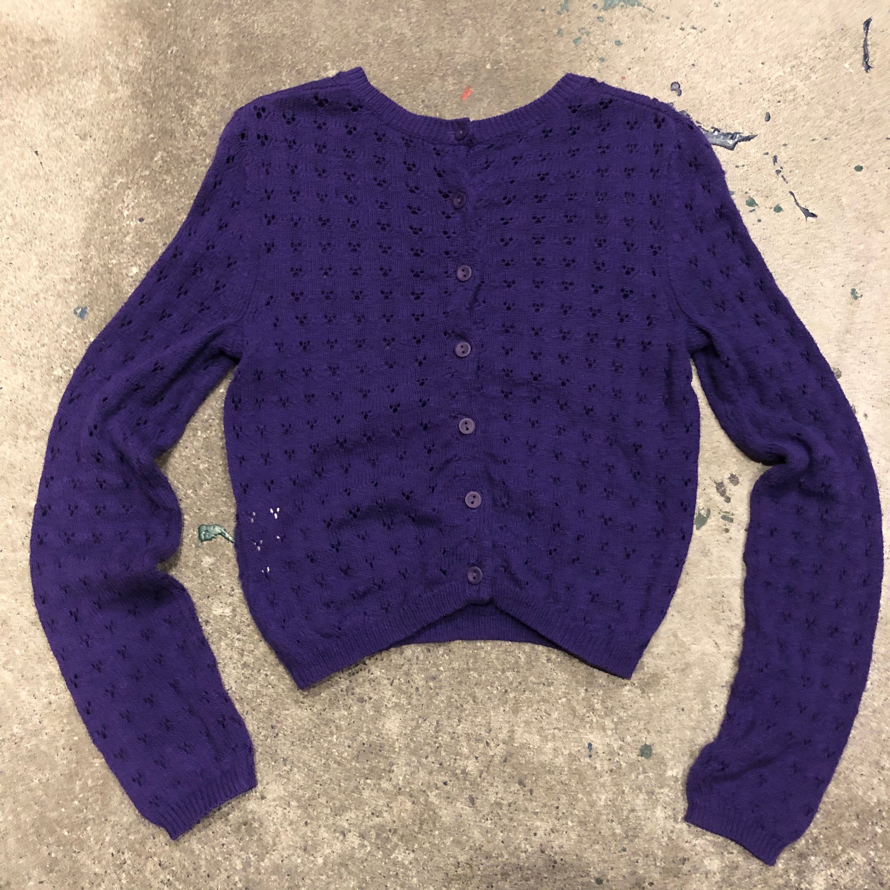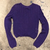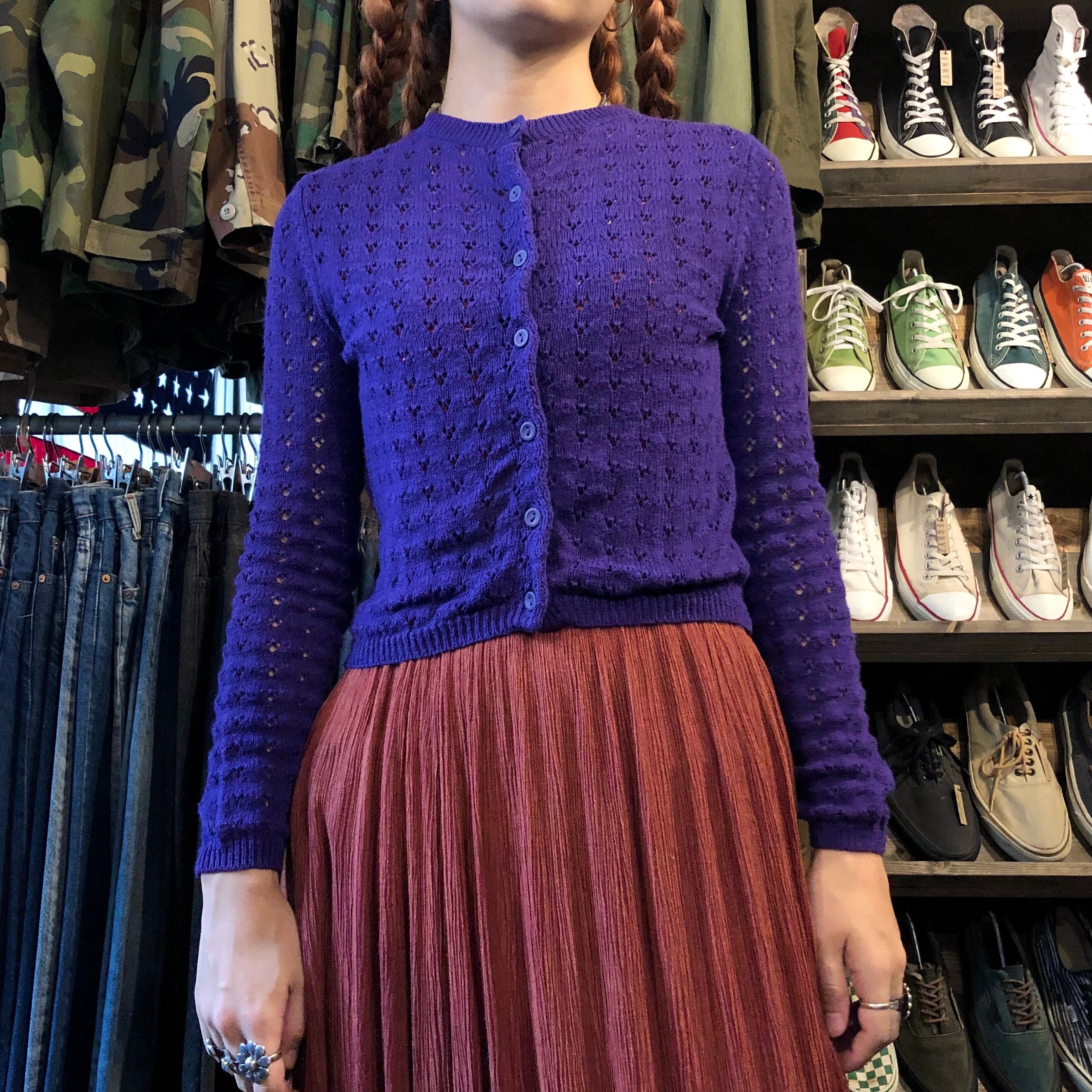 かなりコンパクトなコットンニットのカーディガンです。深い紫色が季節や合わせるアイテムを選ばず、とても使い勝手の良い一着です。