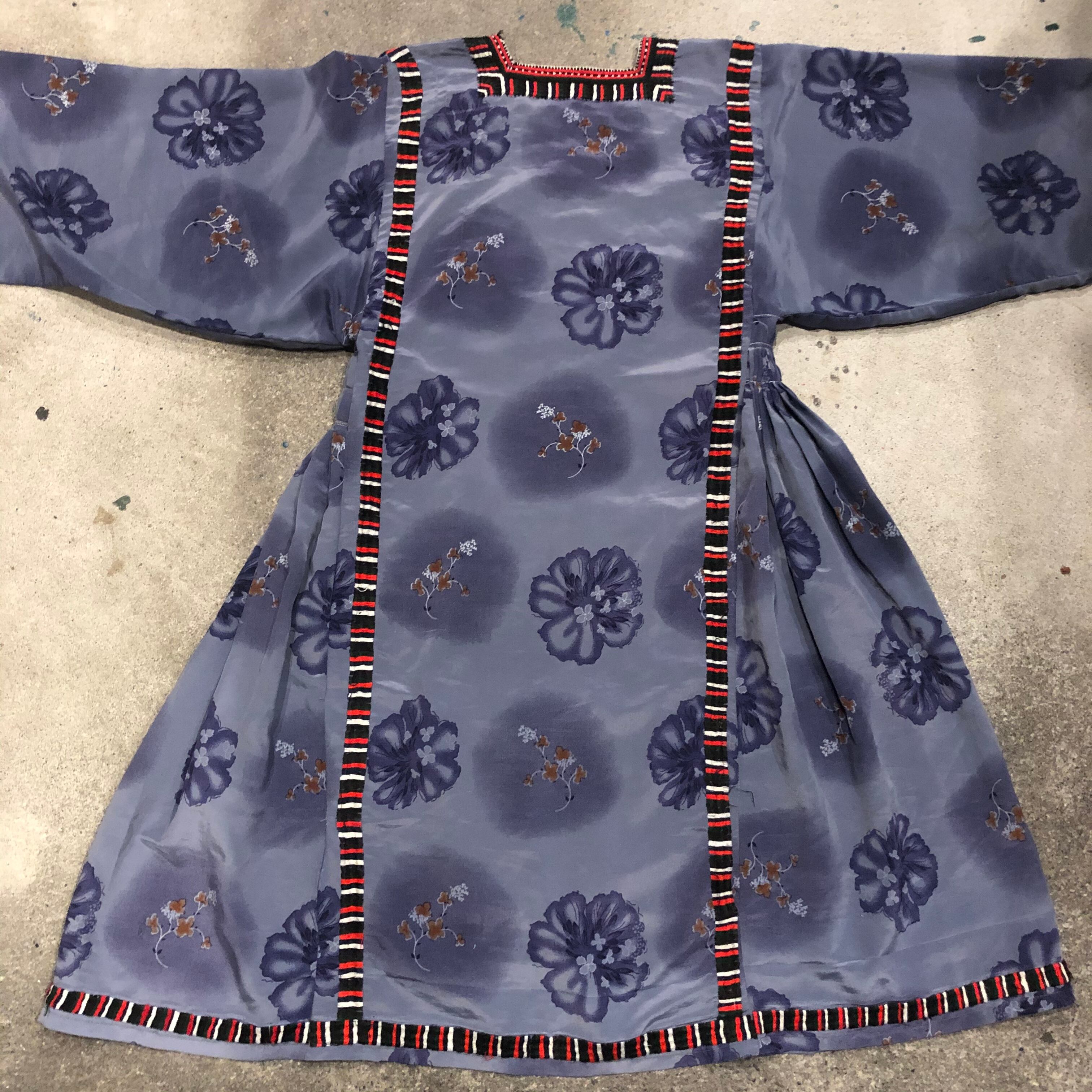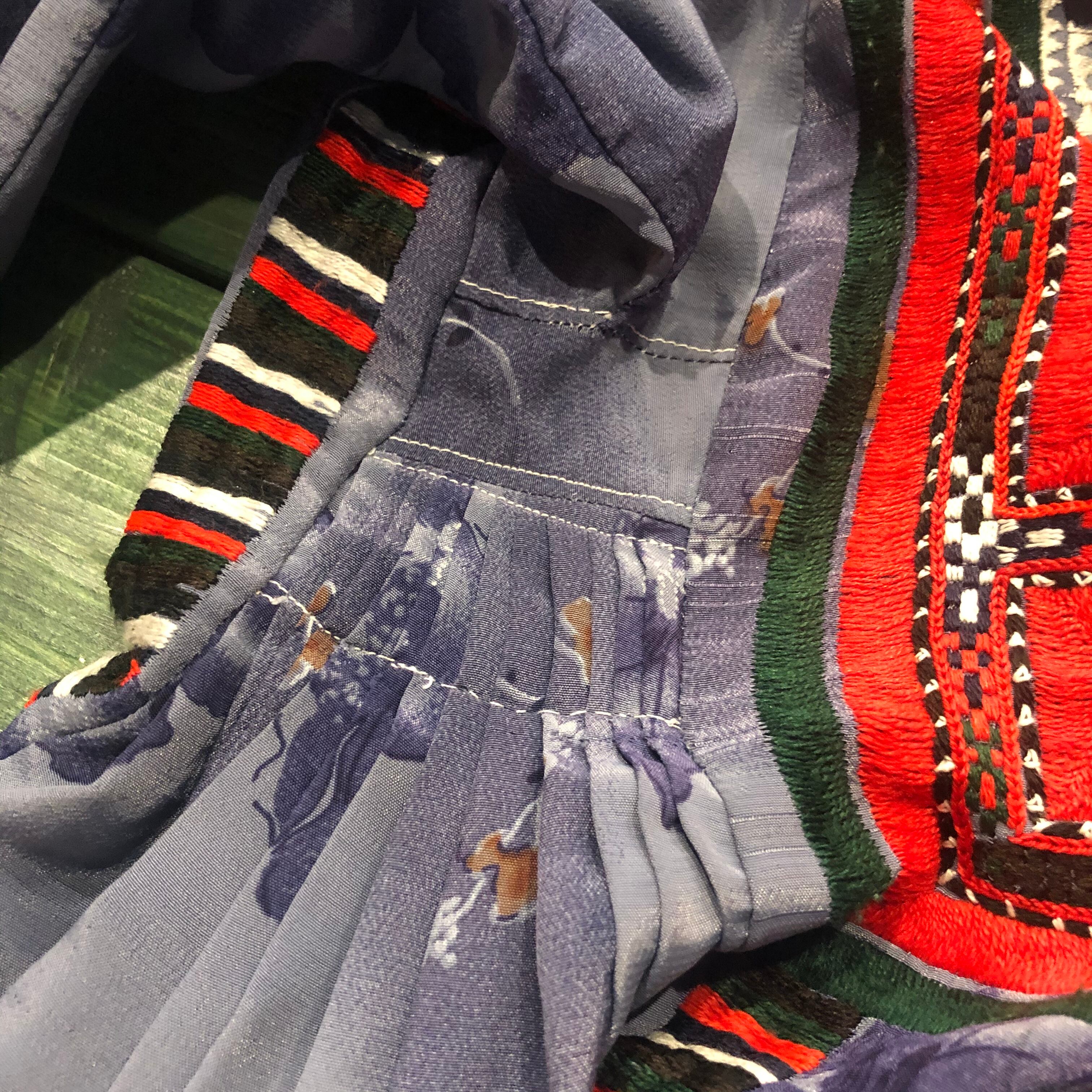 両脇のプリーツ部分がやや雑な感じです。裾上げされていたのをほどいたミシンの針の後があります。その他、刺繍が途中で終わっていたり、ほつれが数箇所ございます。
