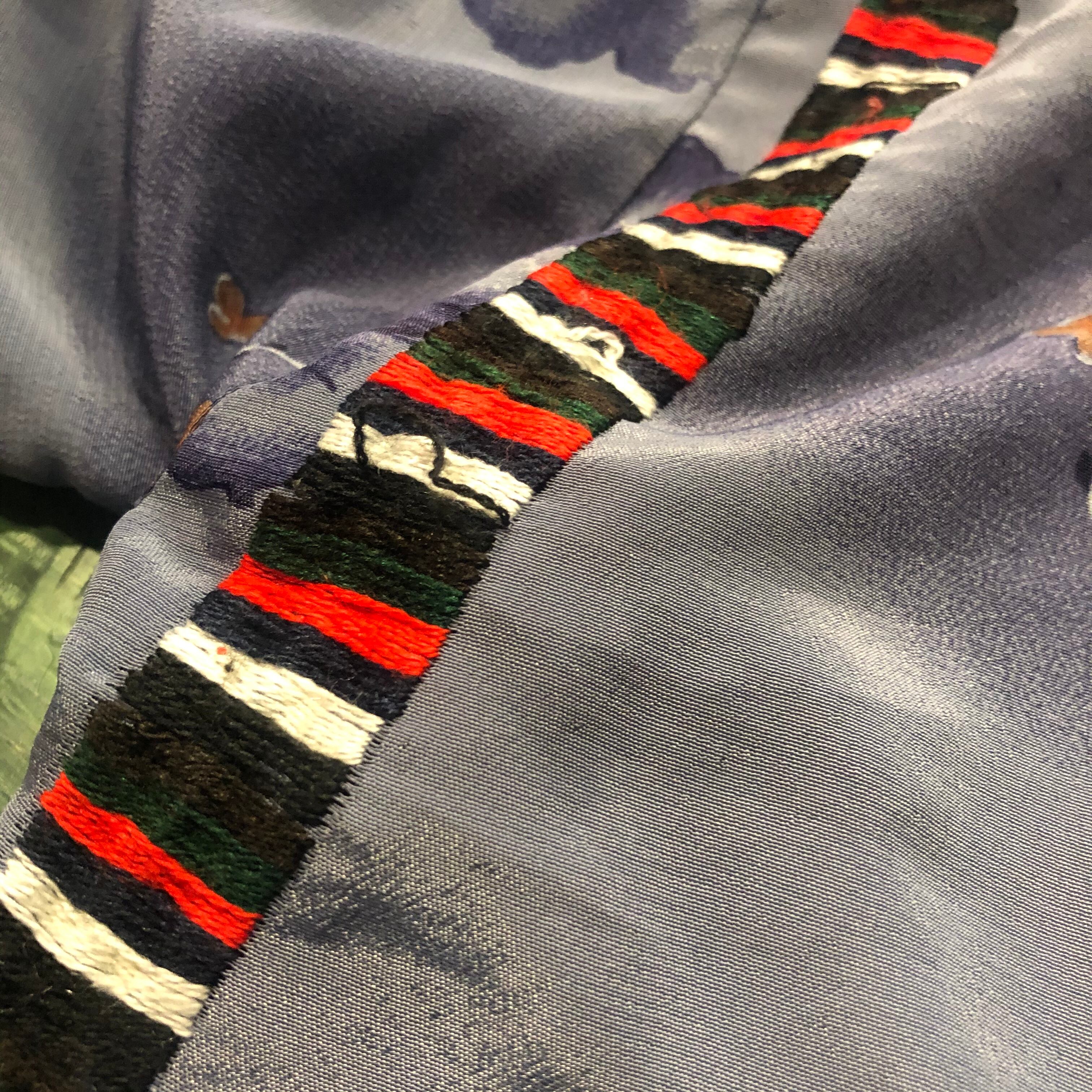 ブルーグレーに花柄の渋い生地が良い雰囲気でかっこいいです。近くで見ると本当に気の遠くなる作業だとわかる刺繍はとても美しくて存在感のあるものです。