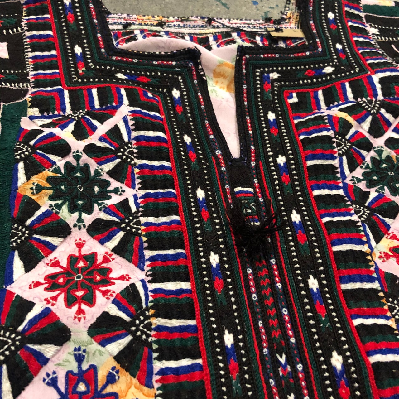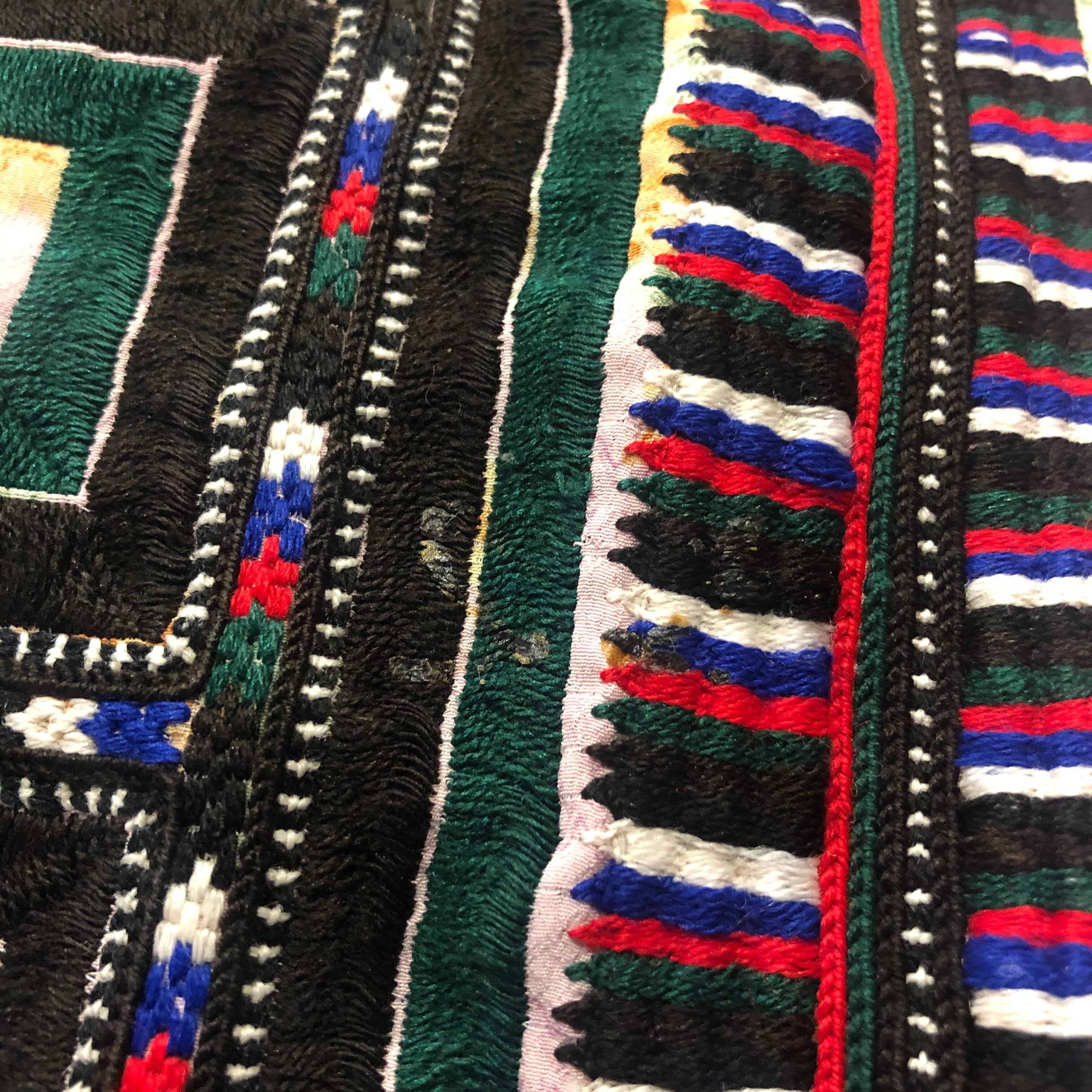 前刺繍部分にパリッとした塗料のような汚れ、前裾に刺繍が取れている部分があります。その他目立った傷や汚れはありません。