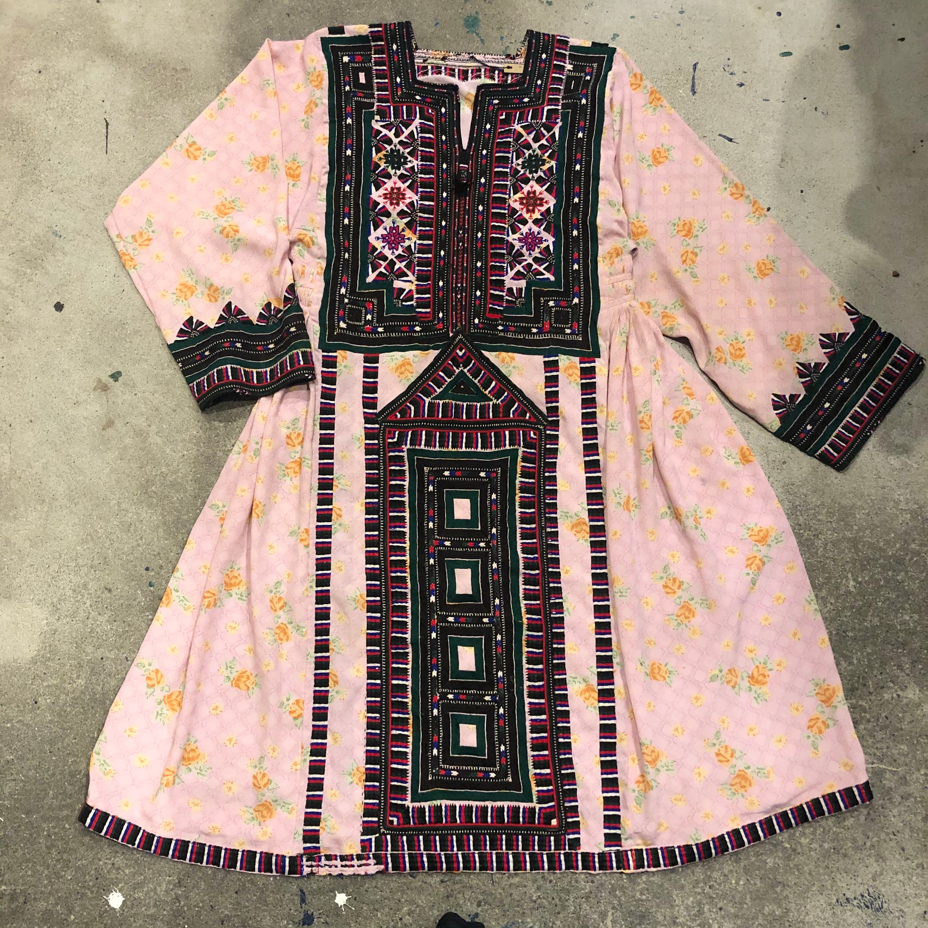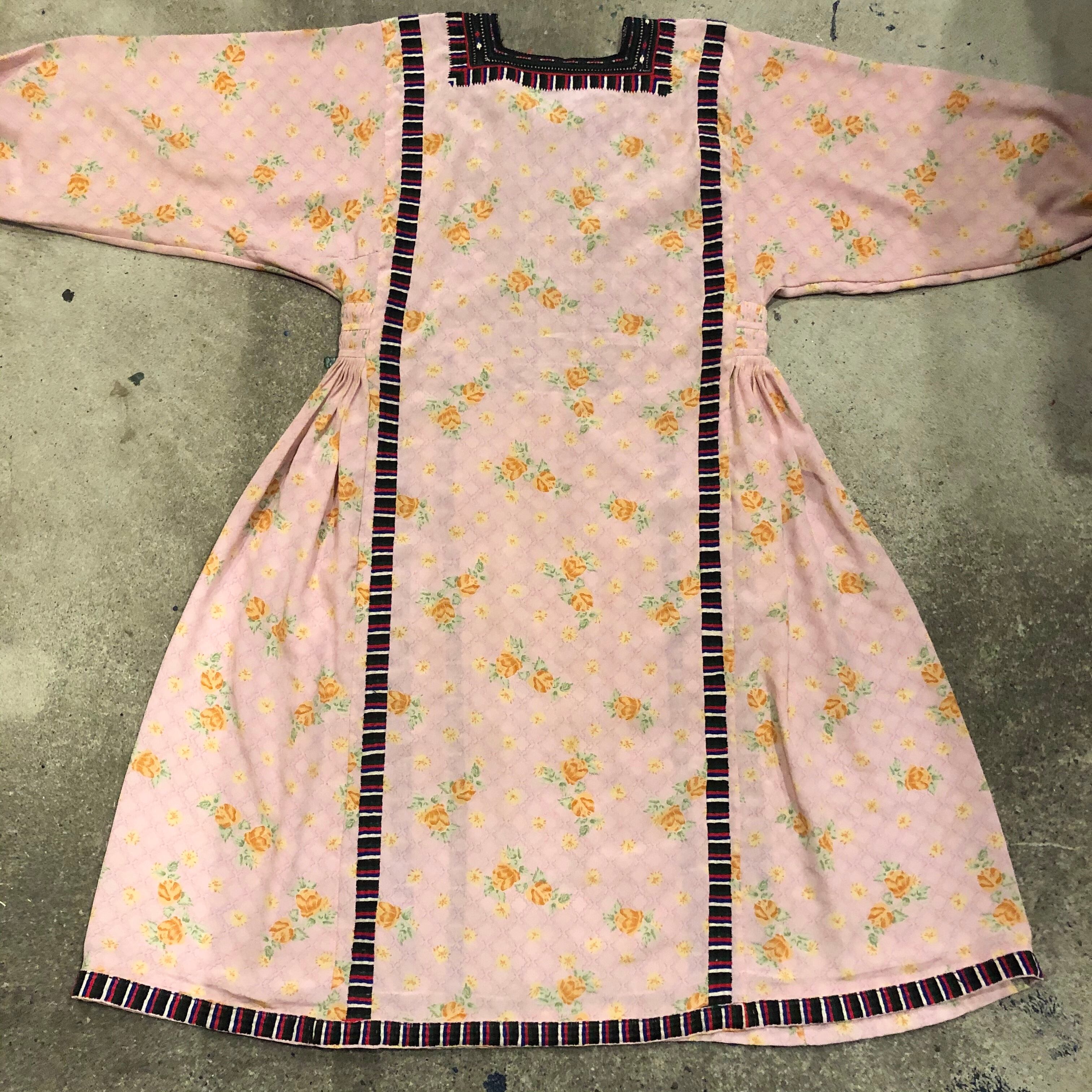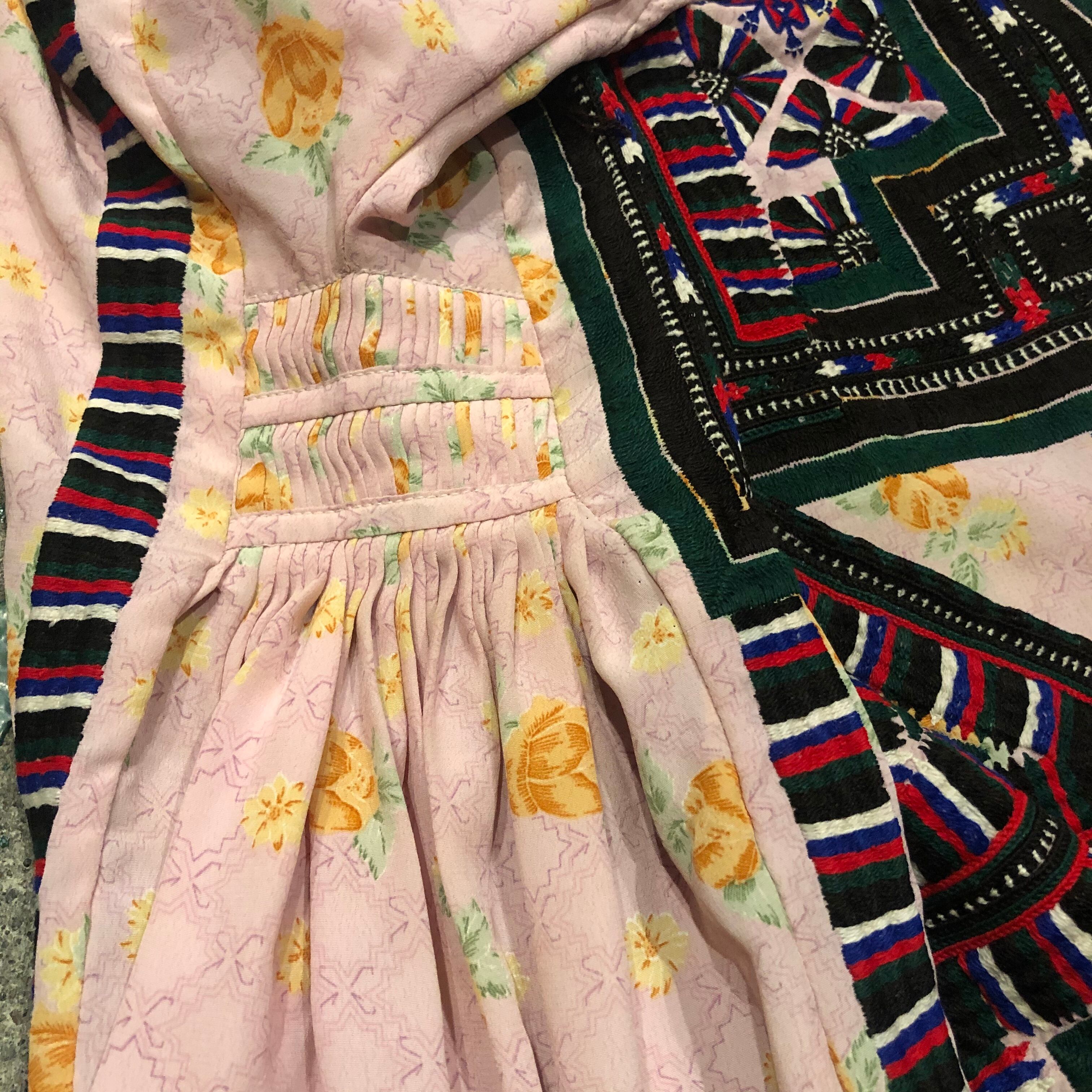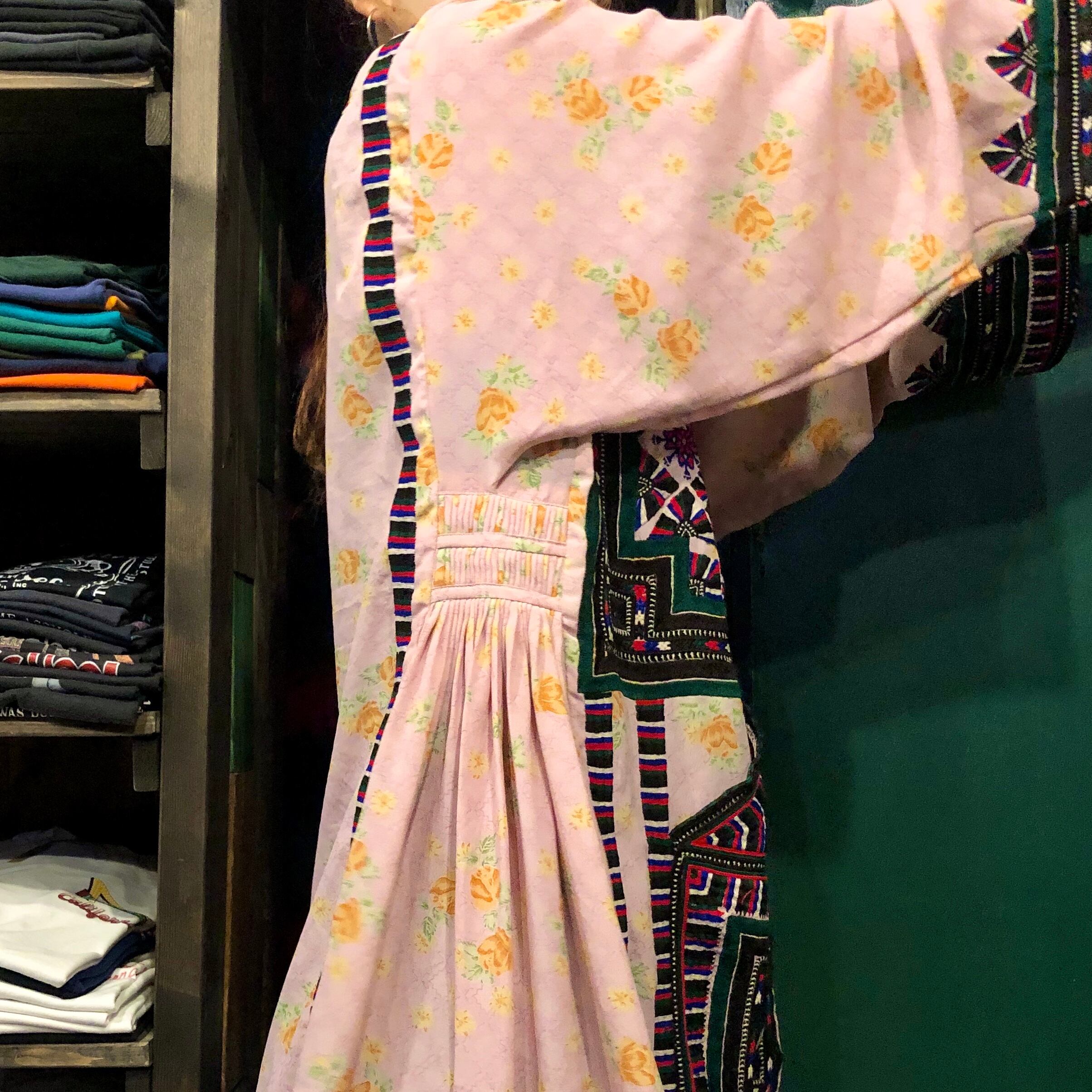 淡いピンクにオレンジの花柄がかわいい生地に細かくびっしり手刺繍が施されており、とても素敵な一着です。