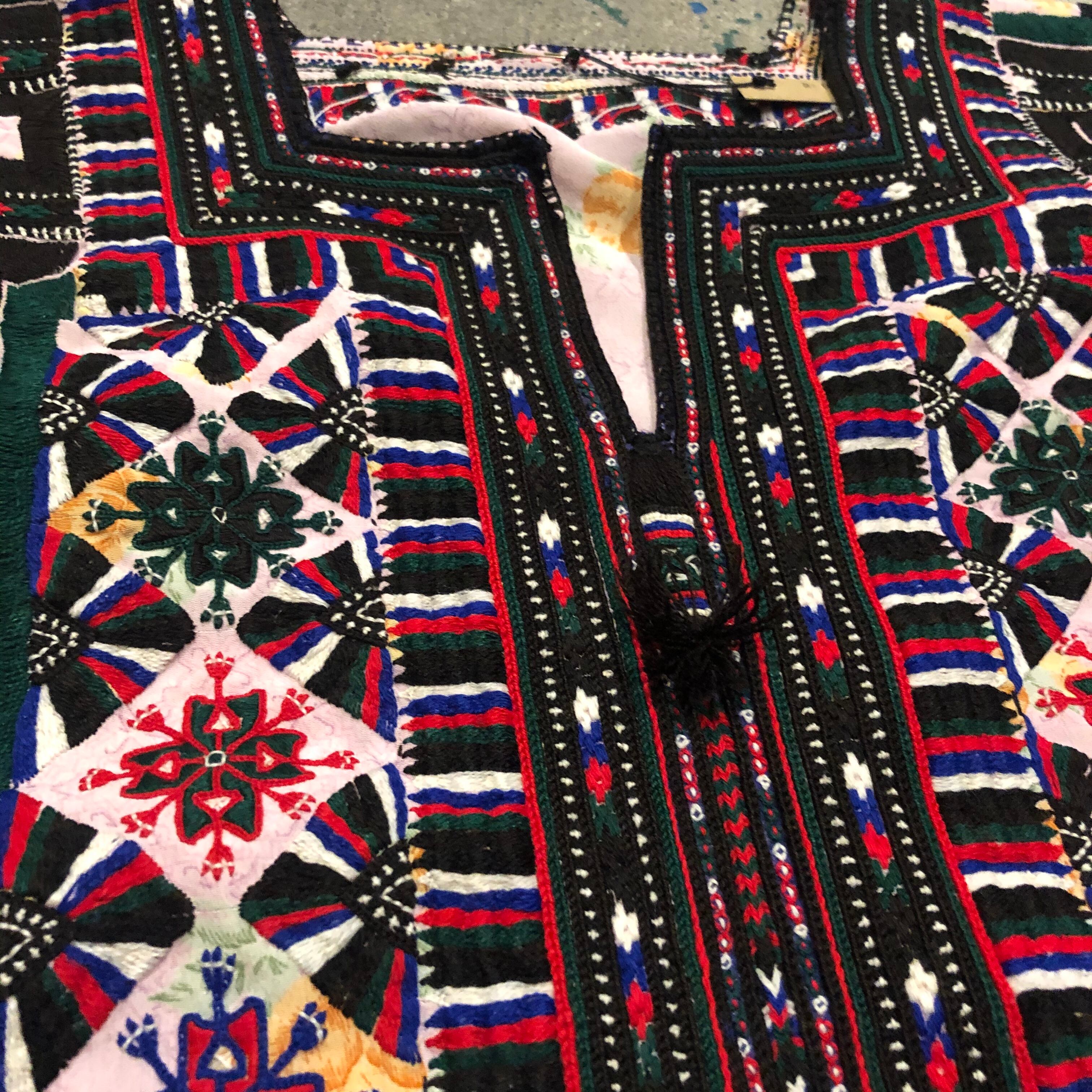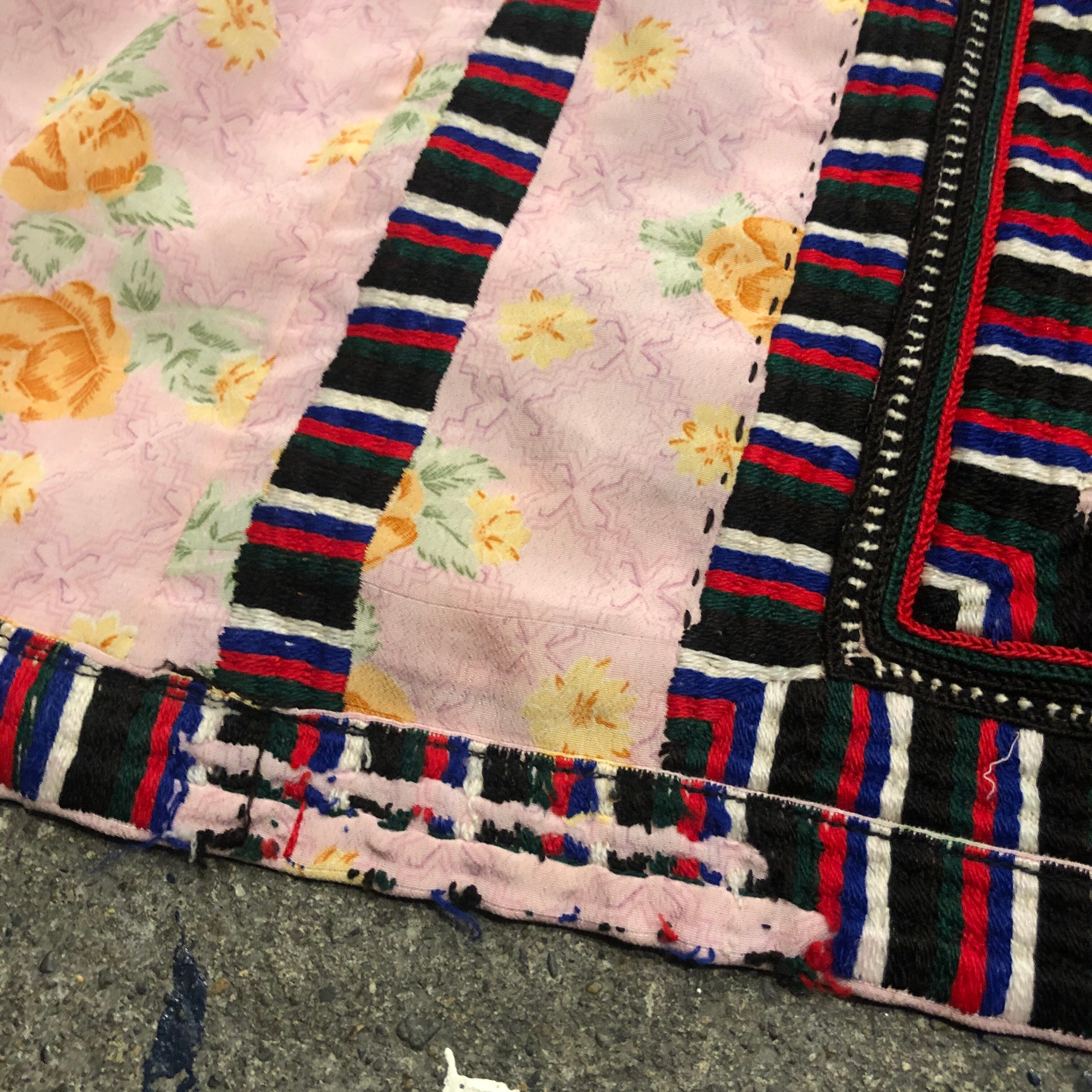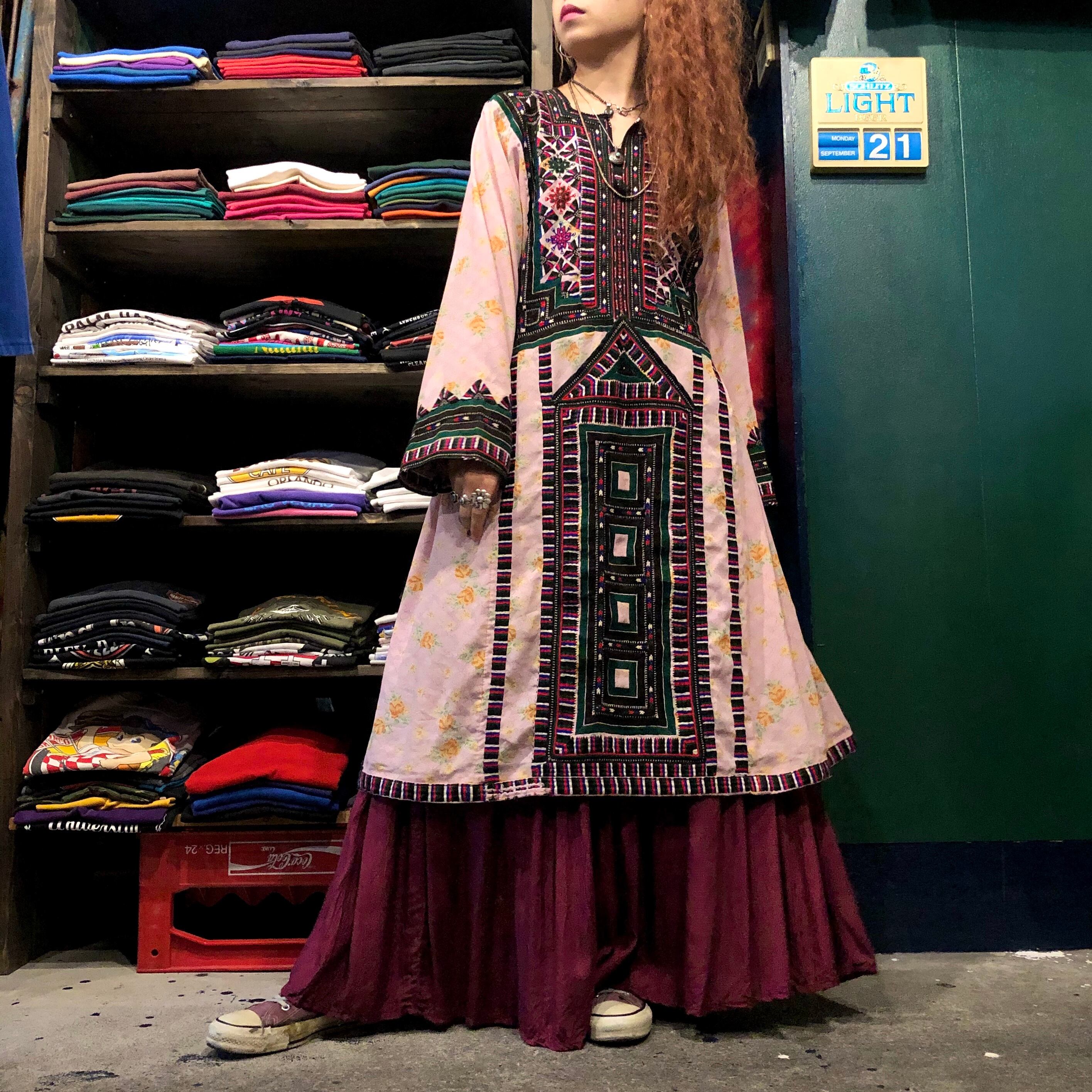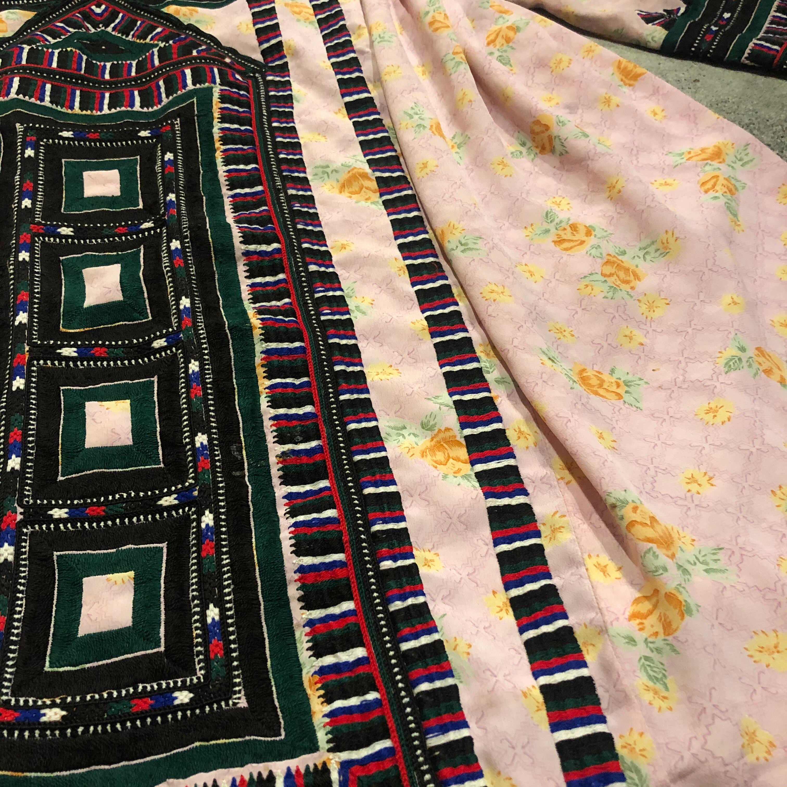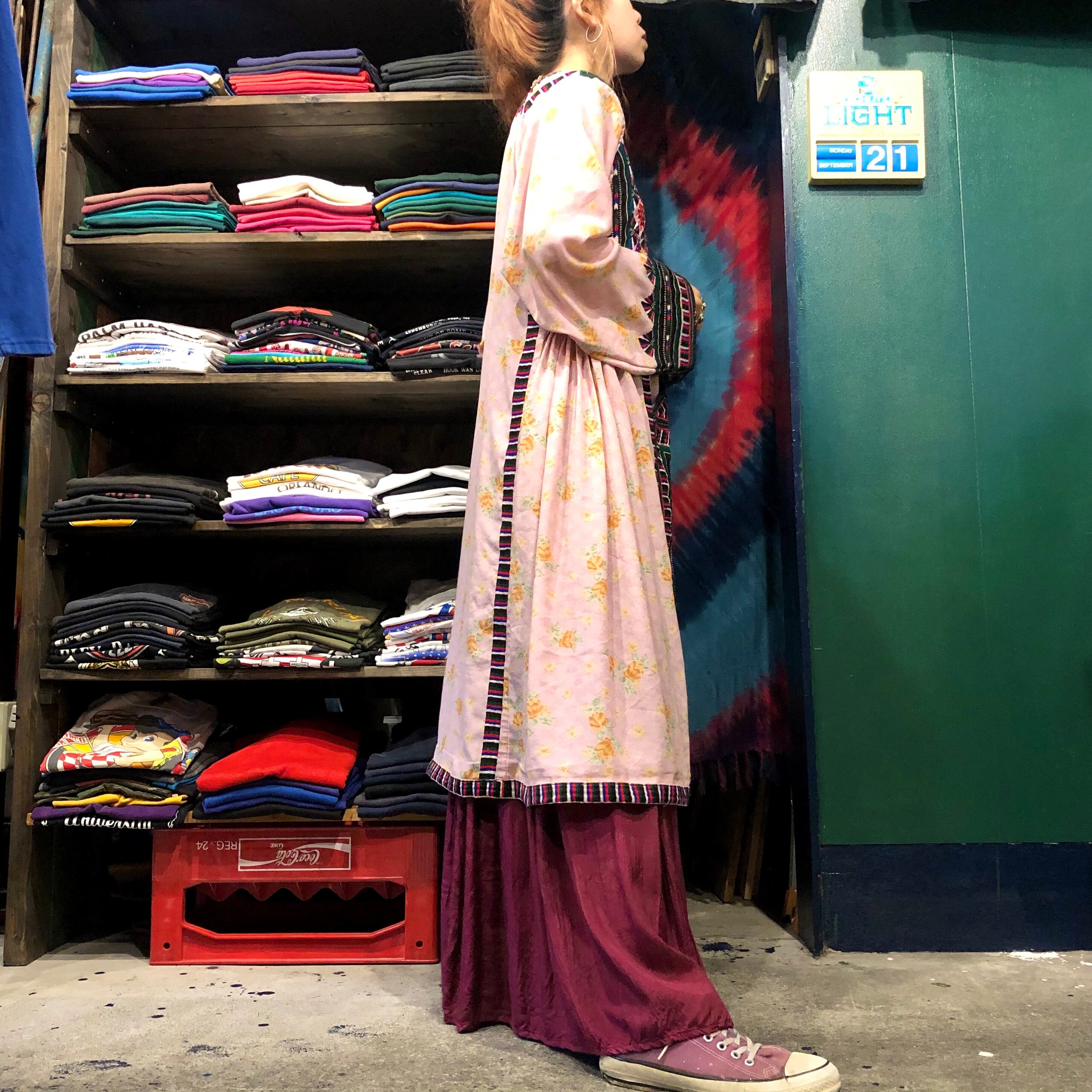 淡いピンクにオレンジの花柄がかわいい生地に細かくびっしり手刺繍が施されており、とても素敵な一着です。