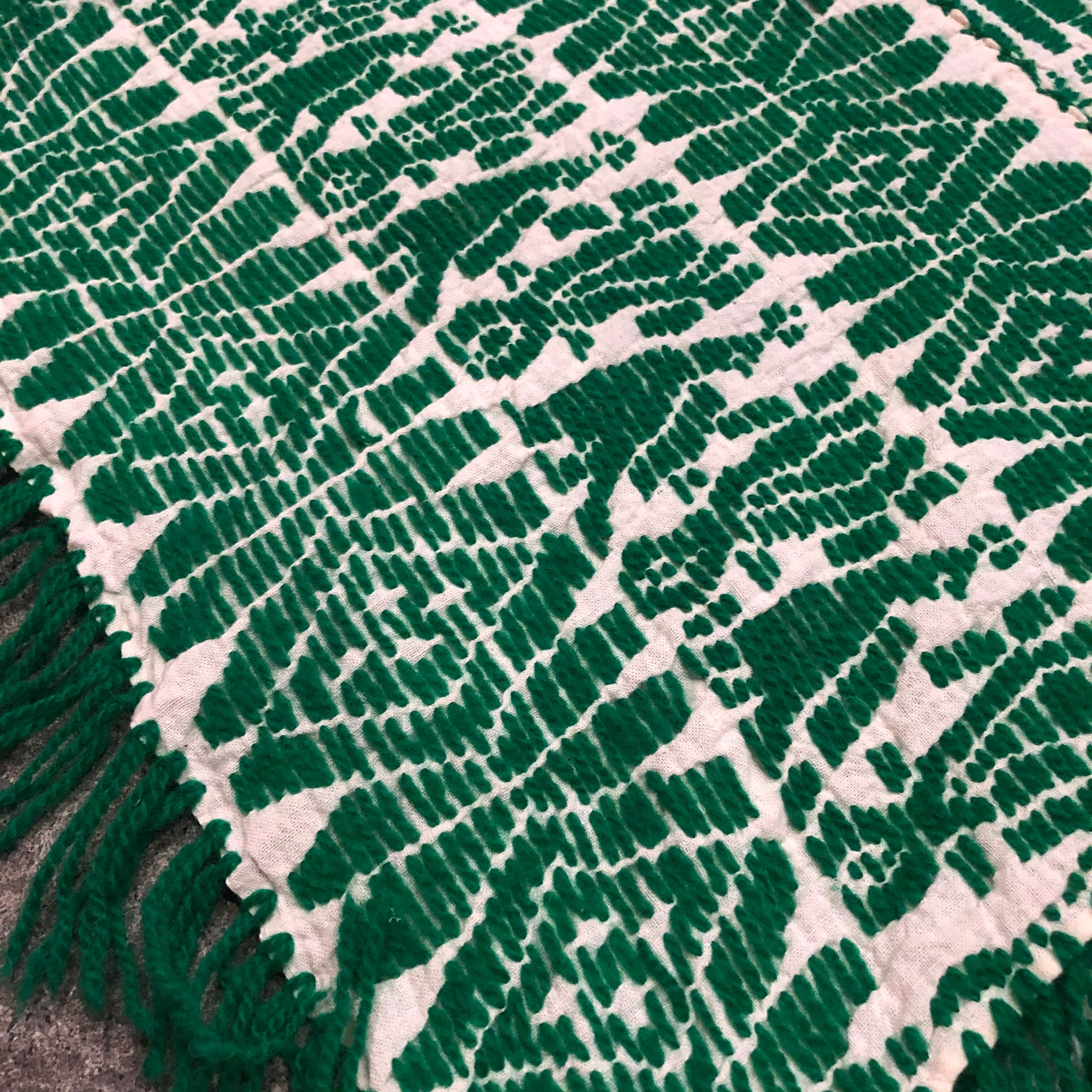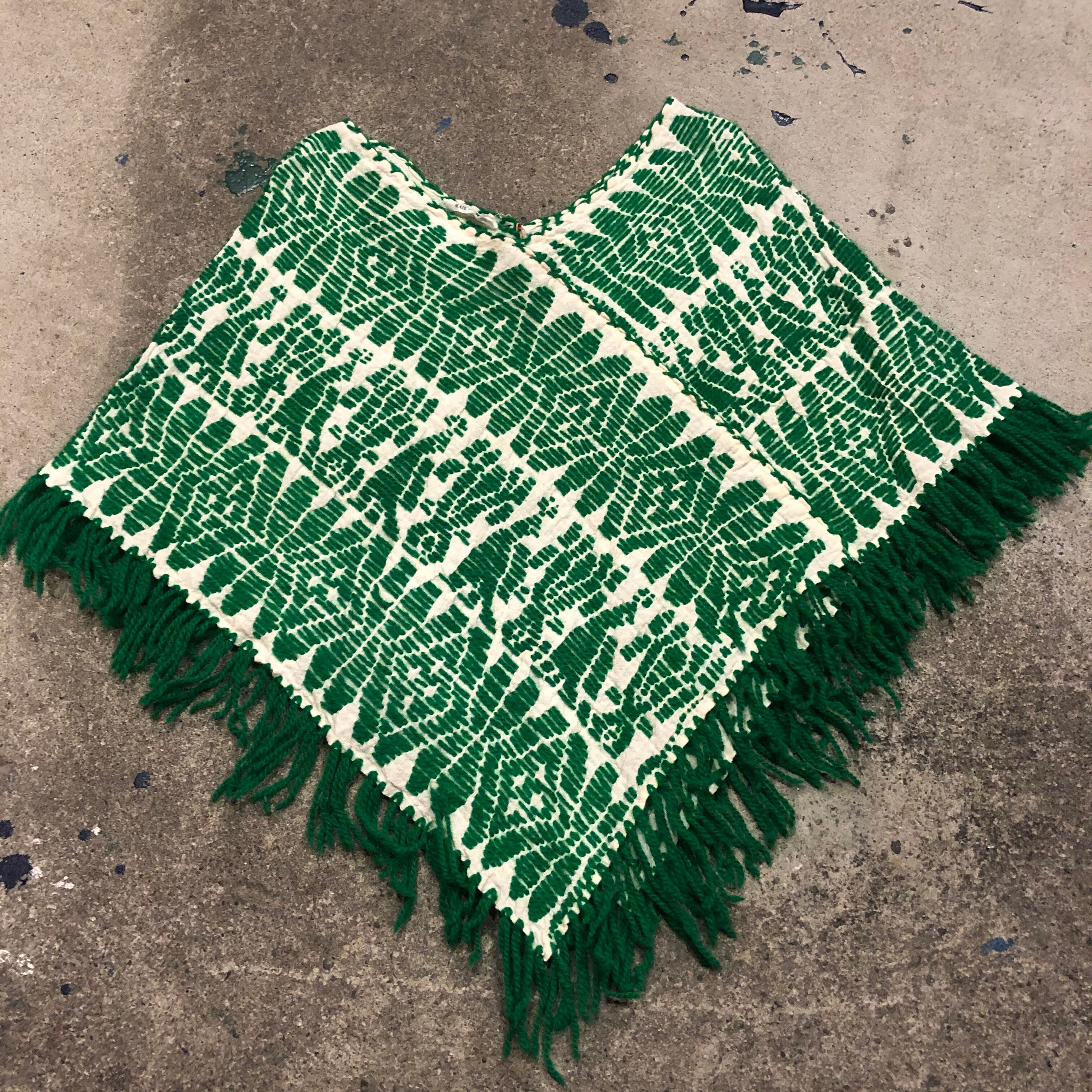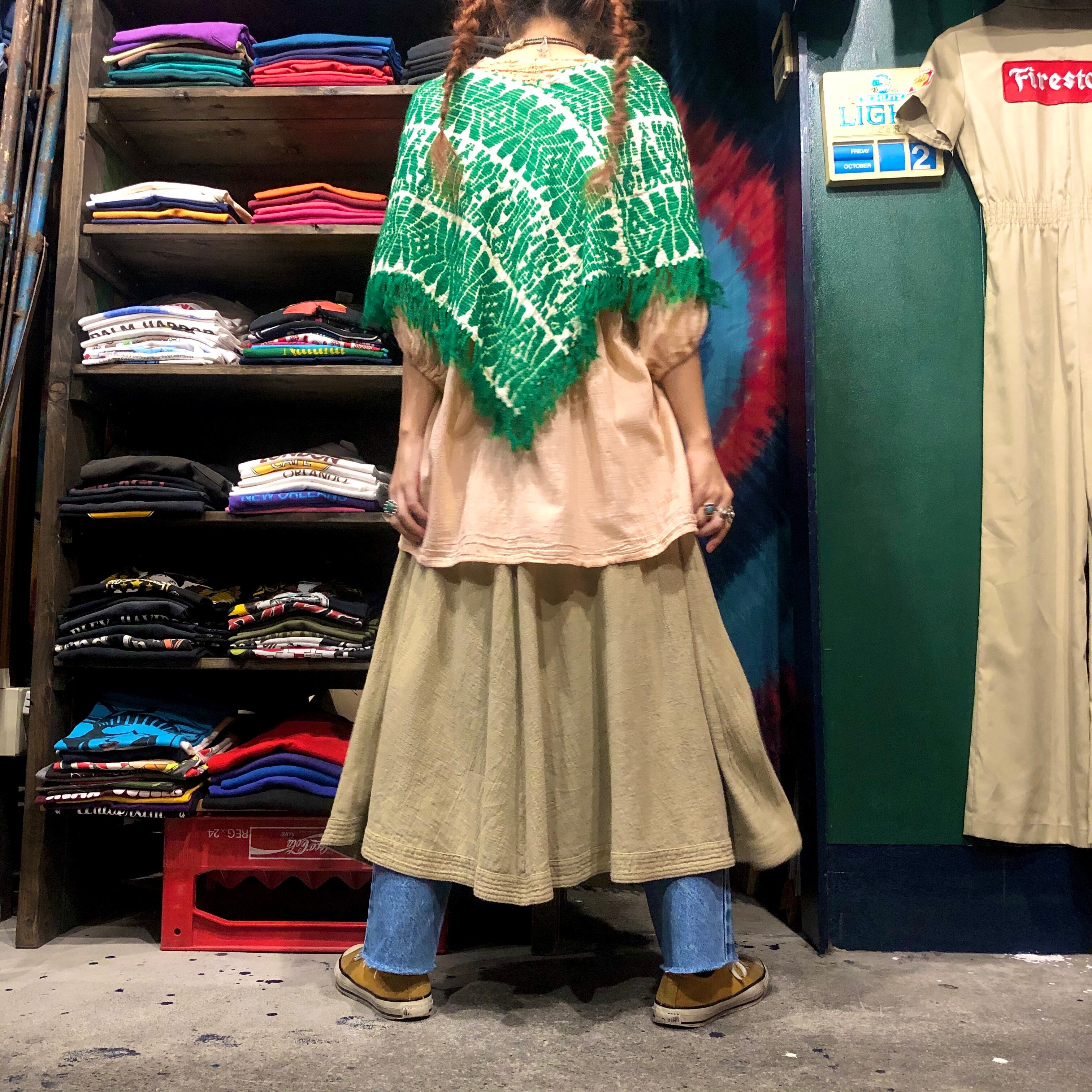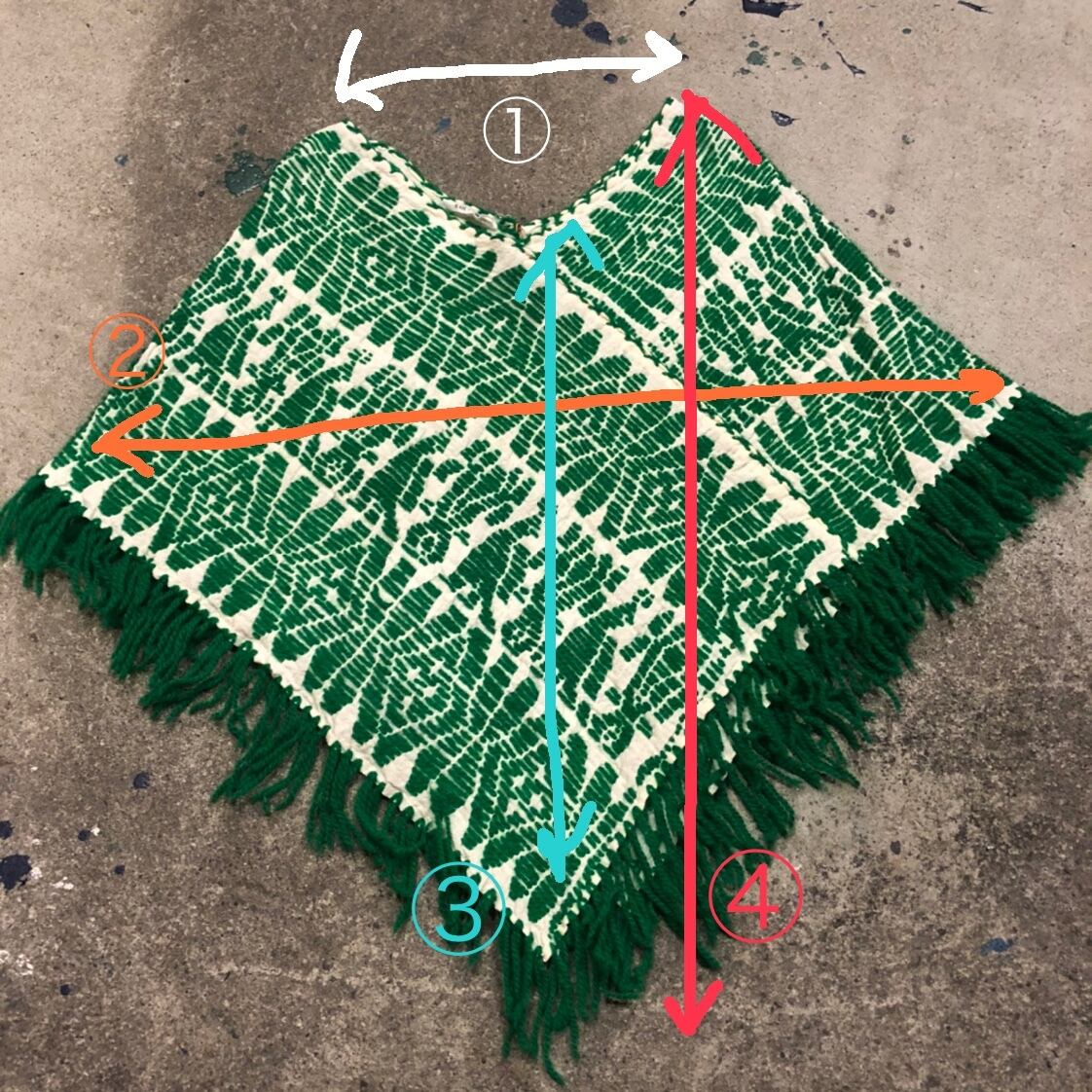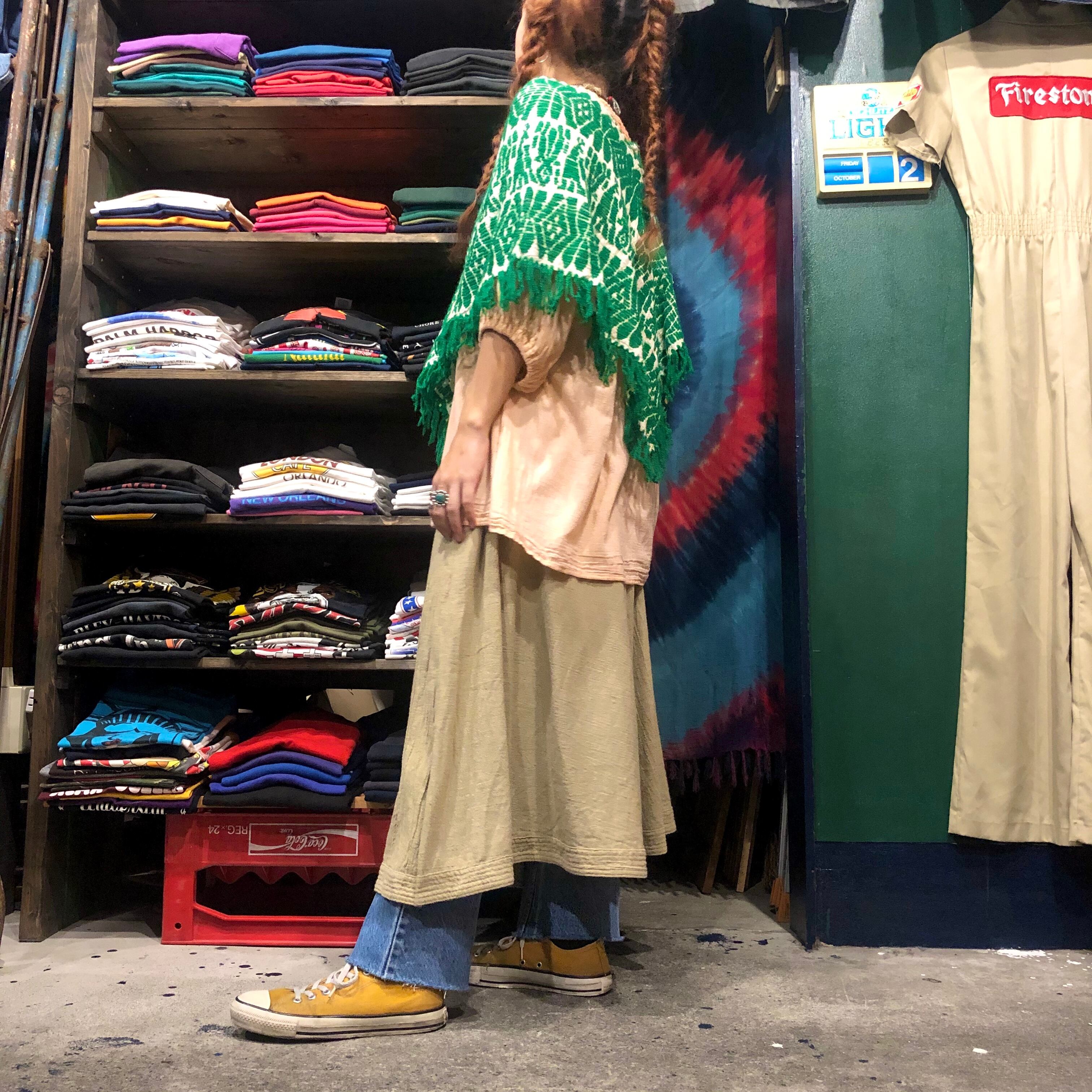 毛糸で模様が施されているコンパクトなポンチョです。生地は薄手のコットンですが、毛糸によって少し暖かい感じです。Tシャツの上などに気軽にプラスすると雰囲気がでて素敵だと思います。