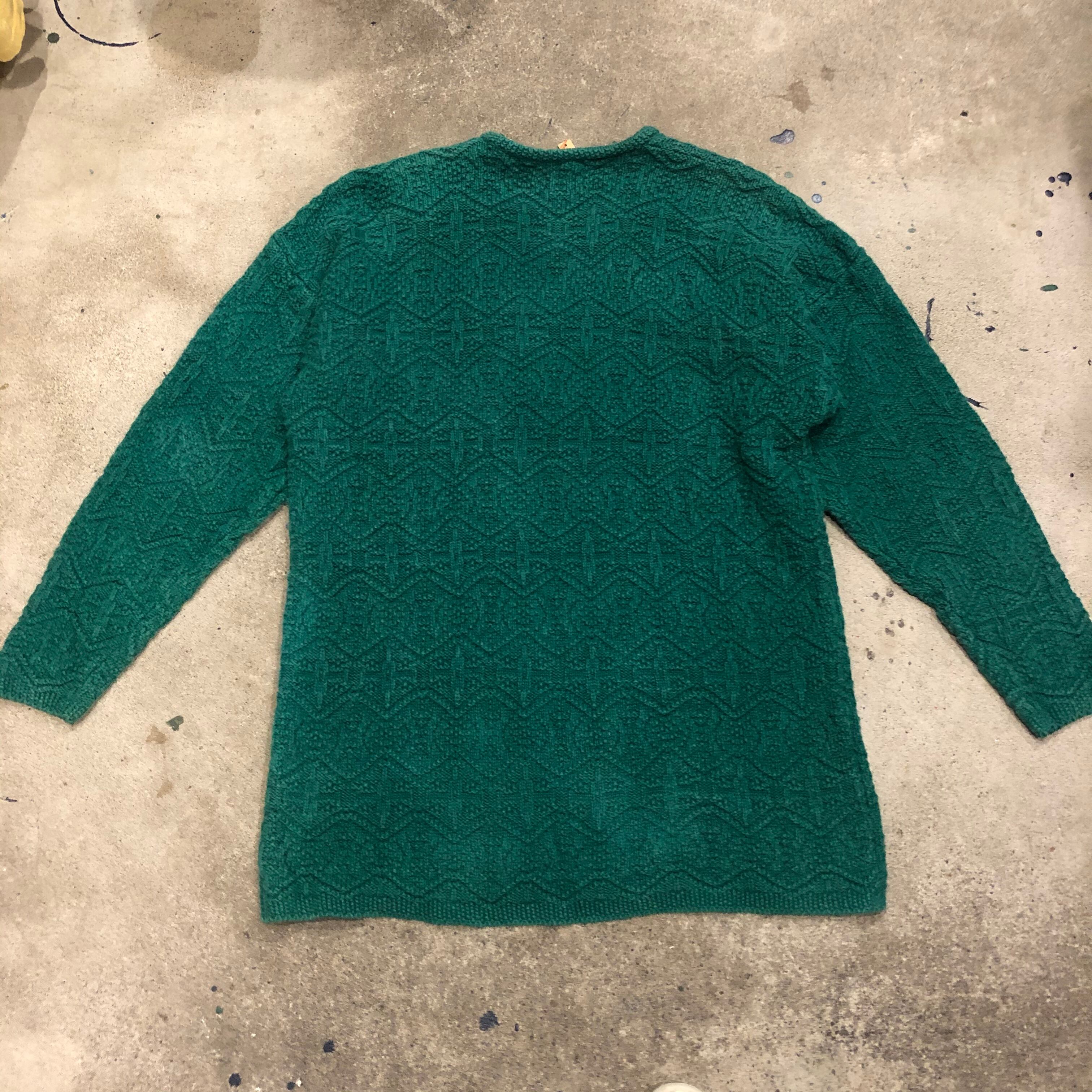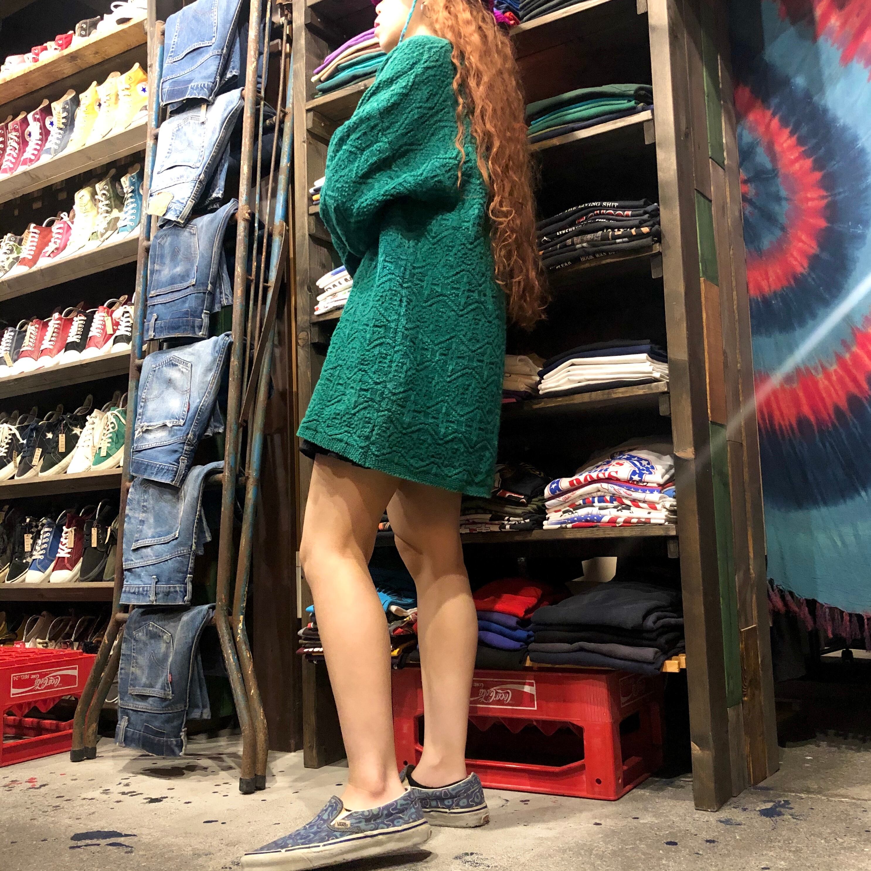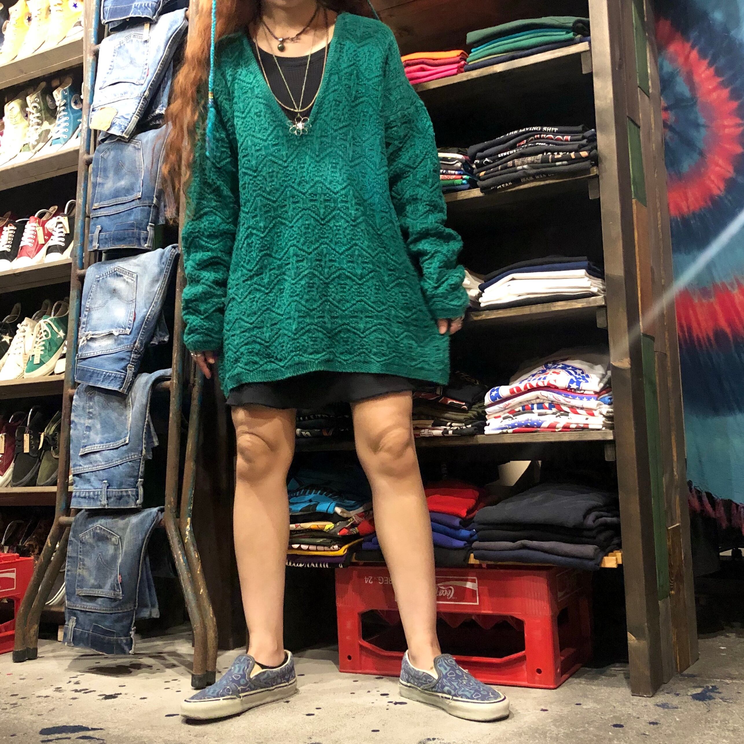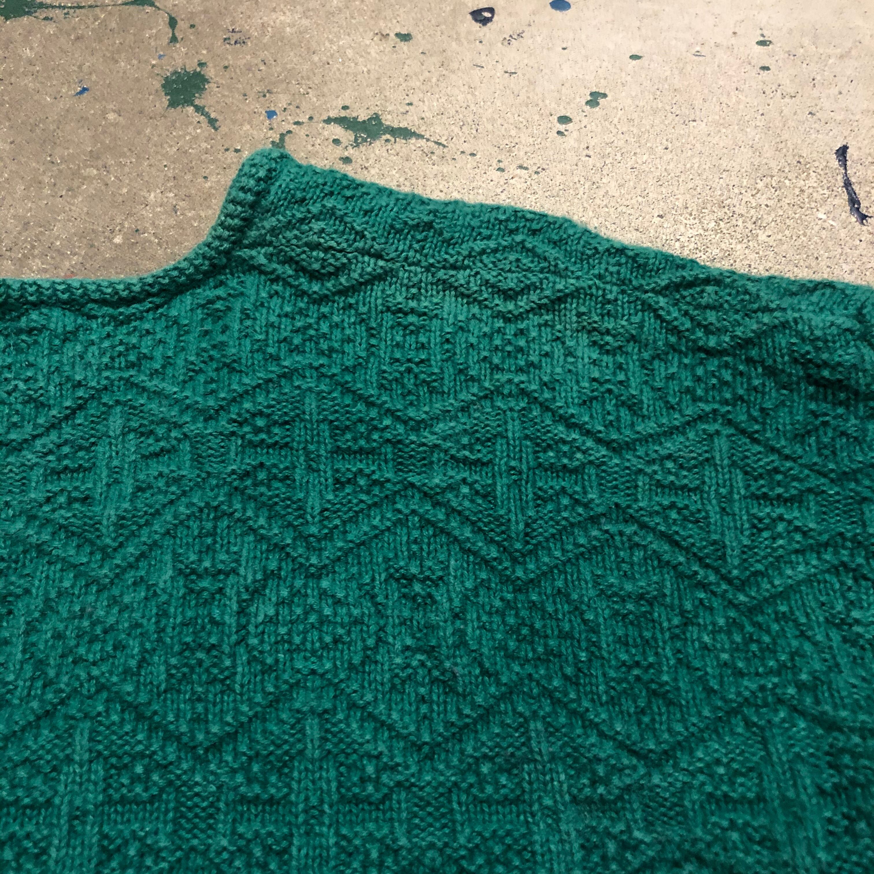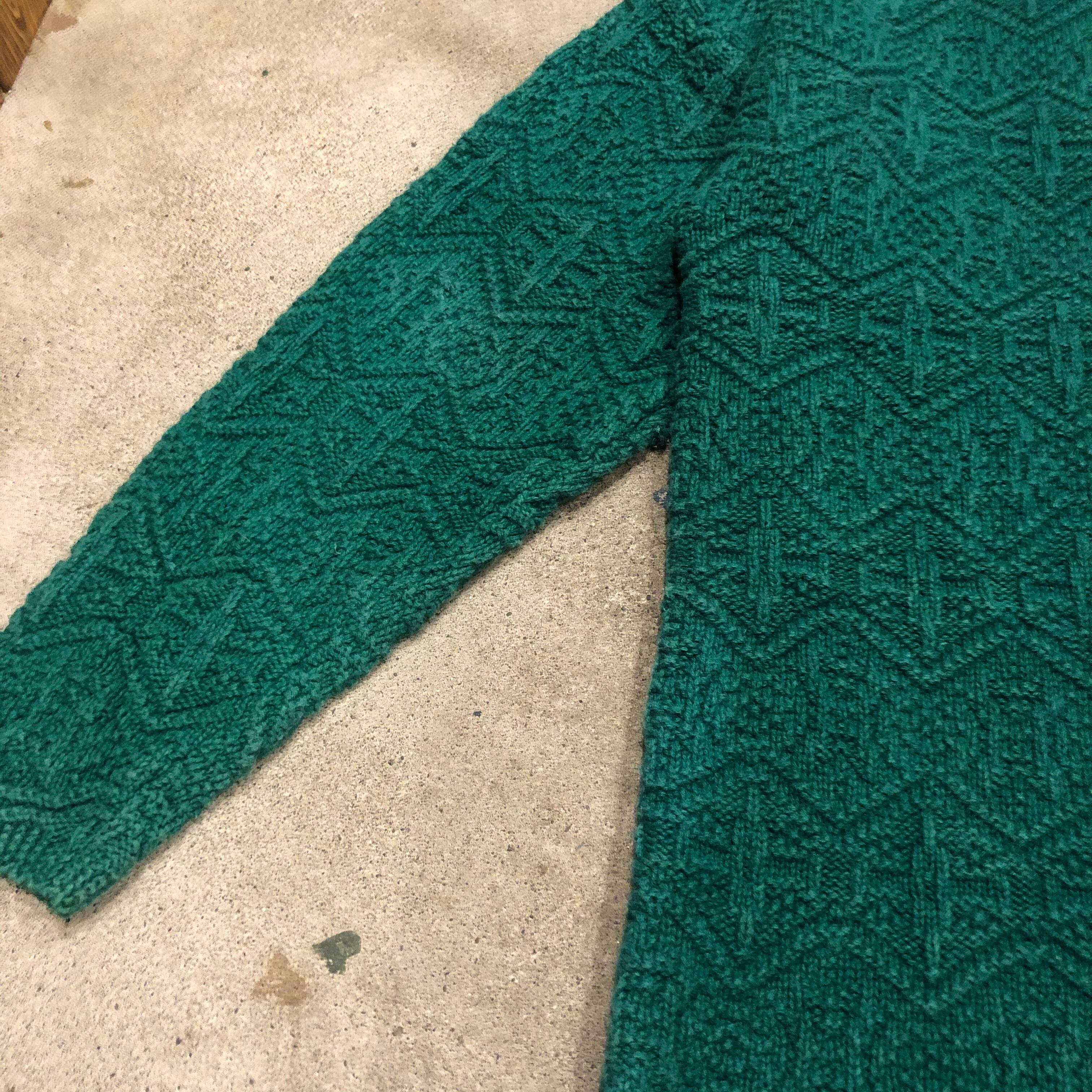 がっしり存在感のある生地感と幾何学模様の編み地で鮮やかな緑が素敵です。