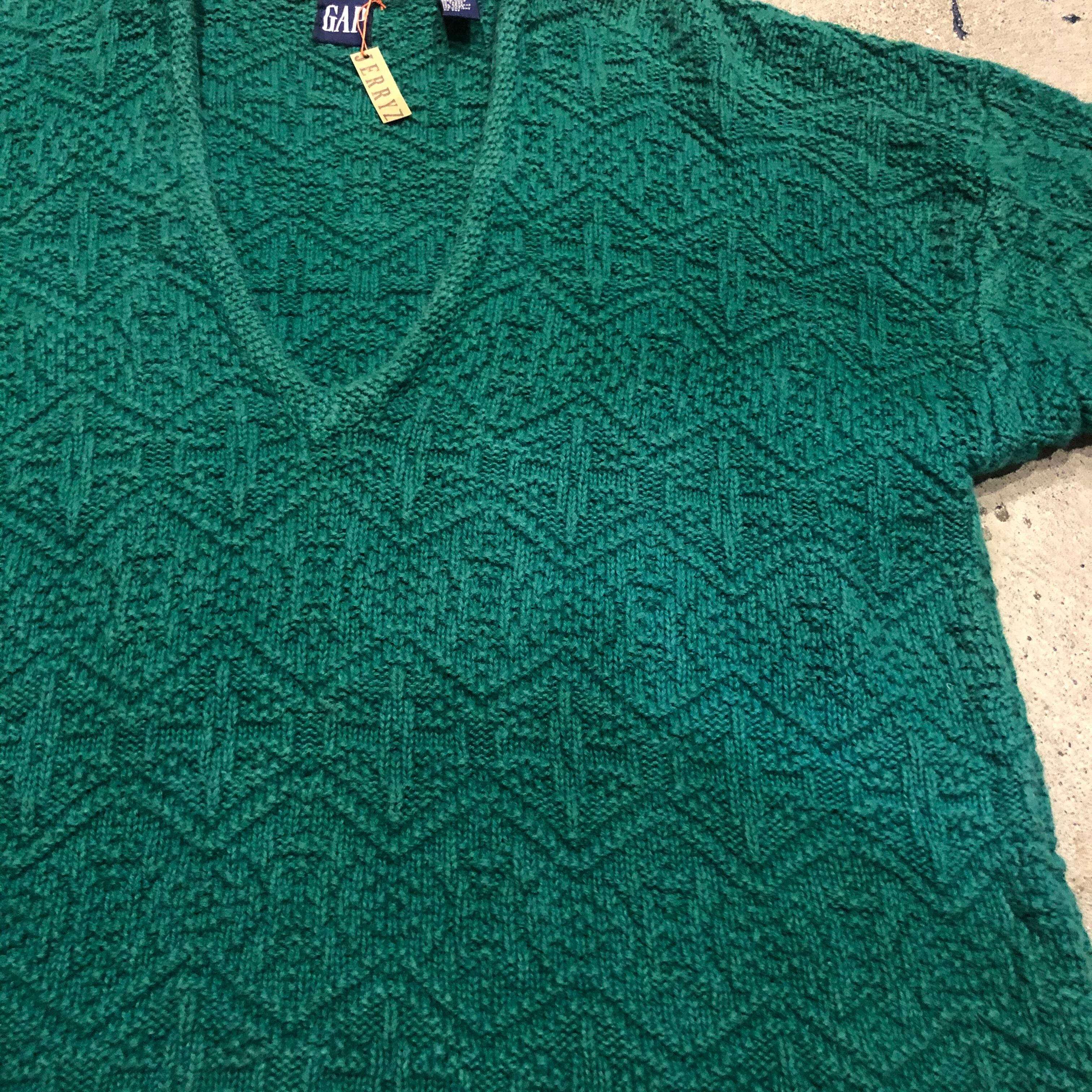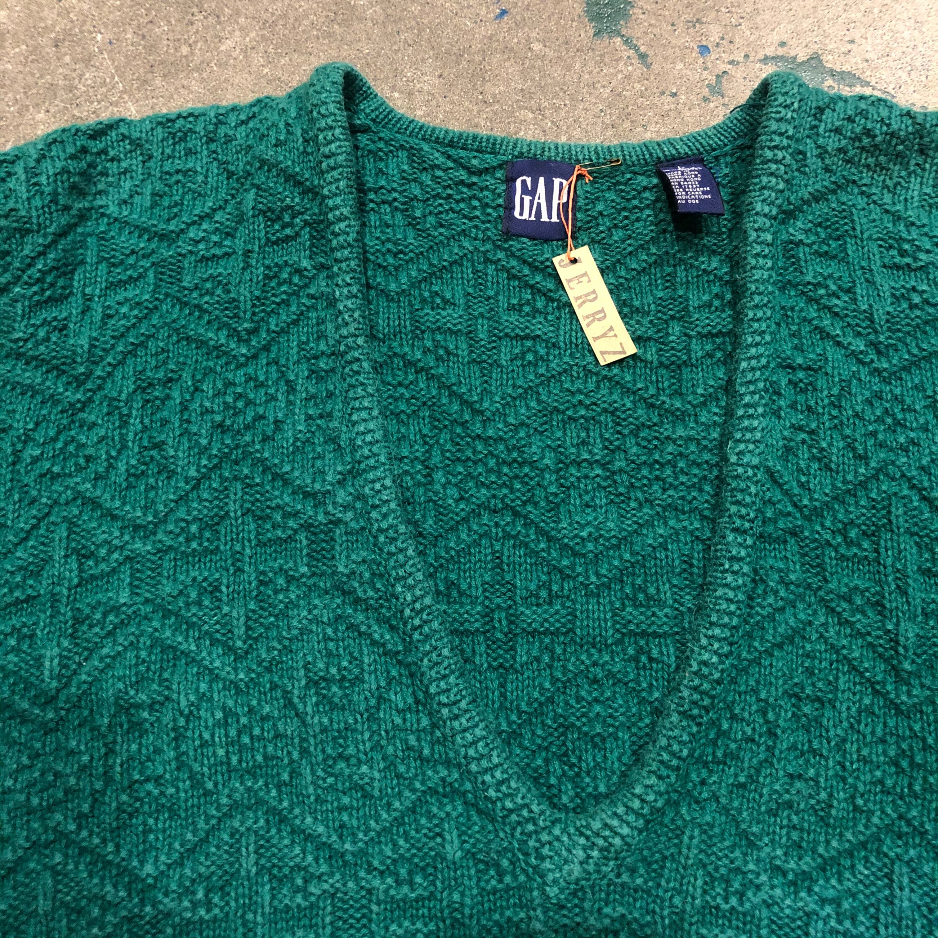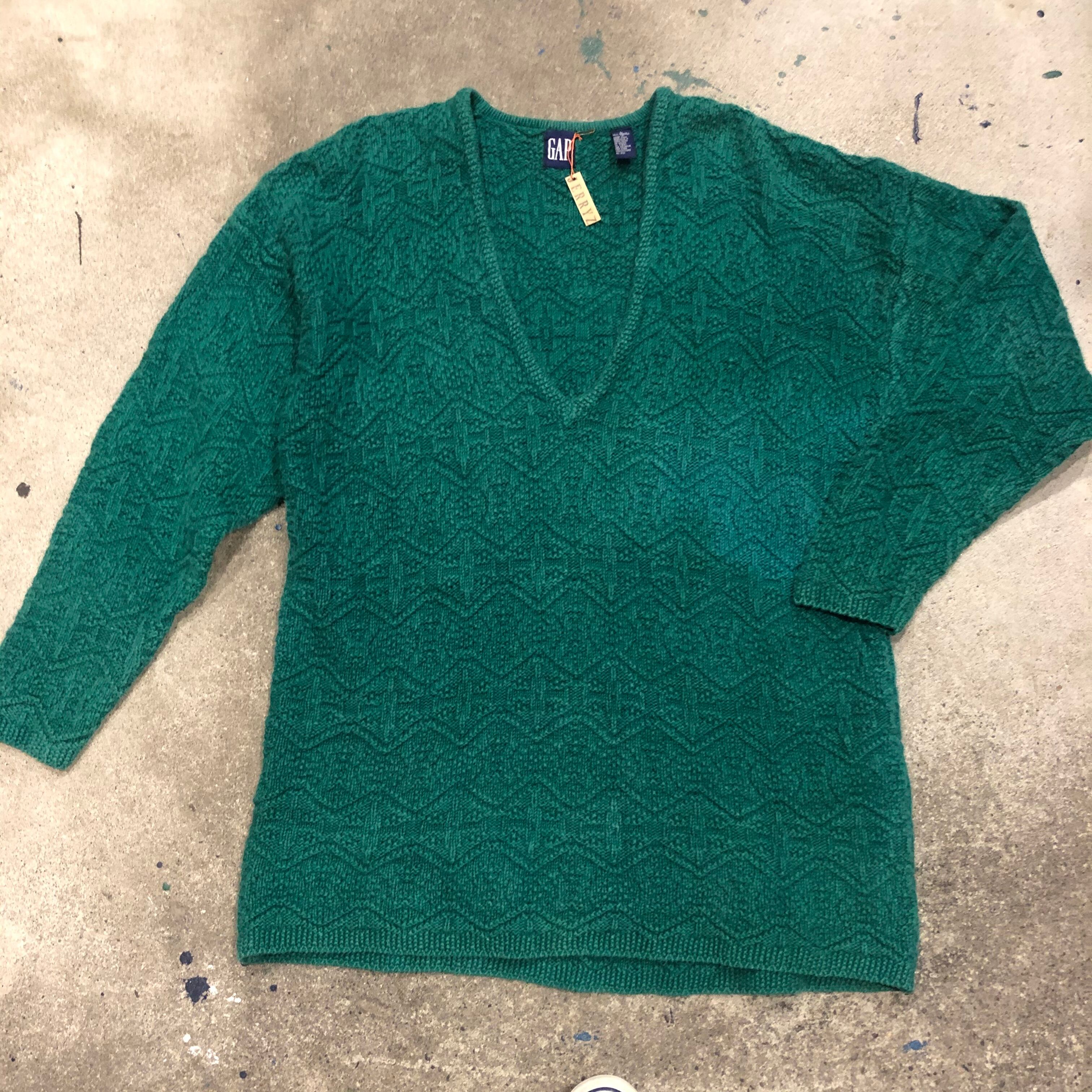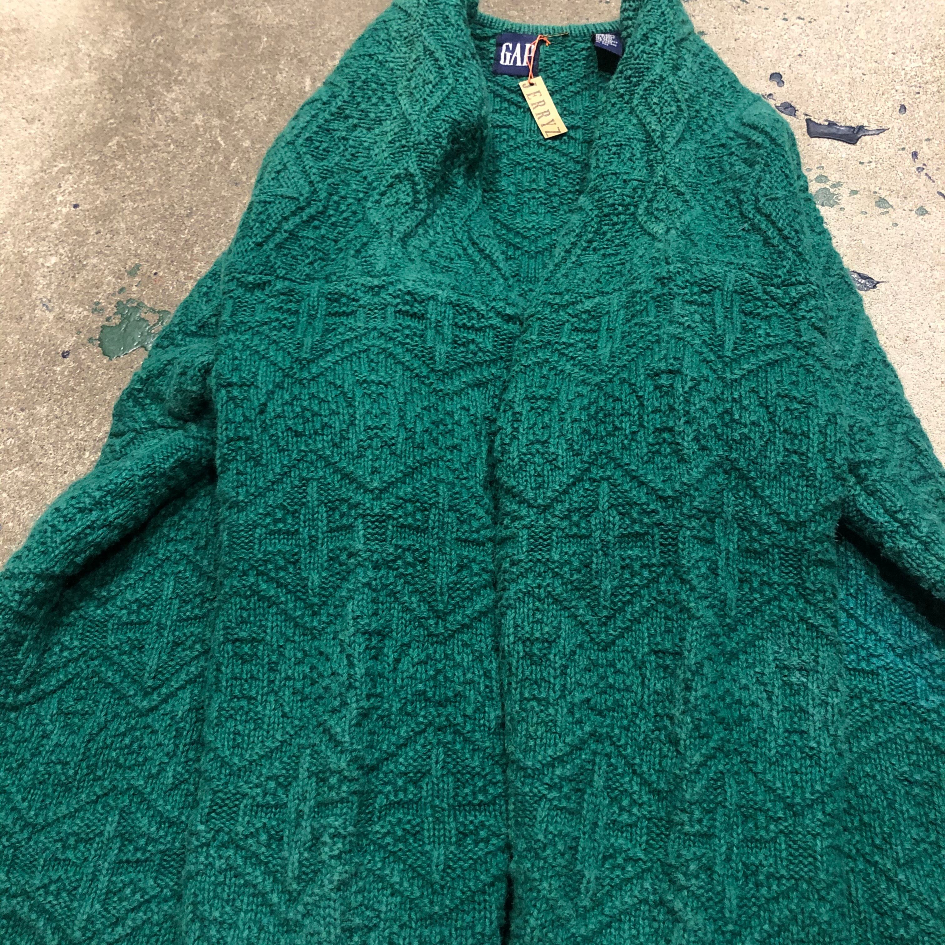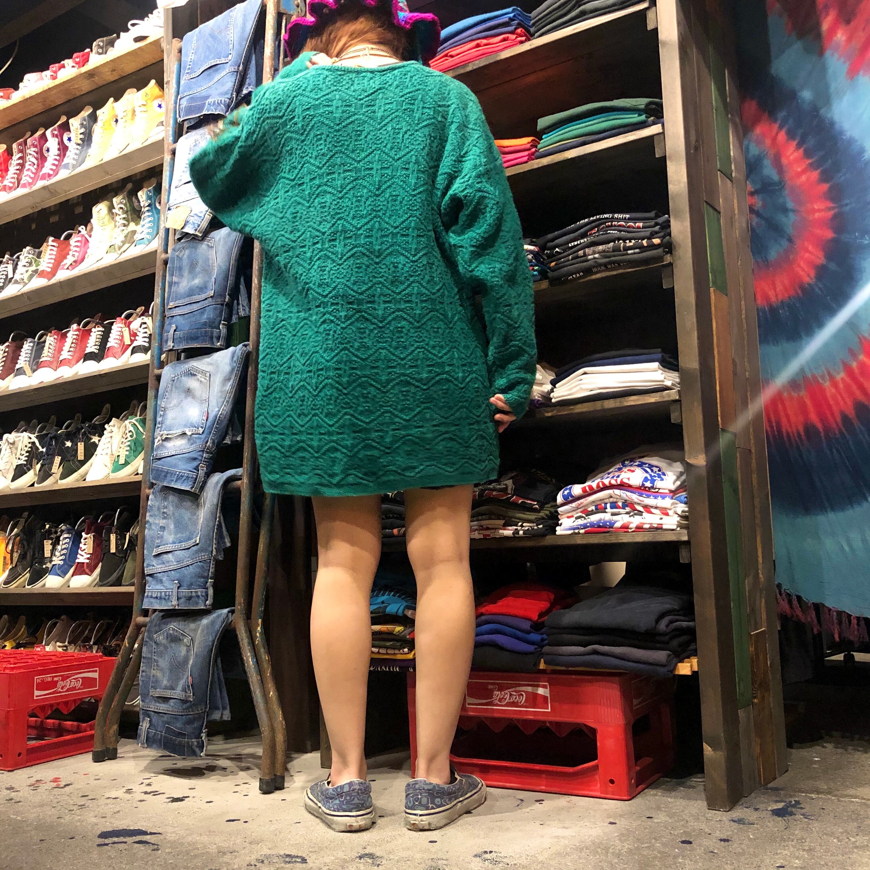 がっしり存在感のある生地感と幾何学模様の編み地で鮮やかな緑が素敵です。