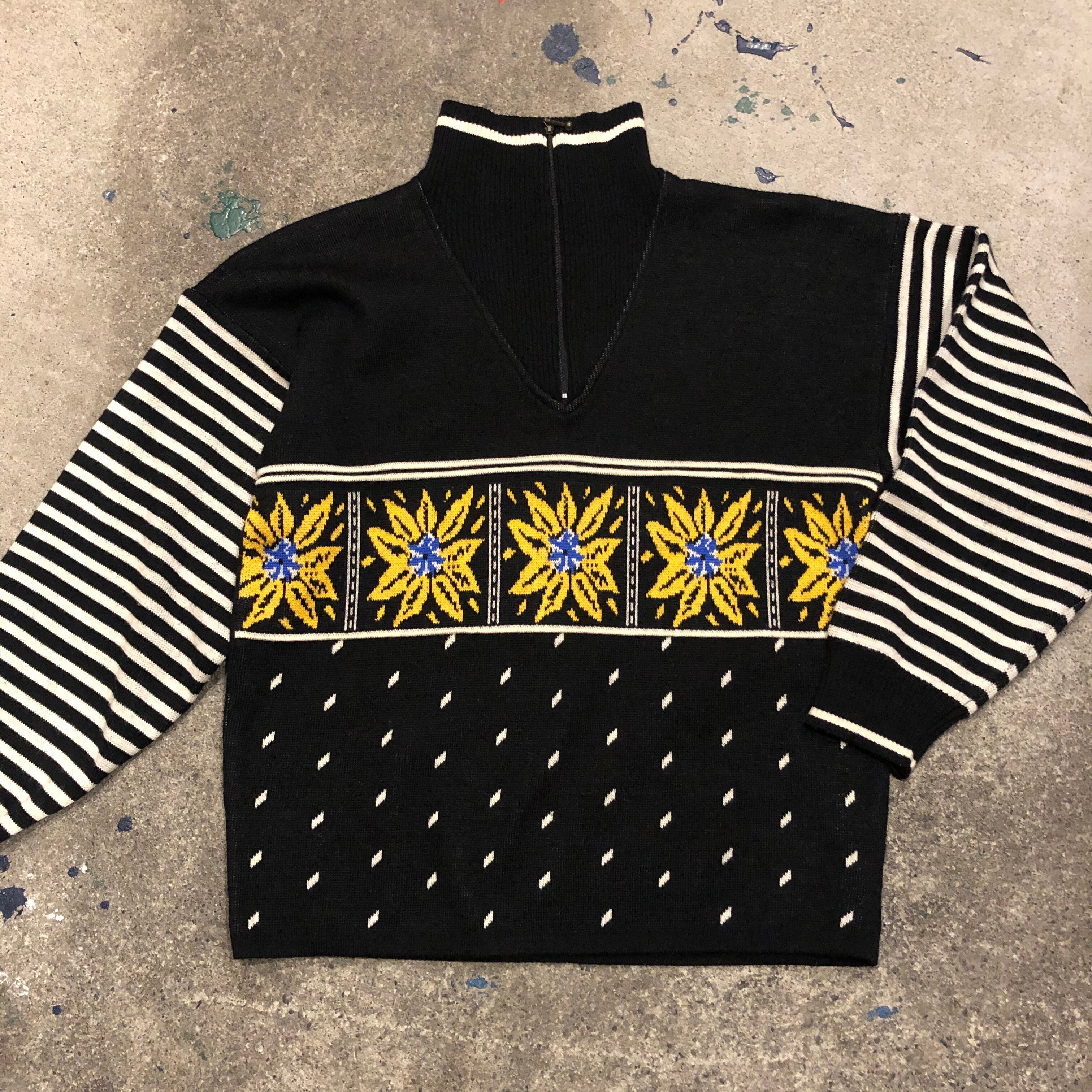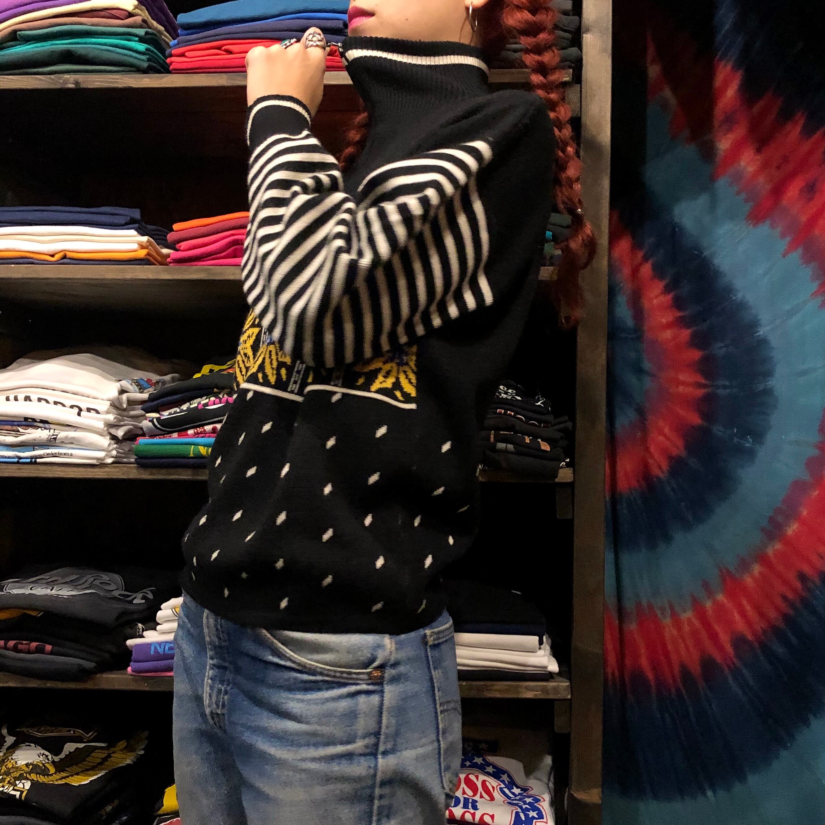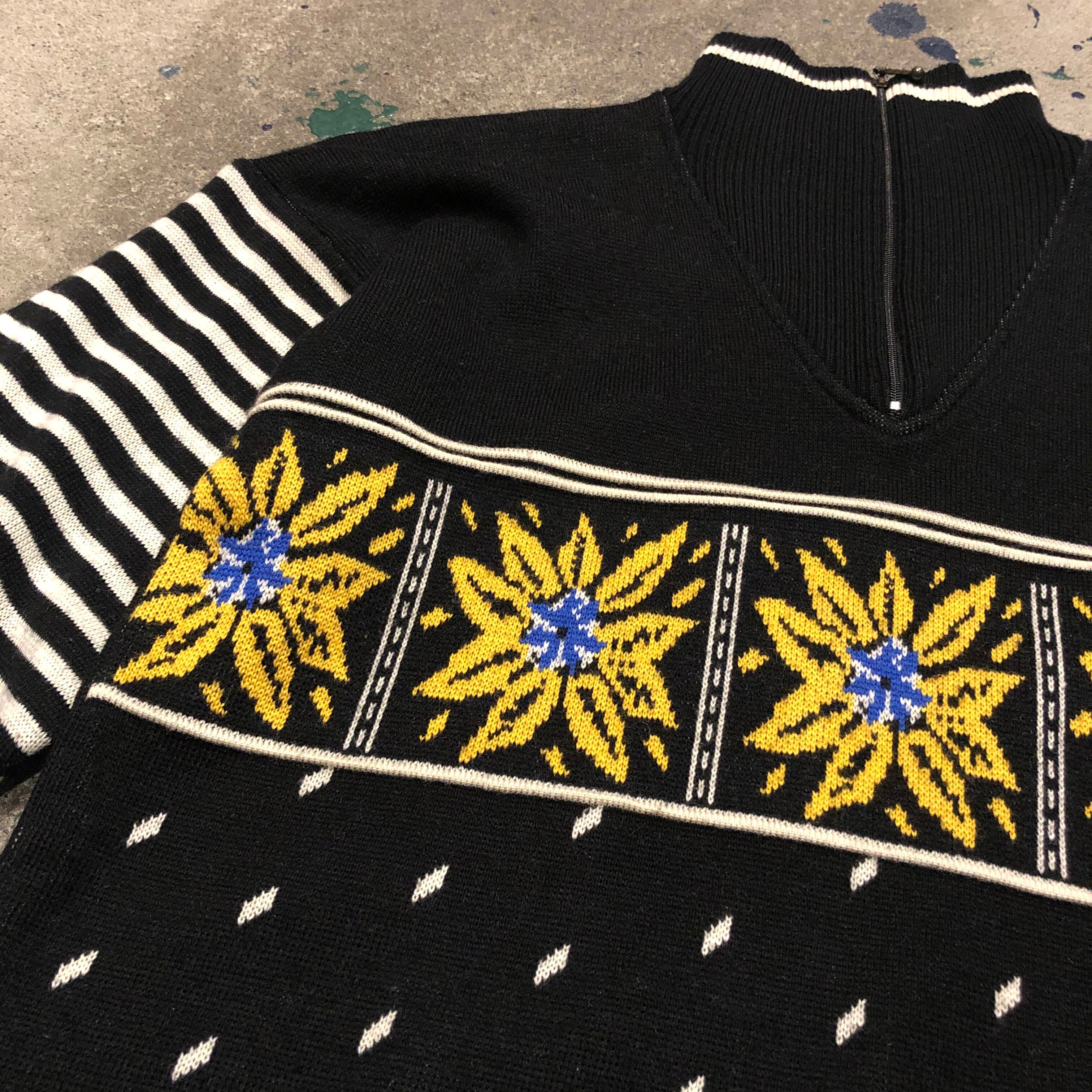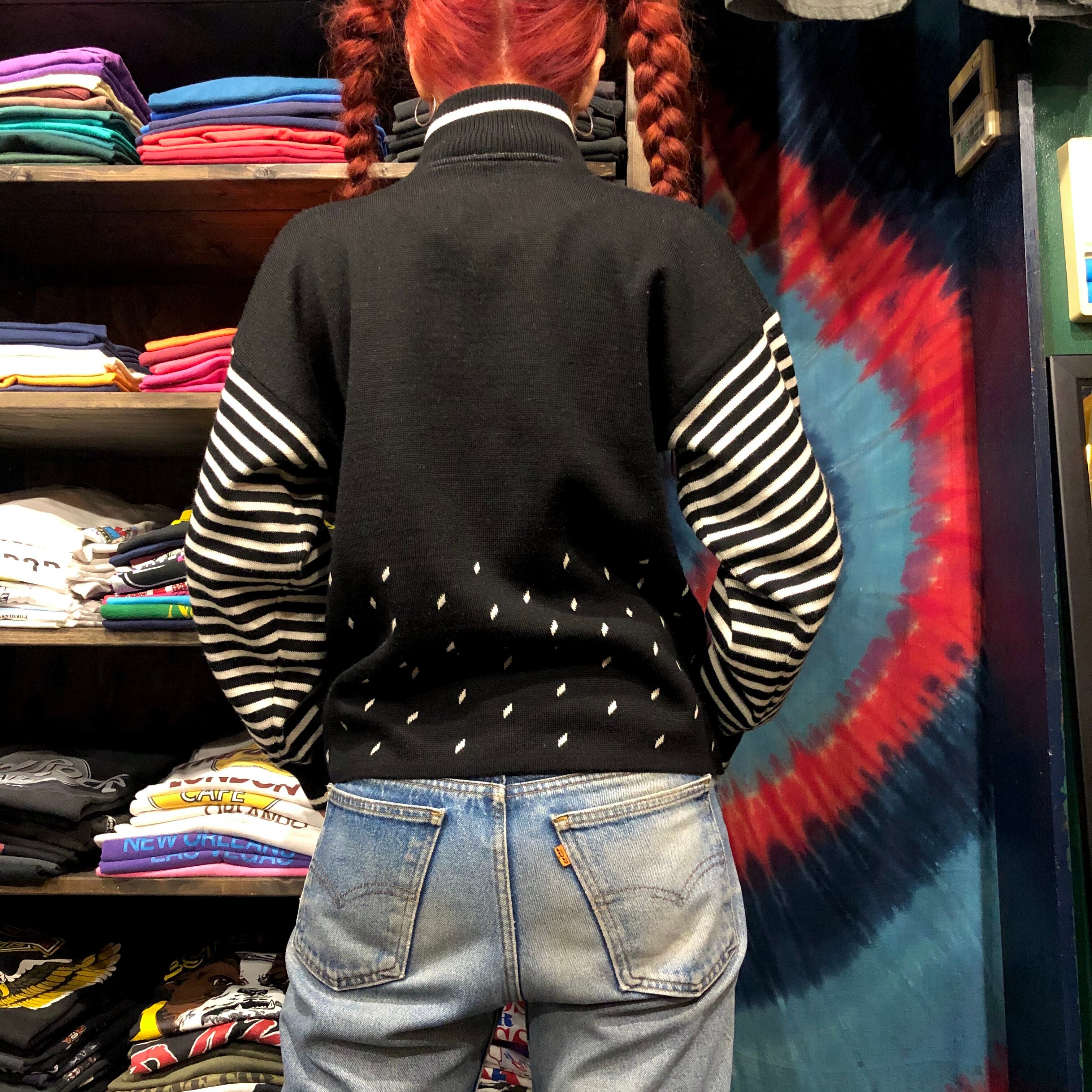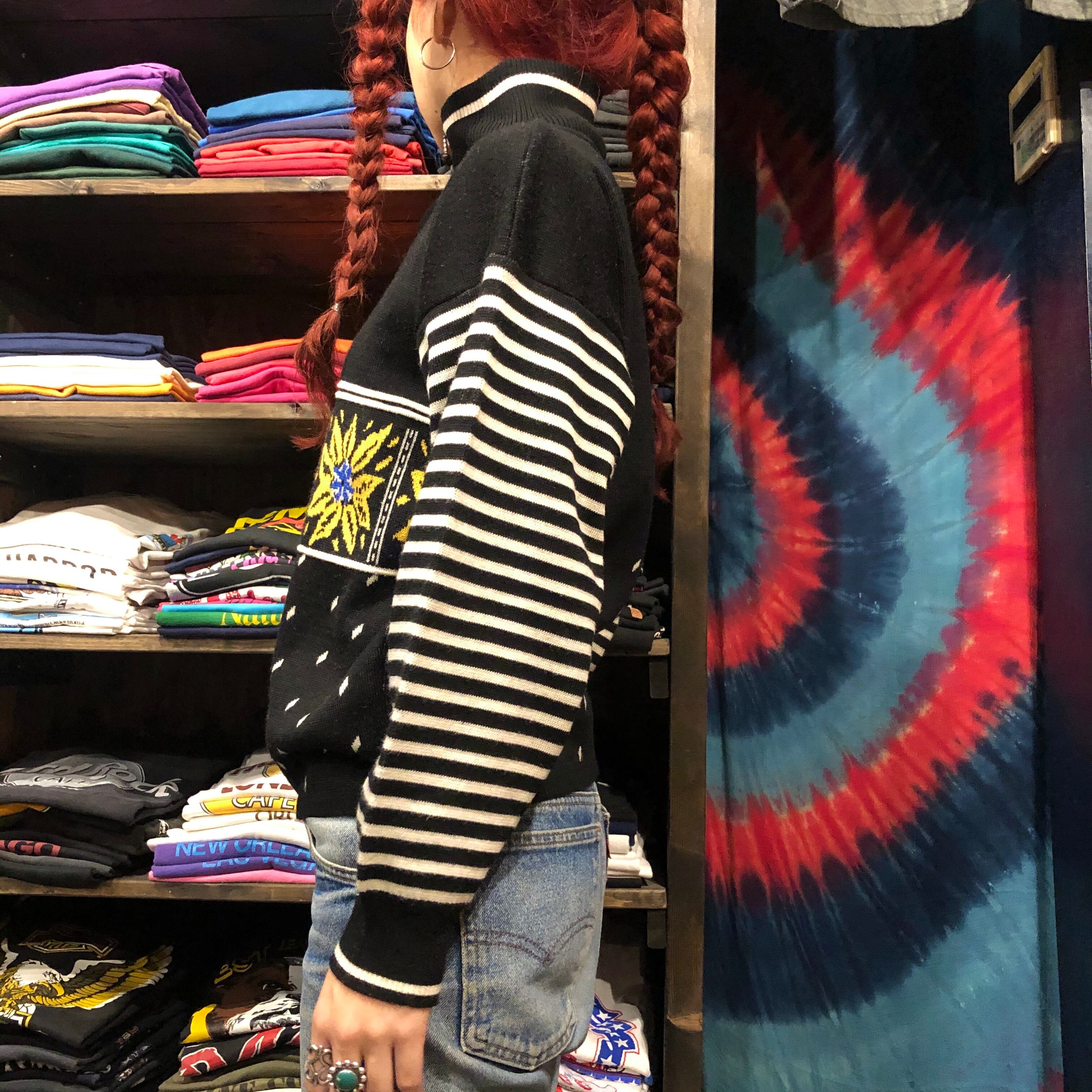袖のボーダーと胸下のお花がかわいいニットです。目の詰まった編み地がとても暖かいです。ボリュームのあるロングスカートやシンプルにデニムに合わせても良いですね!なんだか不思議な魅力があっておすすめです。