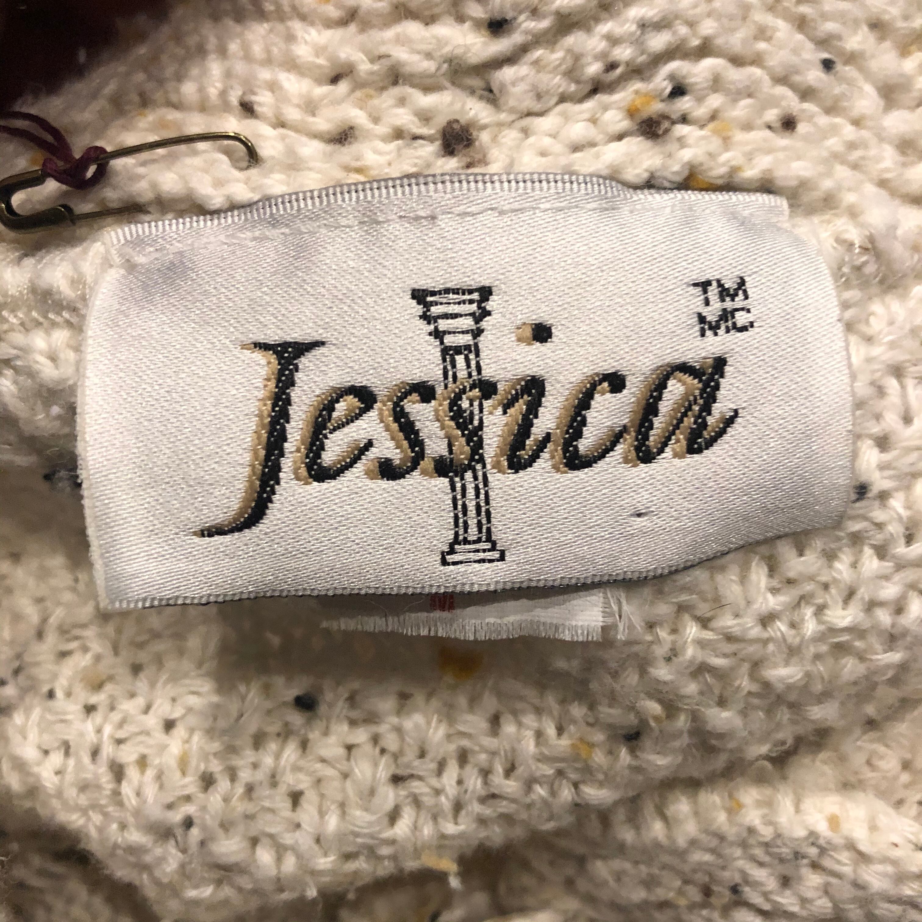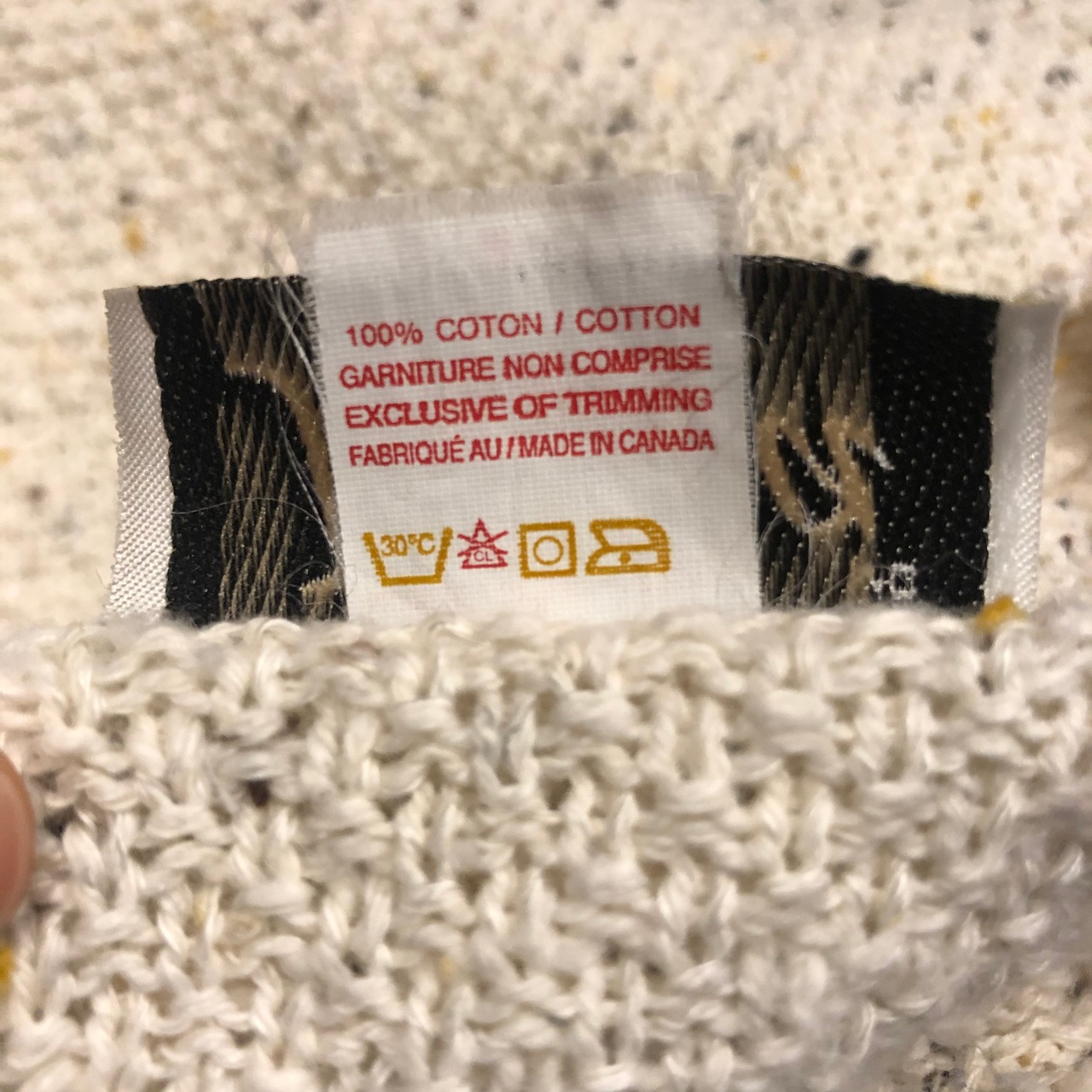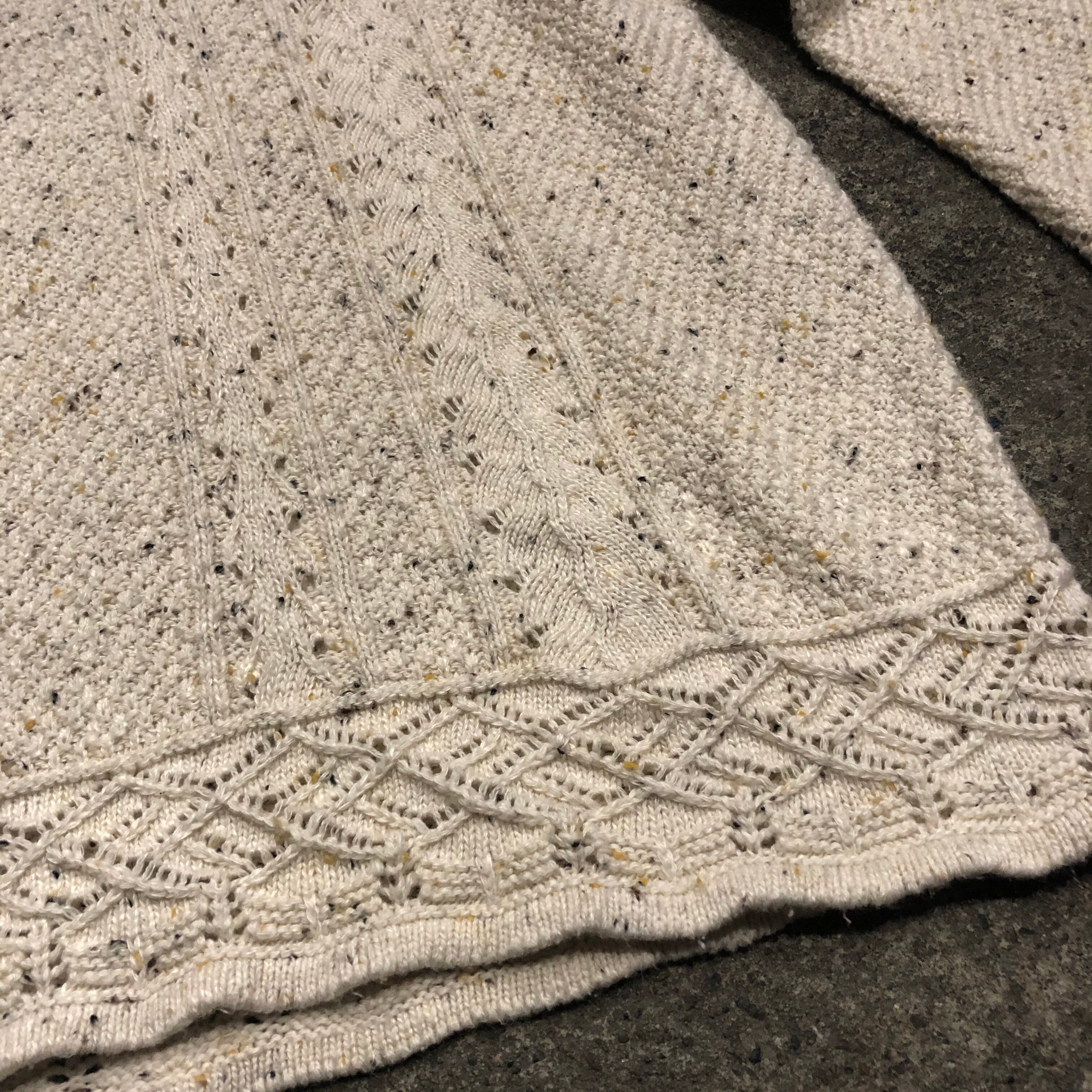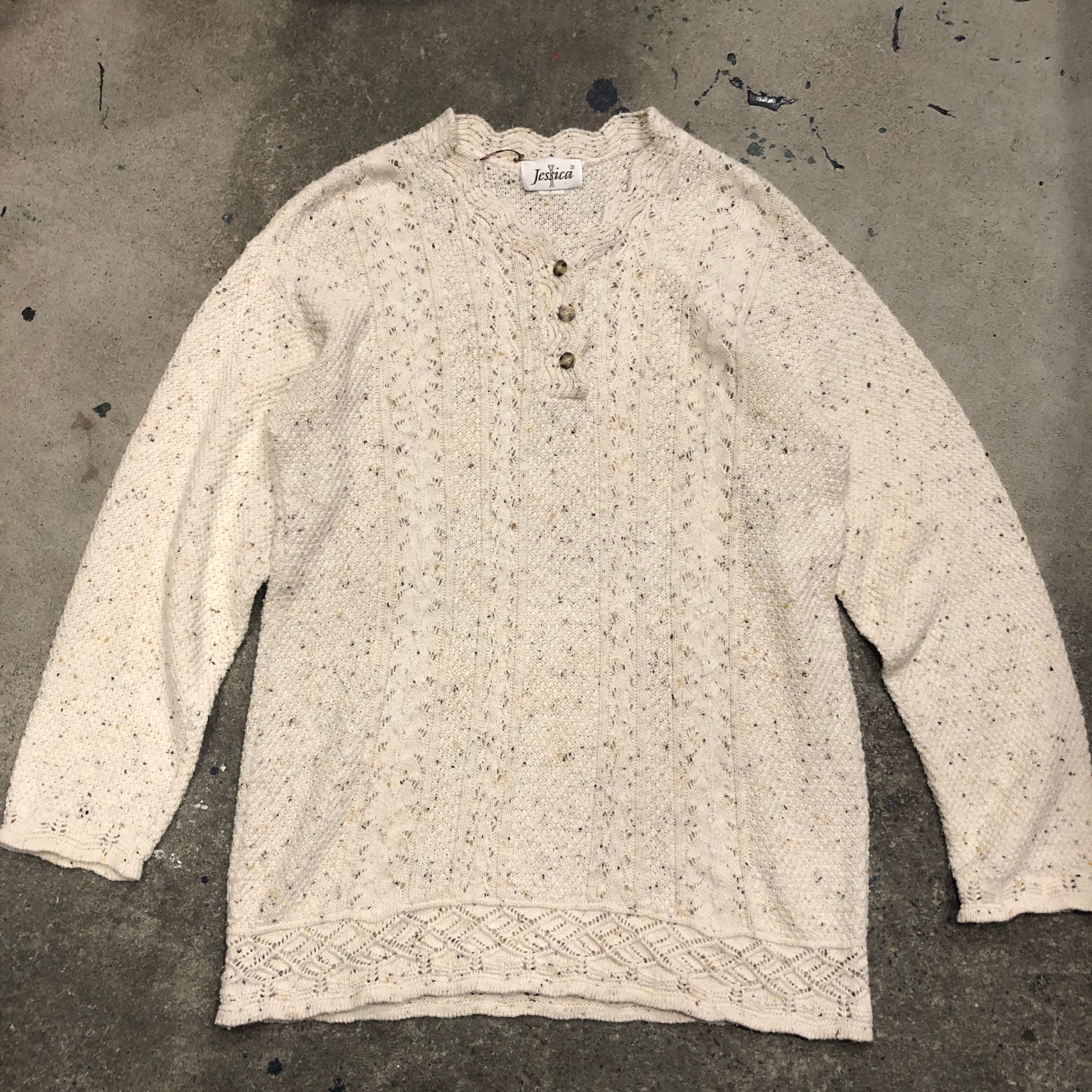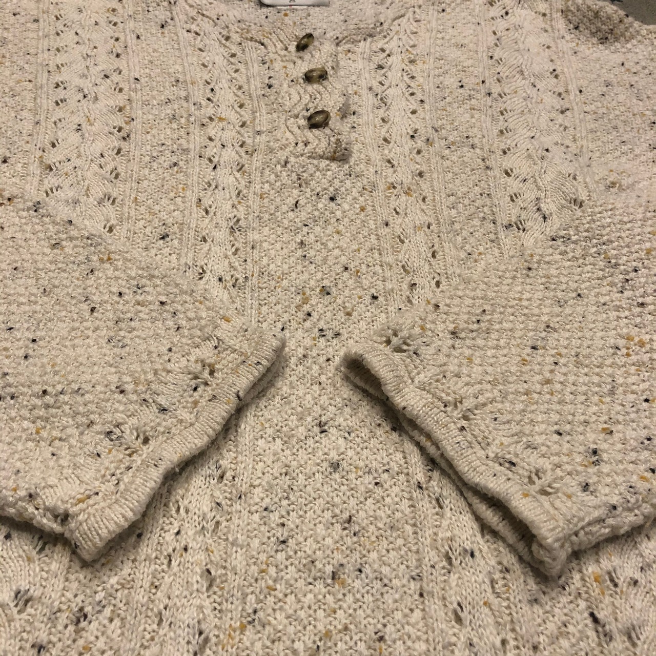 細かい模様編みがかわいいコットンニットです。襟ぐりがスカラップになっていて、優しいオフホワイトが女性らしい雰囲気です。