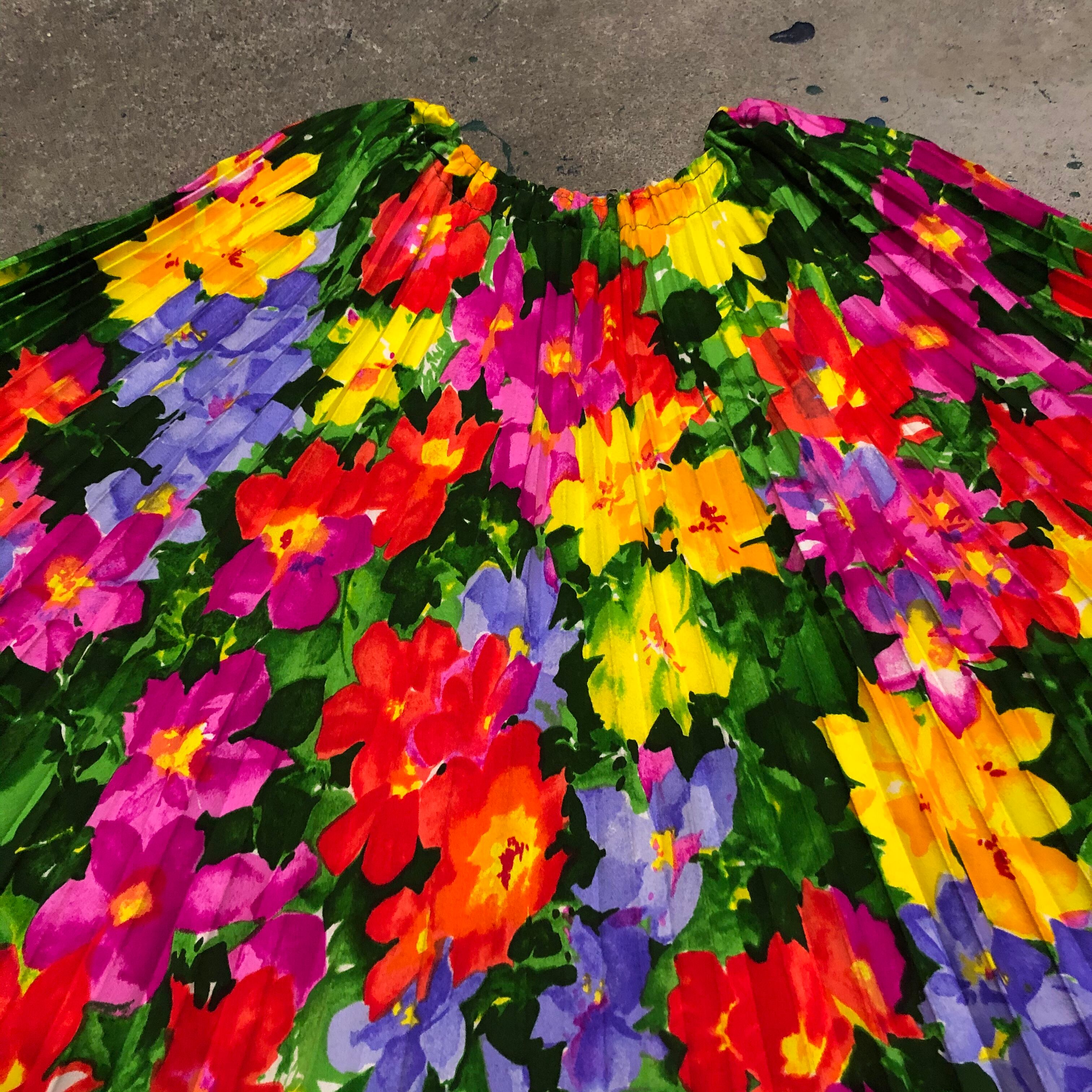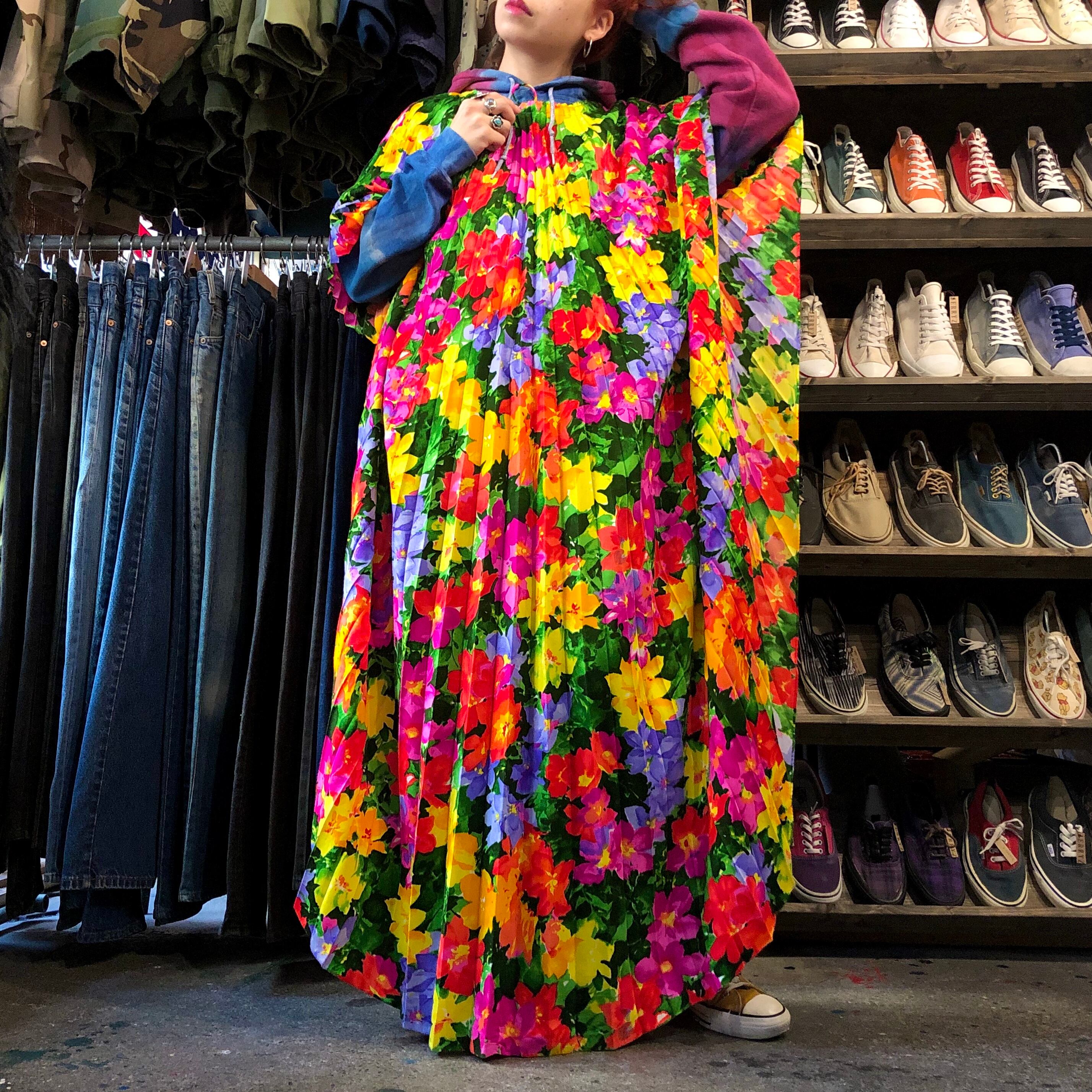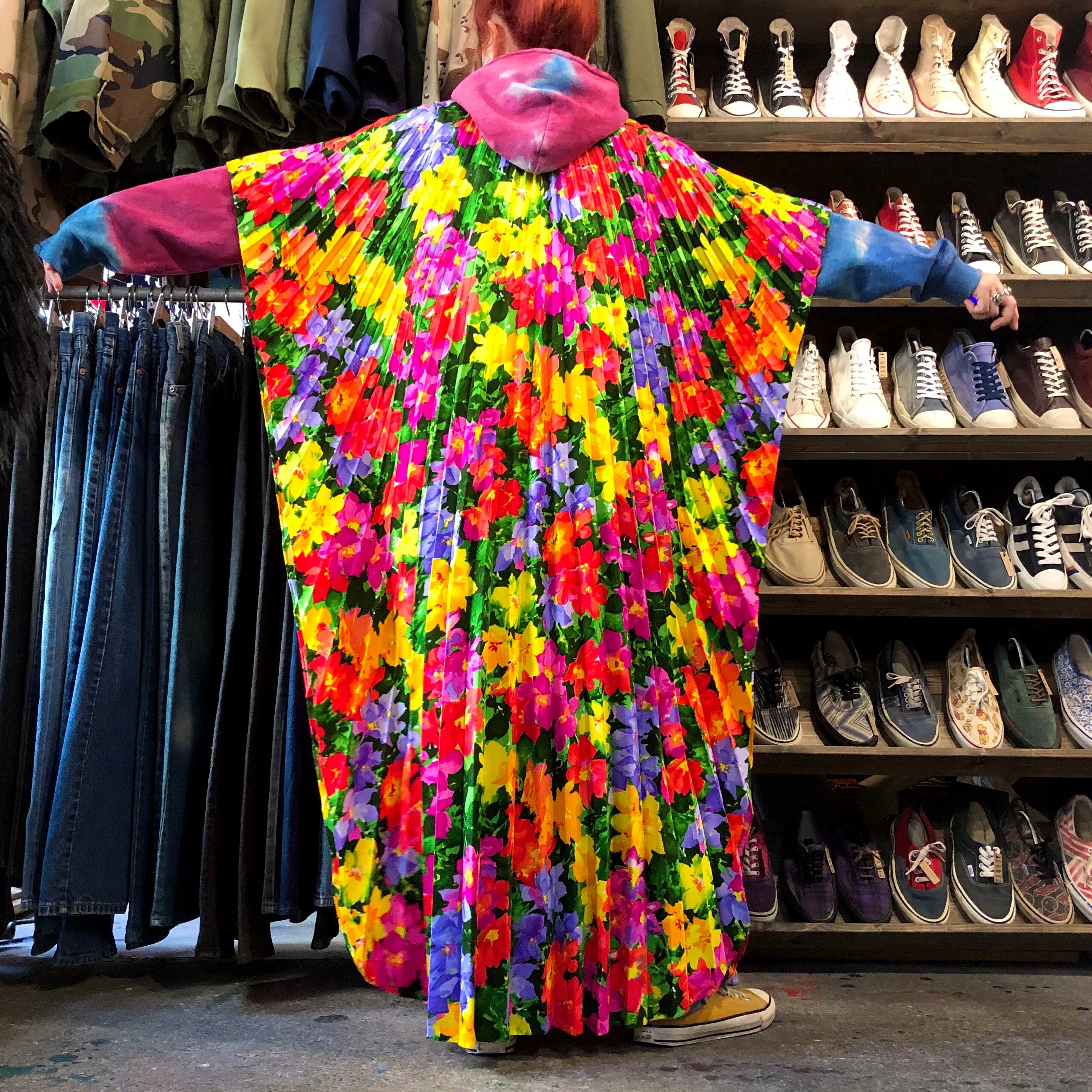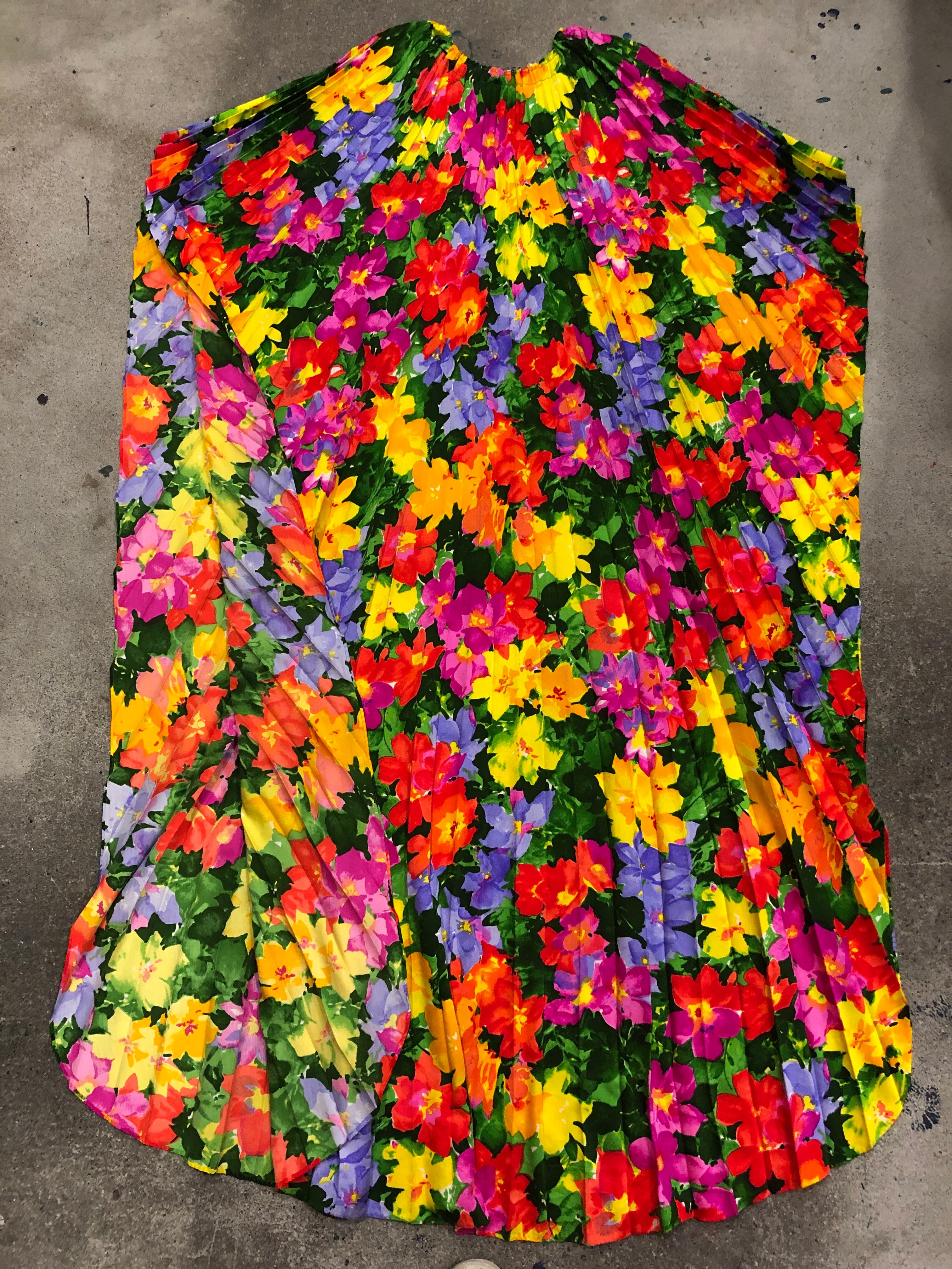 目が覚めるような鮮やかな花柄が素敵です。ポンチョのようなシルエットですが脇は縫われており、全体がプリーツになっているおもしろいデザインです。襟ぐりは紐で絞れるようになっています。着ているとハッピーになれる一着です!