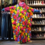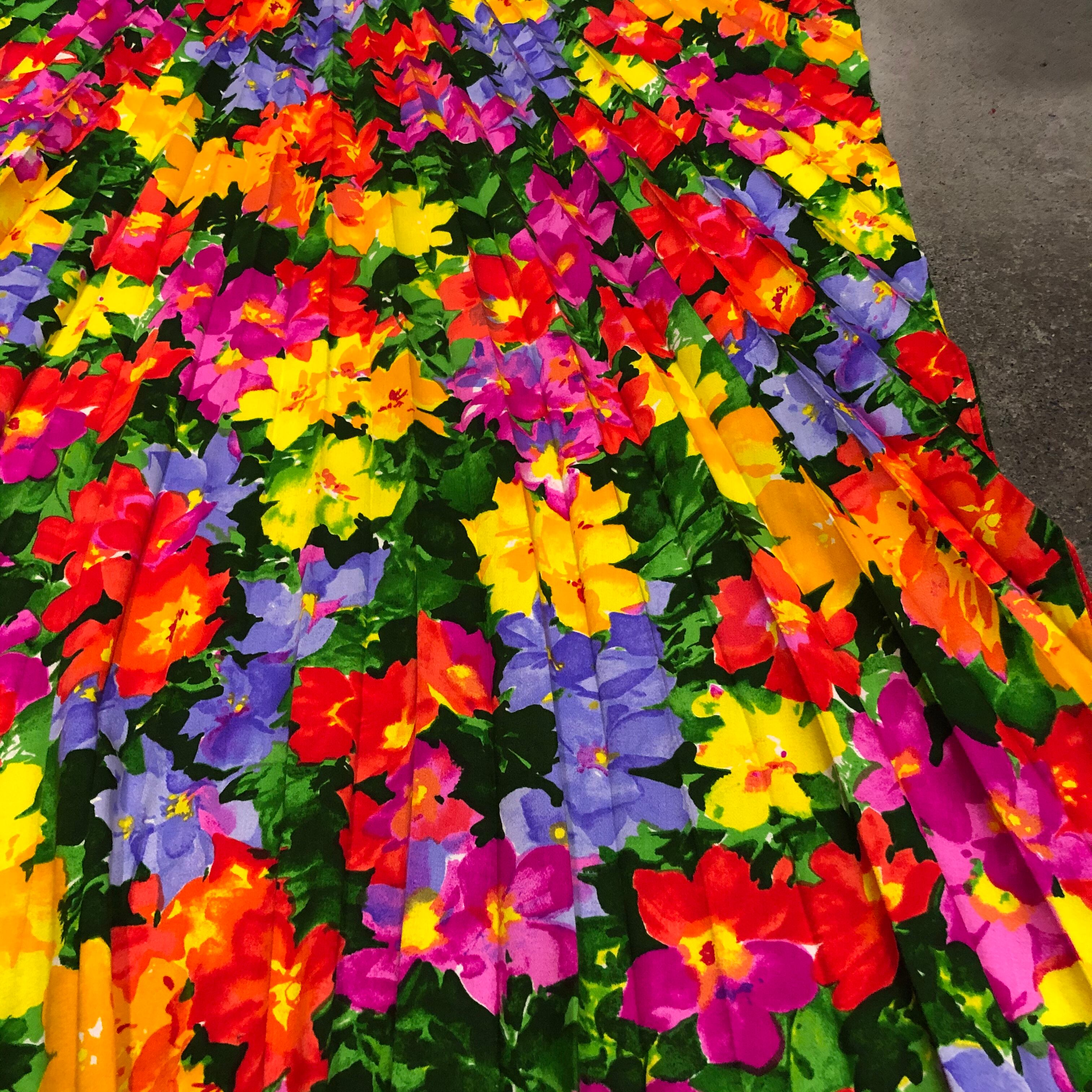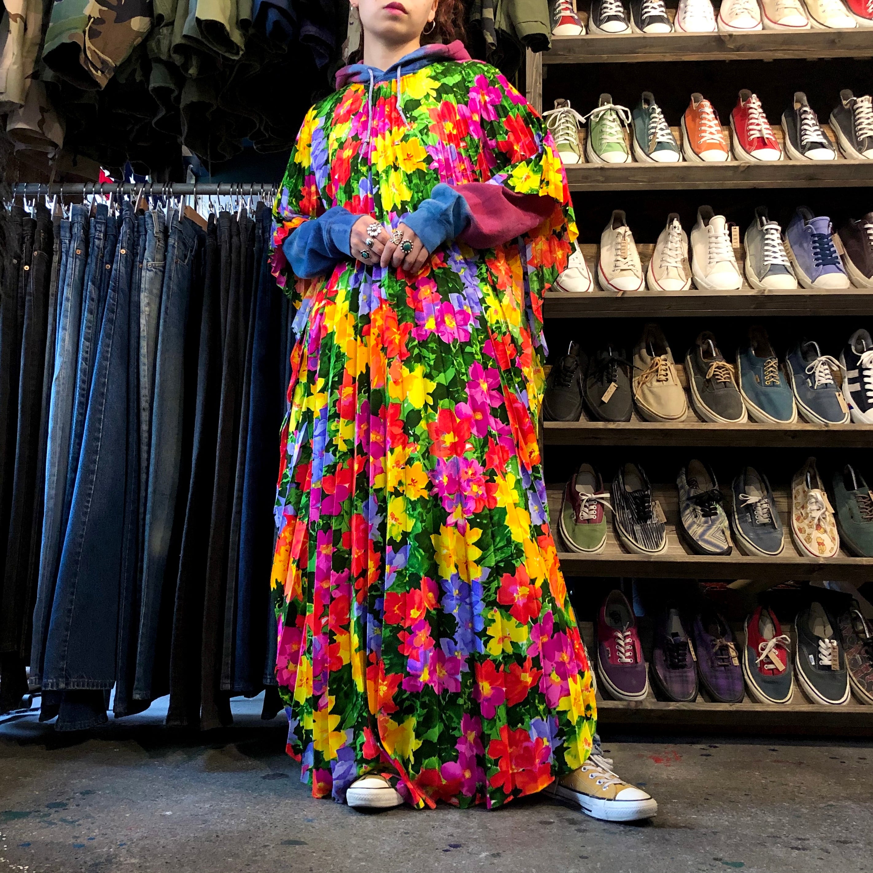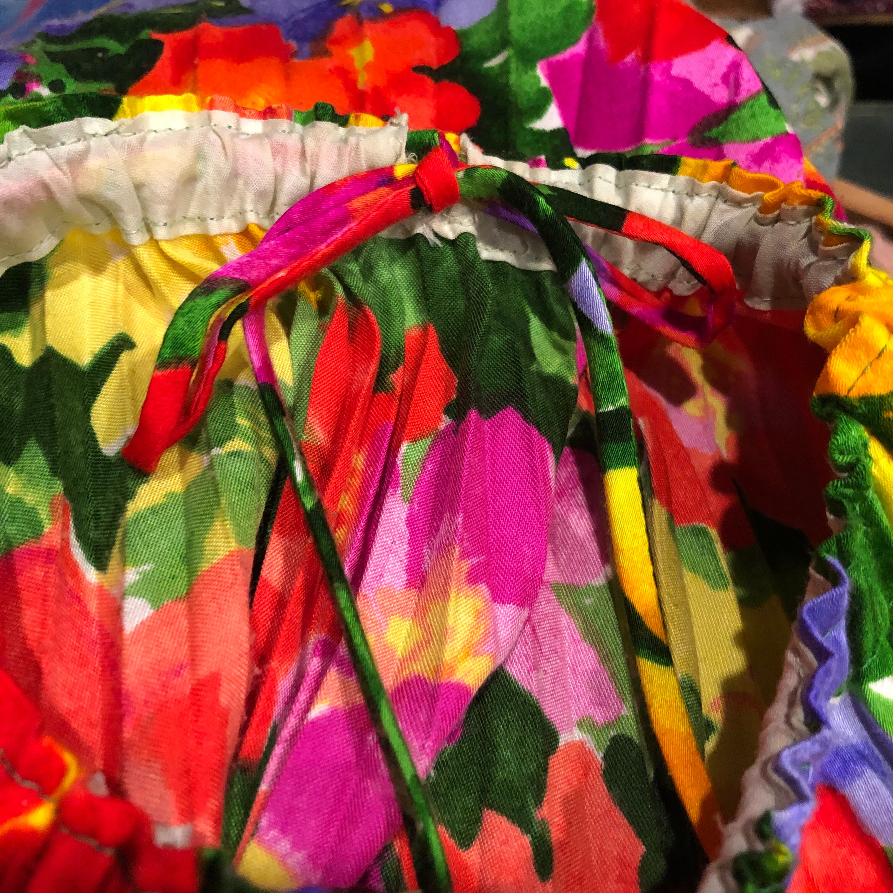 目が覚めるような鮮やかな花柄が素敵です。ポンチョのようなシルエットですが脇は縫われており、全体がプリーツになっているおもしろいデザインです。襟ぐりは紐で絞れるようになっています。着ているとハッピーになれる一着です!