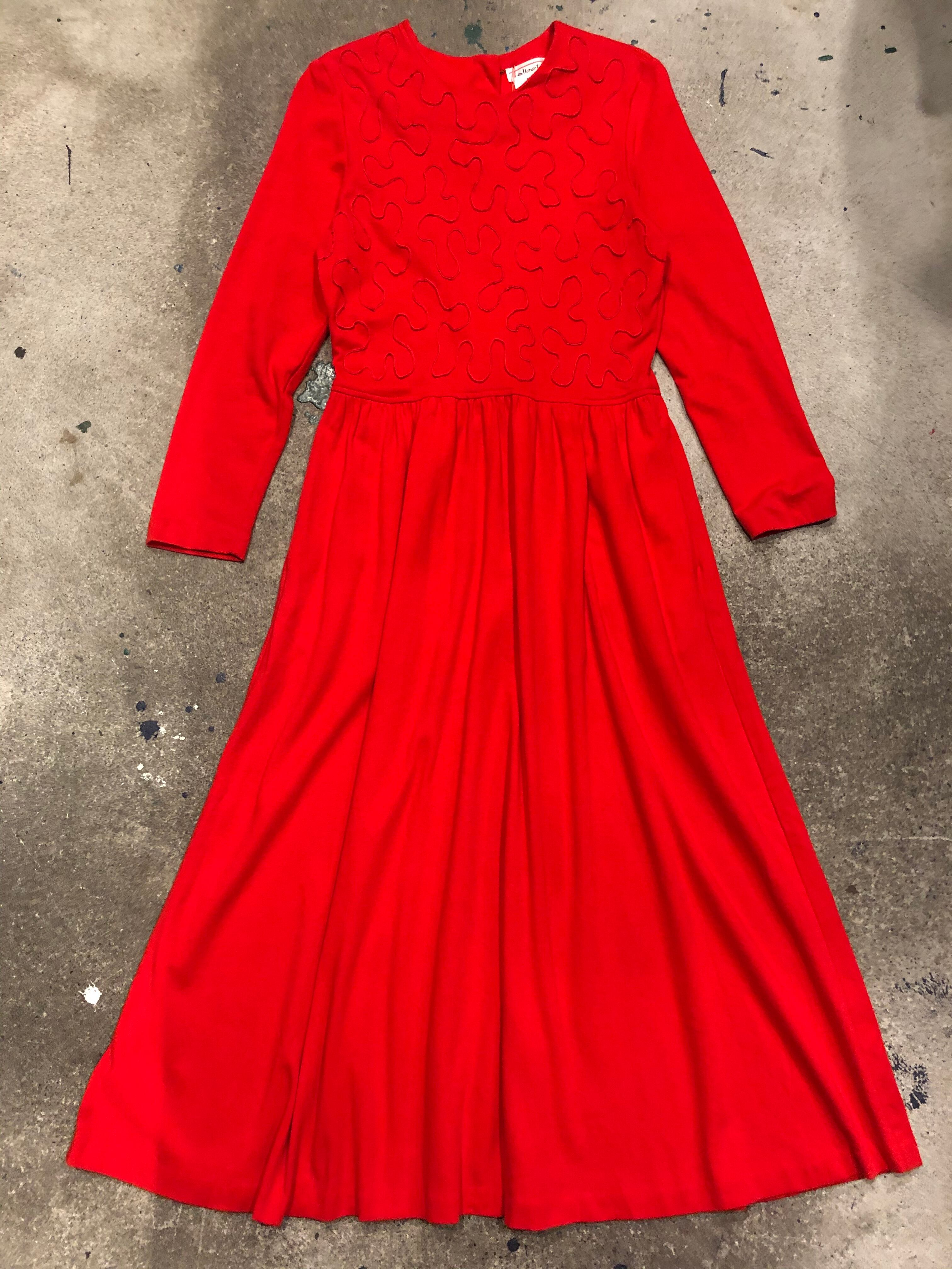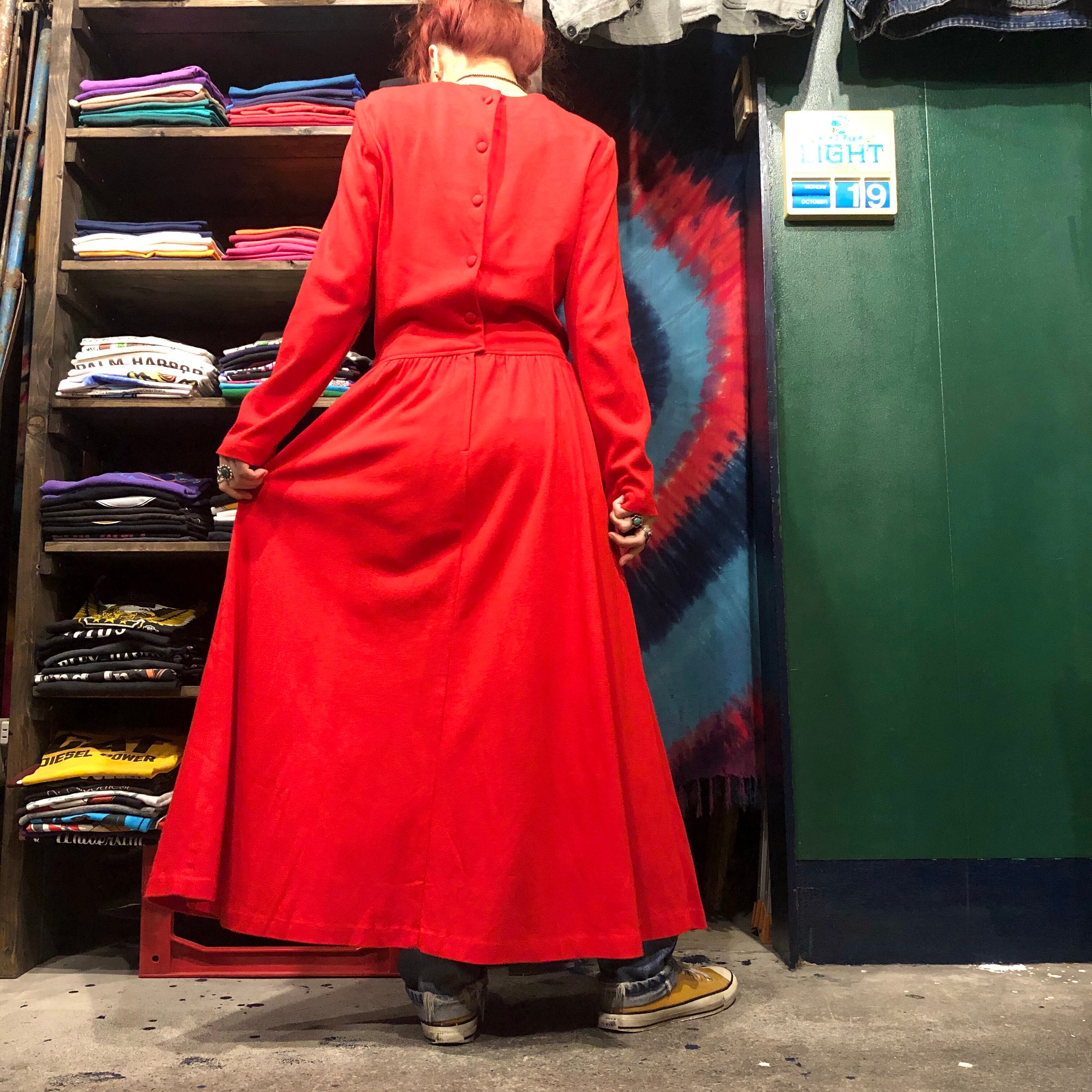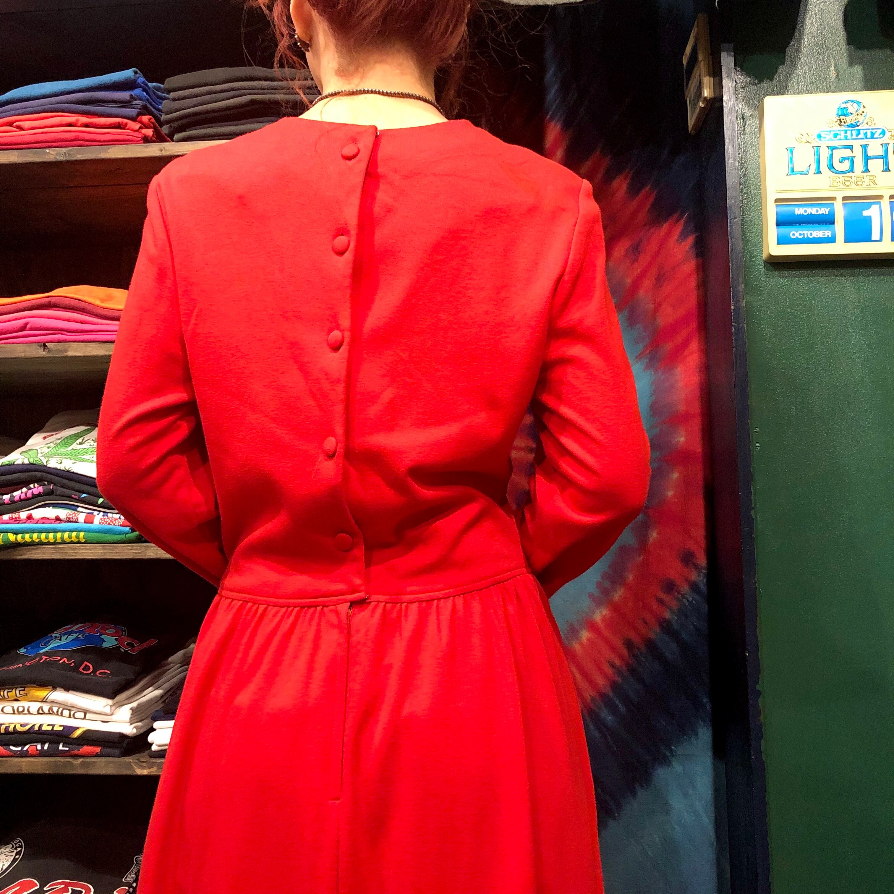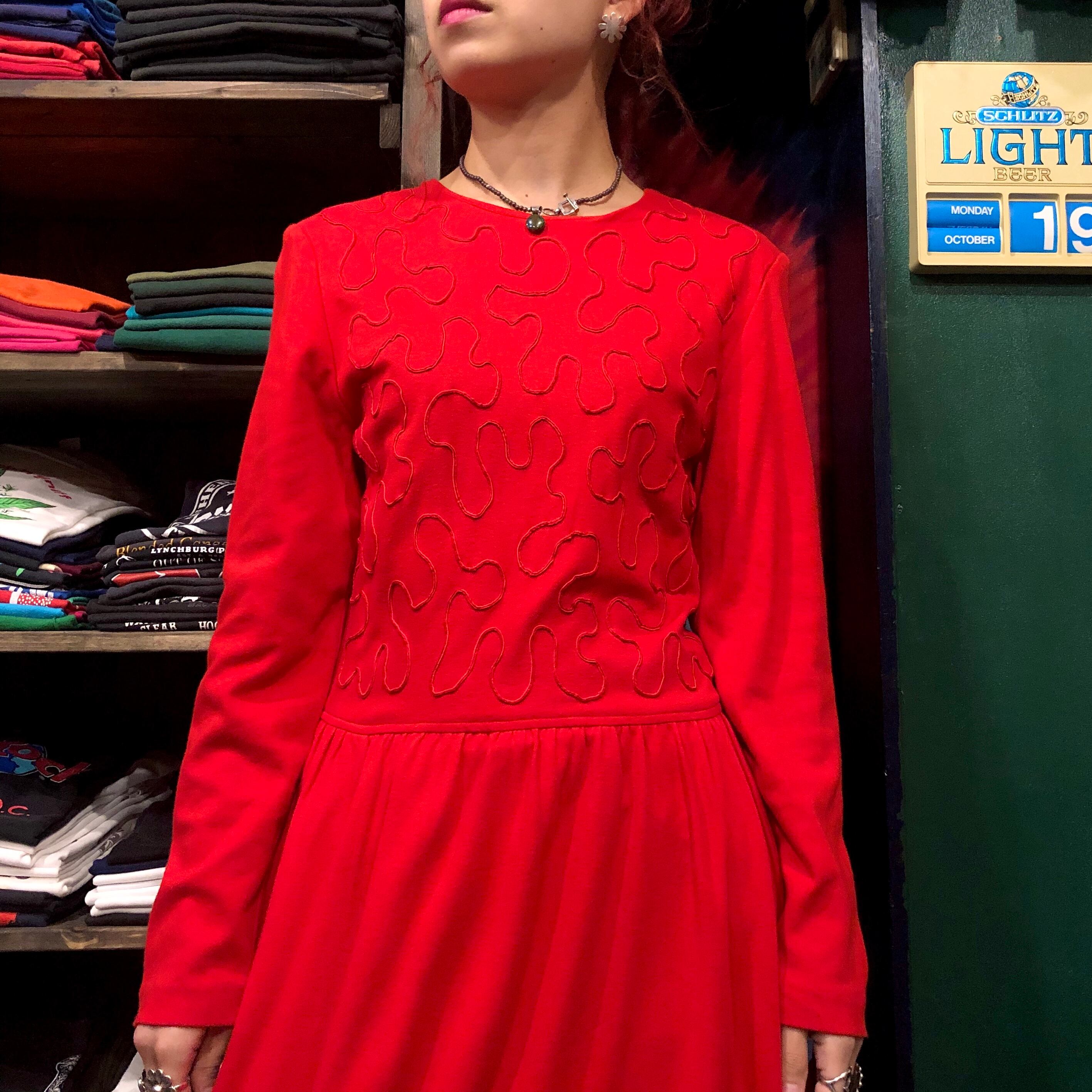 真っ赤なマキシ丈のワンピースです。厚手のTシャツのような伸縮性のある素材で動きやすく着ていて楽です。前身頃のコード刺繍がポイントになっていてかわいいです。