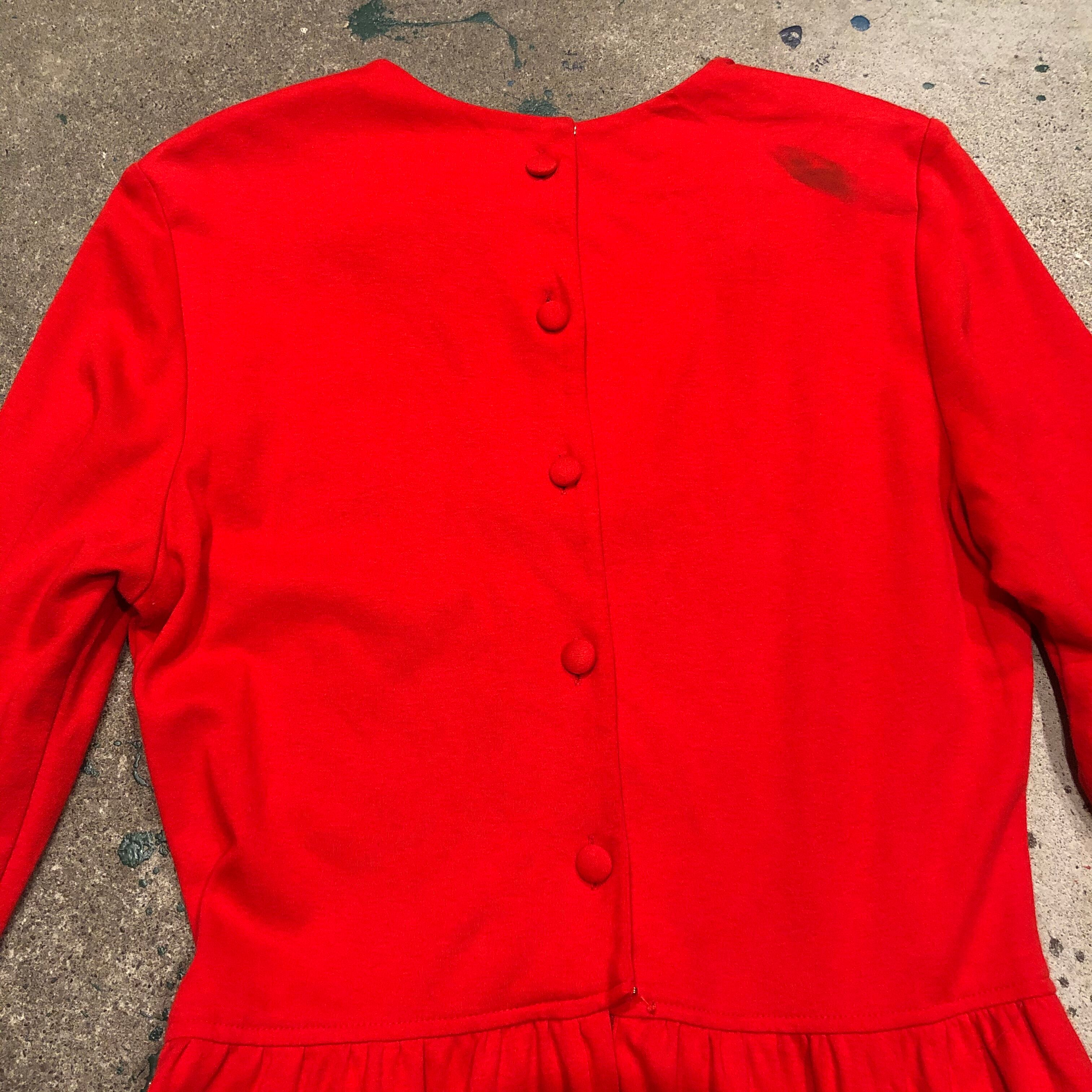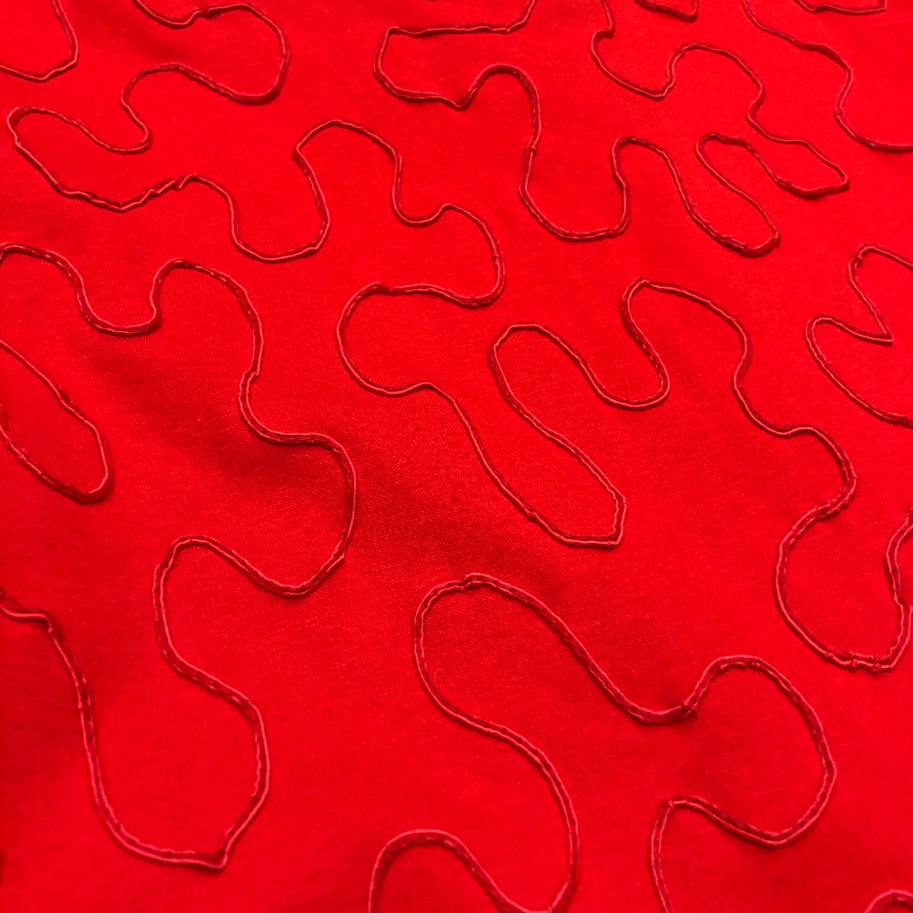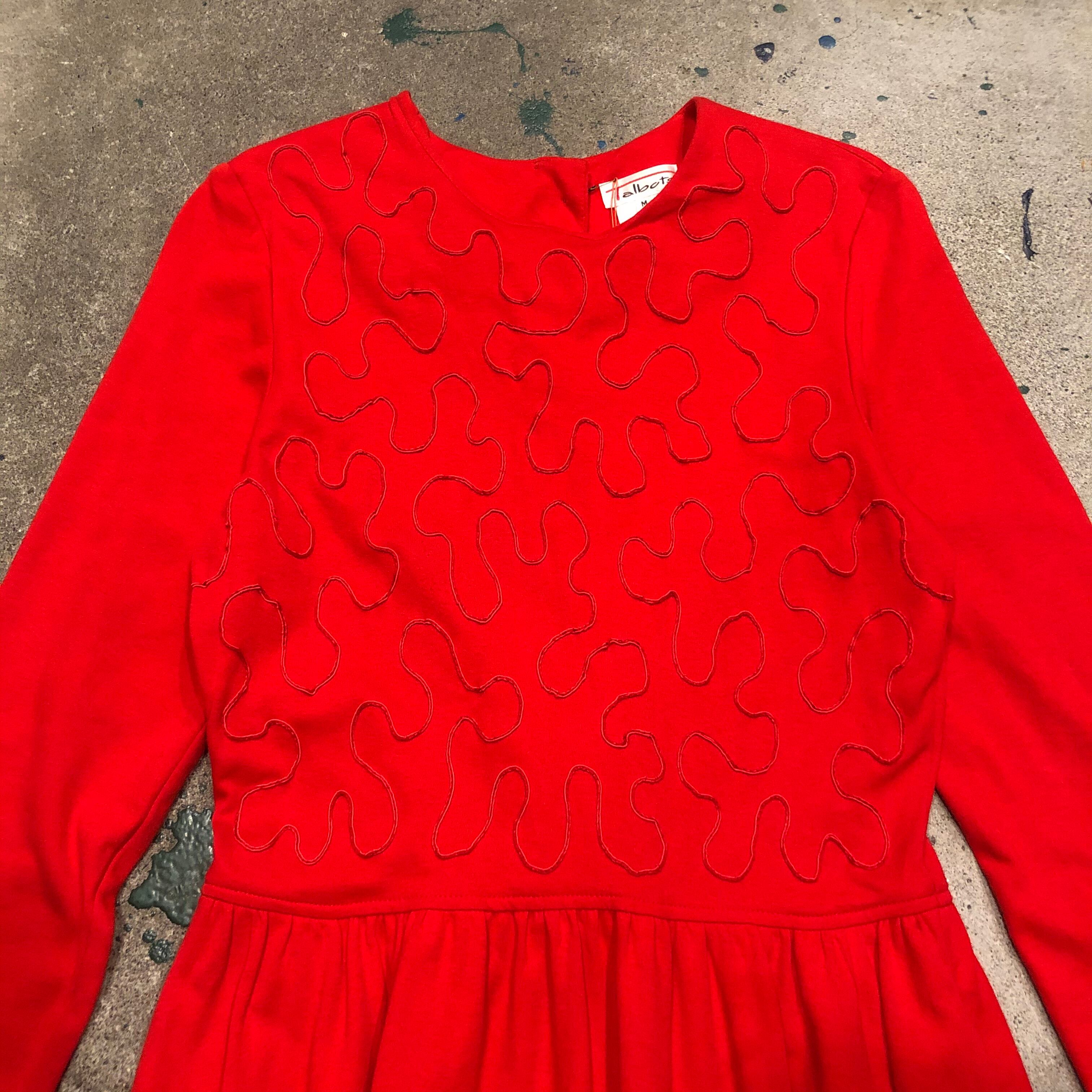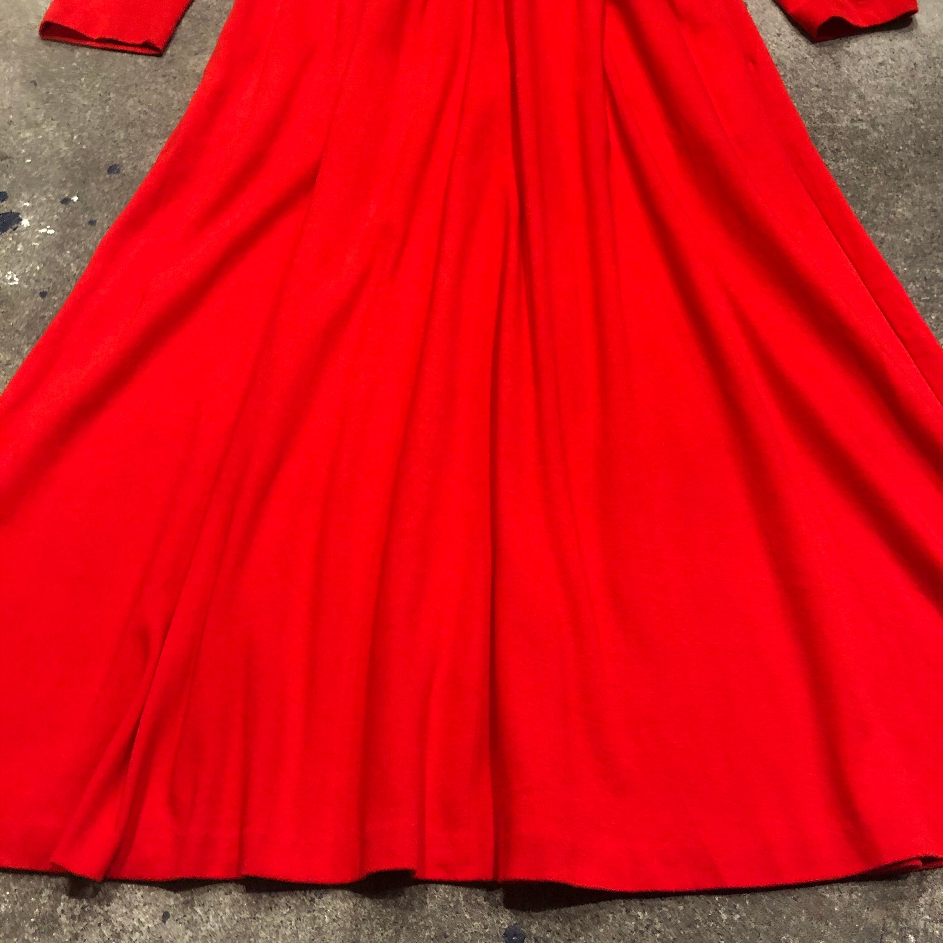 真っ赤なマキシ丈のワンピースです。厚手のTシャツのような伸縮性のある素材で動きやすく着ていて楽です。前身頃のコード刺繍がポイントになっていてかわいいです。
