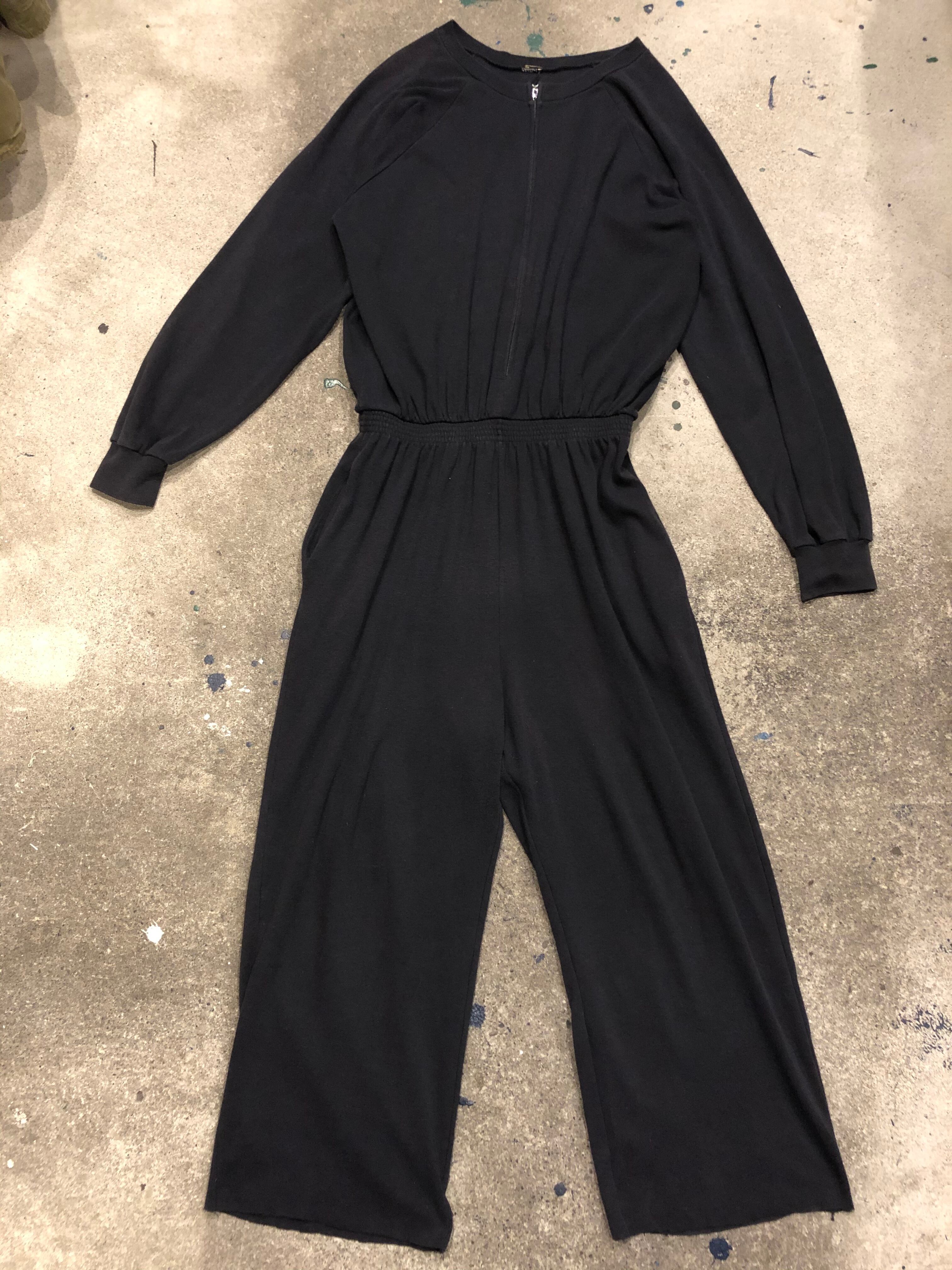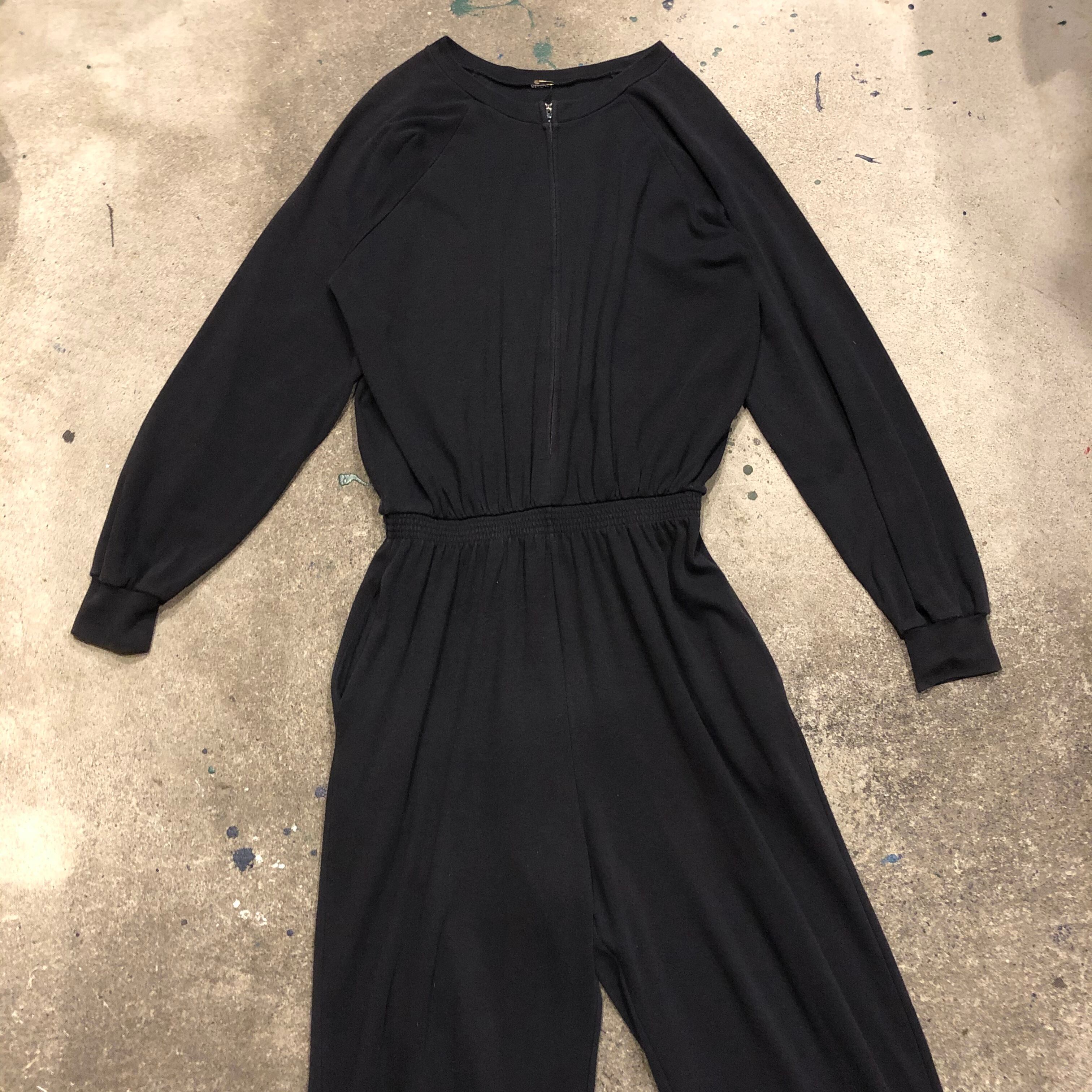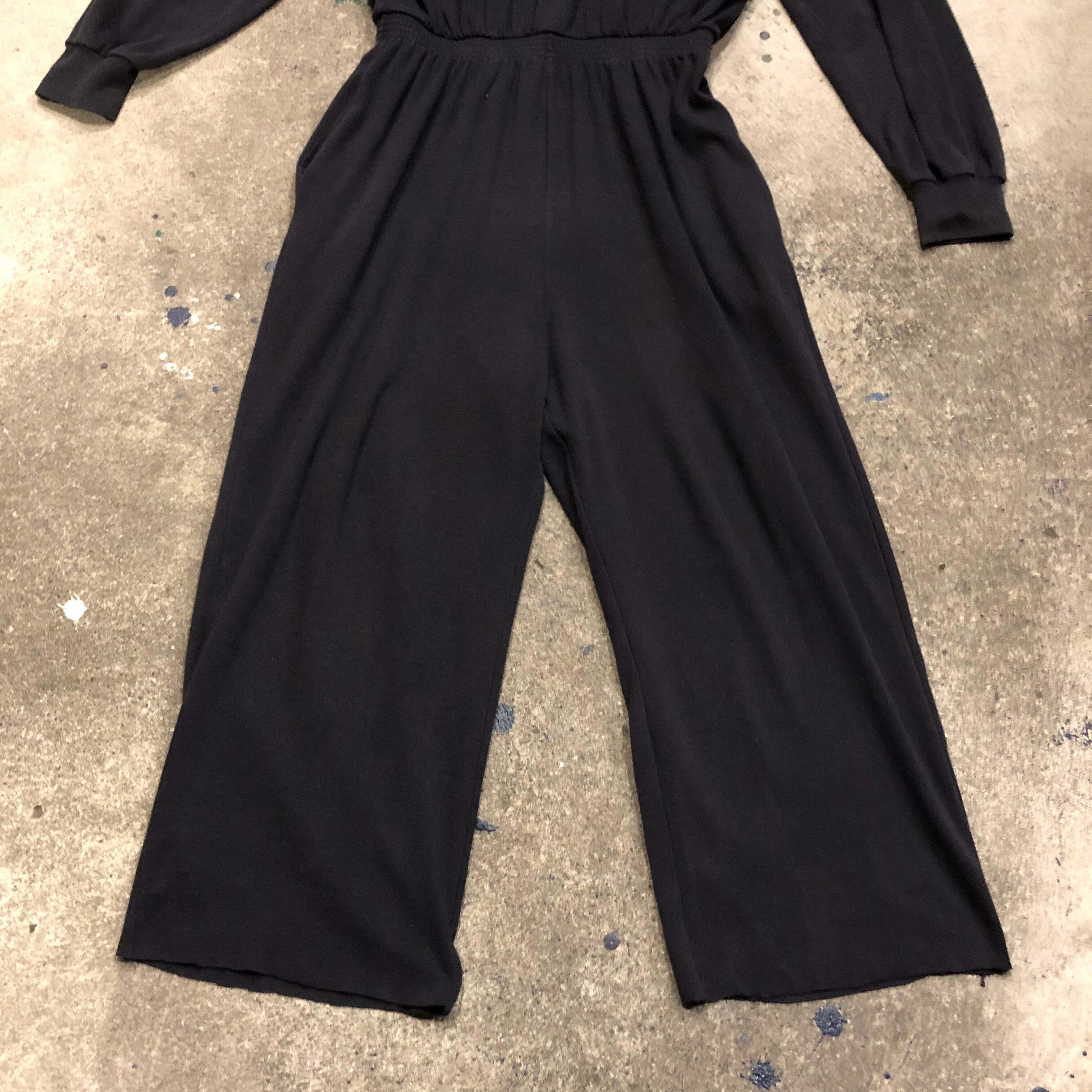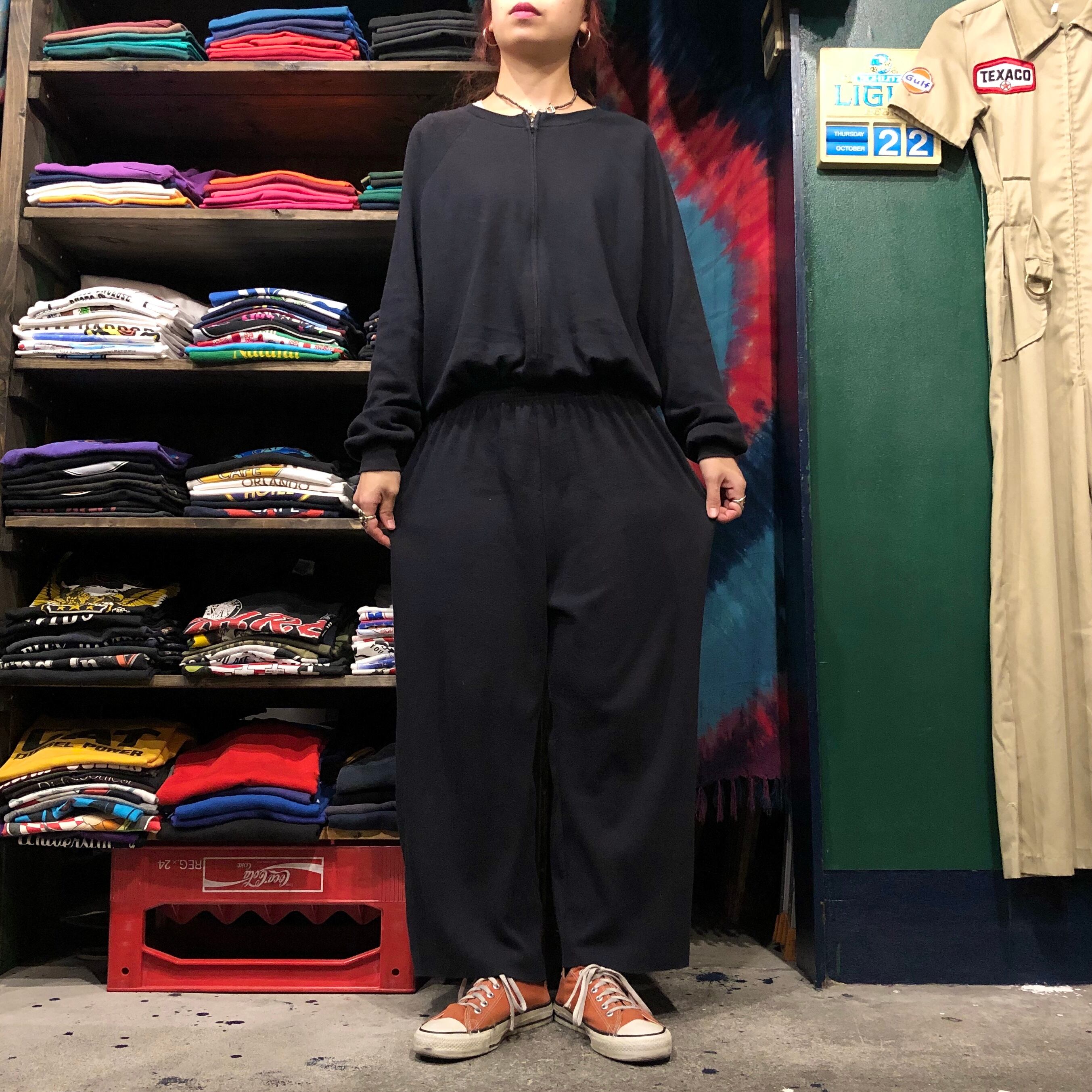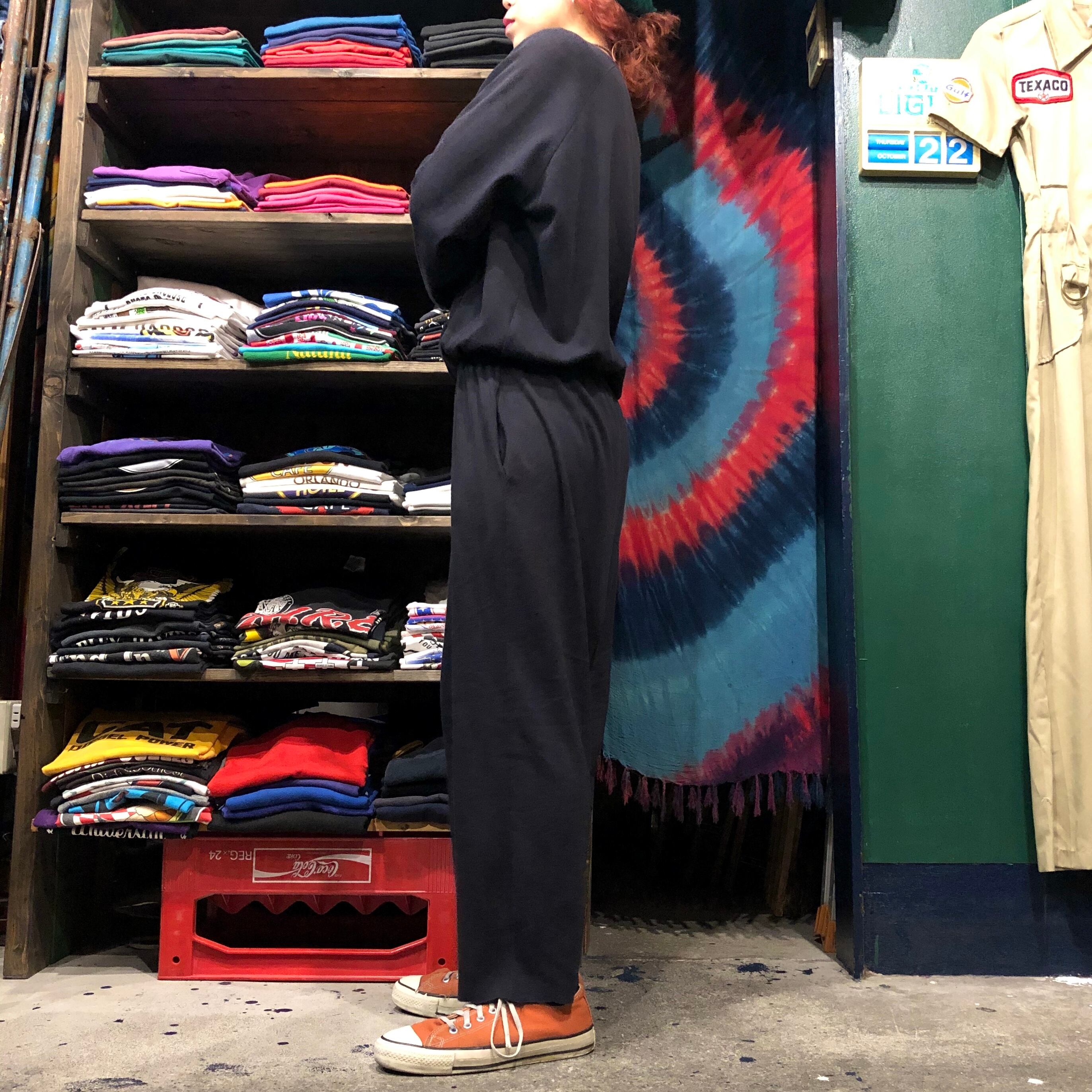 ゆったり大きめな真っ黒のジャンプスーツです。Tシャツのような伸縮性のある素材でとにかく楽です。ウエストにゴムが入っておりブラウジングして着ても、腰に落として着ても良いですね!