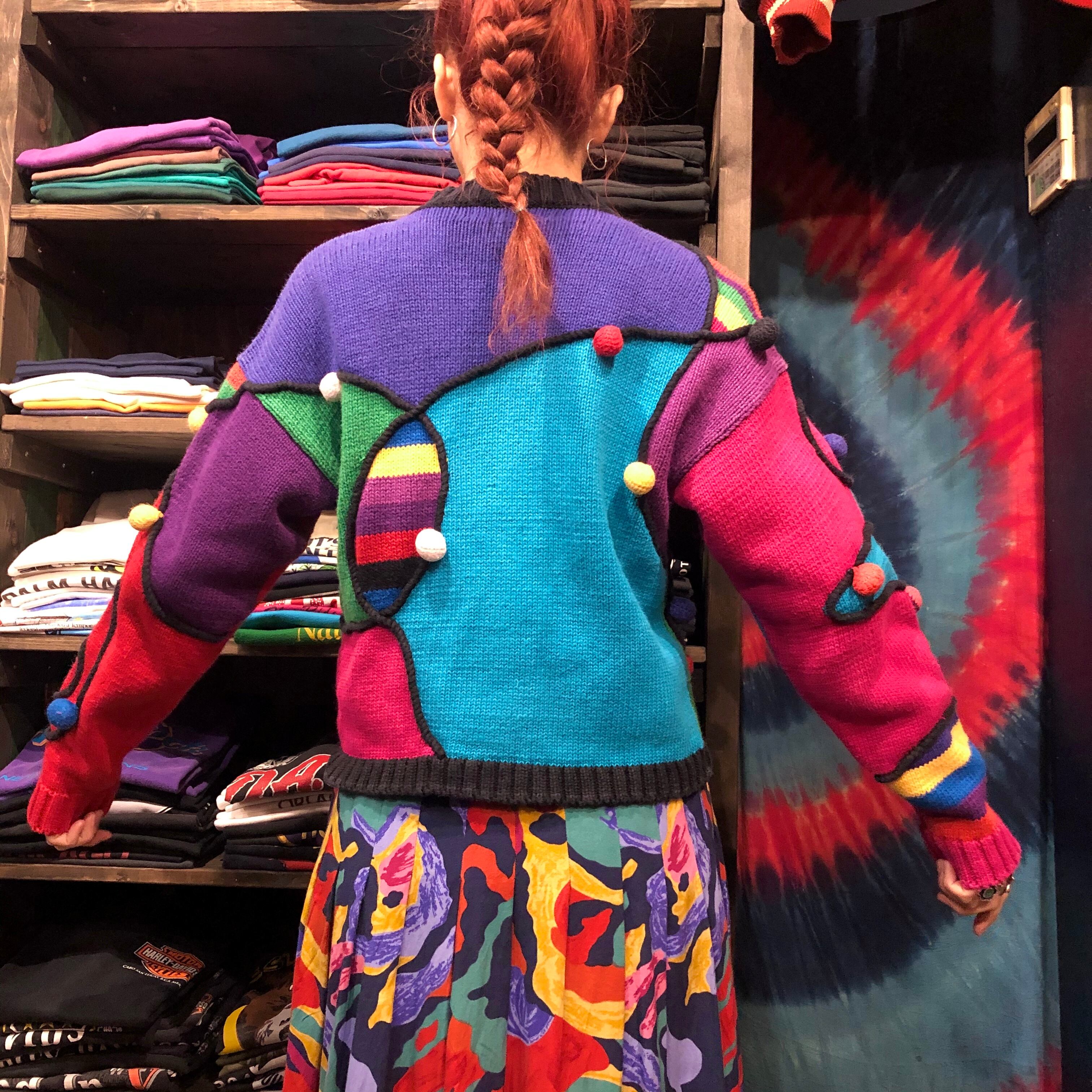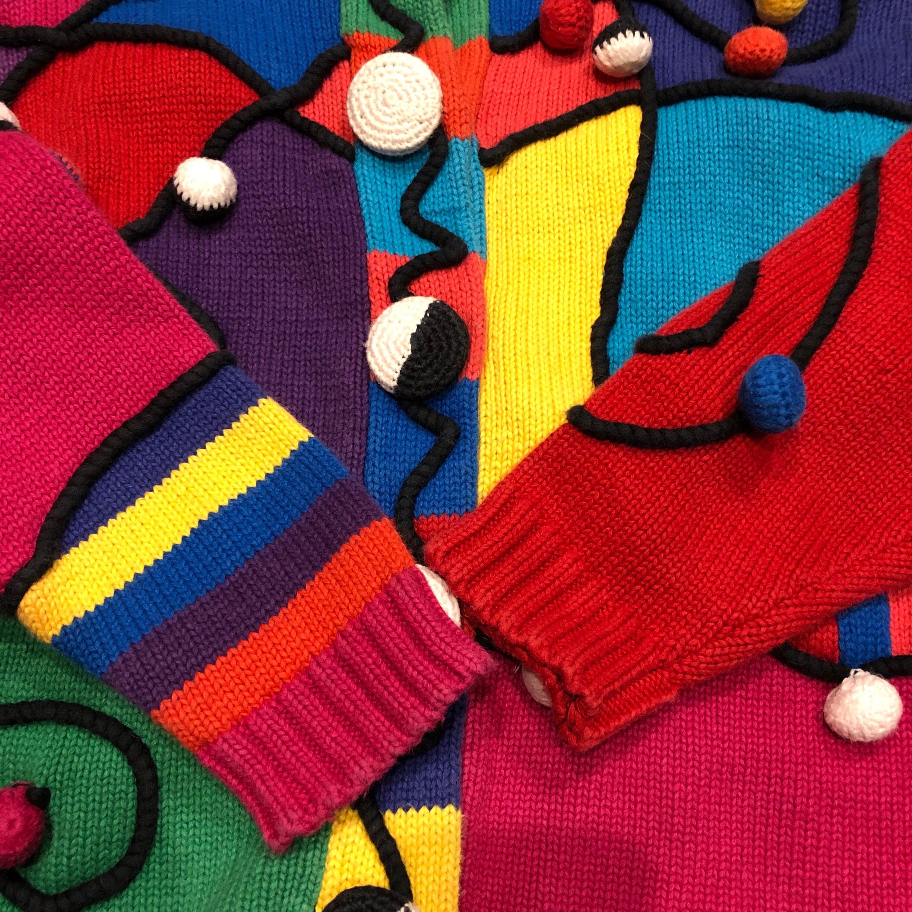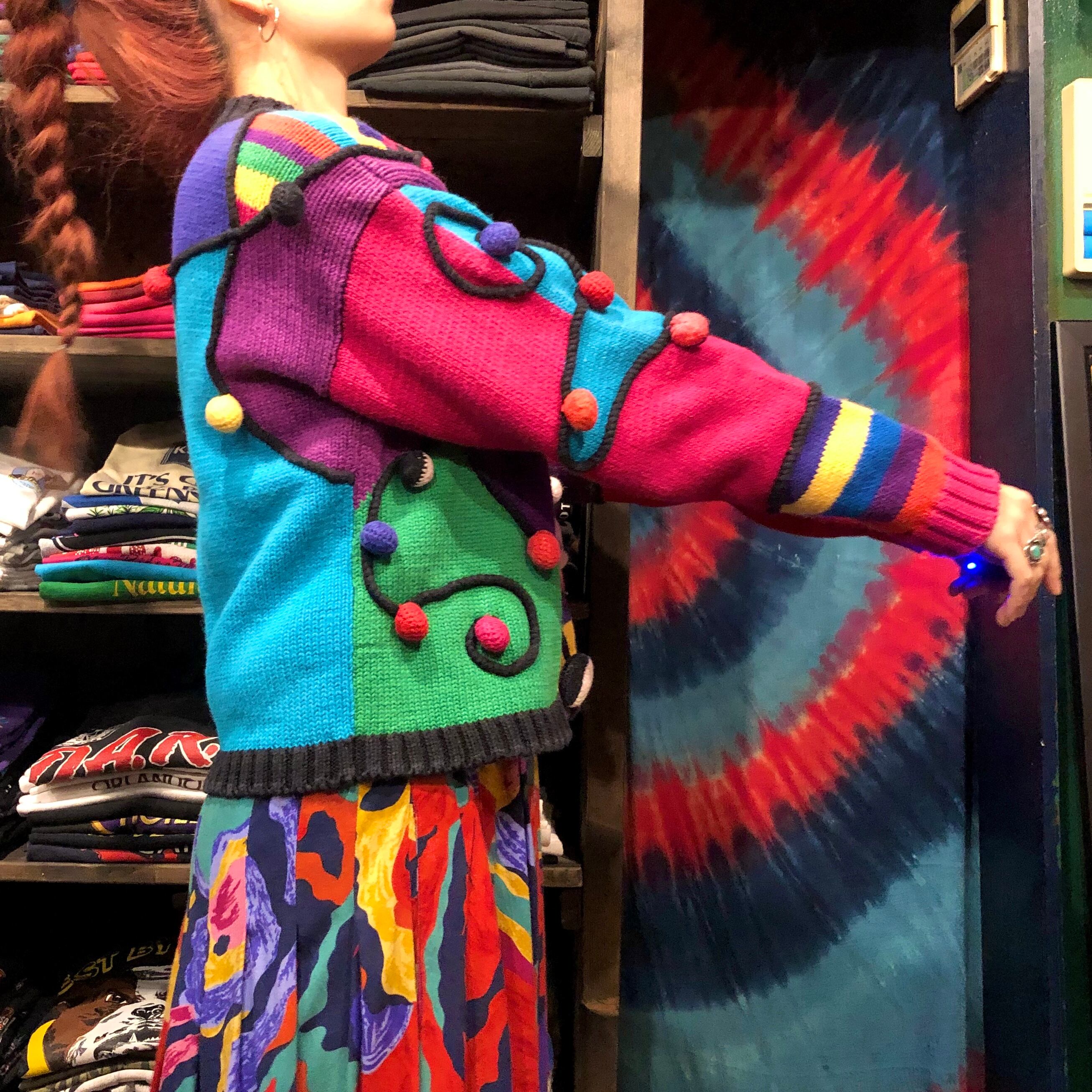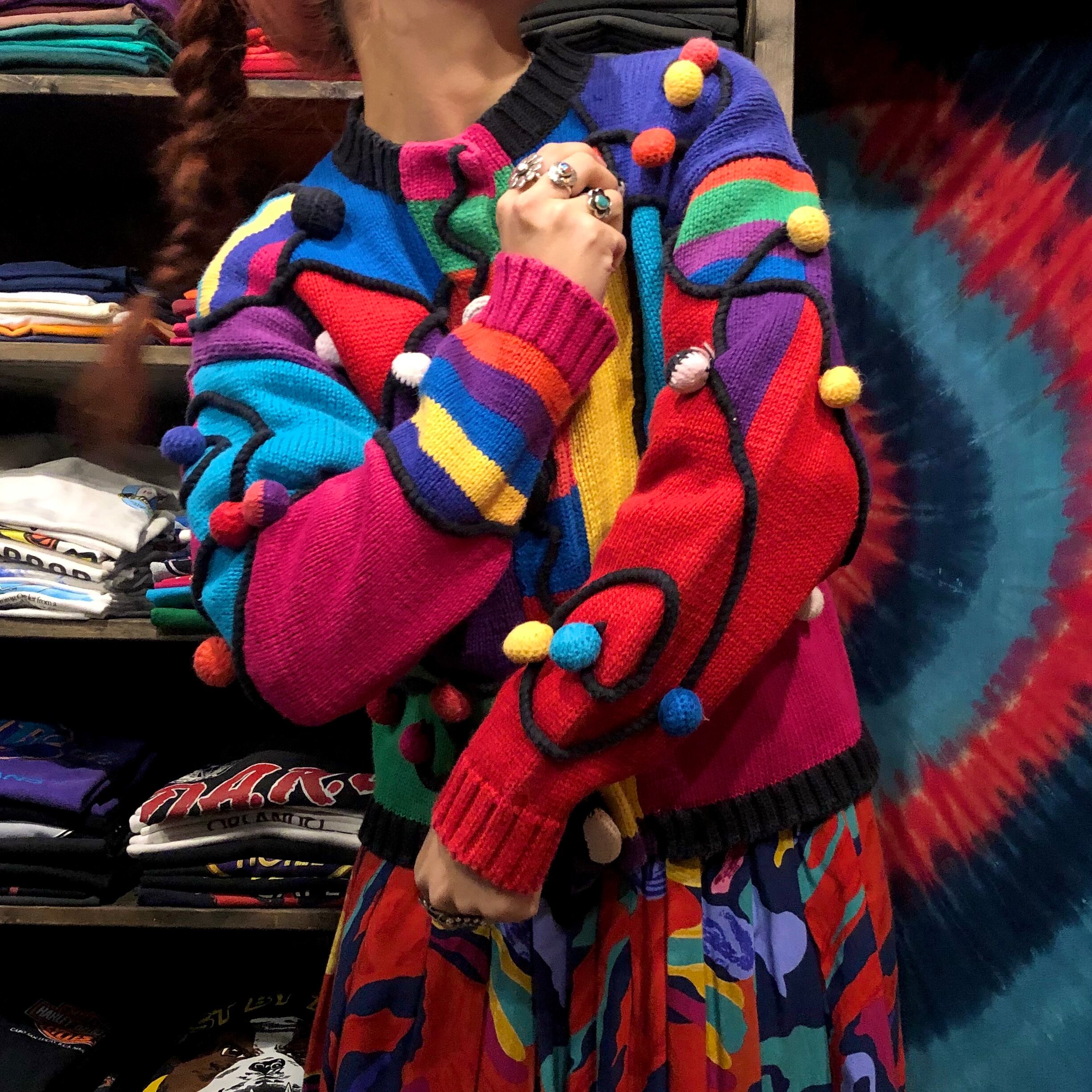 しっかりしたポンポンがいたるところについていたり、うねうねで仕切られた中がボーダーになっていたり絵に描いたようなポップさが良いですね。変な髪型にして遊んで着たい一着です。