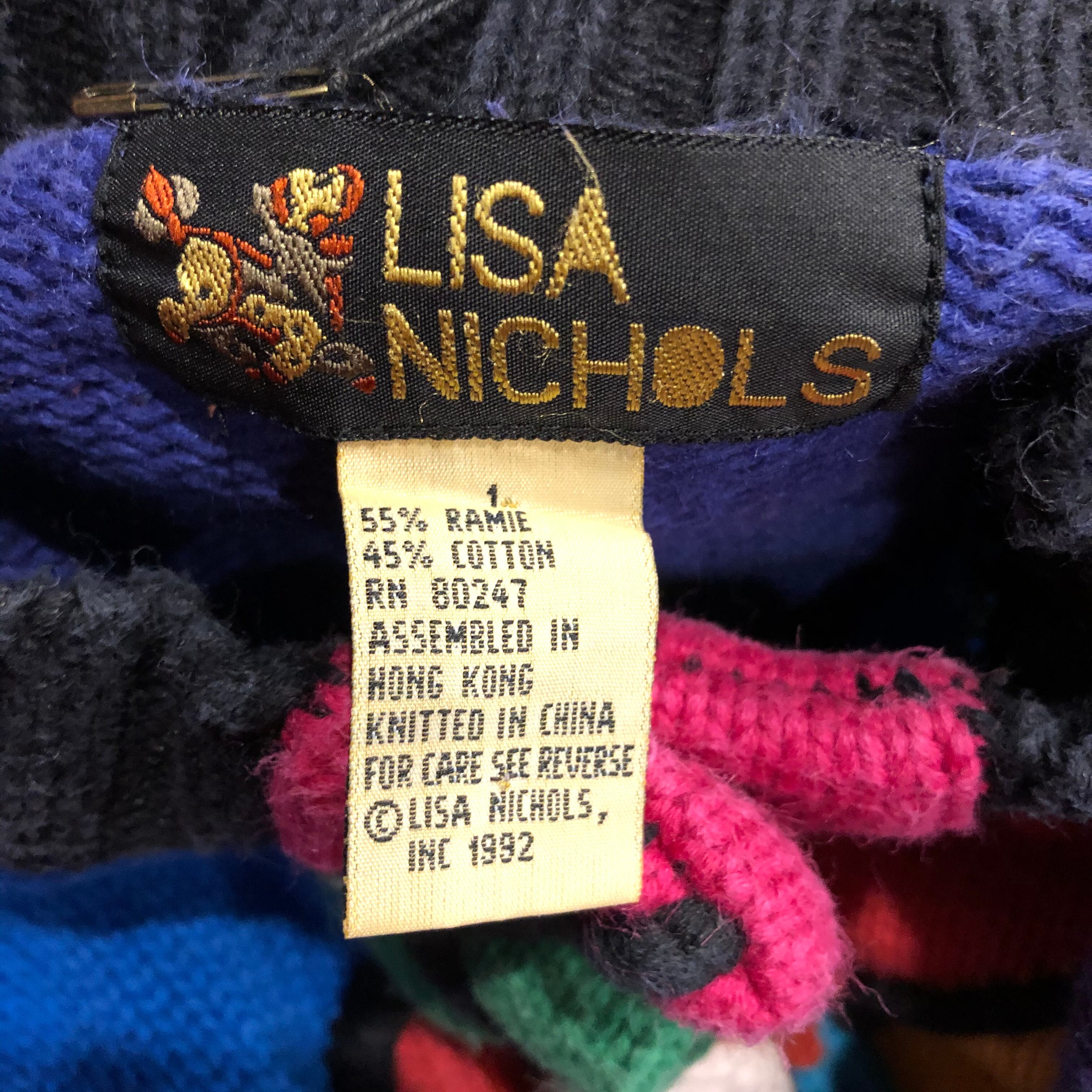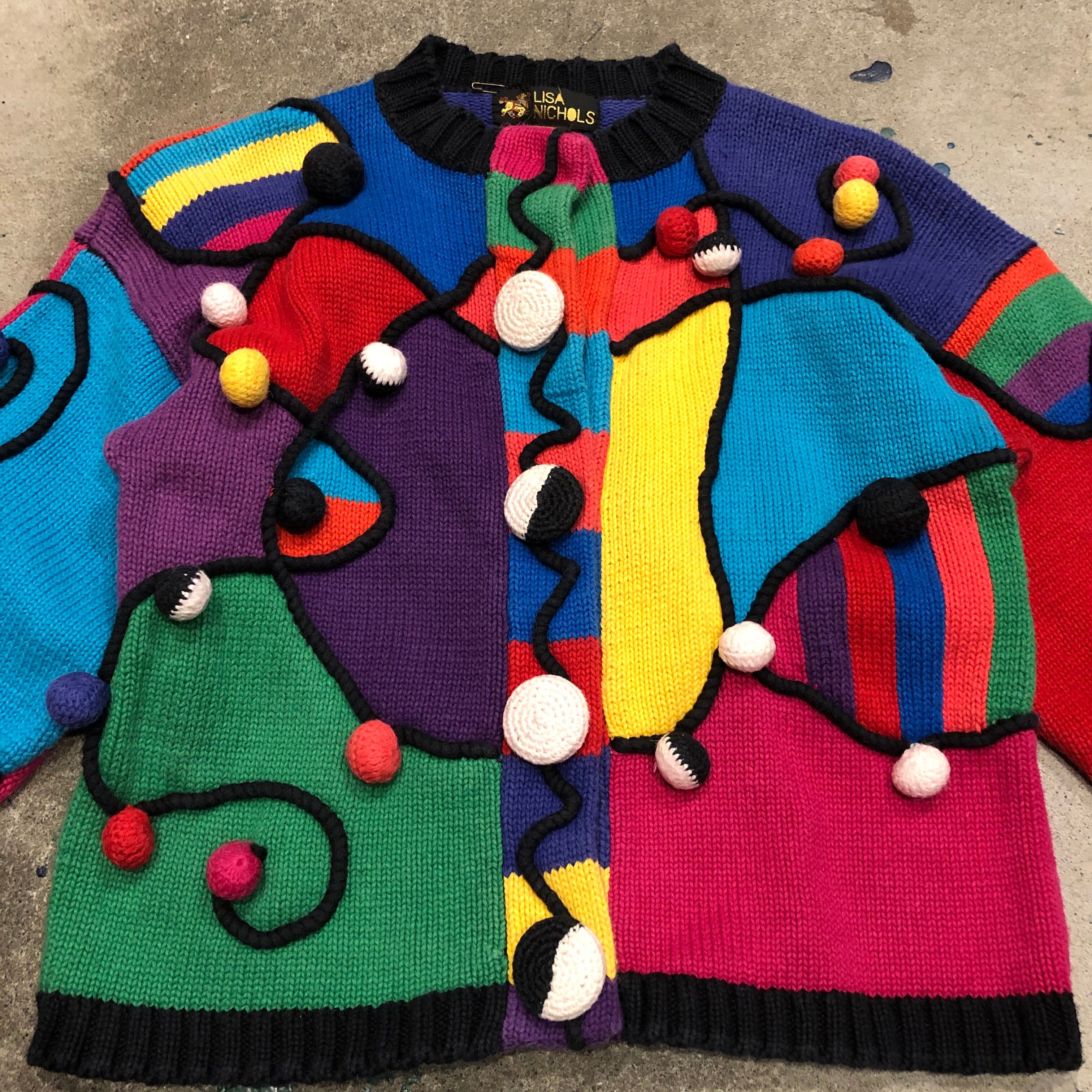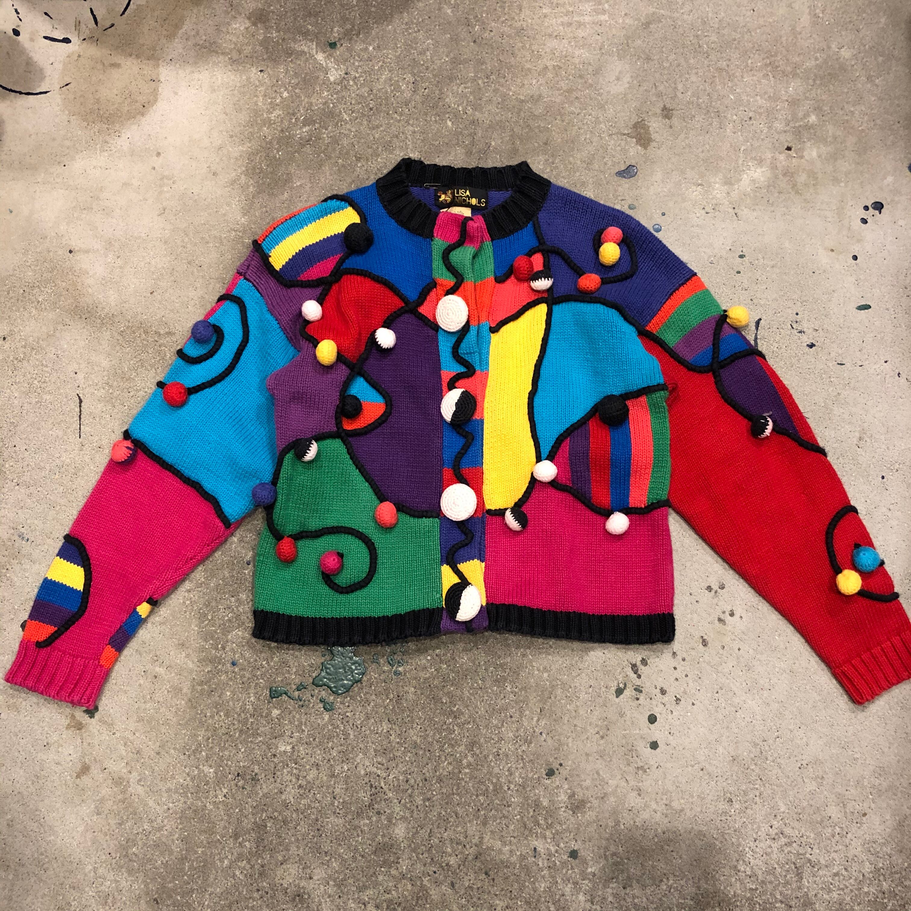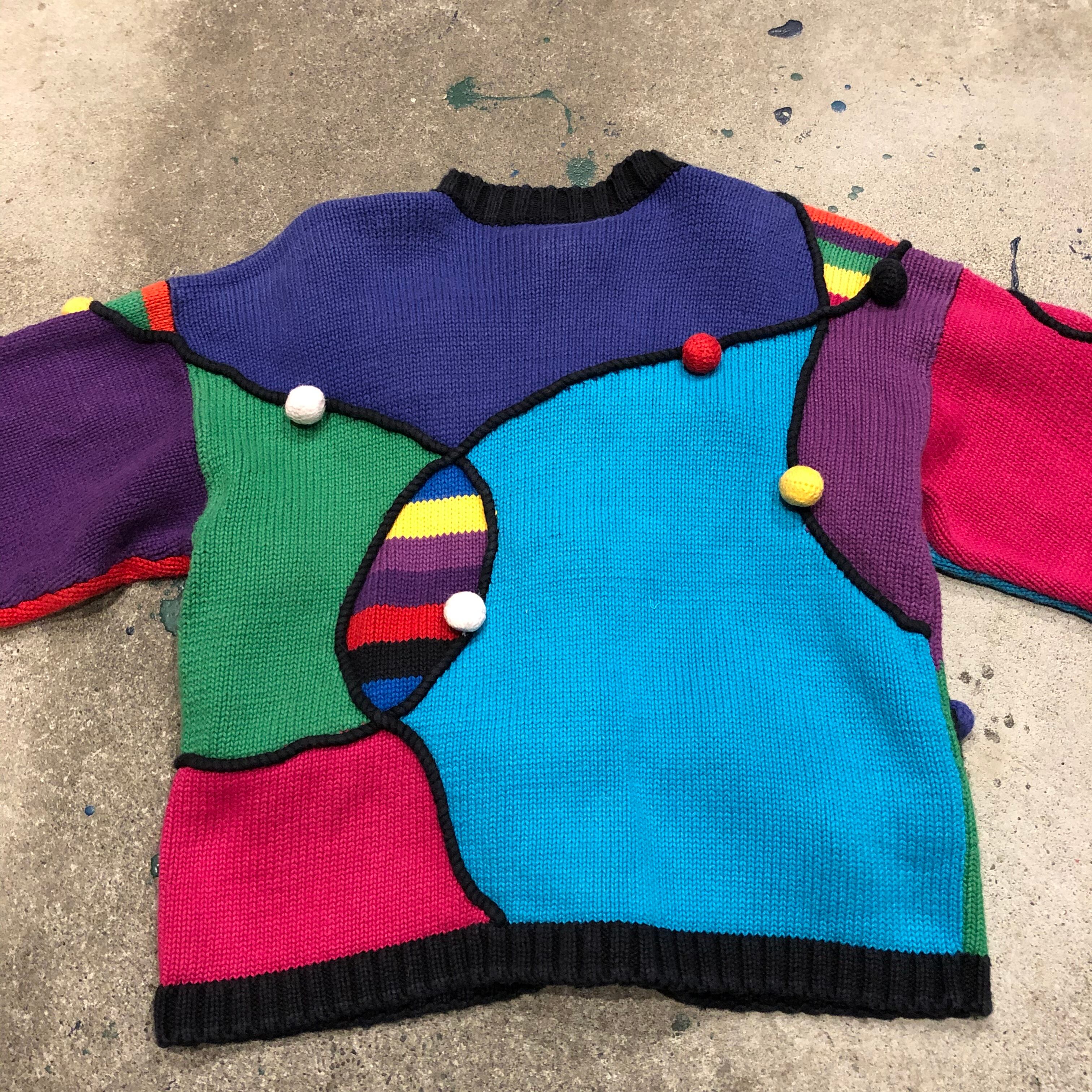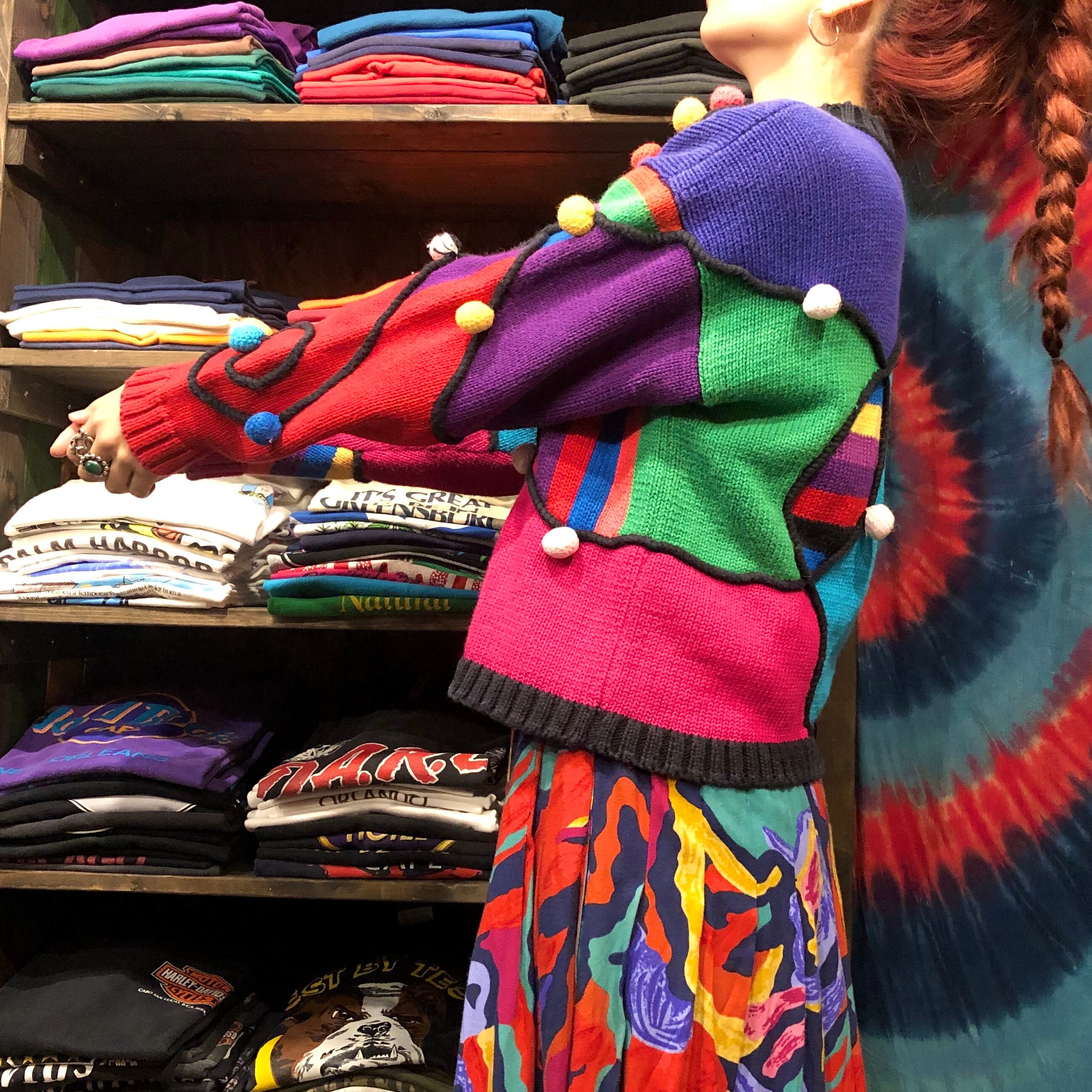 しっかりしたポンポンがいたるところについていたり、うねうねで仕切られた中がボーダーになっていたり絵に描いたようなポップさが良いですね。変な髪型にして遊んで着たい一着です。