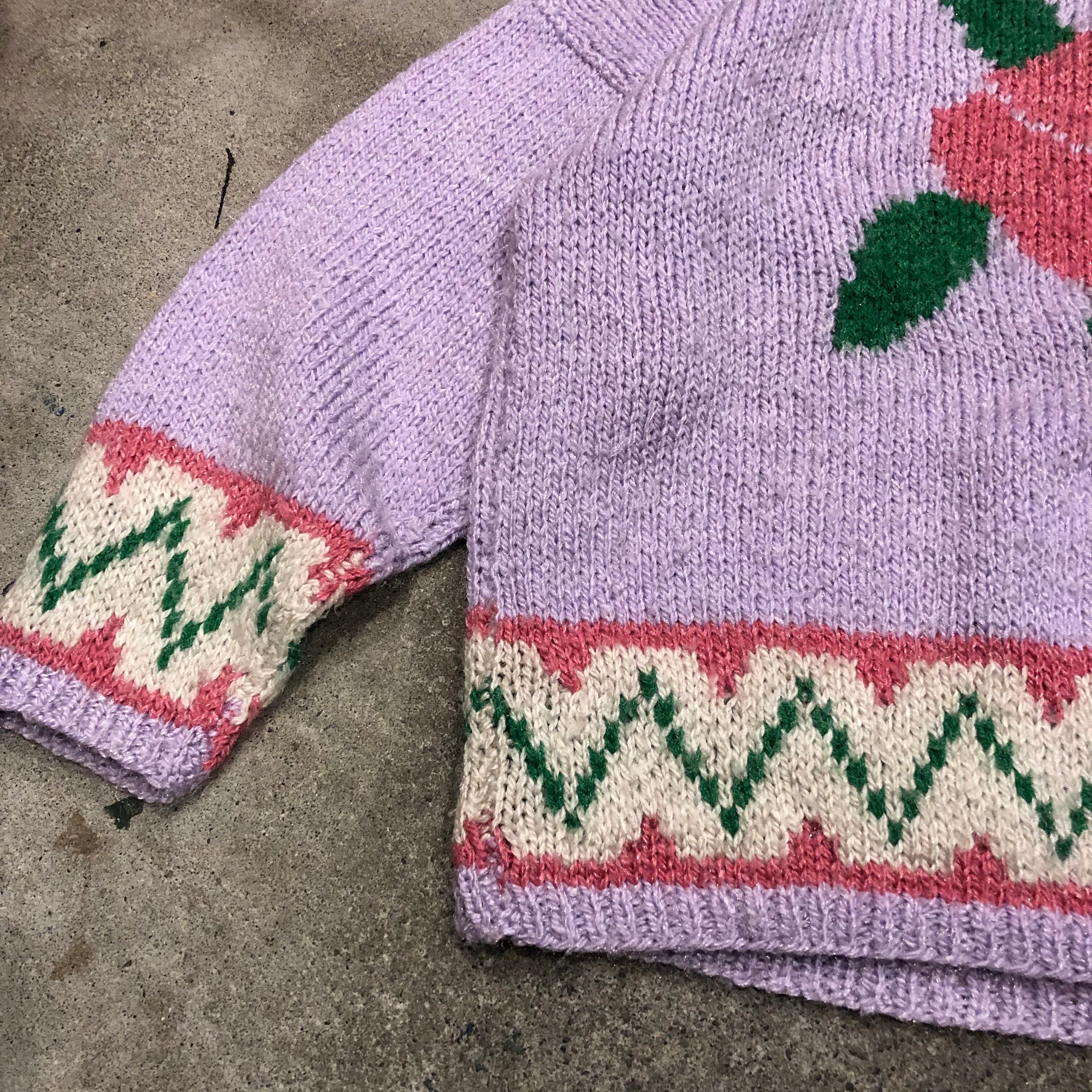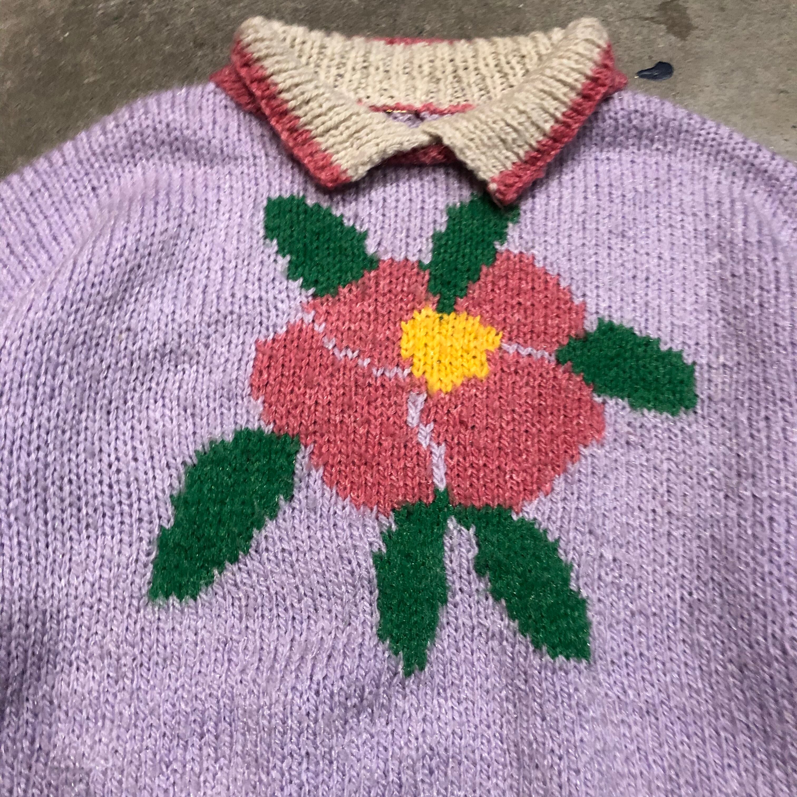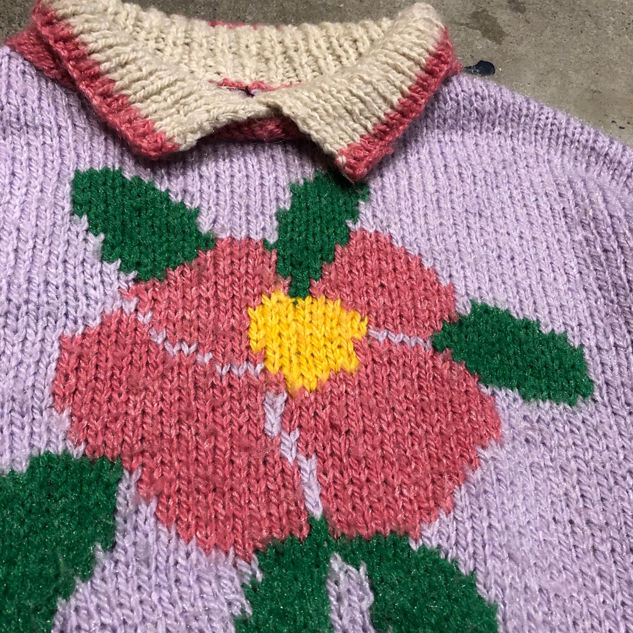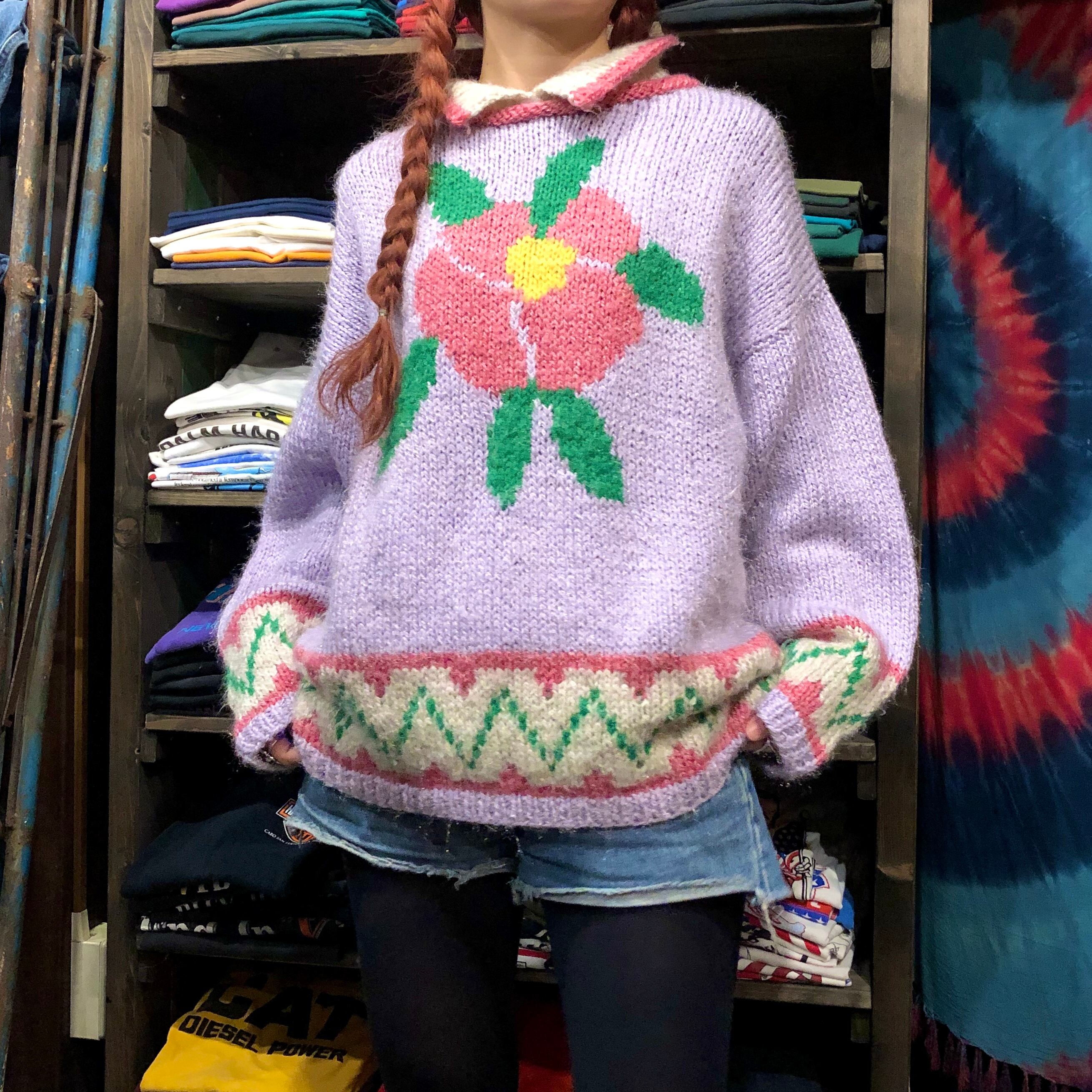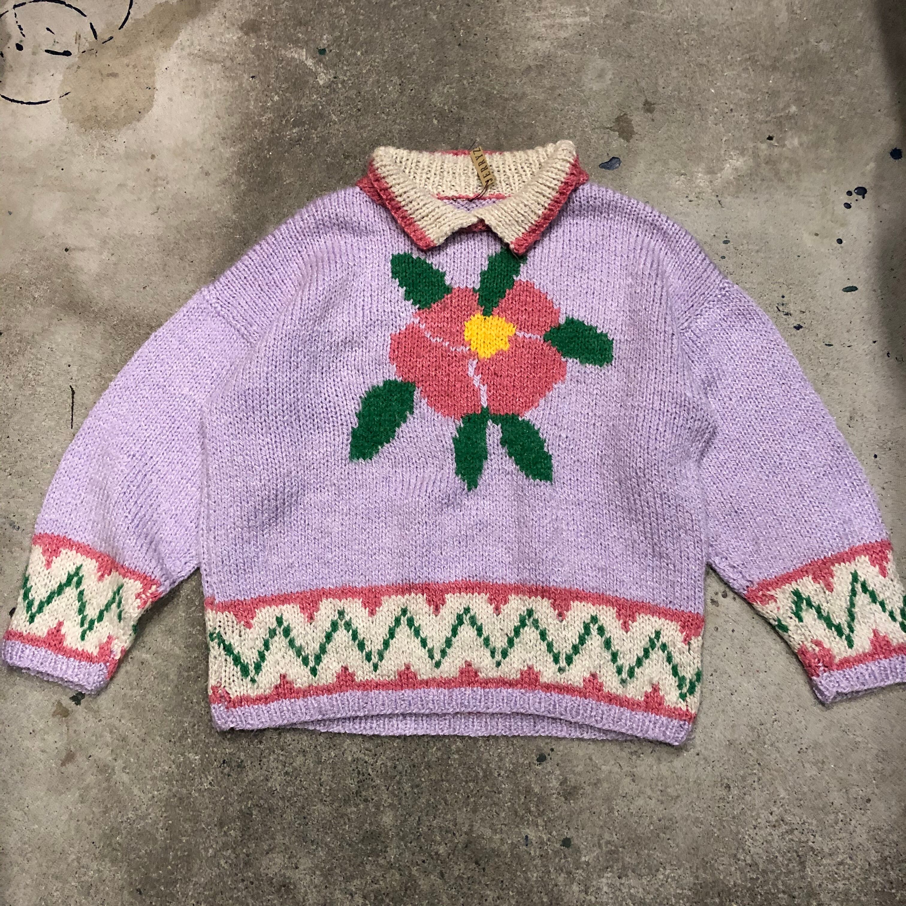 真ん中にでーんとかわいいお花が印象的なニットです。襟がついていたり袖がぽわんとボリューミーで女の子らしいシルエットです。