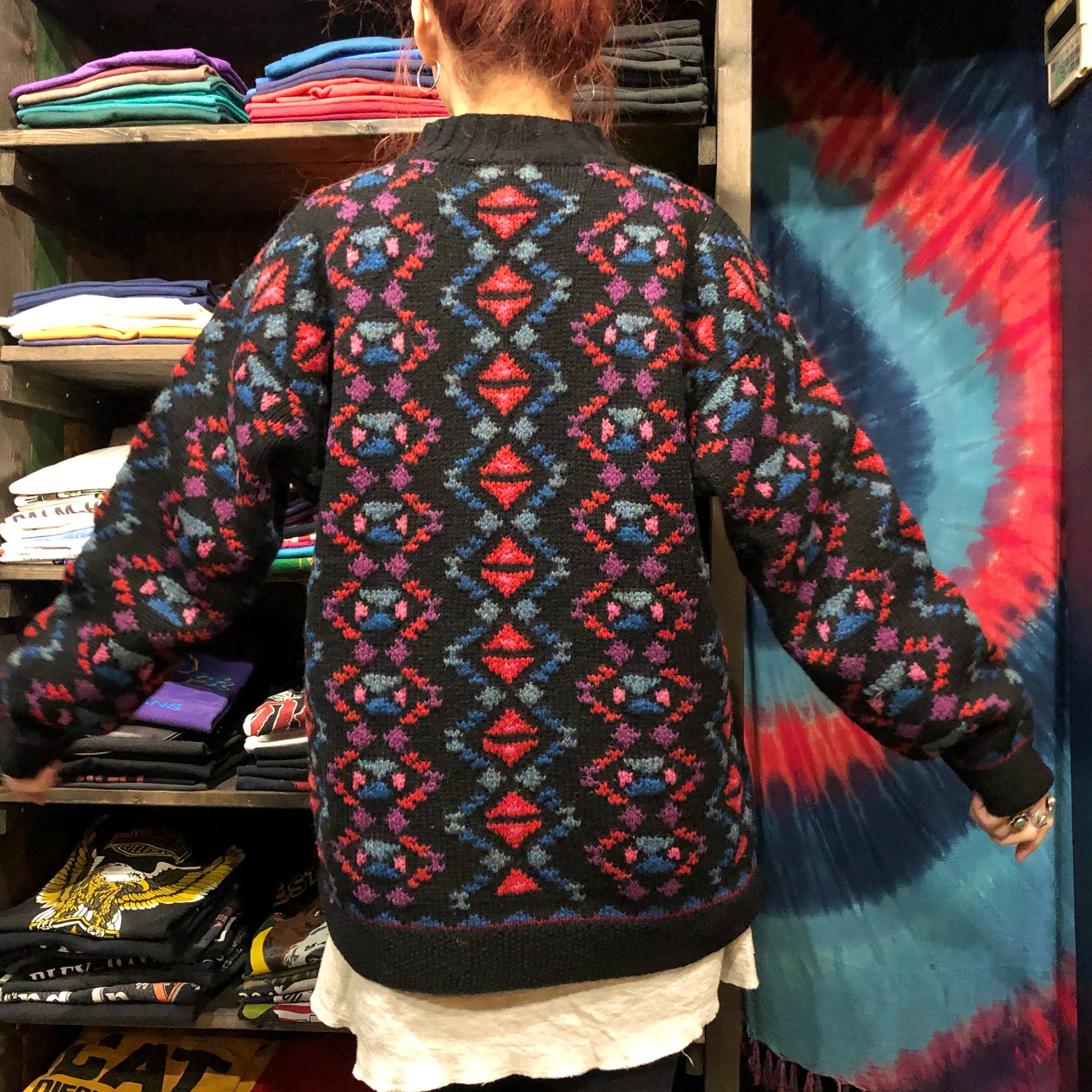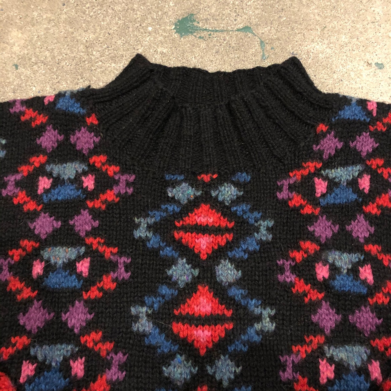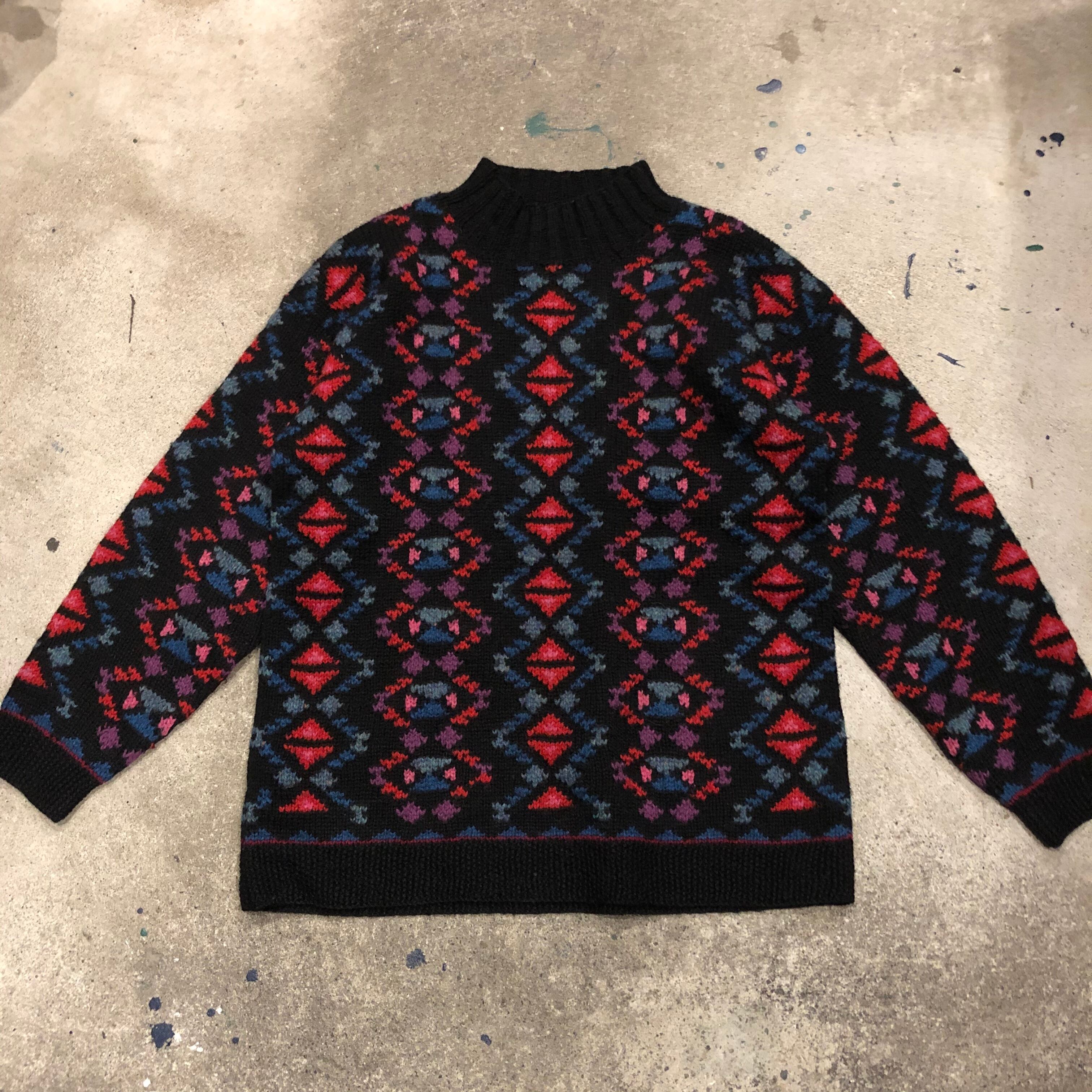 黒ベースに良い感じの配色で柄が編まれているニットです。