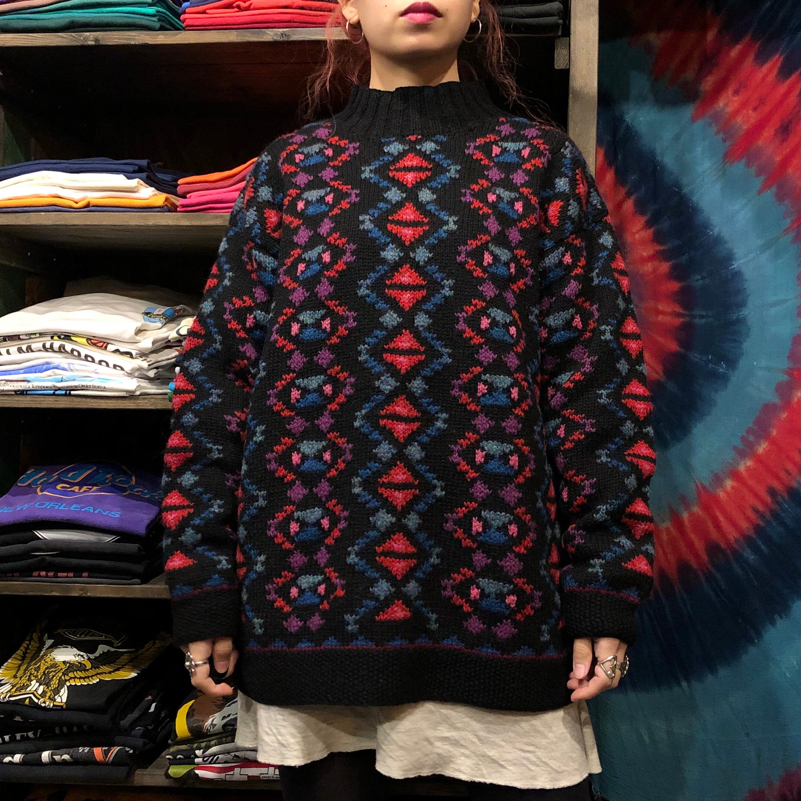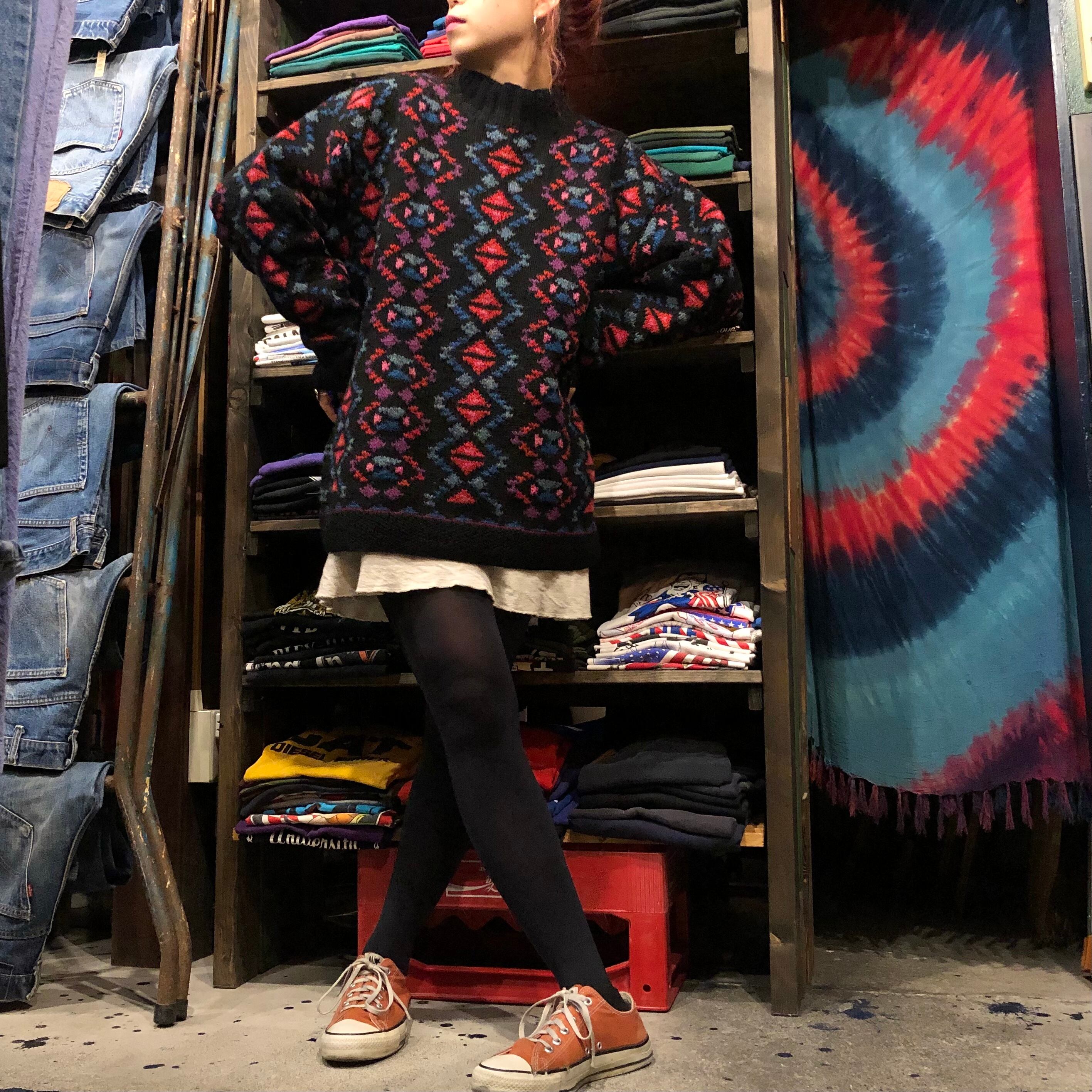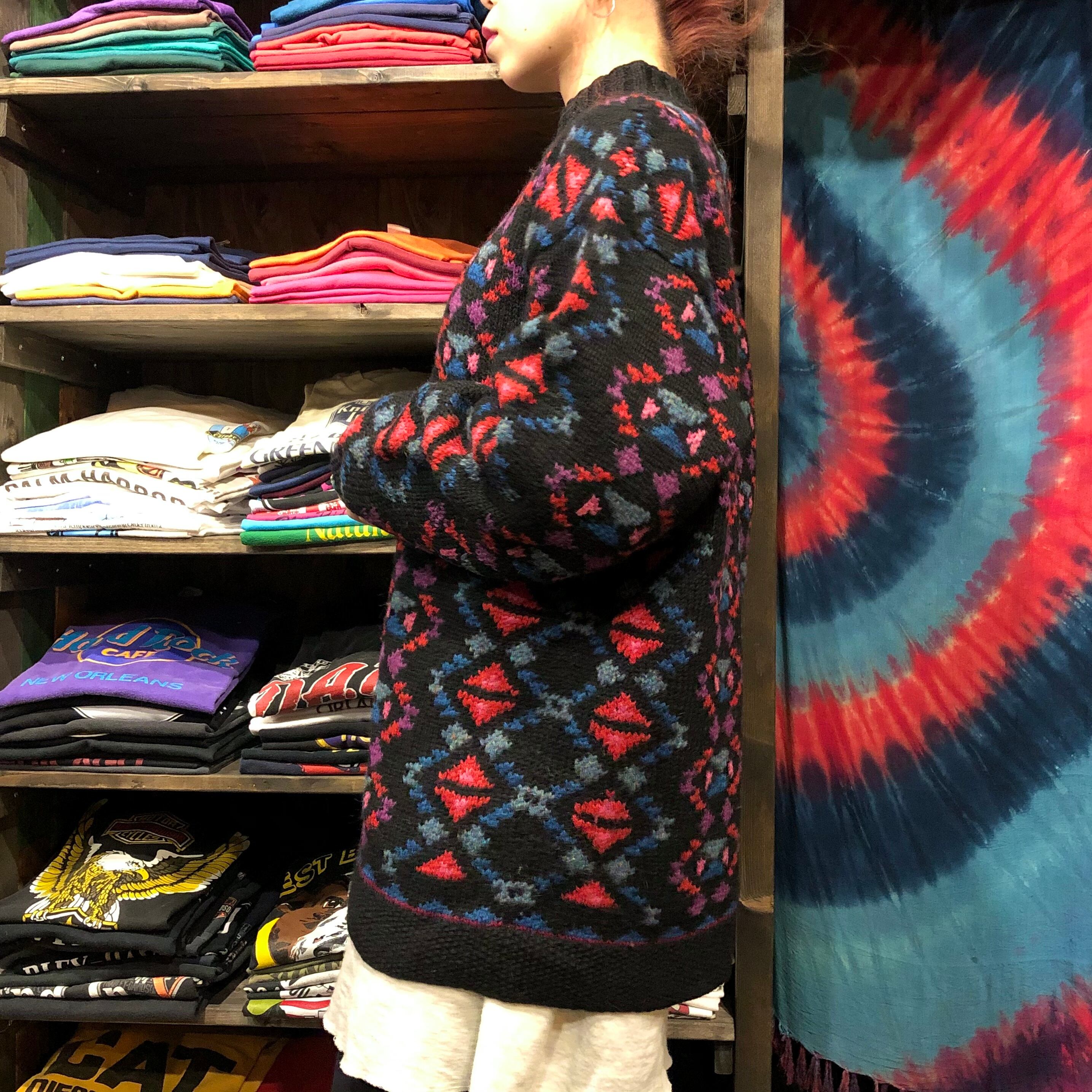 黒ベースに良い感じの配色で柄が編まれているニットです。