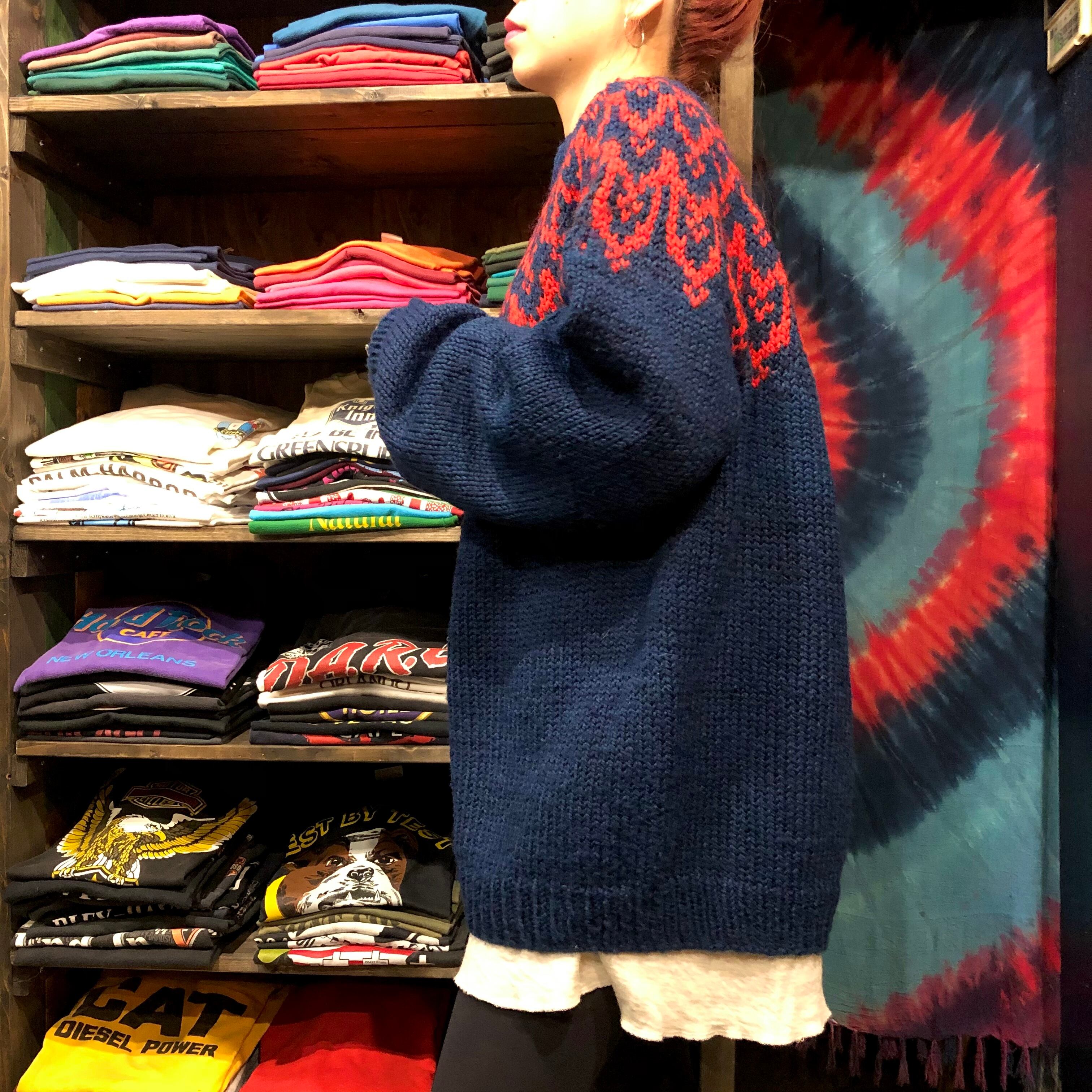 おそらくハンドメイドのもので柔らかめのややざっくり編んである感じが温かみがあり魅力的です。ぽわんとゆったり着られら感じもかわいいのですが、男性が一枚でサラッと着るのも素敵だと思います。