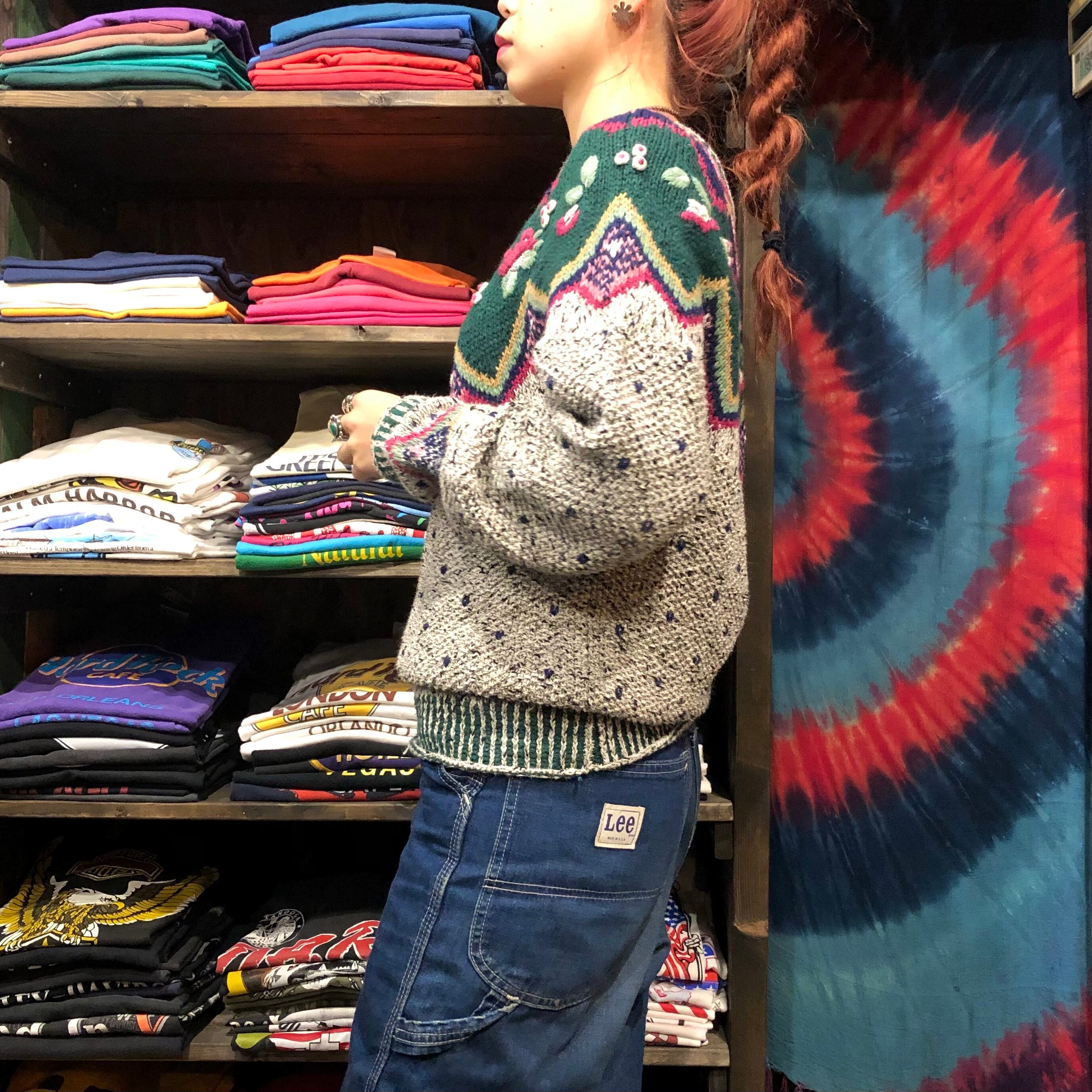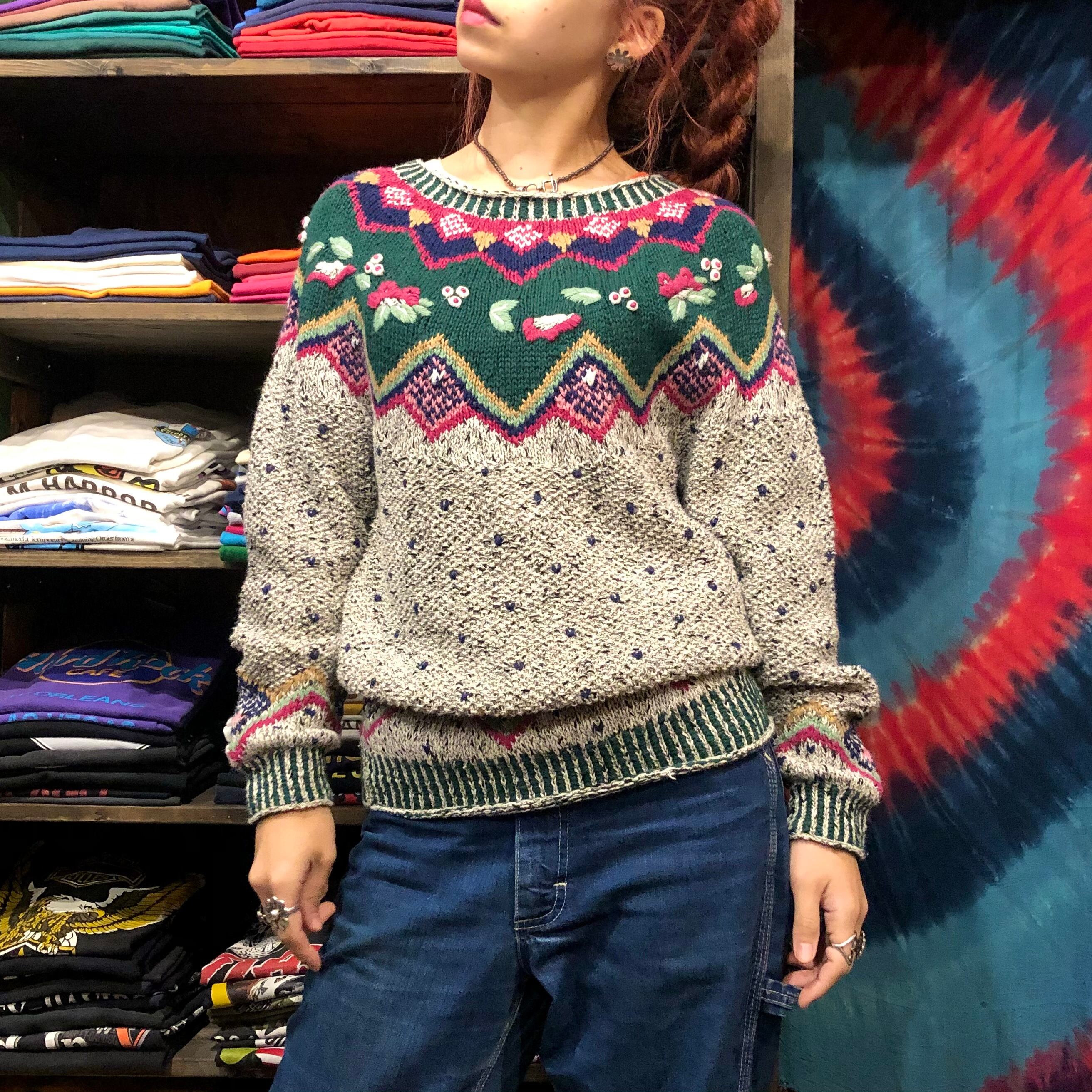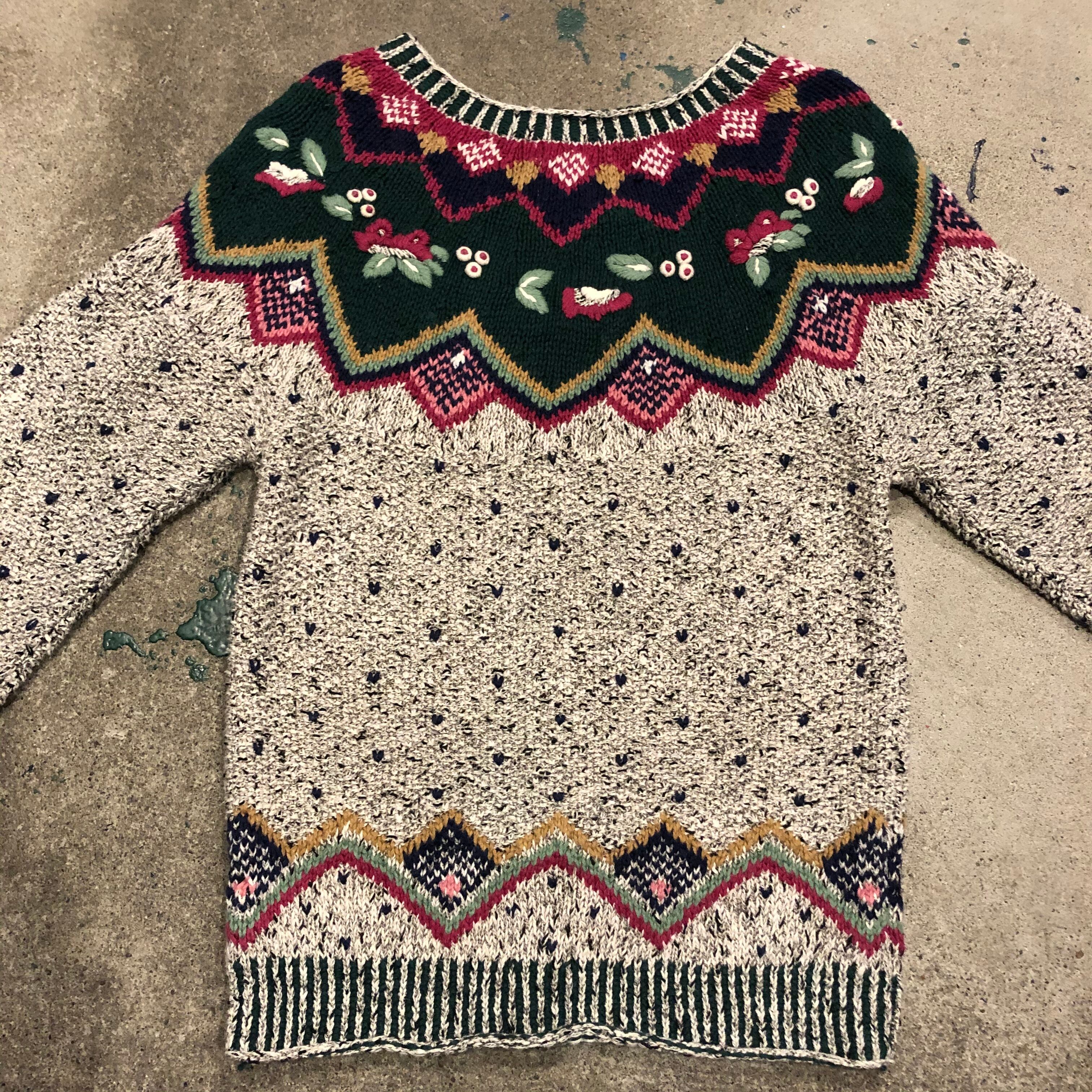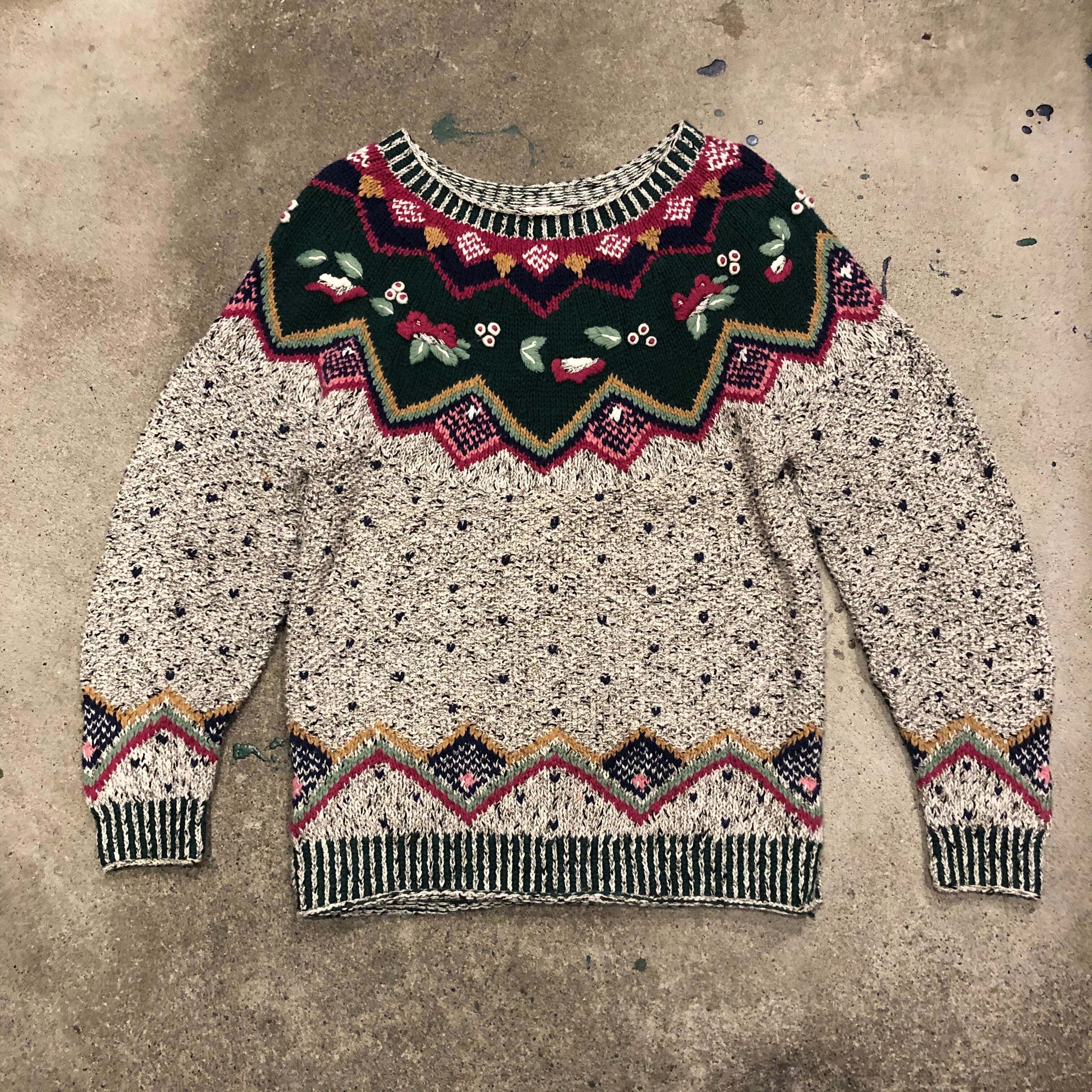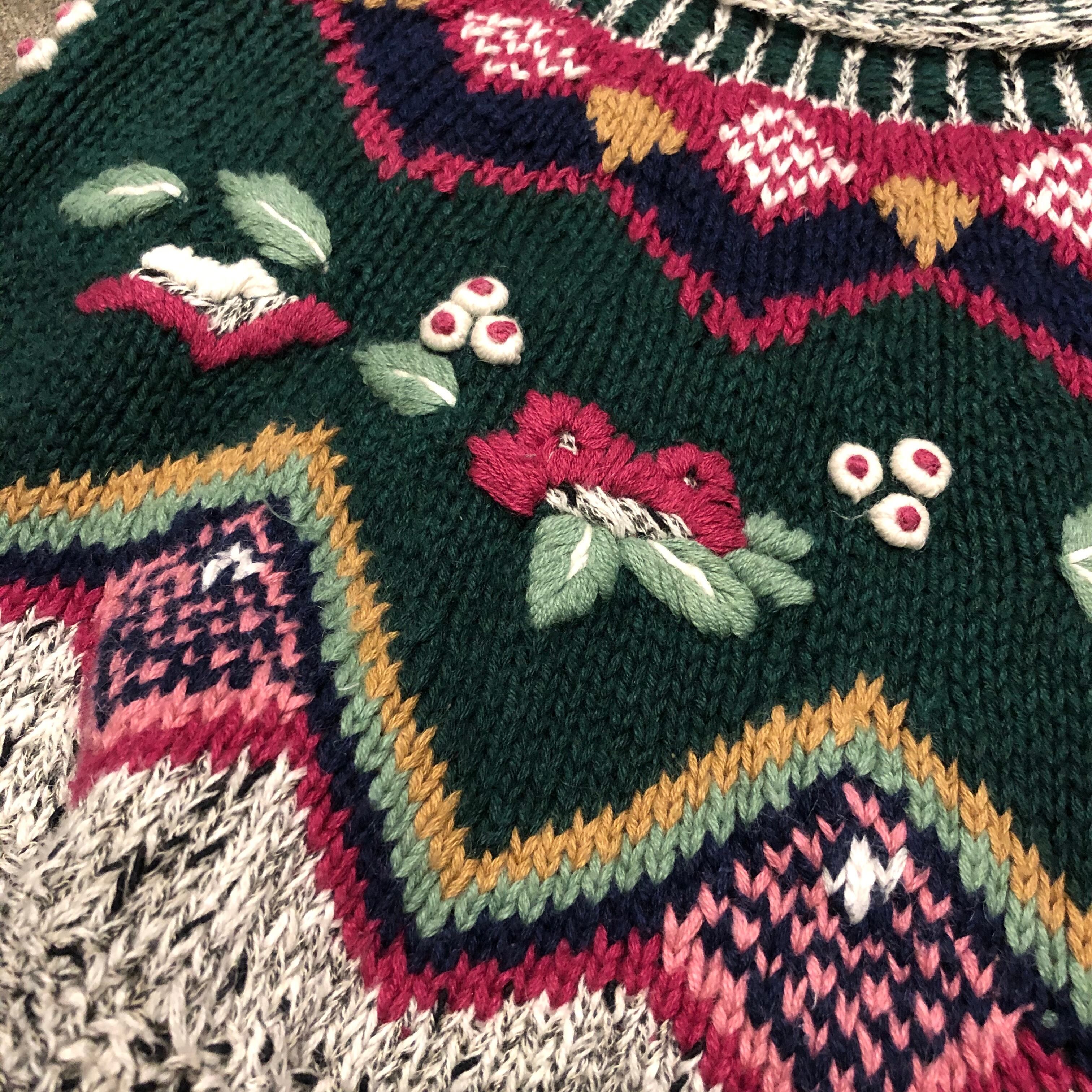 デザインはかわいらしいですが、色味はやや渋めで絶妙なバランス感です。お花や実?のような部分はぷっくり立体的になっていたり袖口や襟ぐり裾のリブがボーダーのようになっていたり細かい部分にトキメキます。