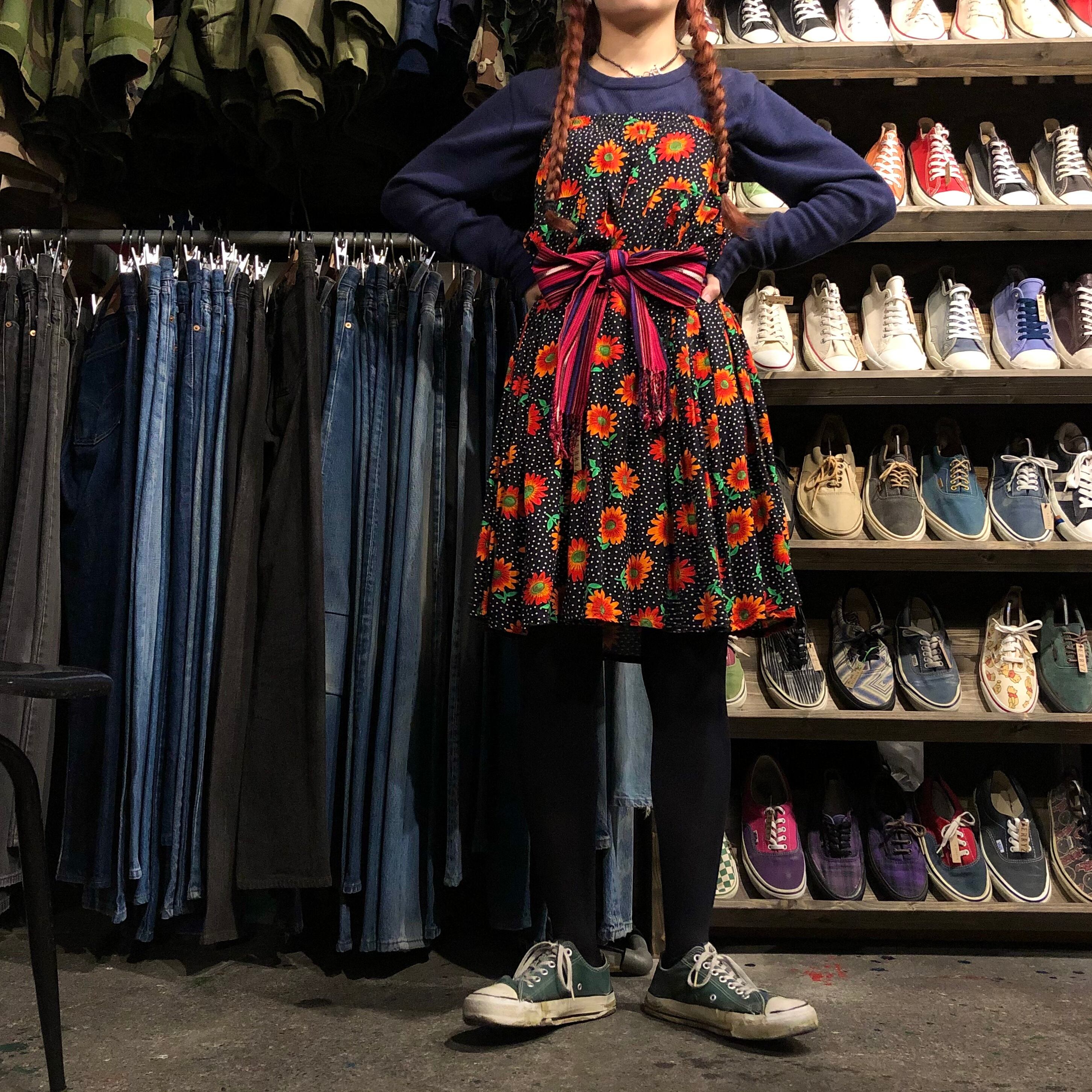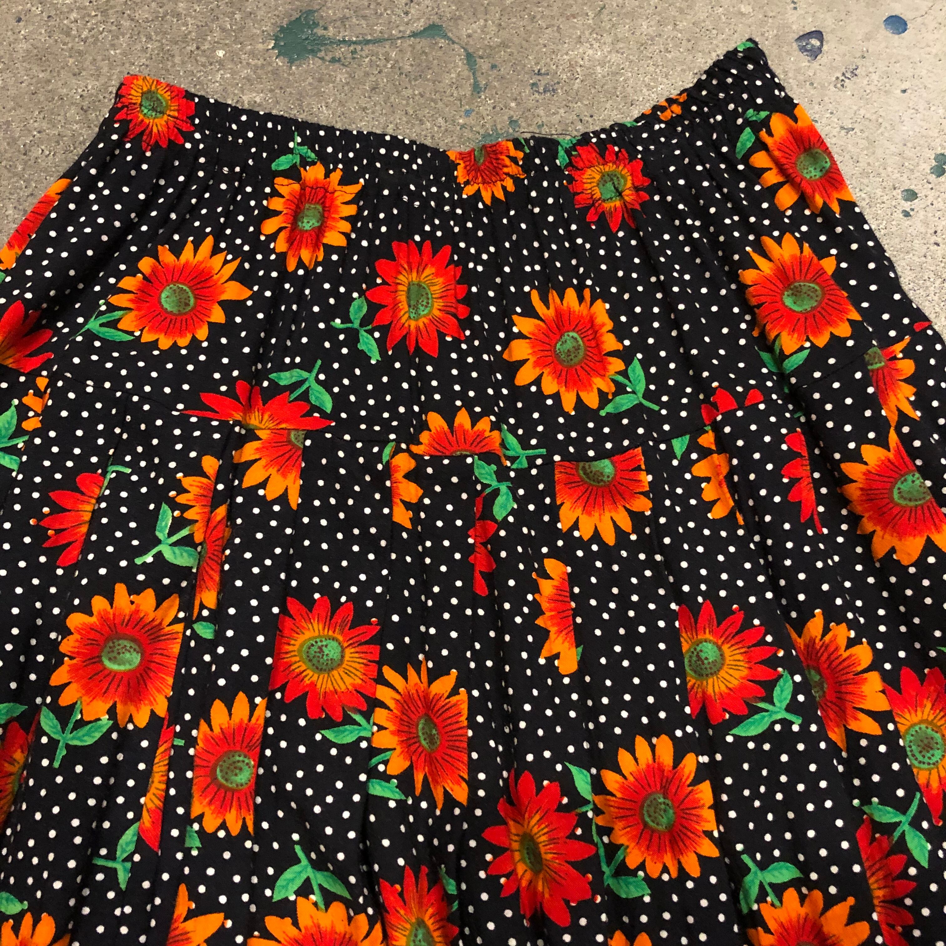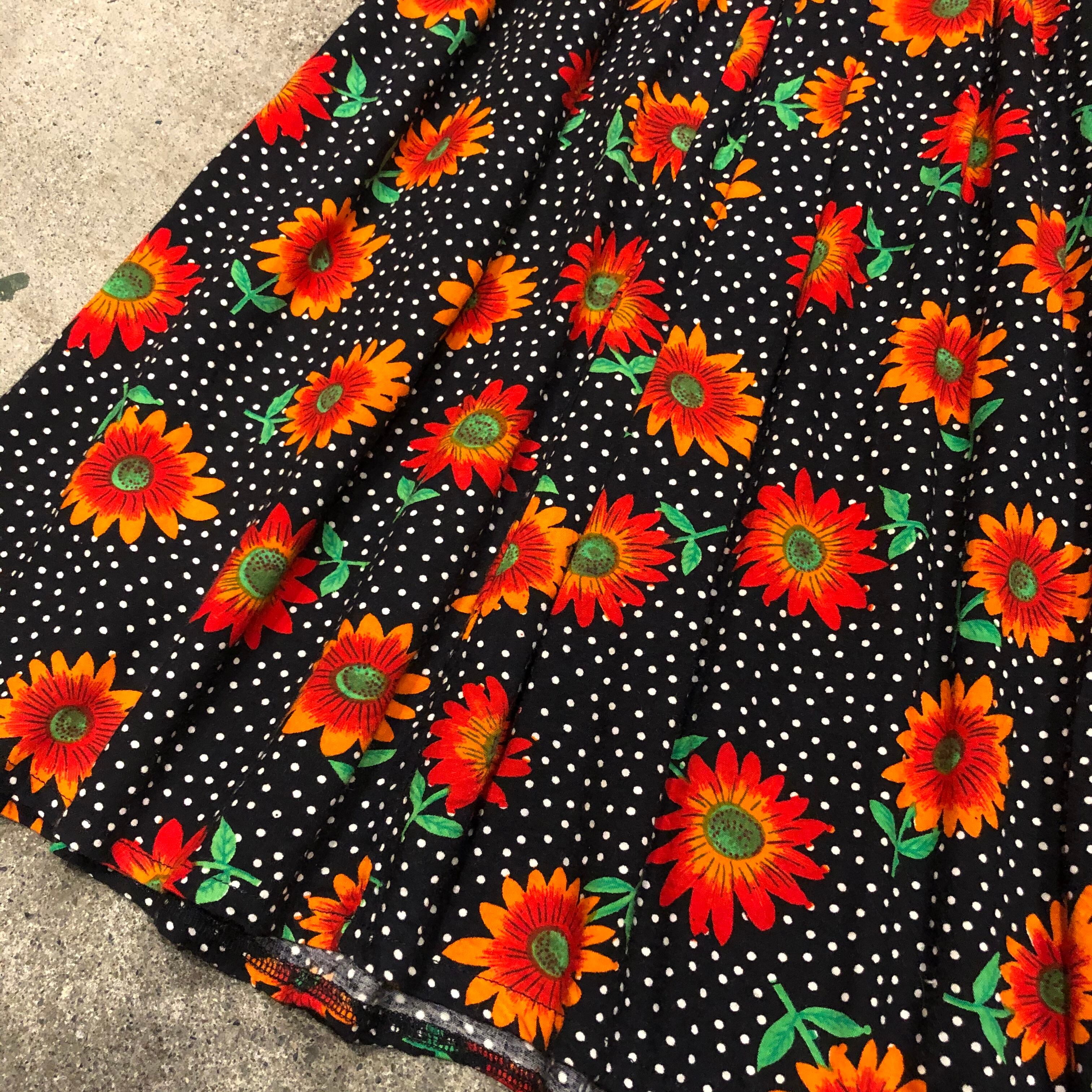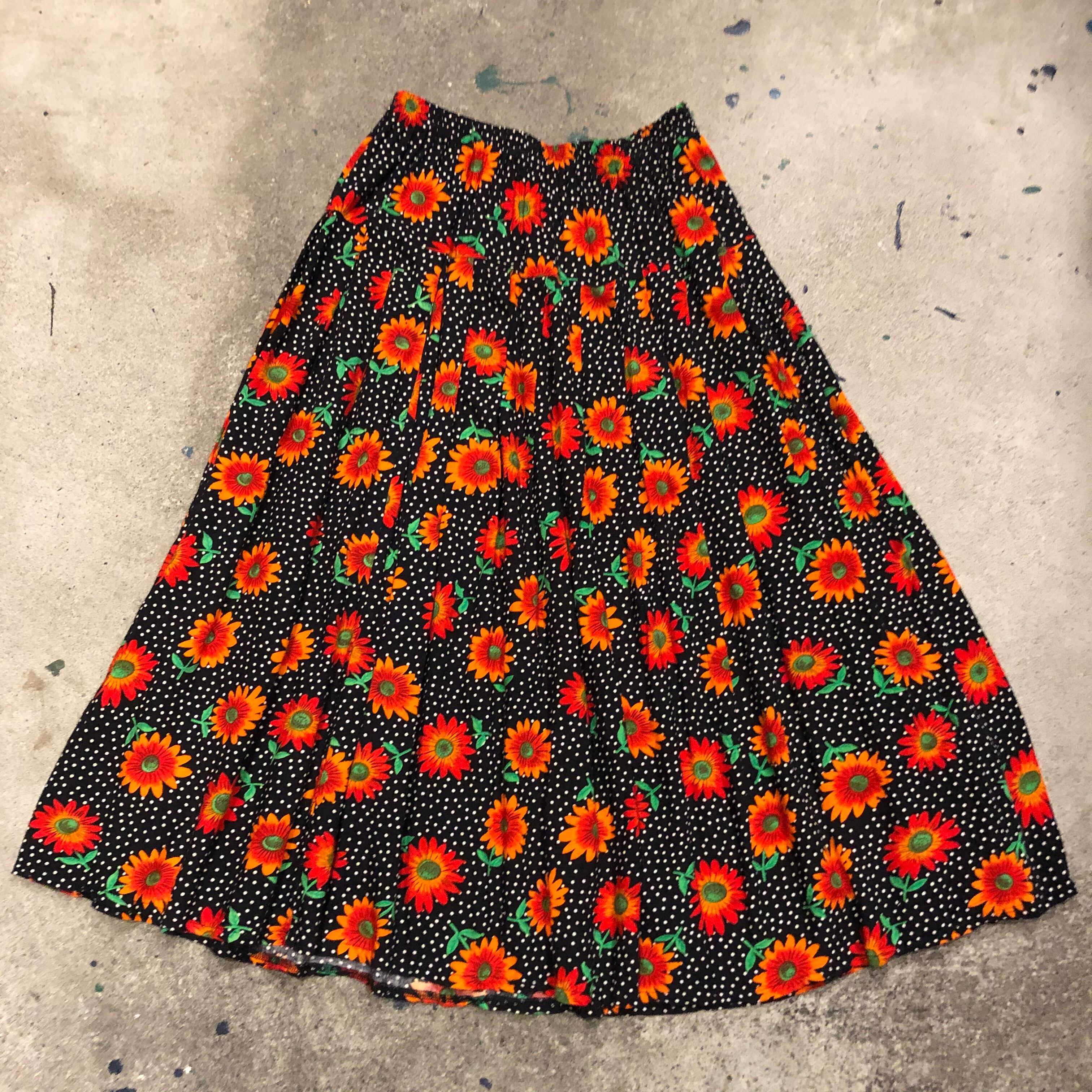 黒地に白ドットとオレンジのかわいい花柄のスカートです。