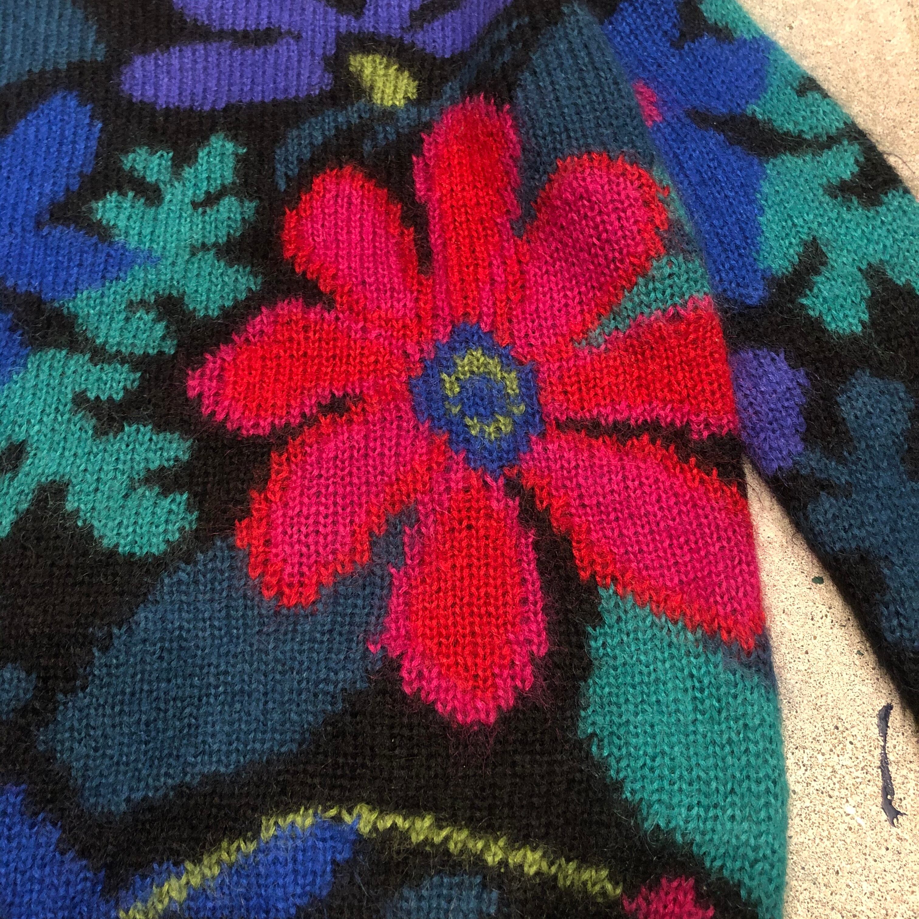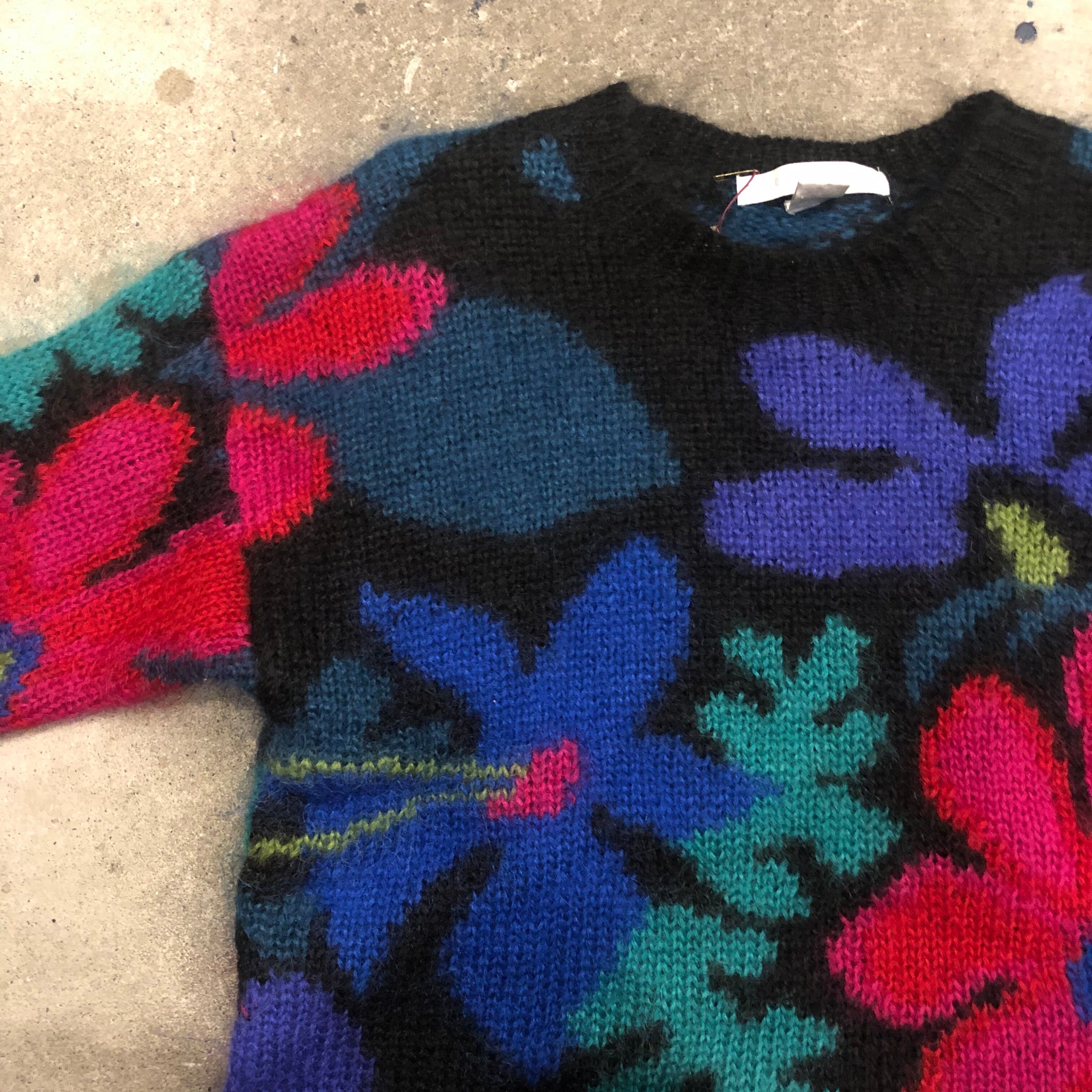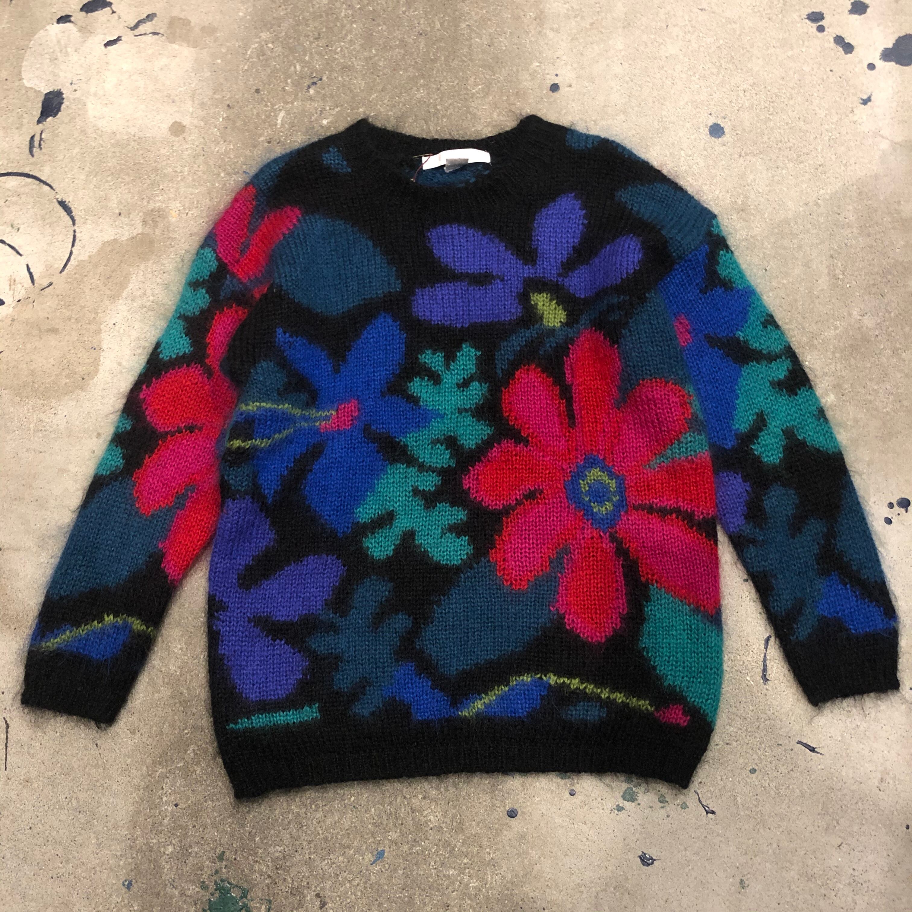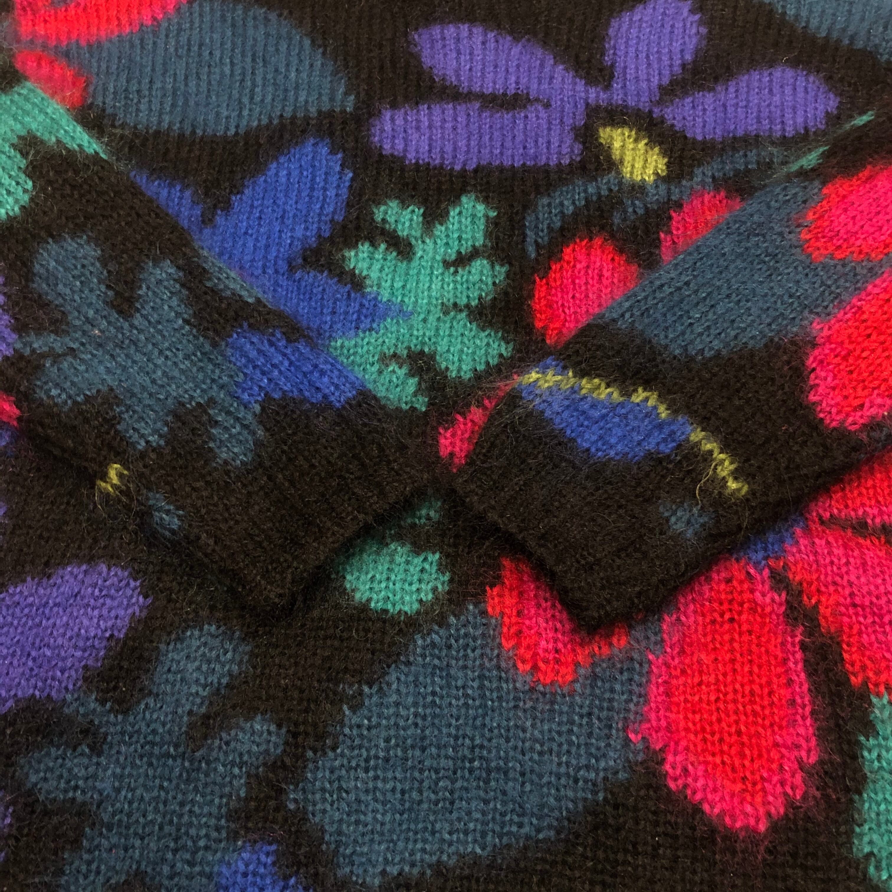 黒地に大きなお花柄がインパクトがあってかわいいニットです。
