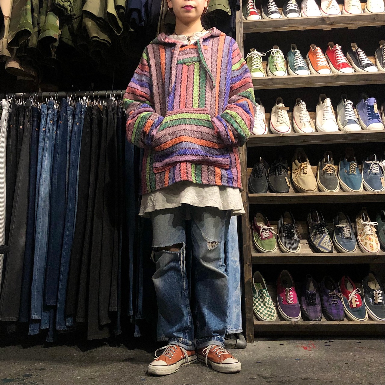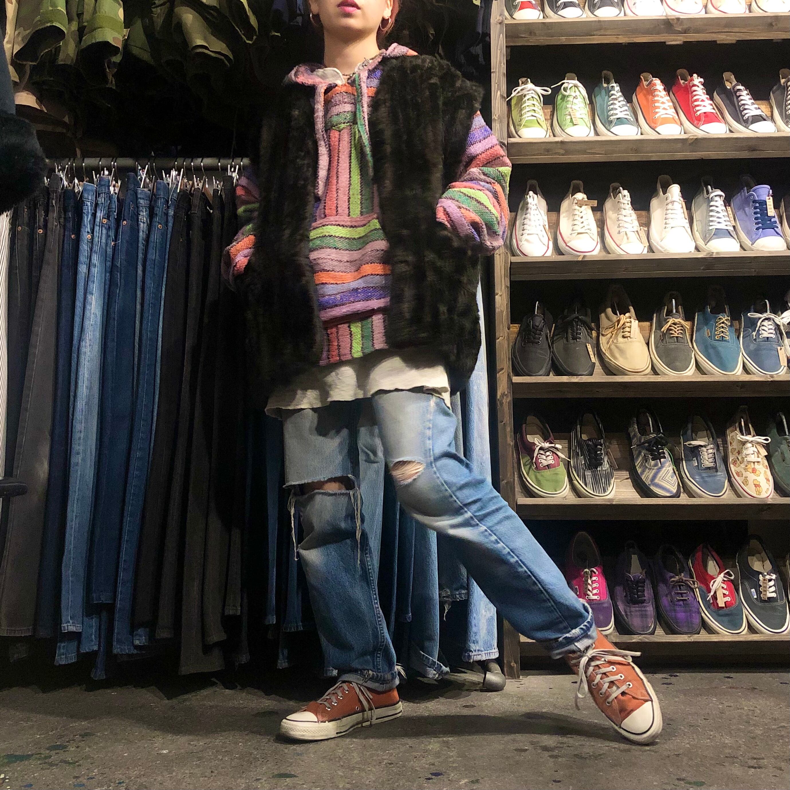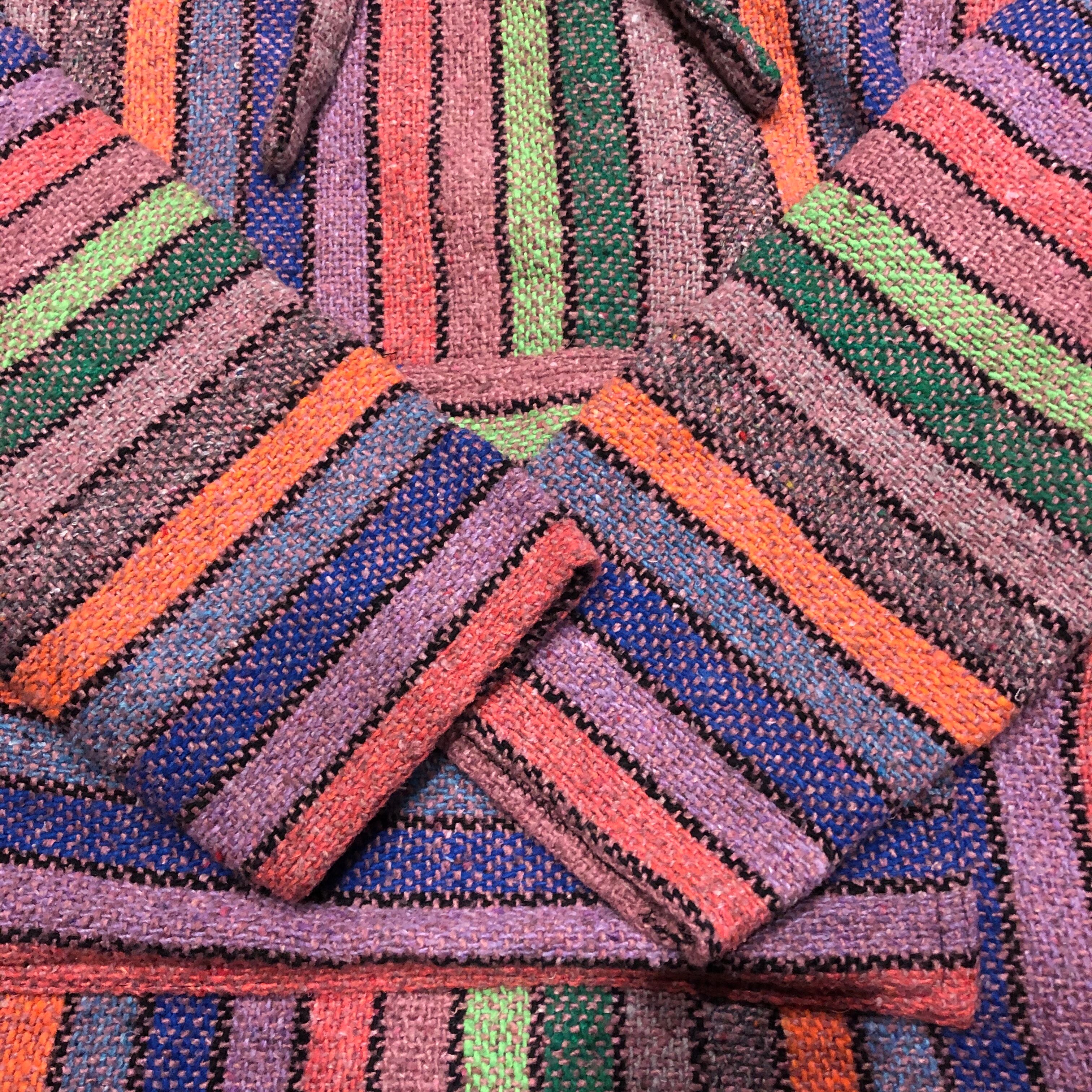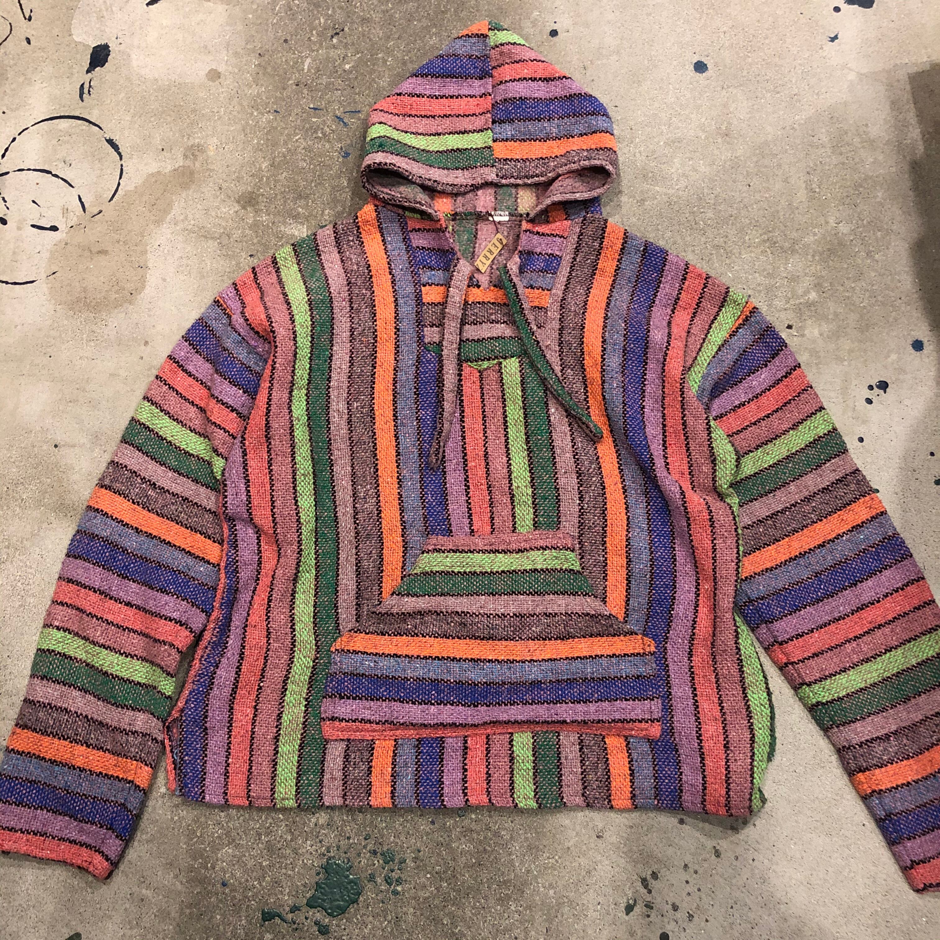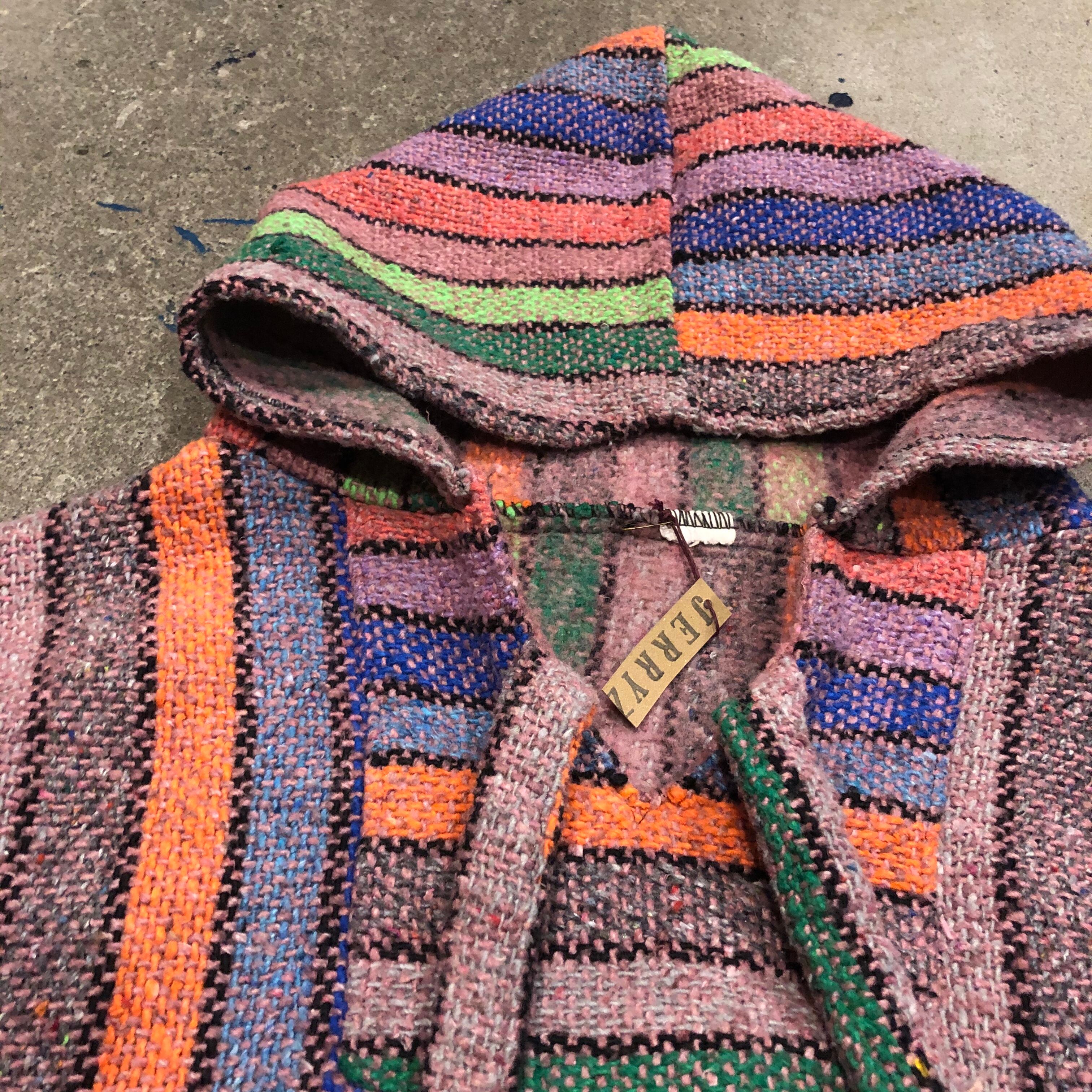 カラフルなストライプがかわいいメキシカンパーカーです。こんなにポップなカラーは珍しいと思います。重ね着も楽しいですし、中に着込んでも良いですね!