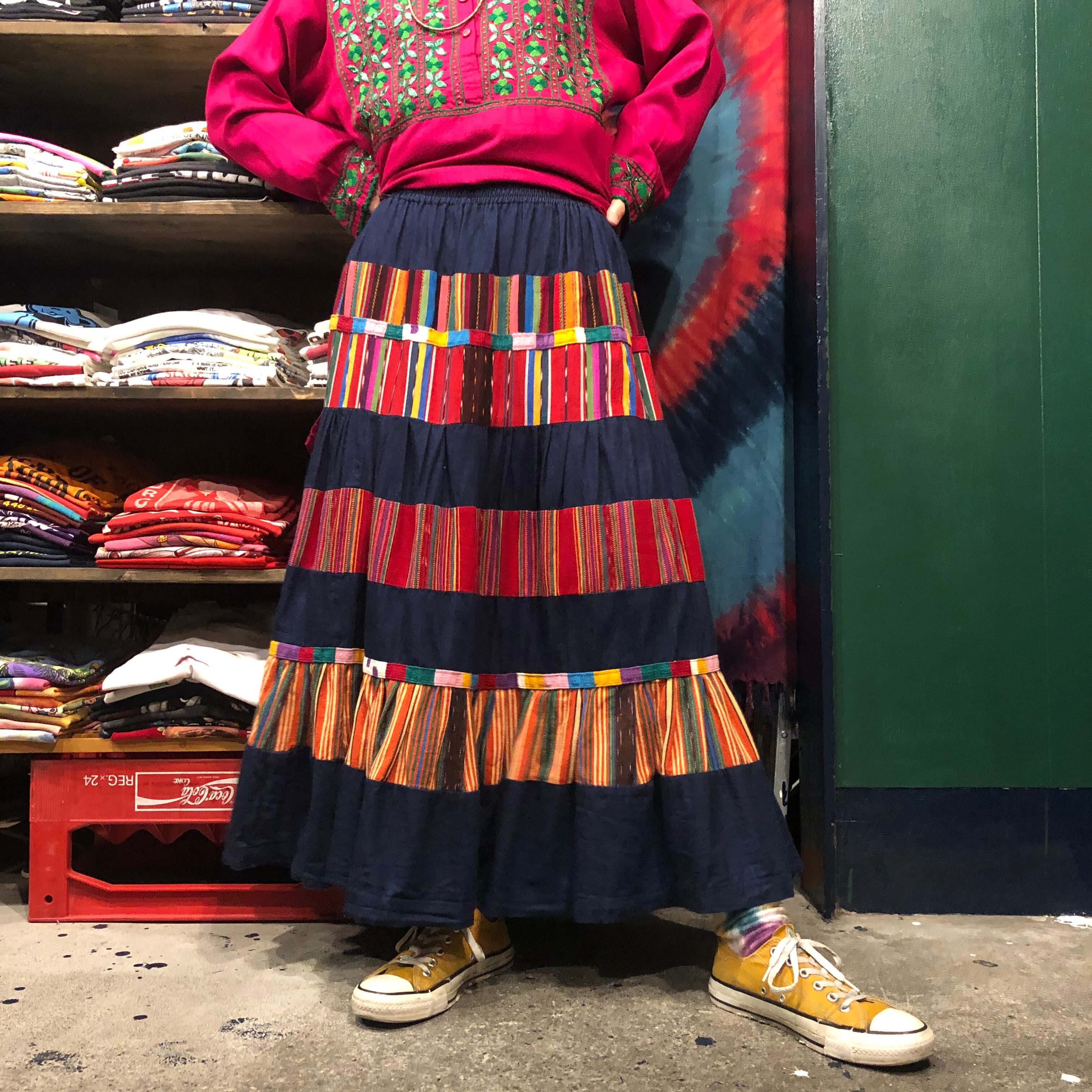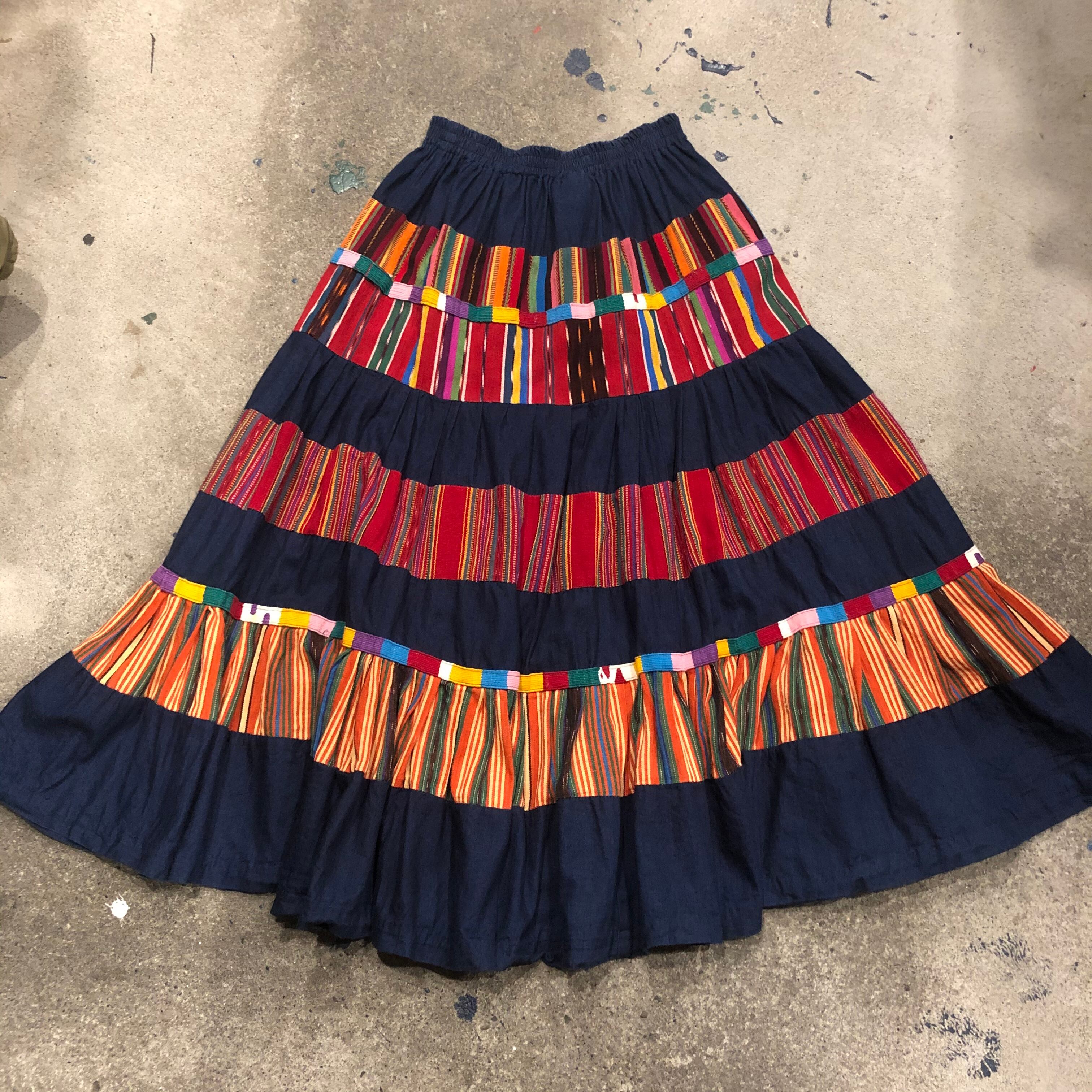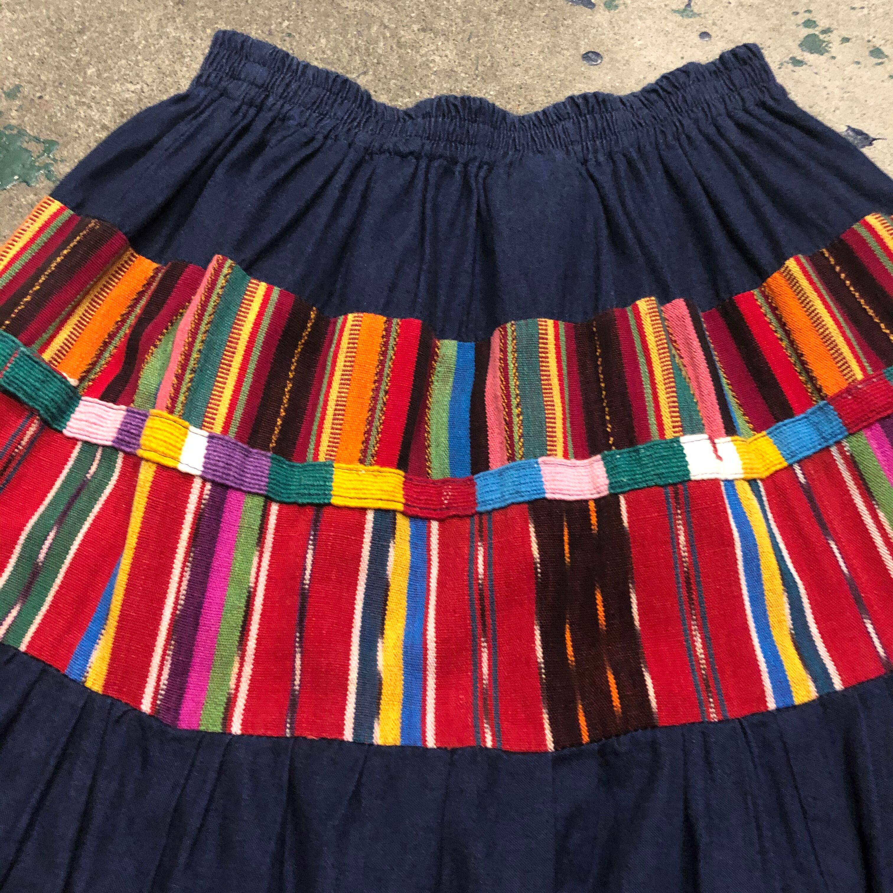 デニムとグアテマラっぽいカラフルな織りの生地の切り替えがとてもかわいいロングスカートです。たっぷりボリュームもあり理想的なシルエットです。