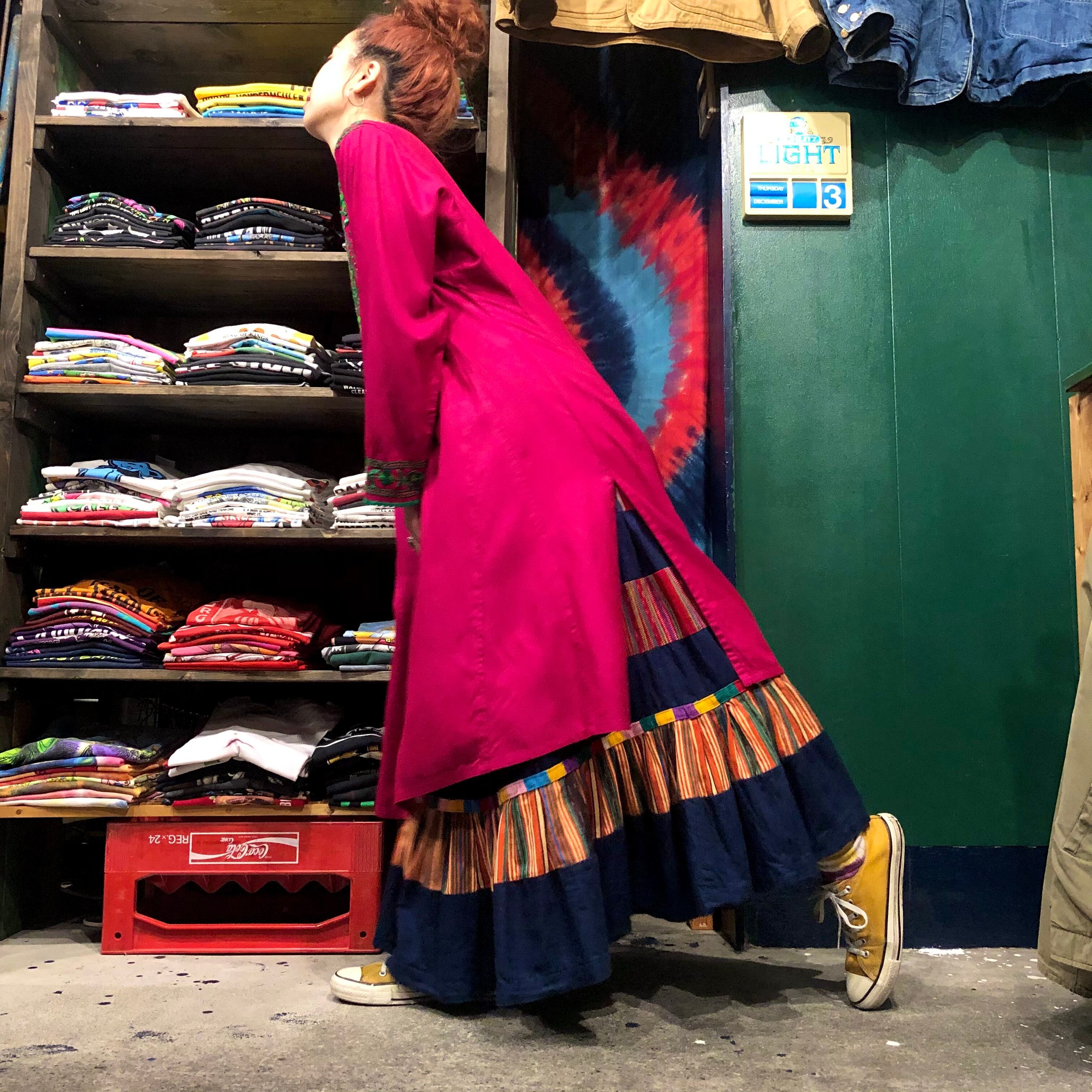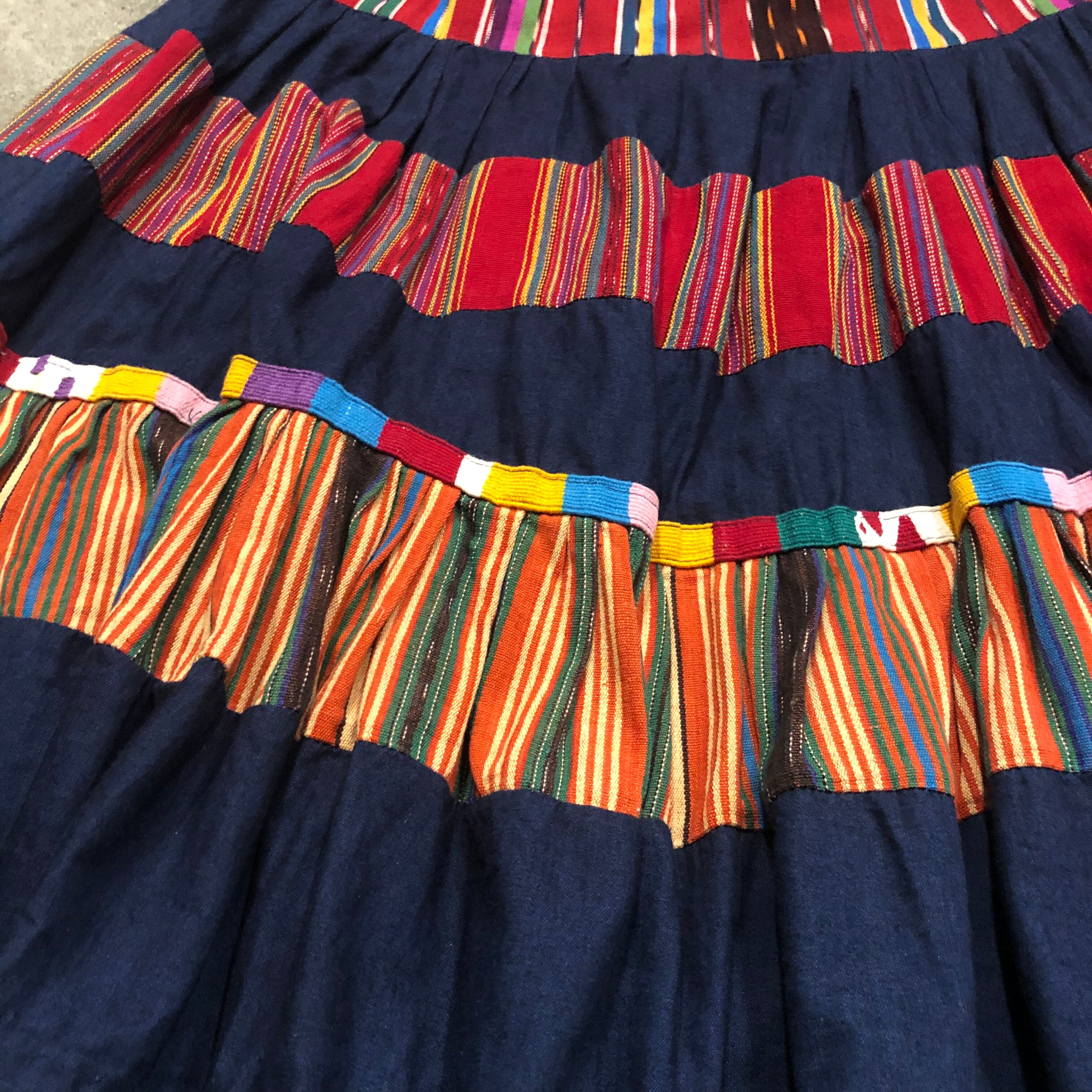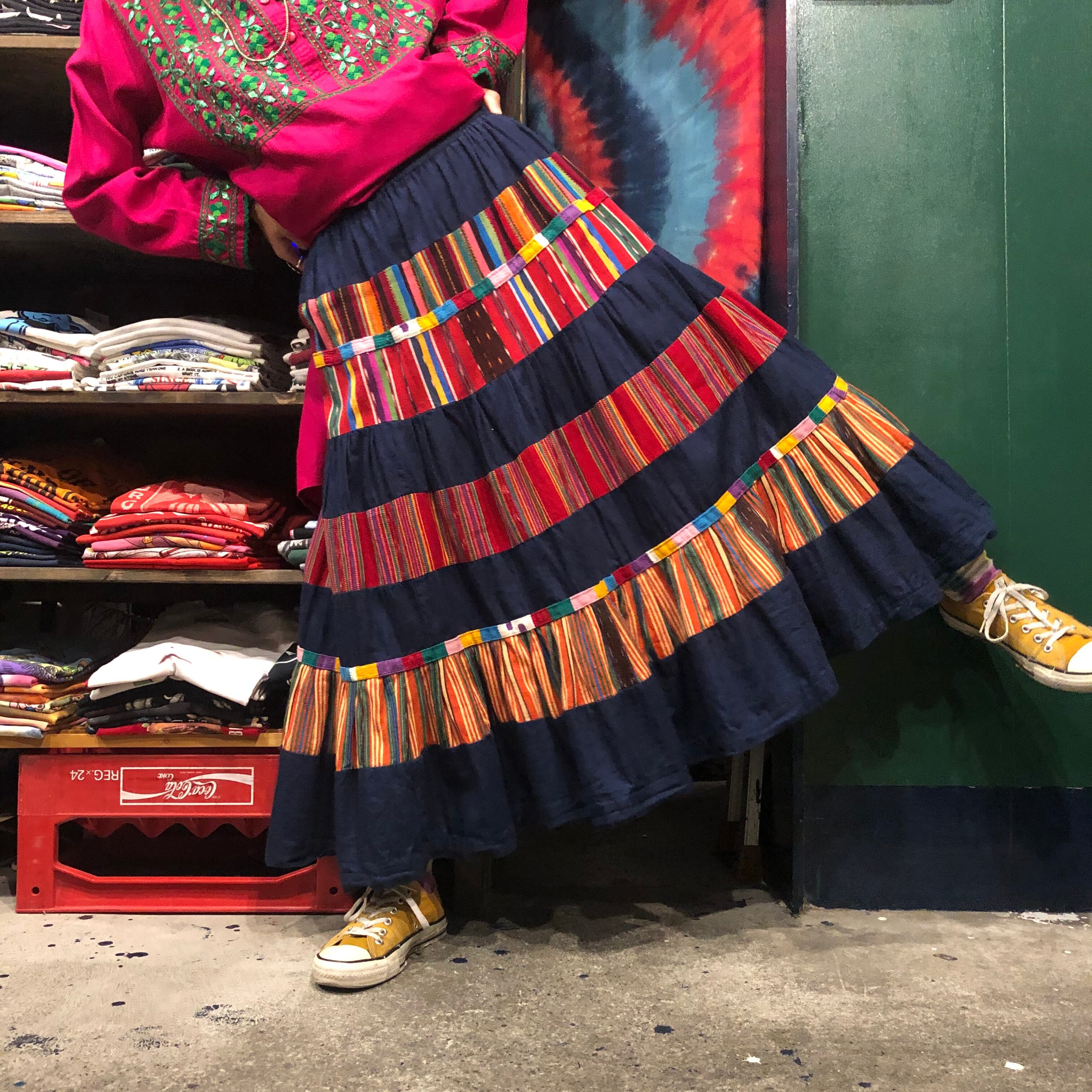 デニムとグアテマラっぽいカラフルな織りの生地の切り替えがとてもかわいいロングスカートです。たっぷりボリュームもあり理想的なシルエットです。