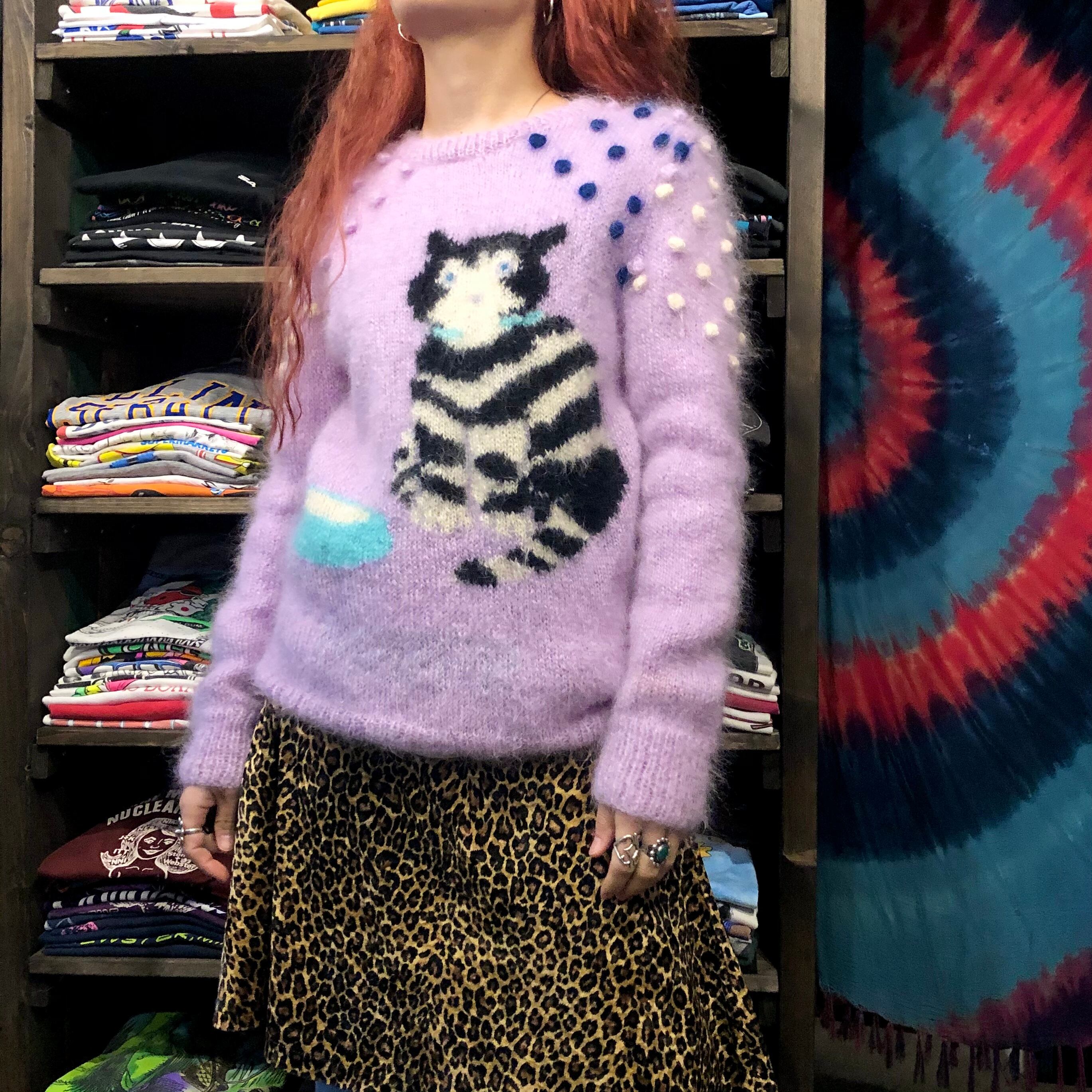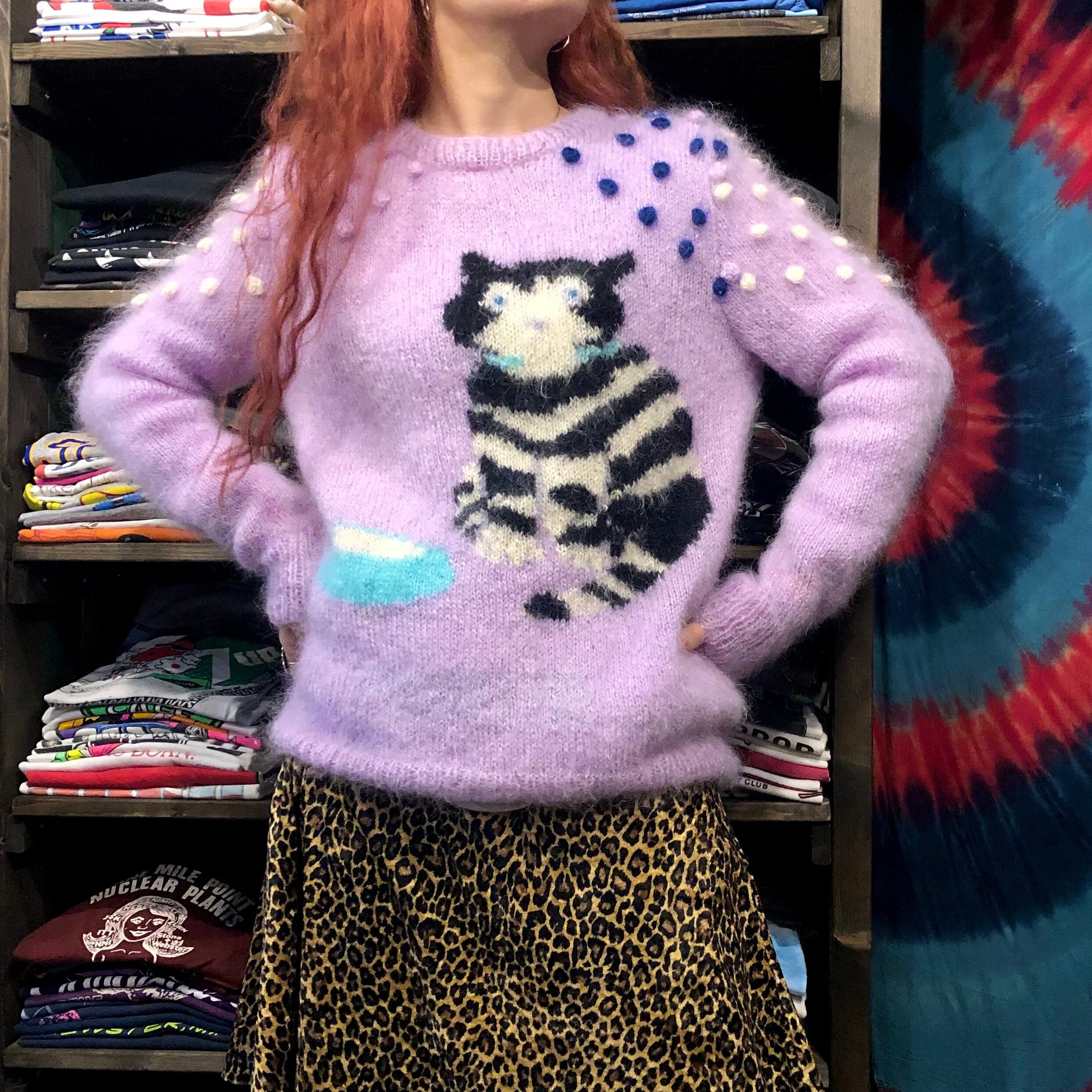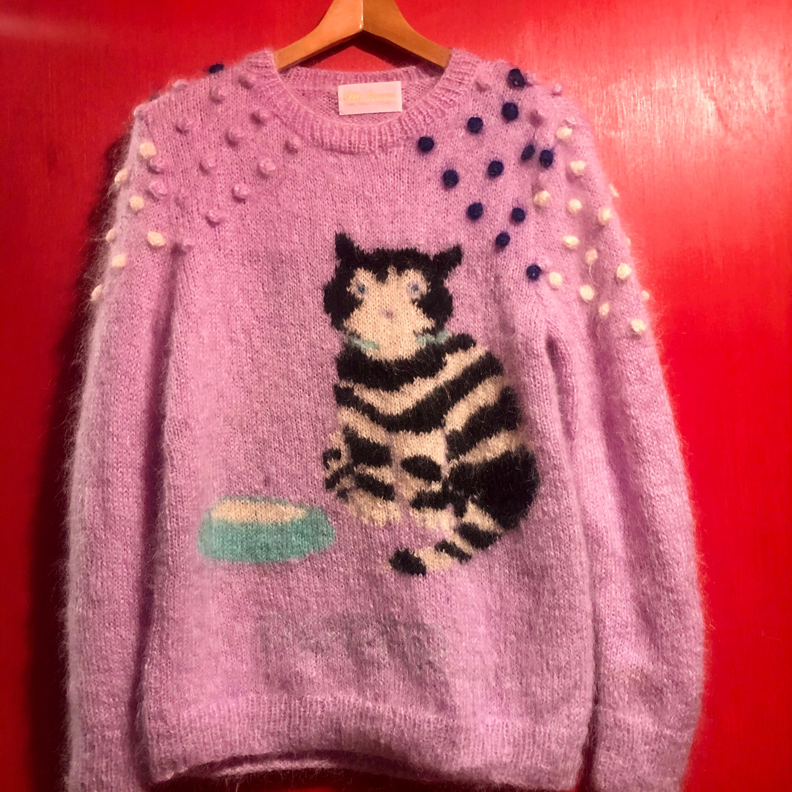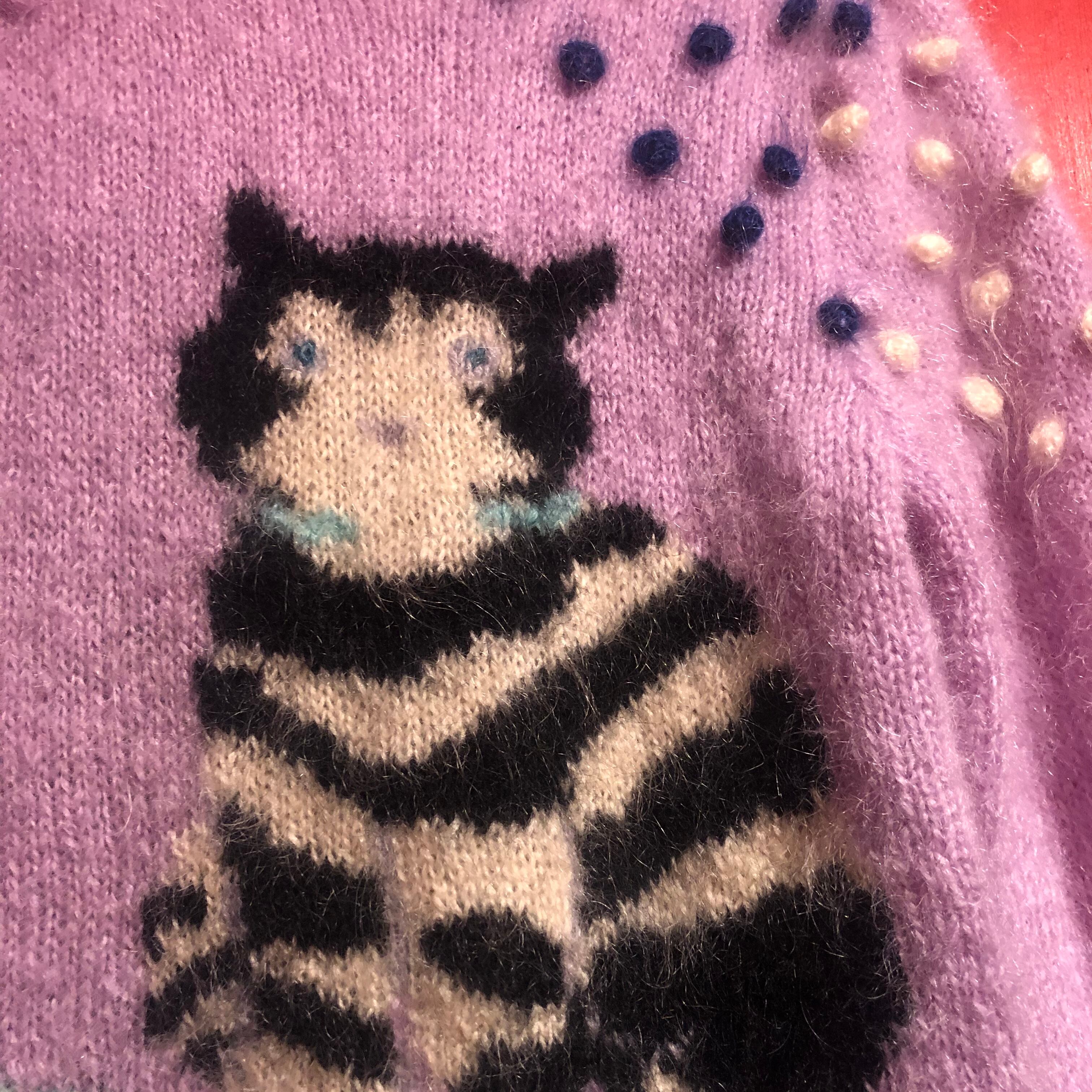 シマシマのねこやつぶつぶがかわいいモヘアニットです。
