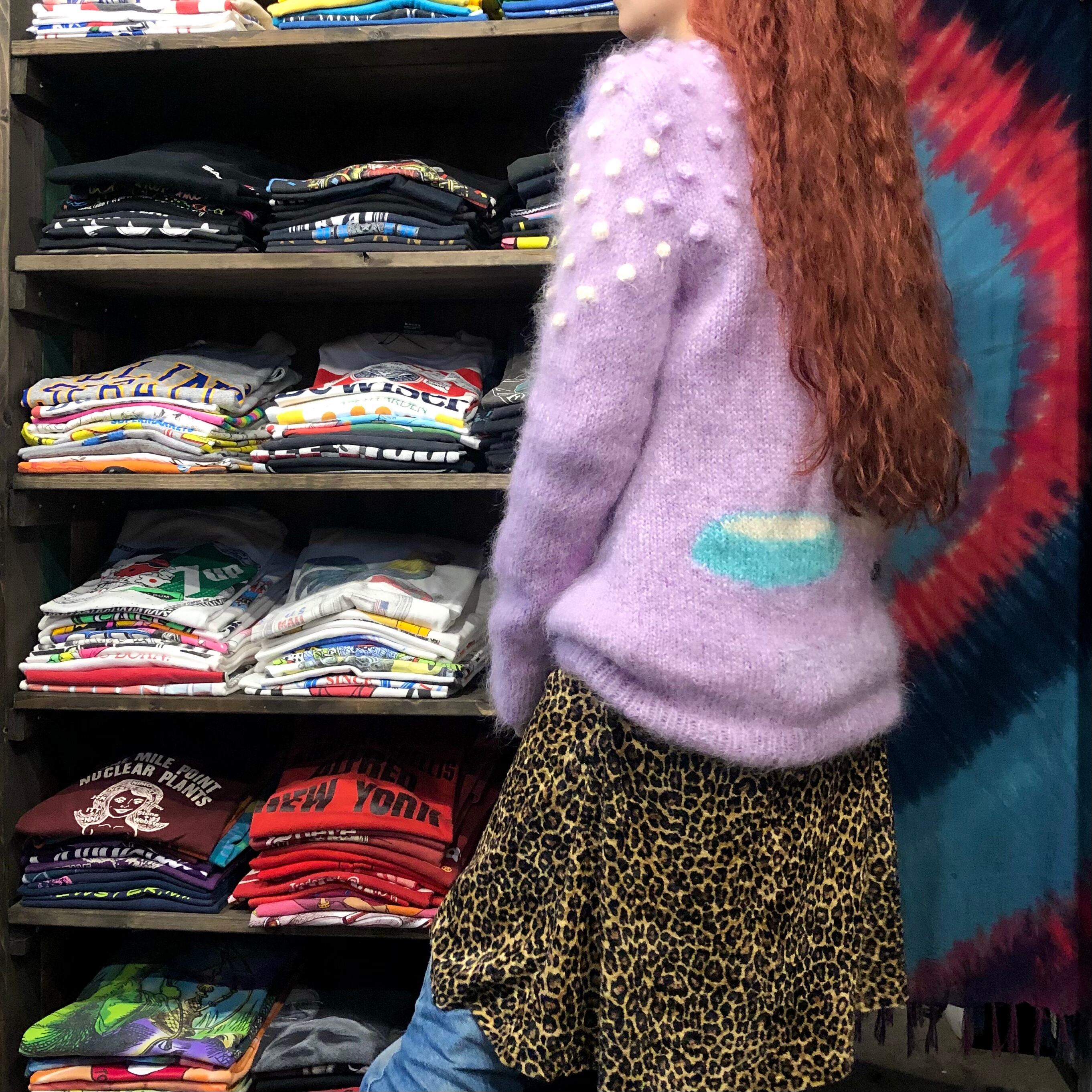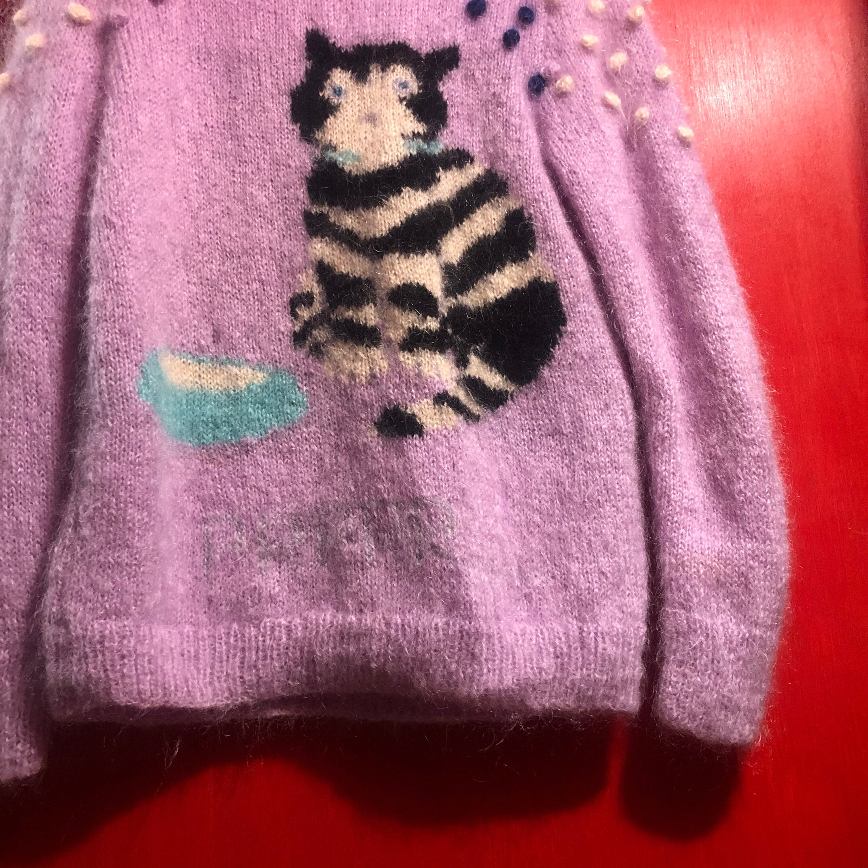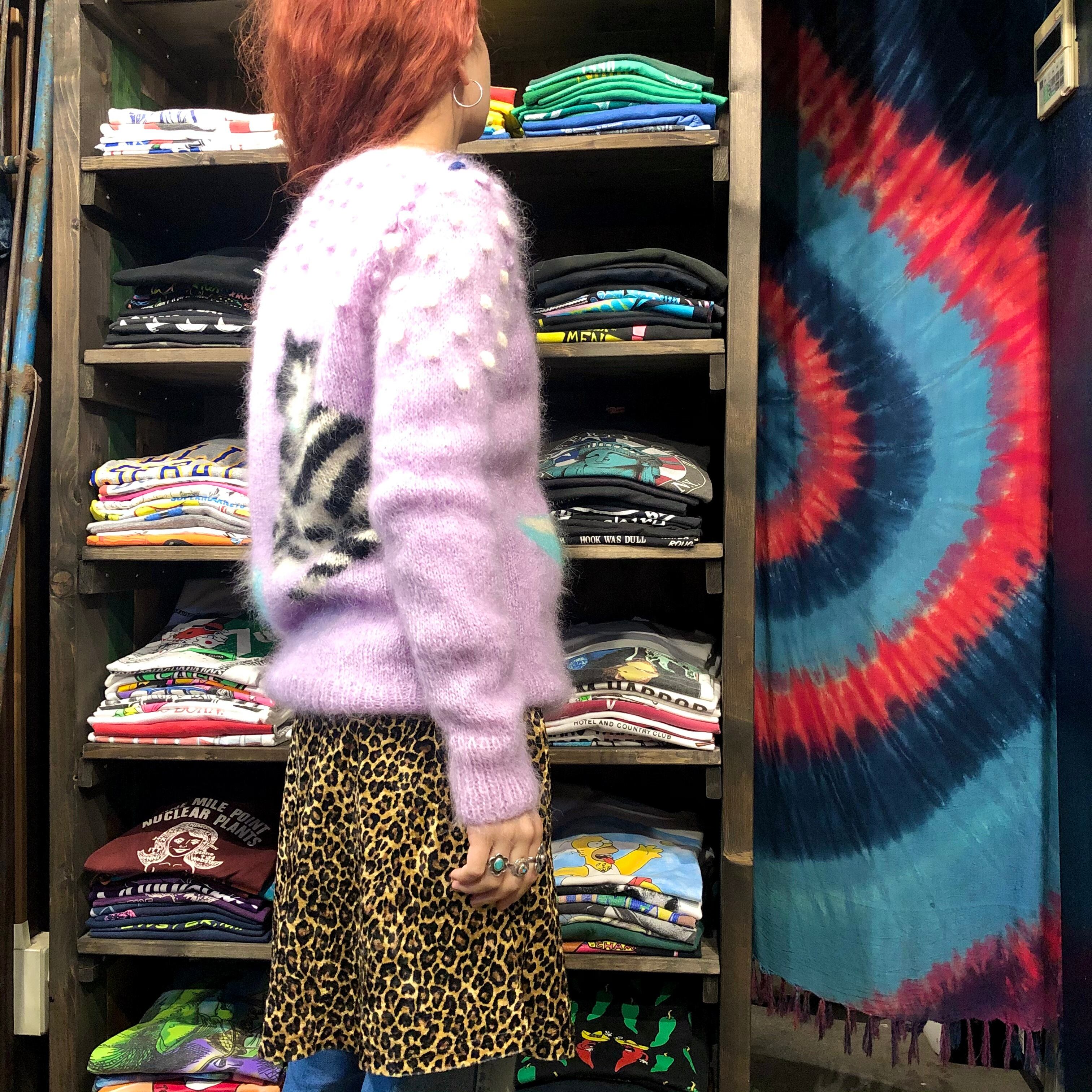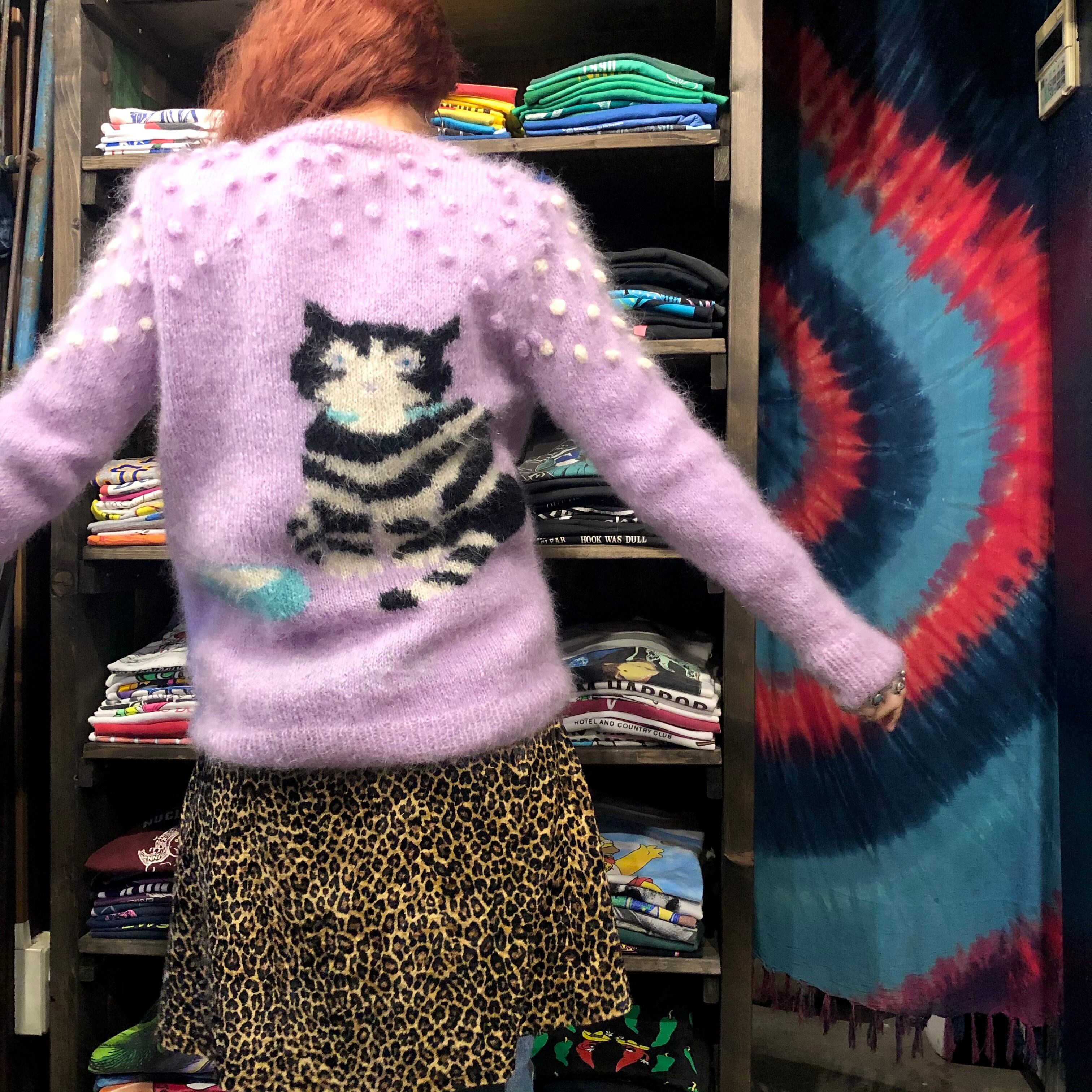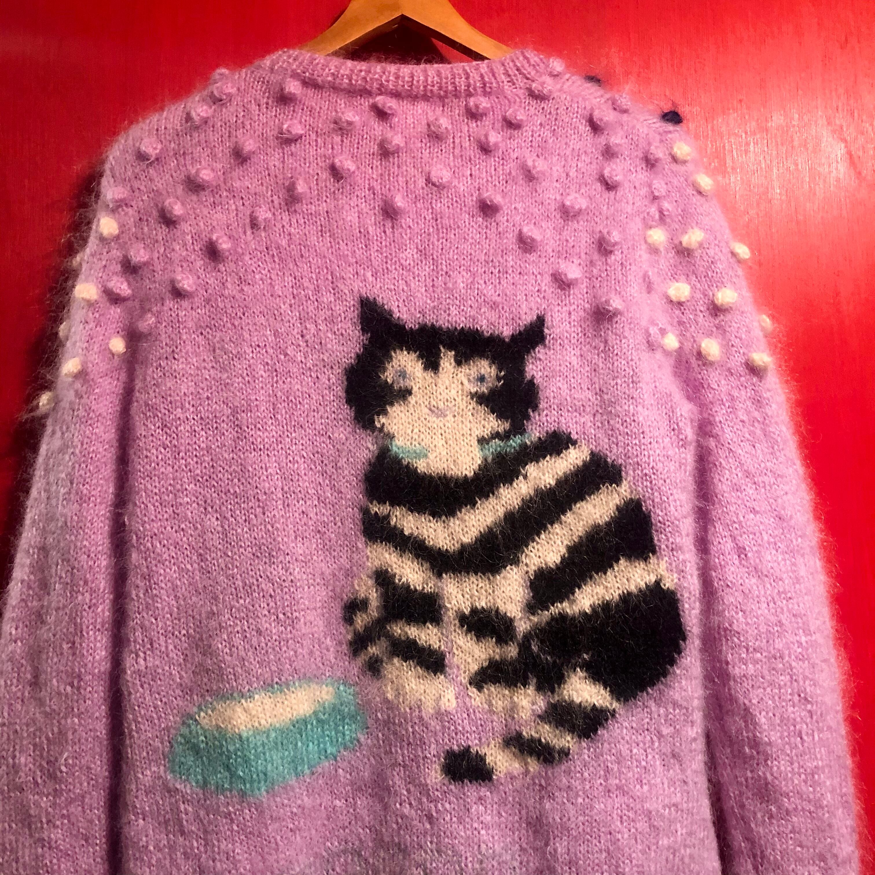 シマシマのねこやつぶつぶがかわいいモヘアニットです。
